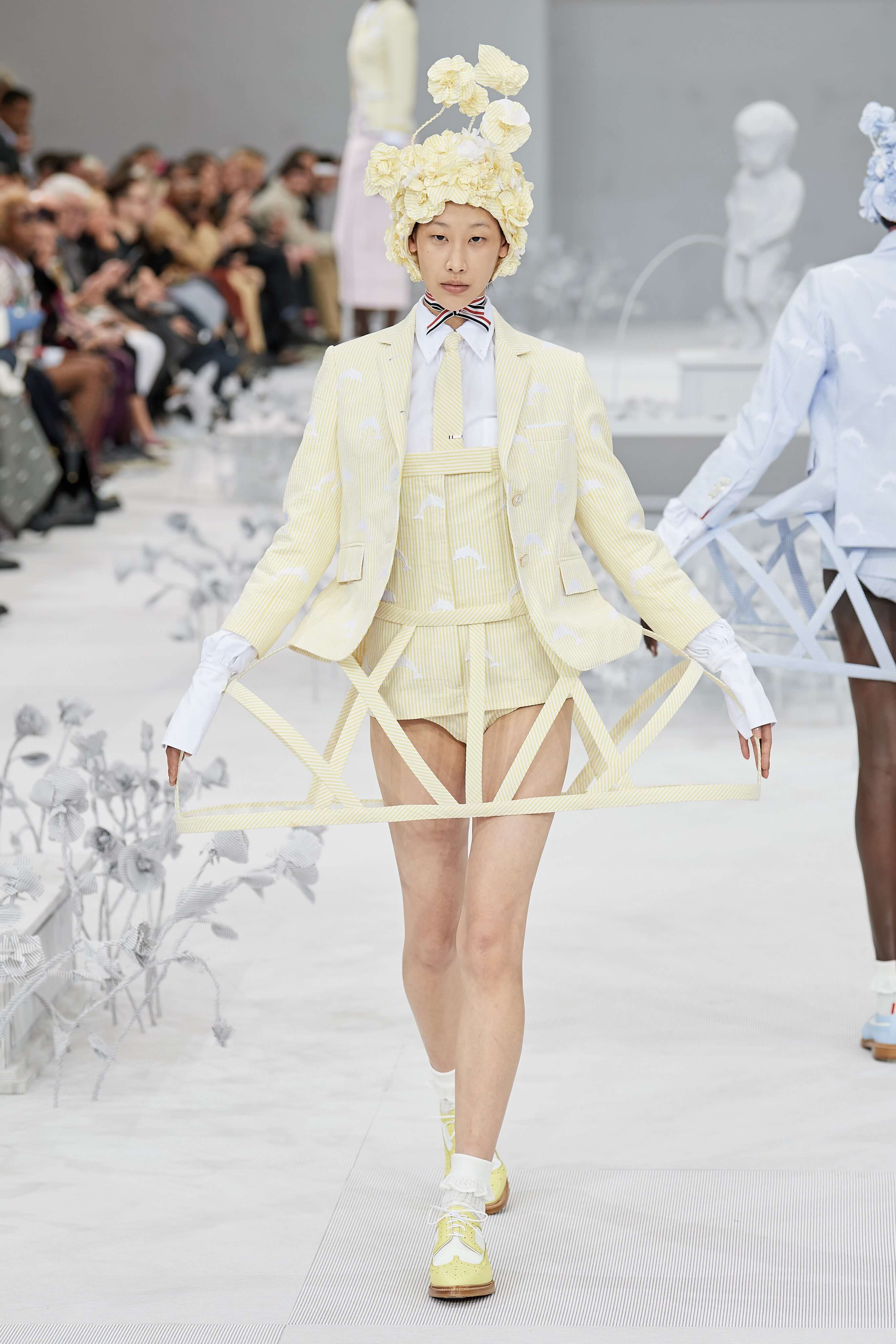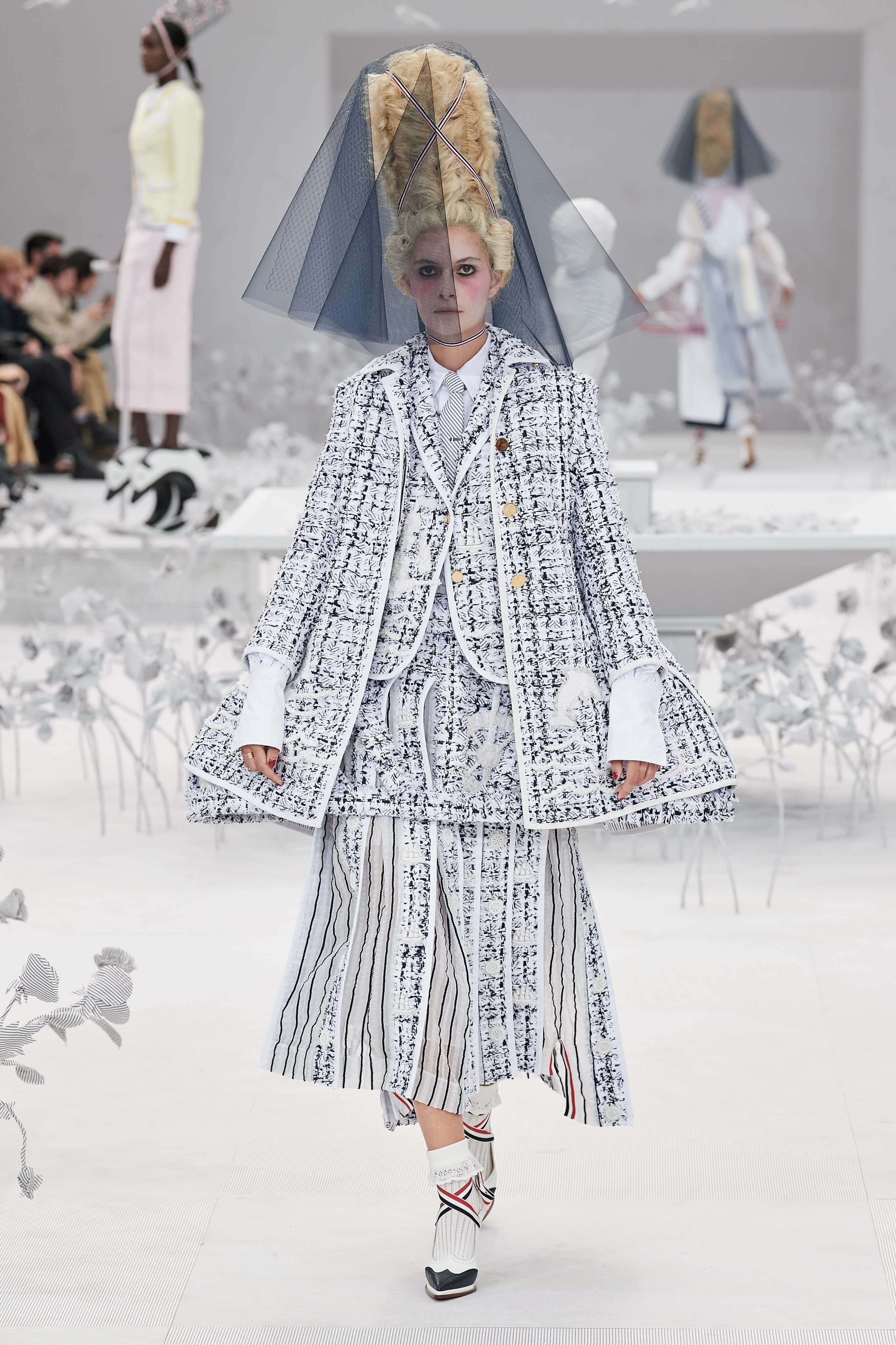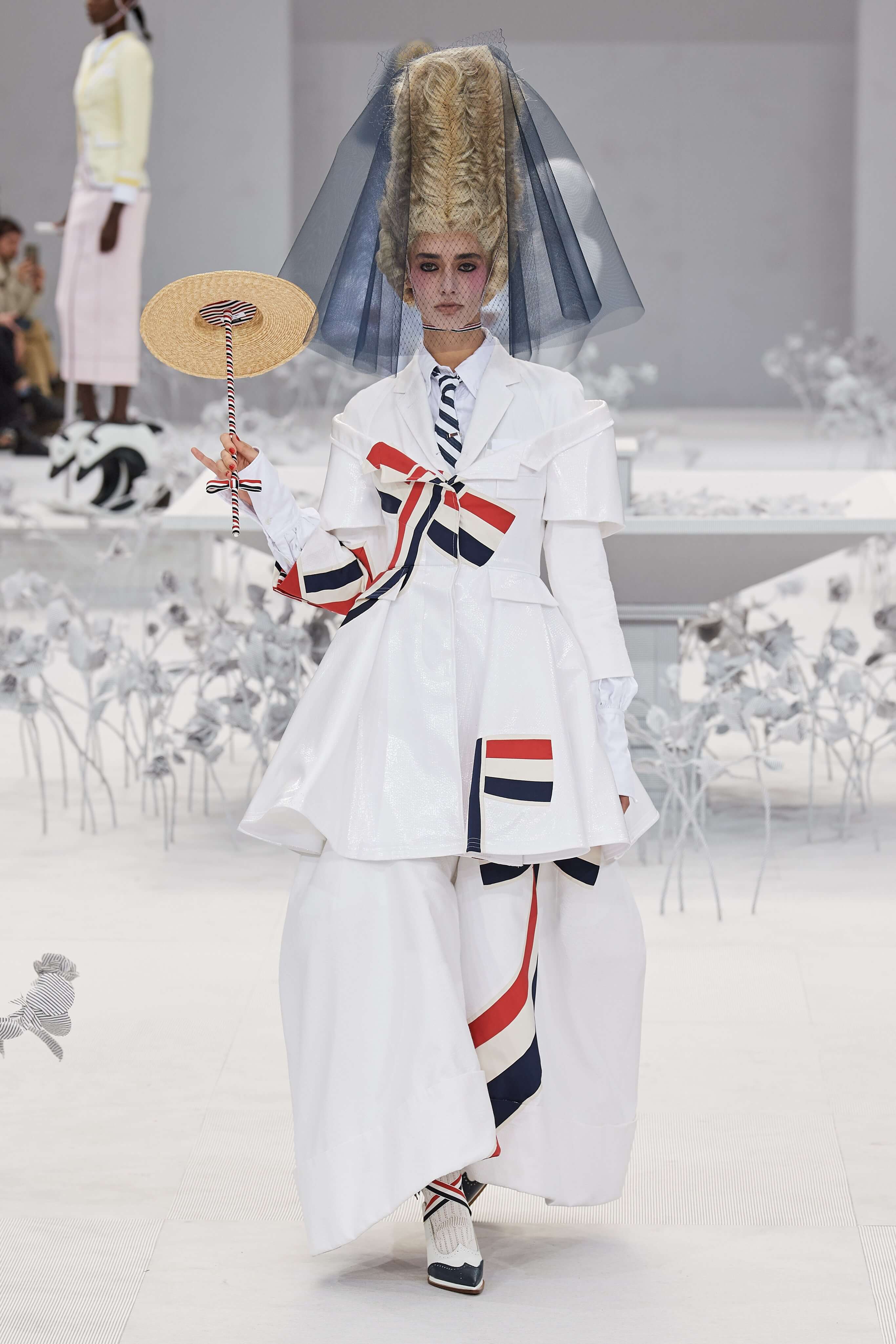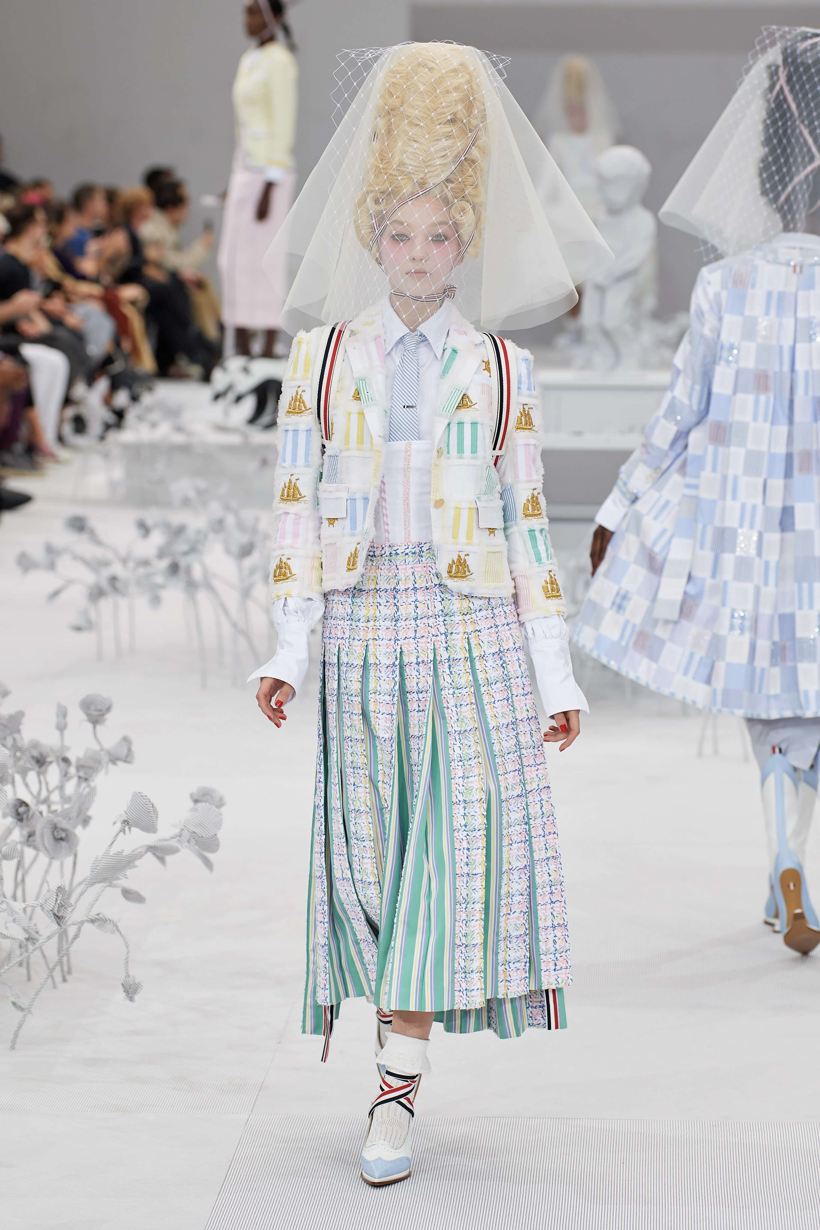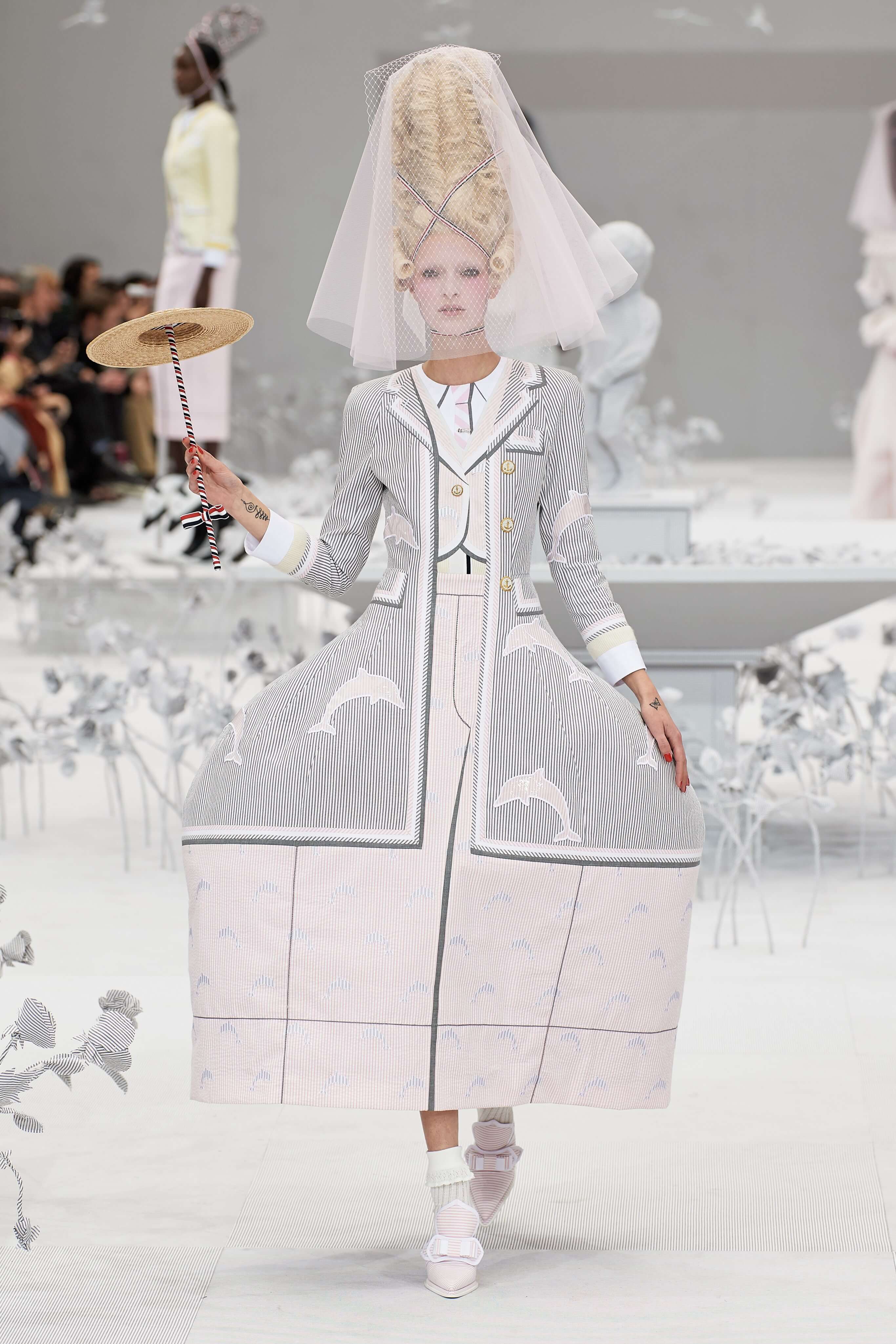 Конфетные костюмы с кринолинами вместо брюк, культовые платья Thom Browne с нарисованными тройками и галстуками, остроносые туфли с бантами, корсеты с розами, напоминающие бейсбольную экипировку, десятки метров прозрачного тюля и необыкновенно женственные платья из собранных в кокетливые драпировки твида и костюмного хлопка — всё это обильно декорировано бантиками и дополнено маленькими соломенными шляпками, которые модели держат в руках на палочках, как леденцы. Шуршащие юбки из наслоений лекал мужских костюмов, цикламеновые румяна, высокие прически с вуалями и неизменно ироничные аппликации на пастельных нарядах, как, например, тряпичный корабль, качающийся на волнах пышной юбки.