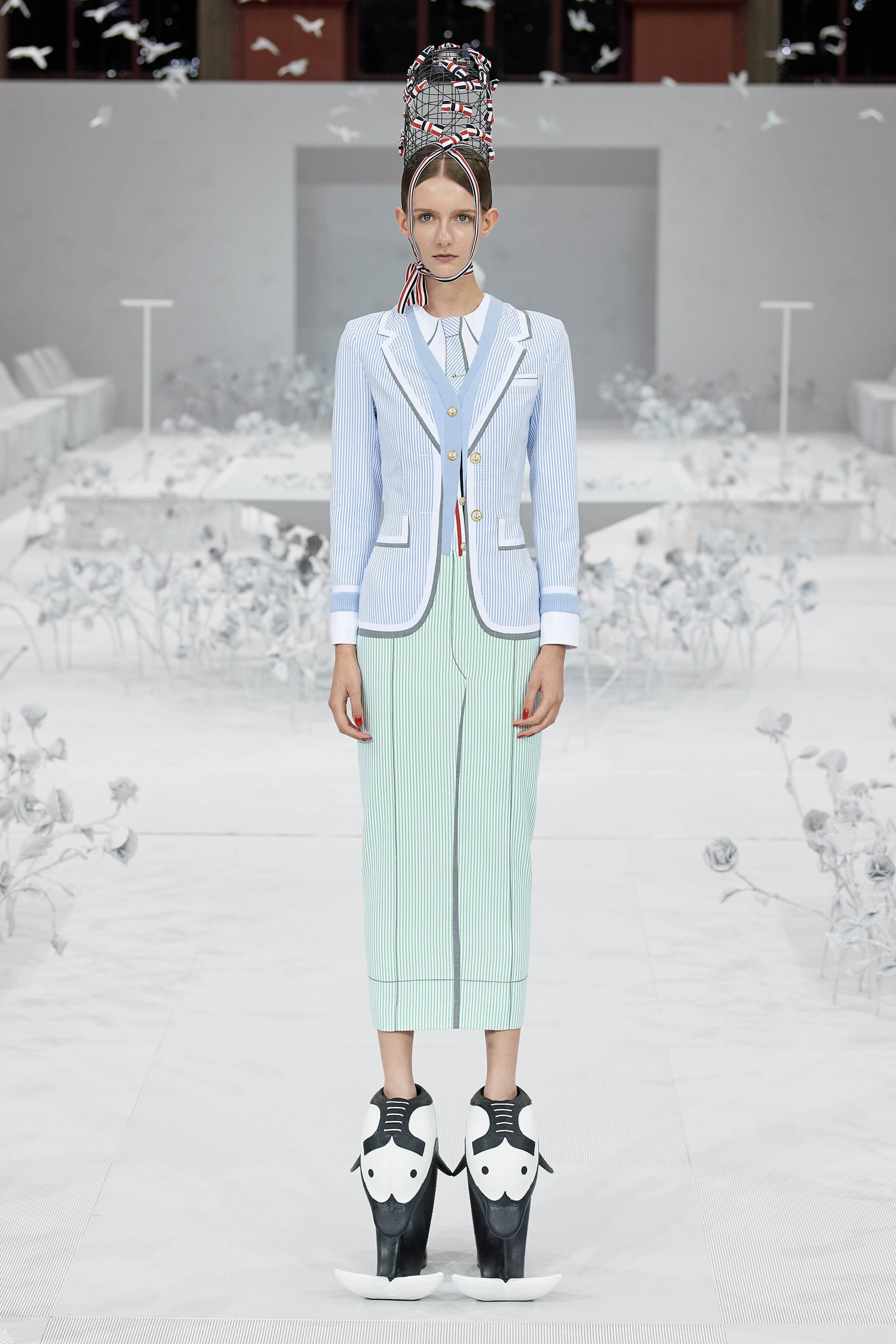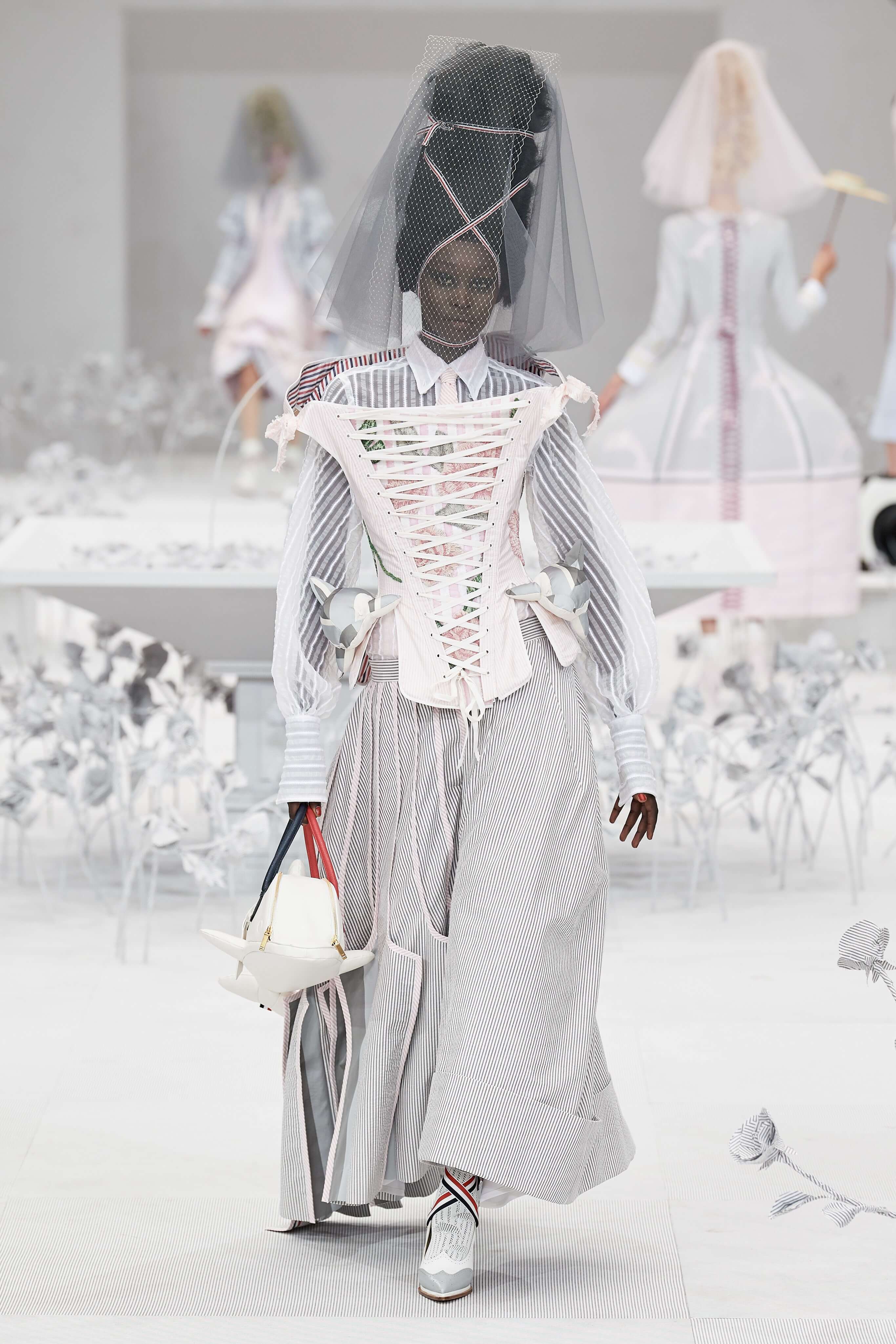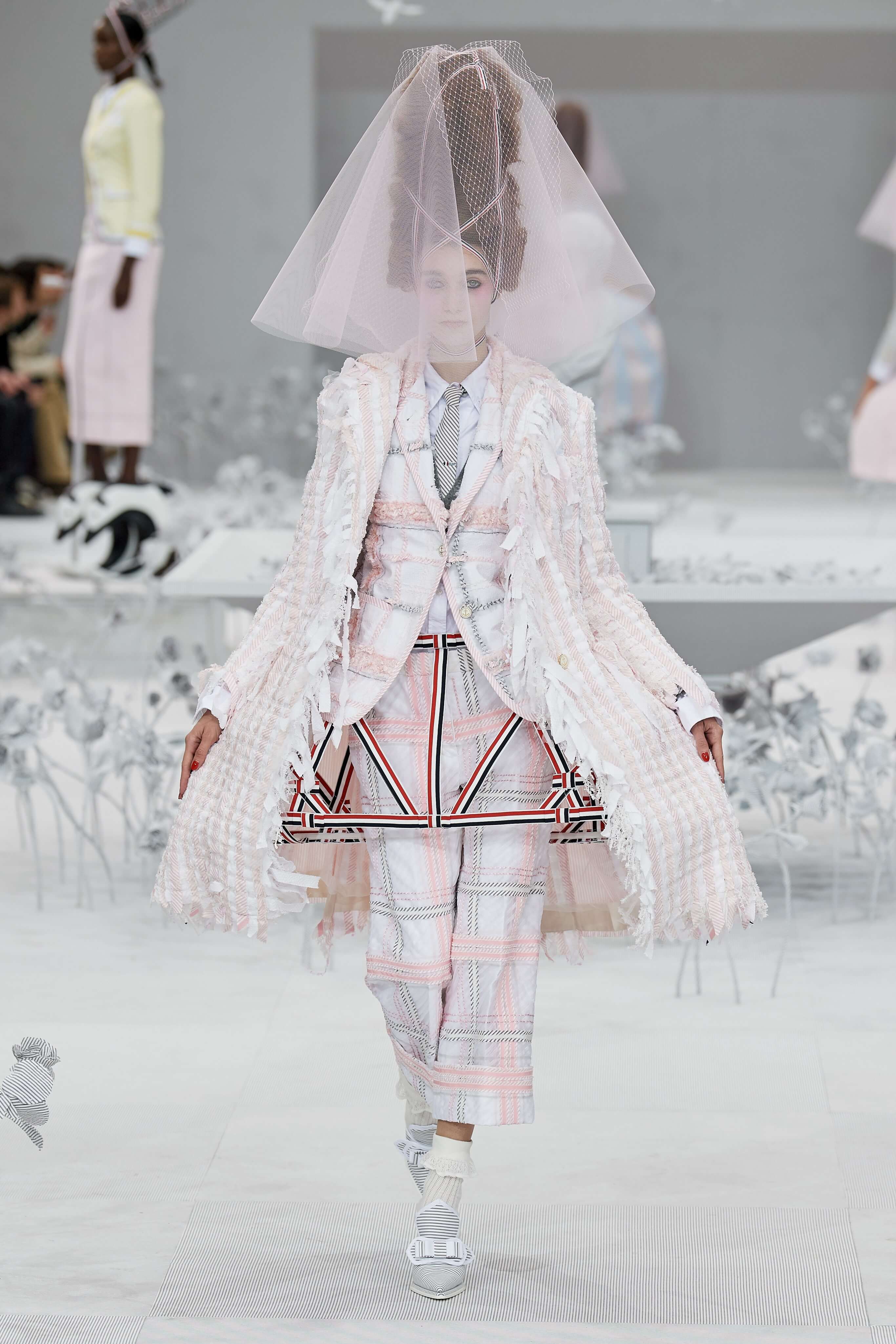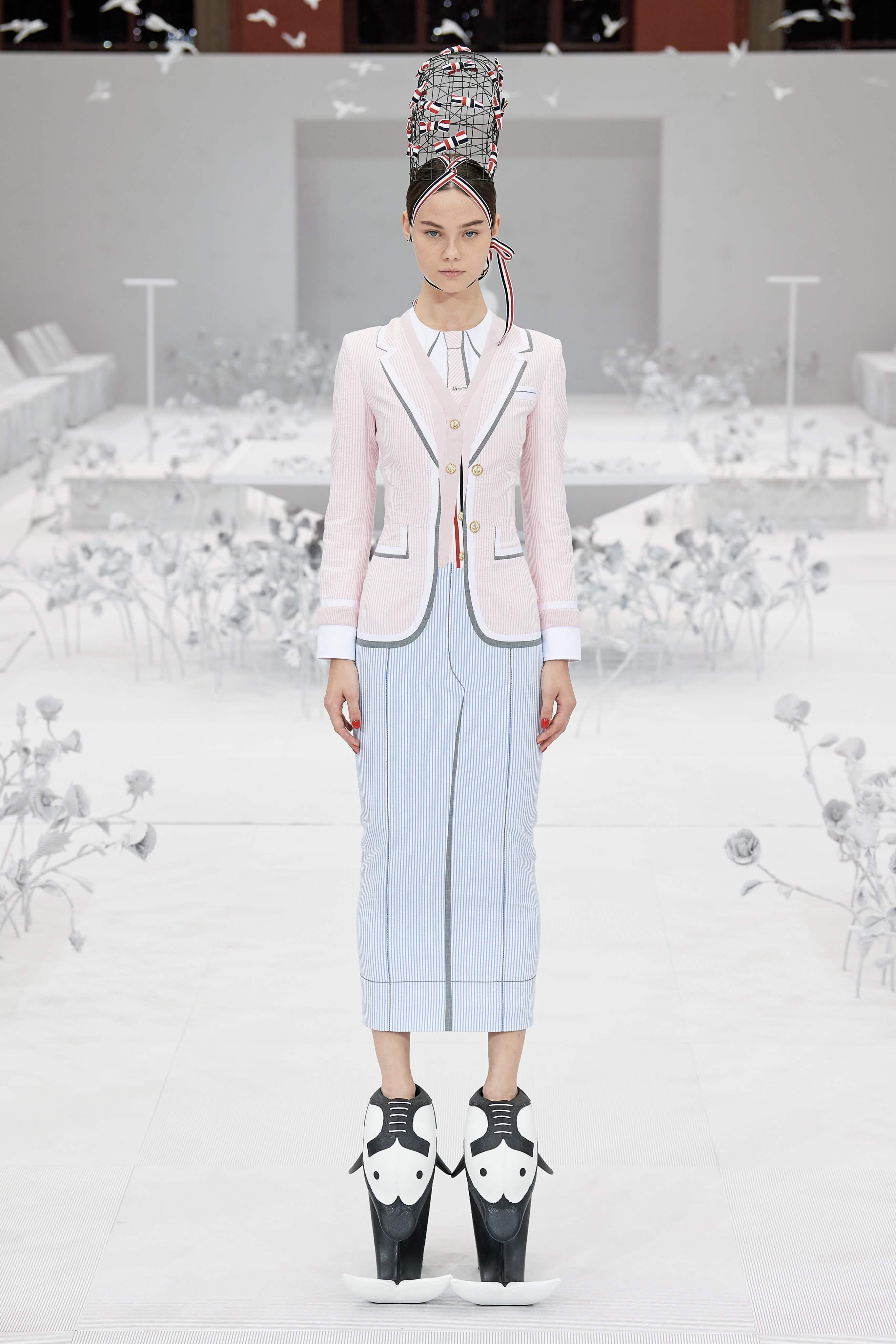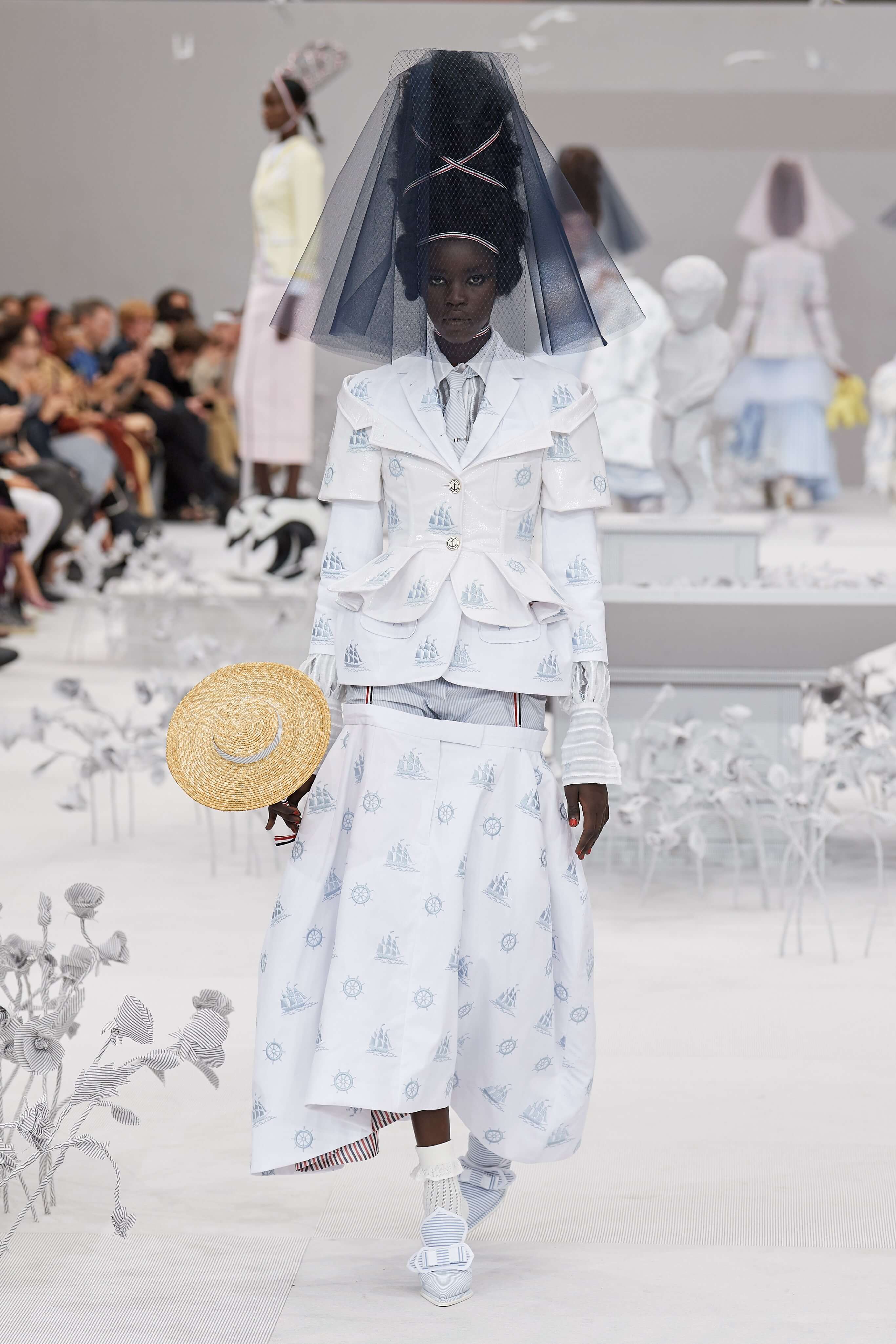 Конфетные костюмы с кринолинами вместо брюк, культовые платья Thom Browne с нарисованными тройками и галстуками, остроносые туфли с бантами, корсеты с розами, напоминающие бейсбольную экипировку, десятки метров прозрачного тюля и необыкновенно женственные платья из собранных в кокетливые драпировки твида и костюмного хлопка — всё это обильно декорировано бантиками и дополнено маленькими соломенными шляпками, которые модели держат в руках на палочках, как леденцы. Шуршащие юбки из наслоений лекал мужских костюмов, цикламеновые румяна, высокие прически с вуалями и неизменно ироничные аппликации на пастельных нарядах, как, например, тряпичный корабль, качающийся на волнах пышной юбки.