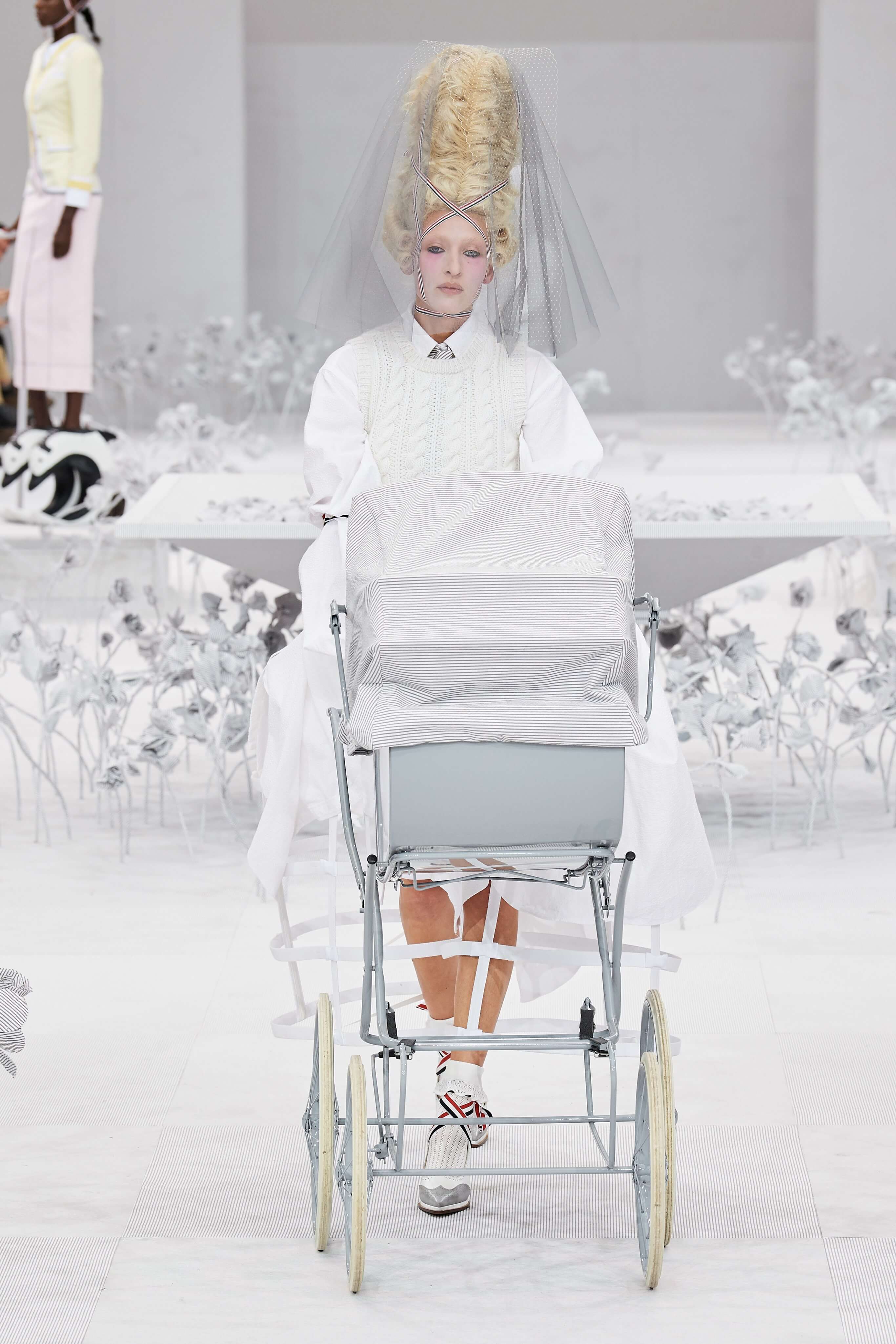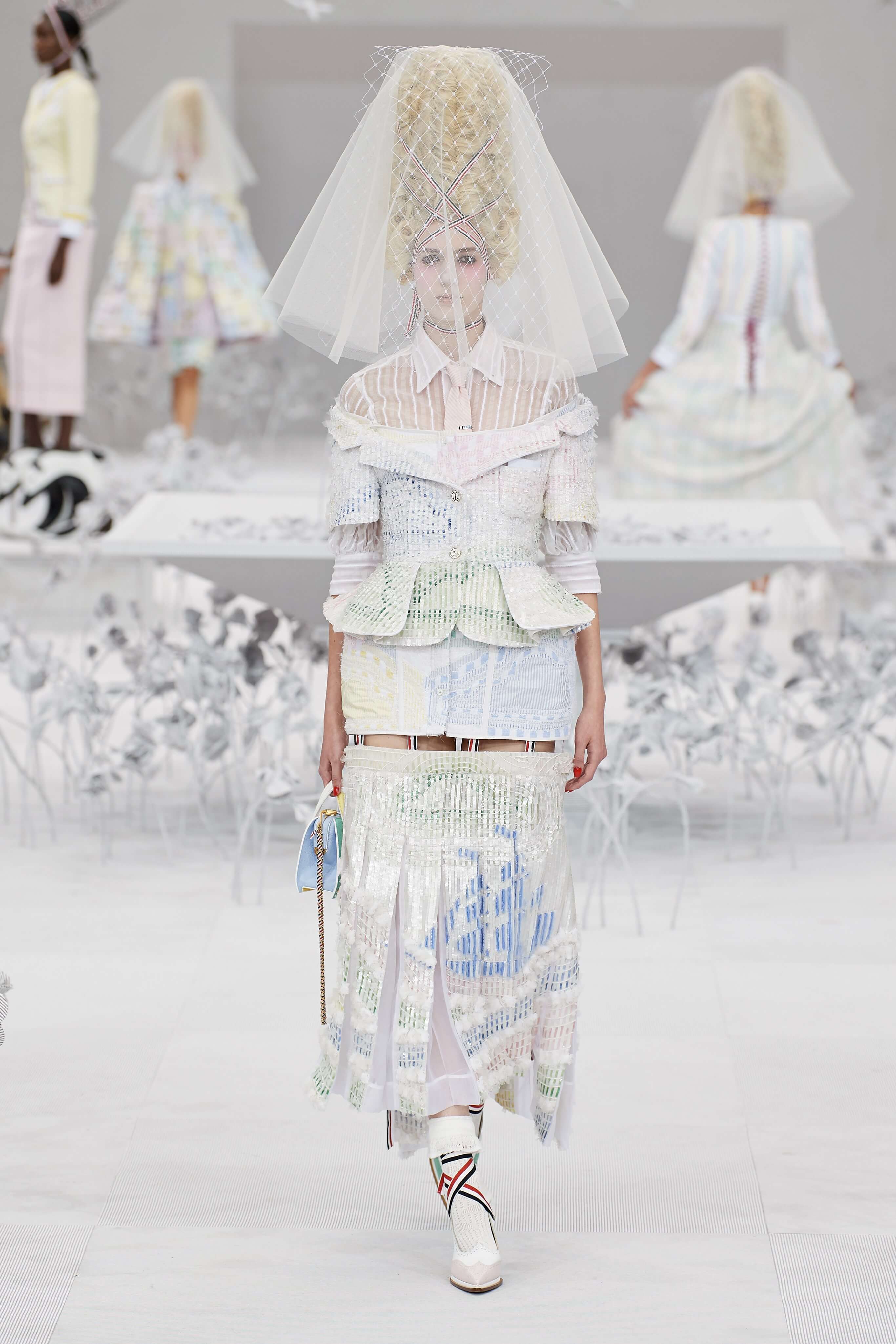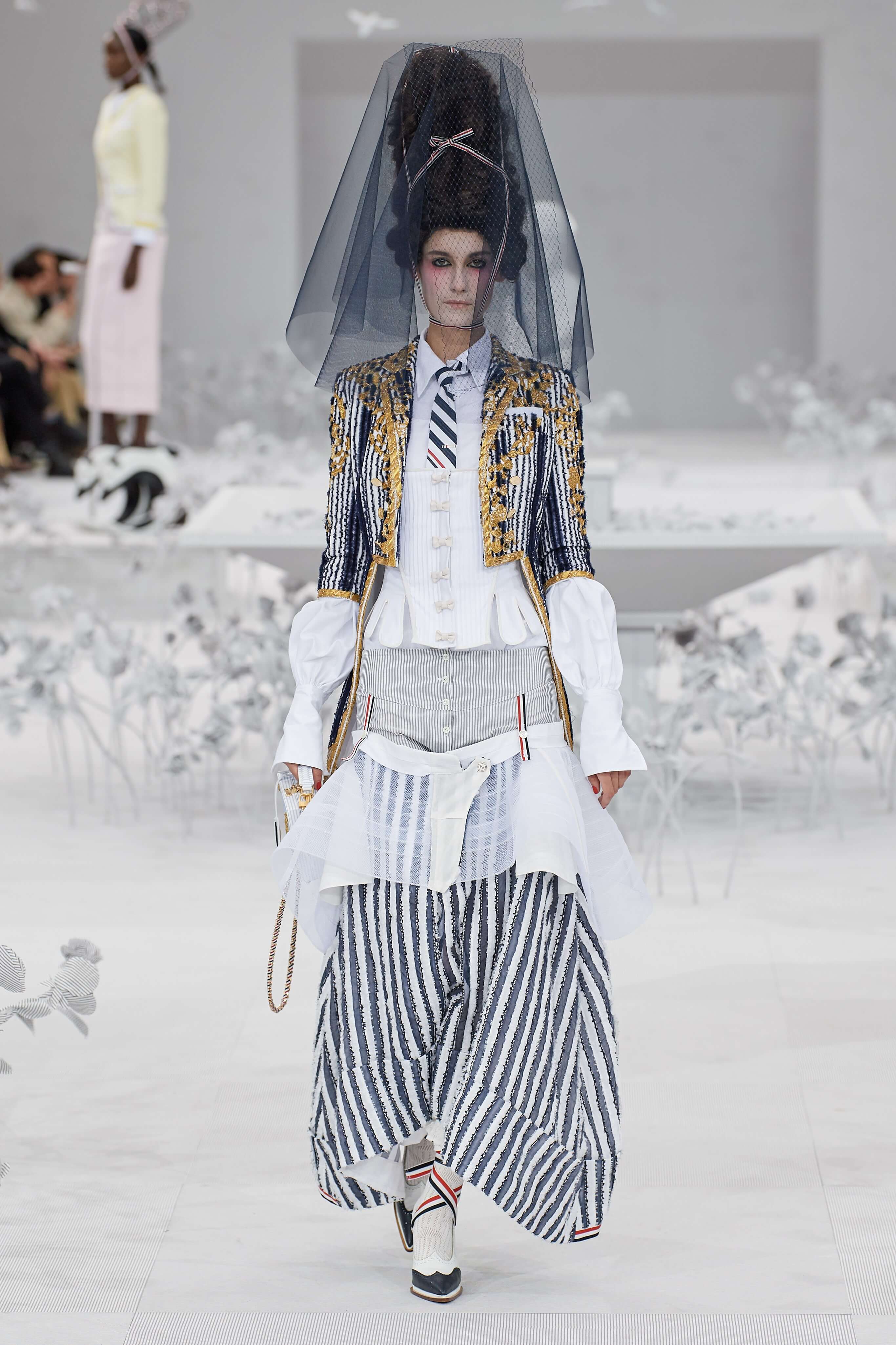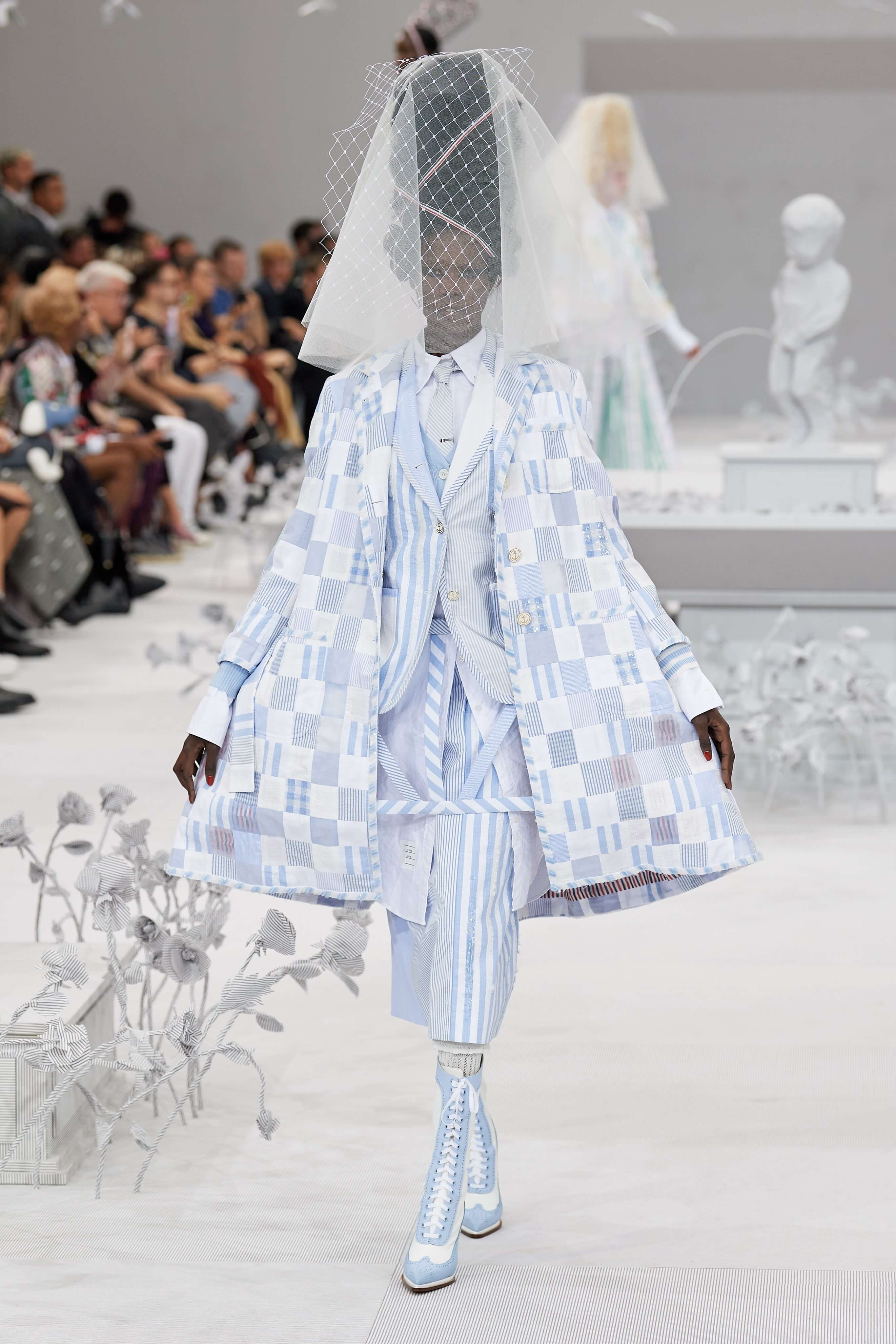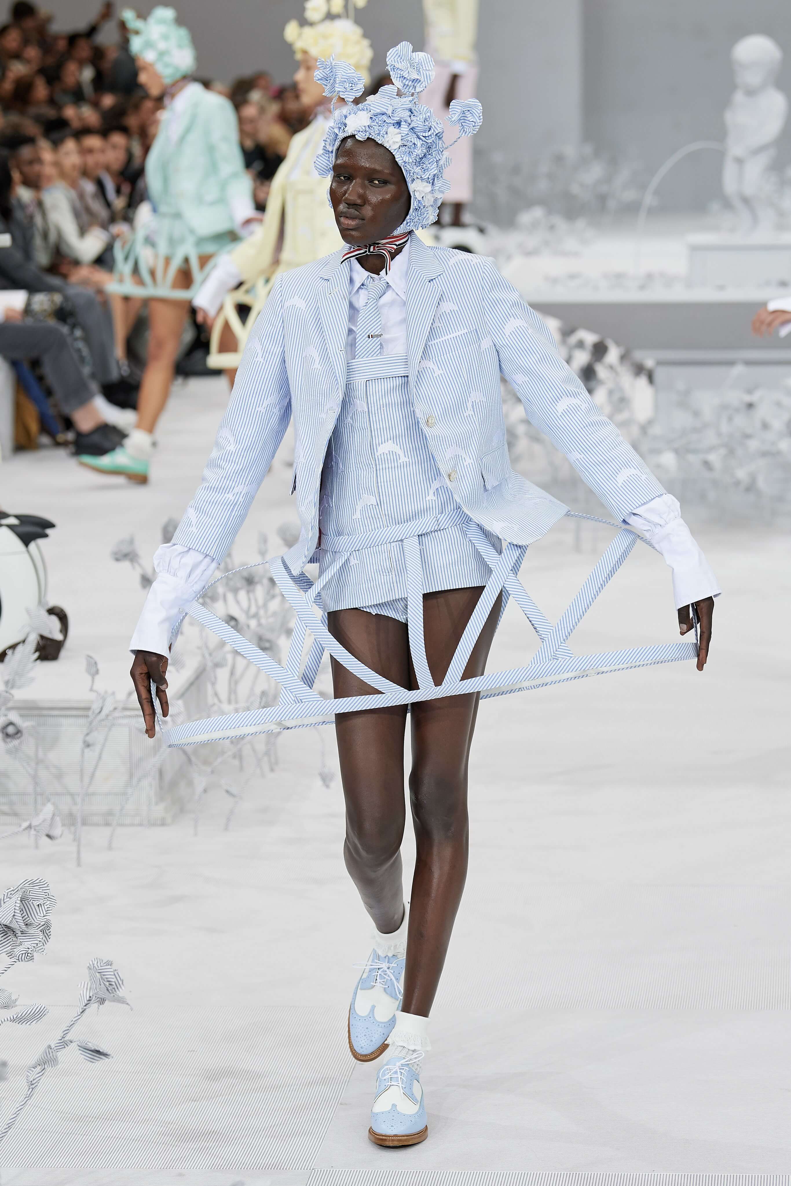 Конфетные костюмы с кринолинами вместо брюк, культовые платья Thom Browne с нарисованными тройками и галстуками, остроносые туфли с бантами, корсеты с розами, напоминающие бейсбольную экипировку, десятки метров прозрачного тюля и необыкновенно женственные платья из собранных в кокетливые драпировки твида и костюмного хлопка — всё это обильно декорировано бантиками и дополнено маленькими соломенными шляпками, которые модели держат в руках на палочках, как леденцы. Шуршащие юбки из наслоений лекал мужских костюмов, цикламеновые румяна, высокие прически с вуалями и неизменно ироничные аппликации на пастельных нарядах, как, например, тряпичный корабль, качающийся на волнах пышной юбки.