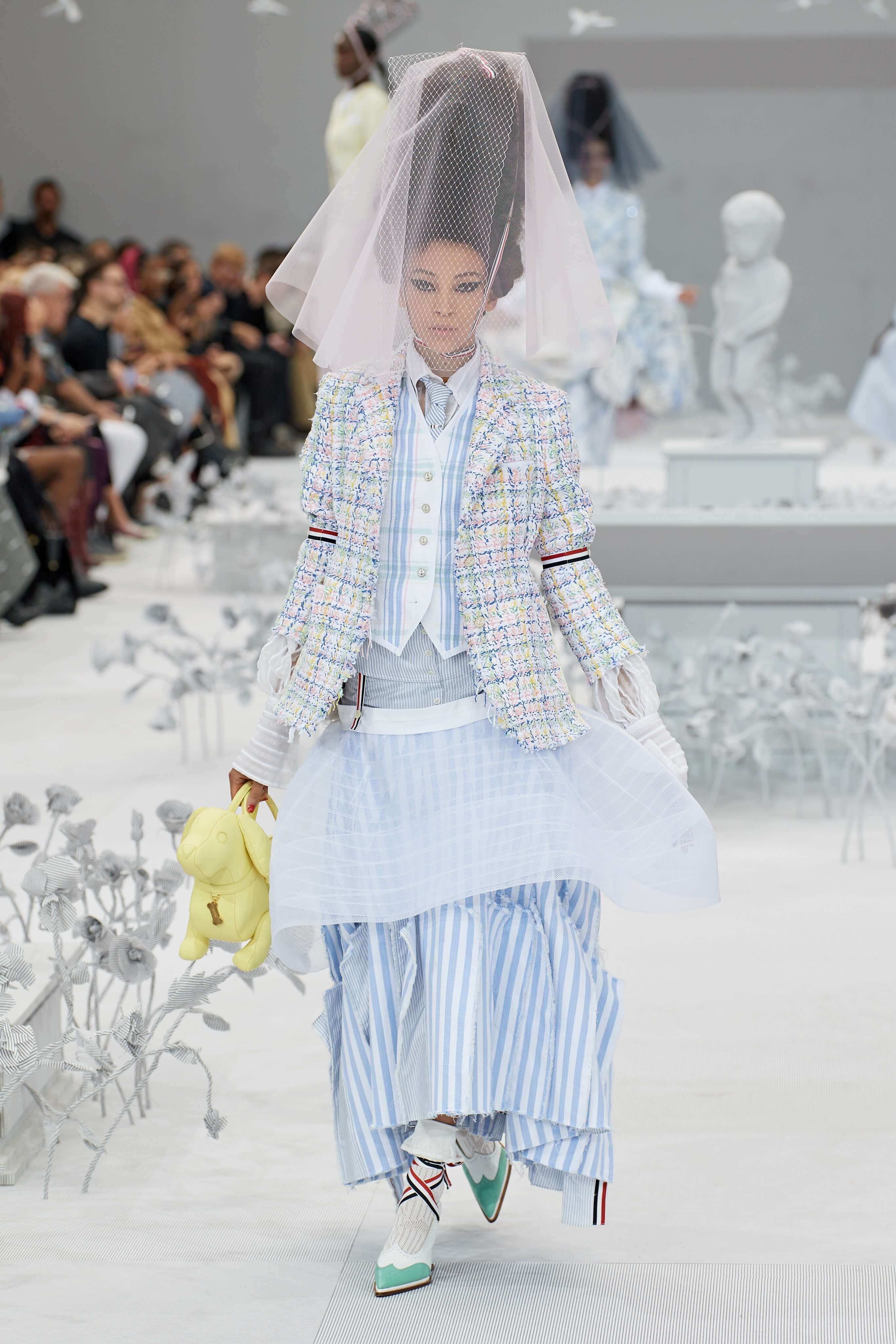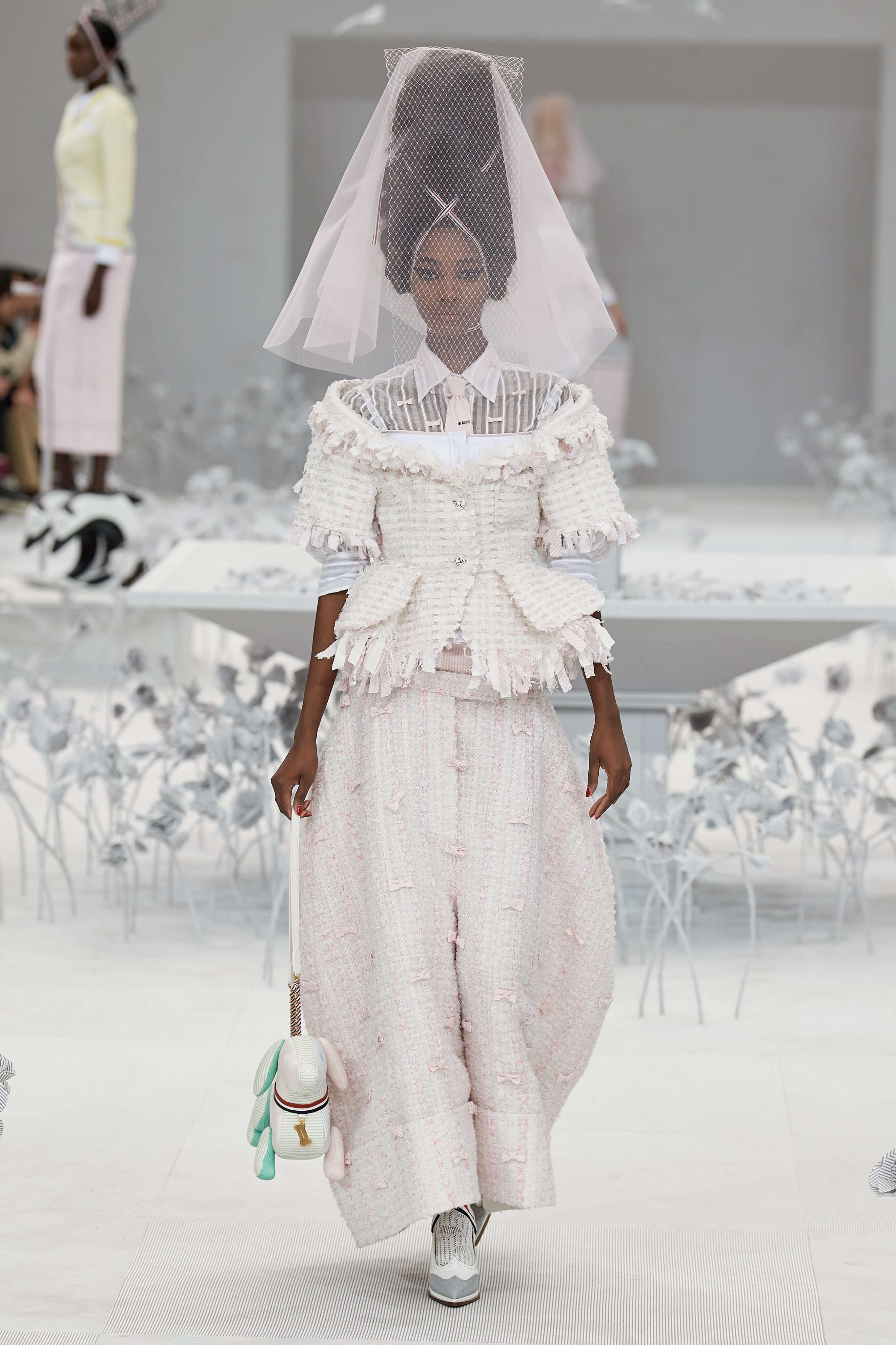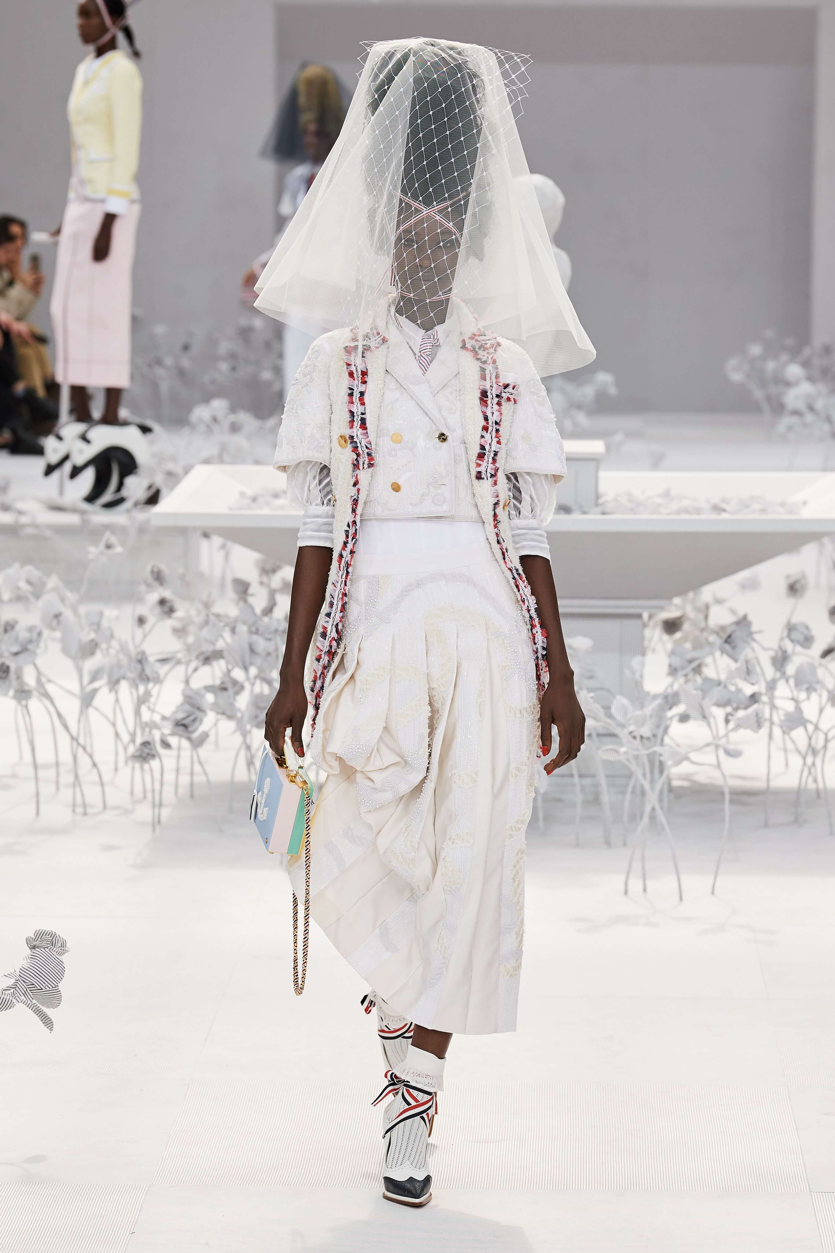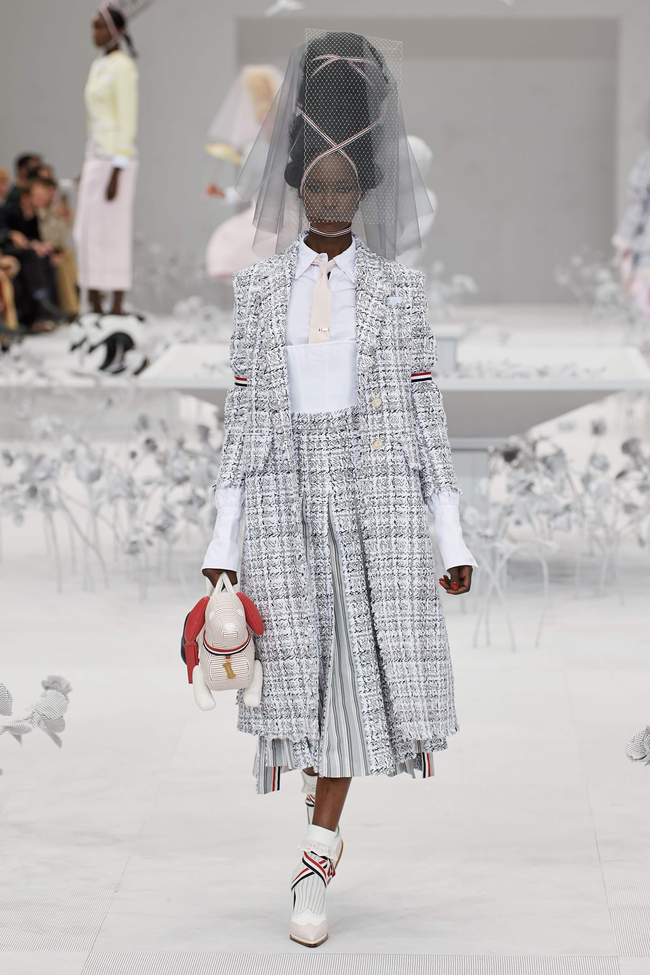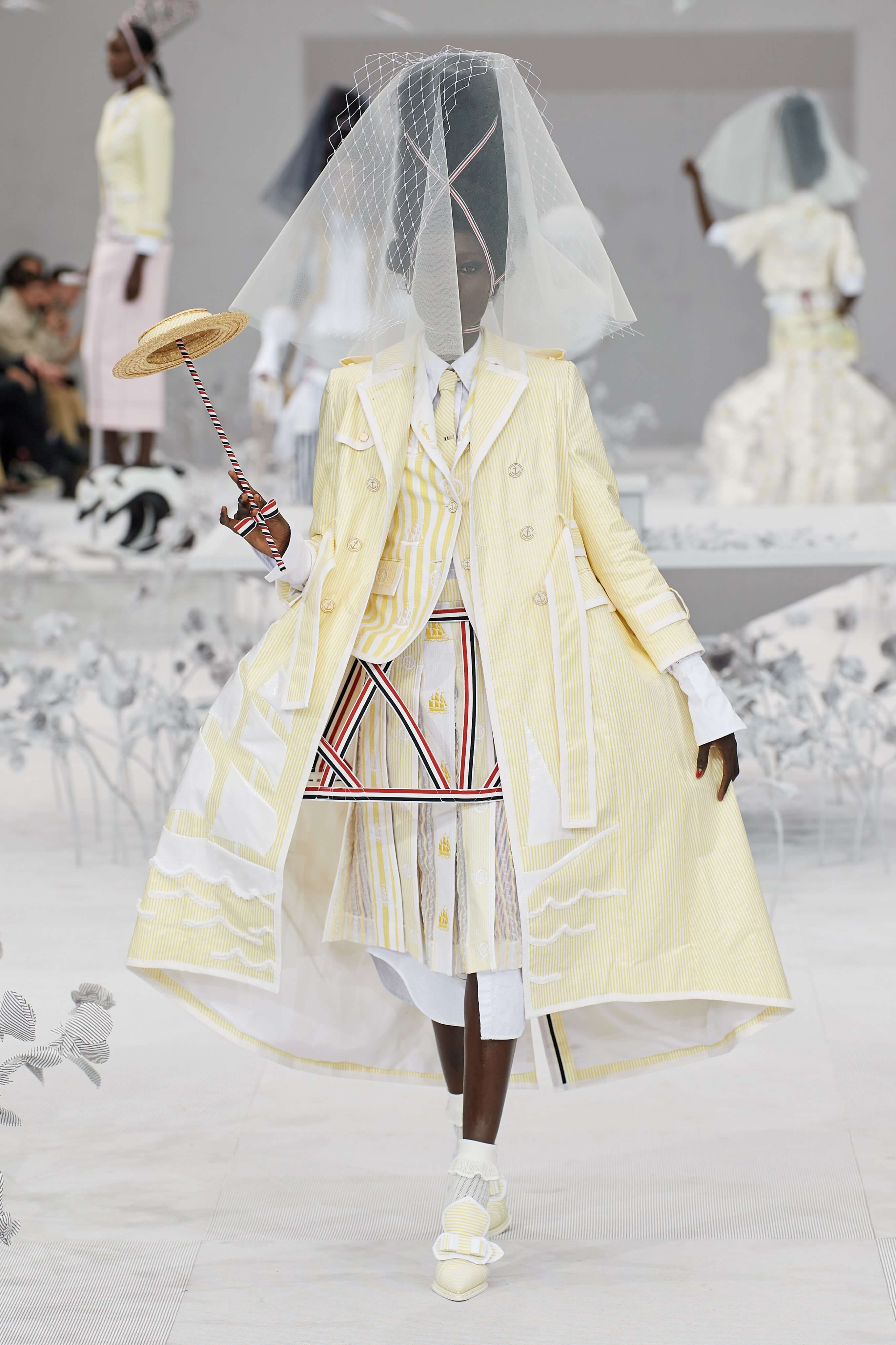 Конфетные костюмы с кринолинами вместо брюк, культовые платья Thom Browne с нарисованными тройками и галстуками, остроносые туфли с бантами, корсеты с розами, напоминающие бейсбольную экипировку, десятки метров прозрачного тюля и необыкновенно женственные платья из собранных в кокетливые драпировки твида и костюмного хлопка — всё это обильно декорировано бантиками и дополнено маленькими соломенными шляпками, которые модели держат в руках на палочках, как леденцы. Шуршащие юбки из наслоений лекал мужских костюмов, цикламеновые румяна, высокие прически с вуалями и неизменно ироничные аппликации на пастельных нарядах, как, например, тряпичный корабль, качающийся на волнах пышной юбки.