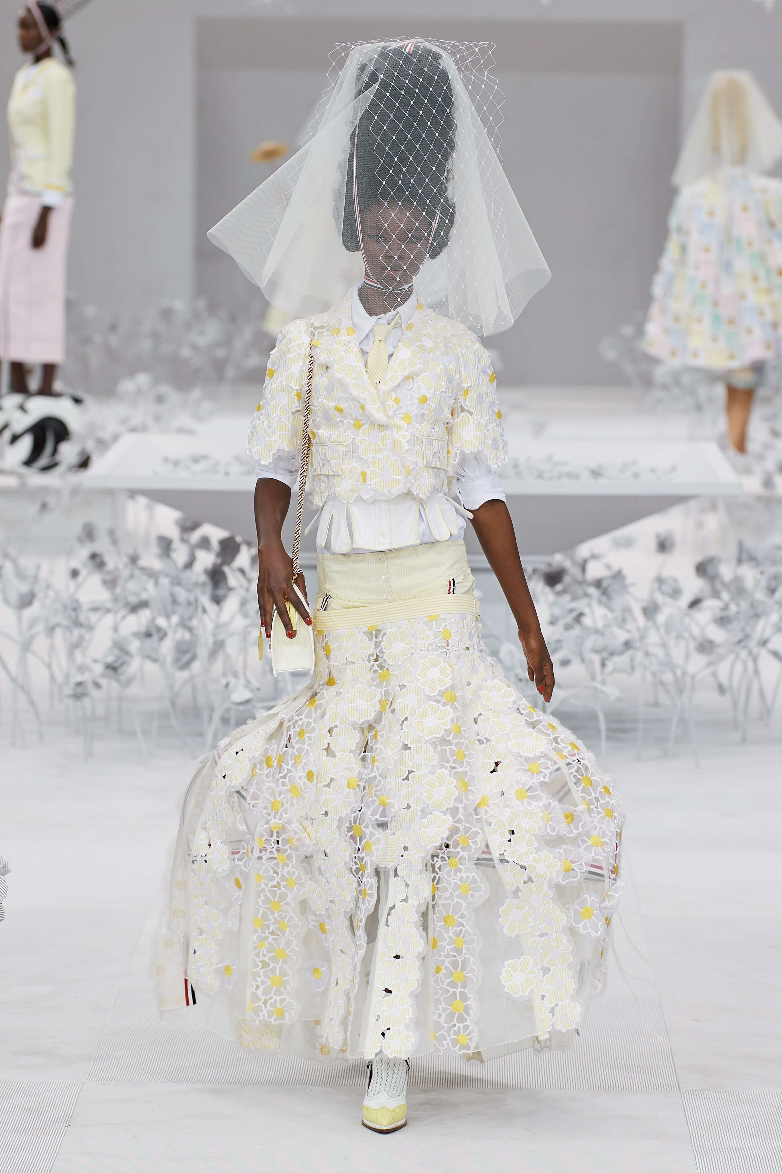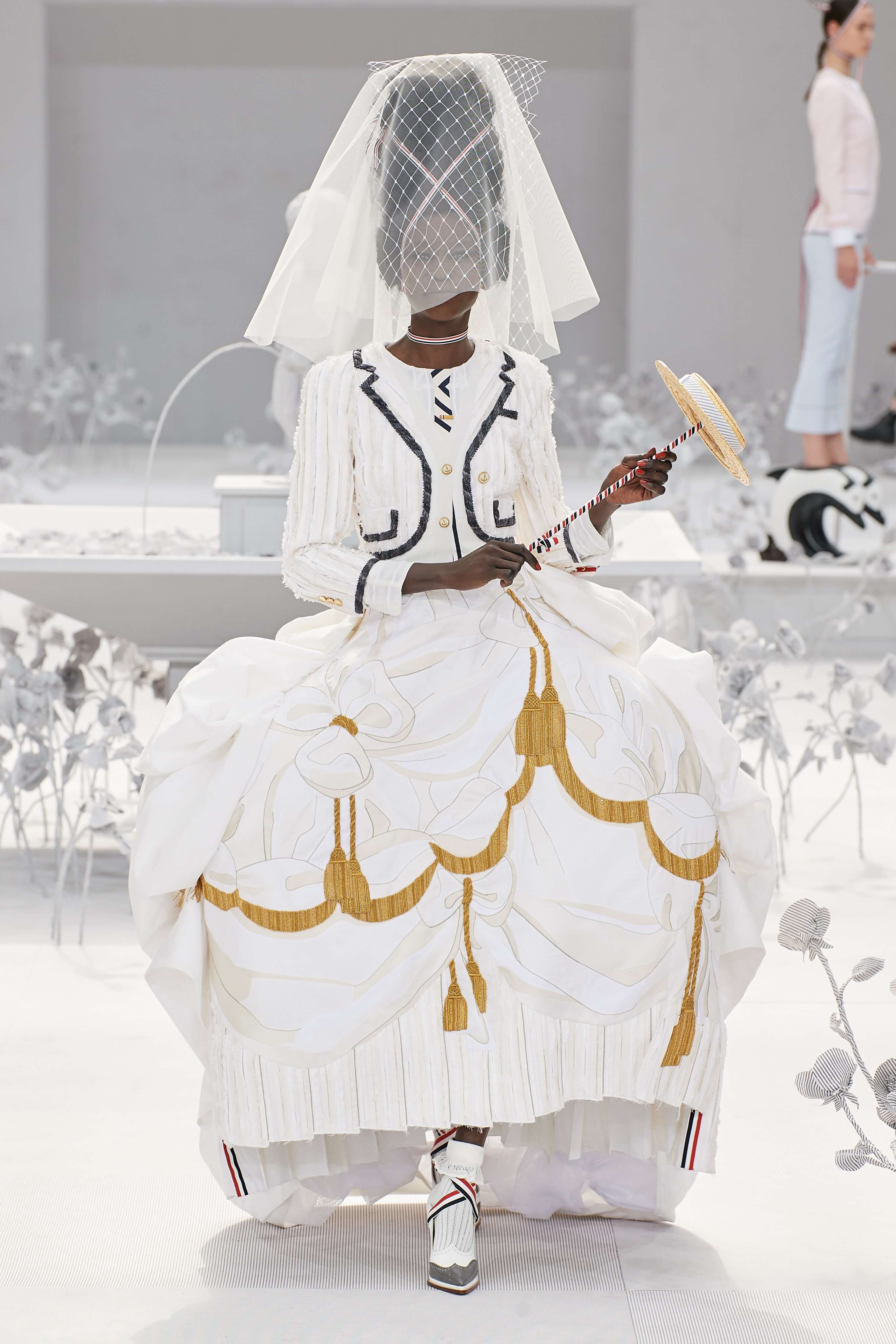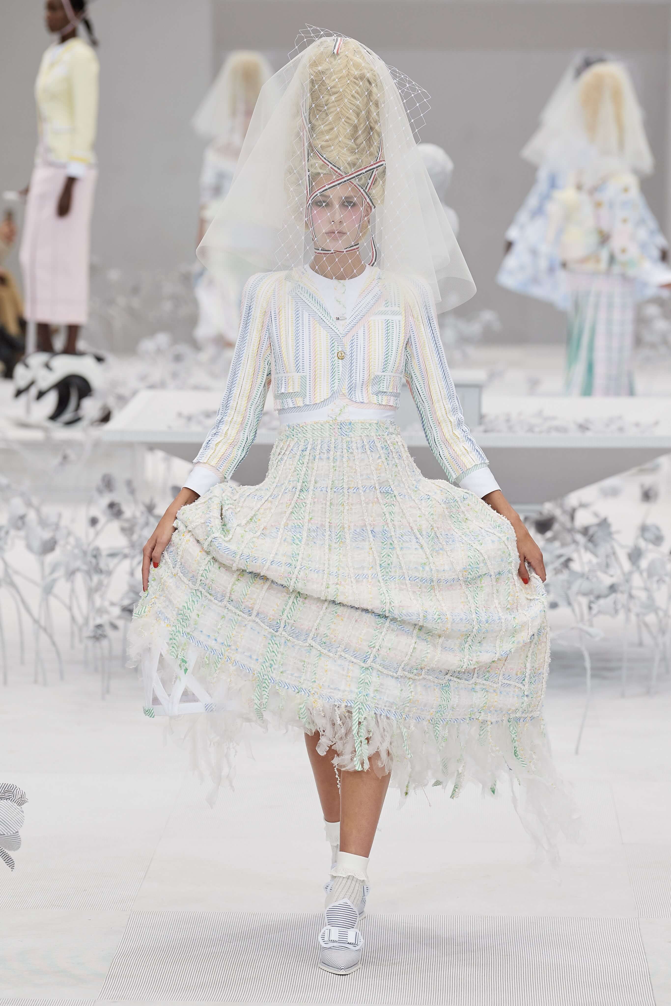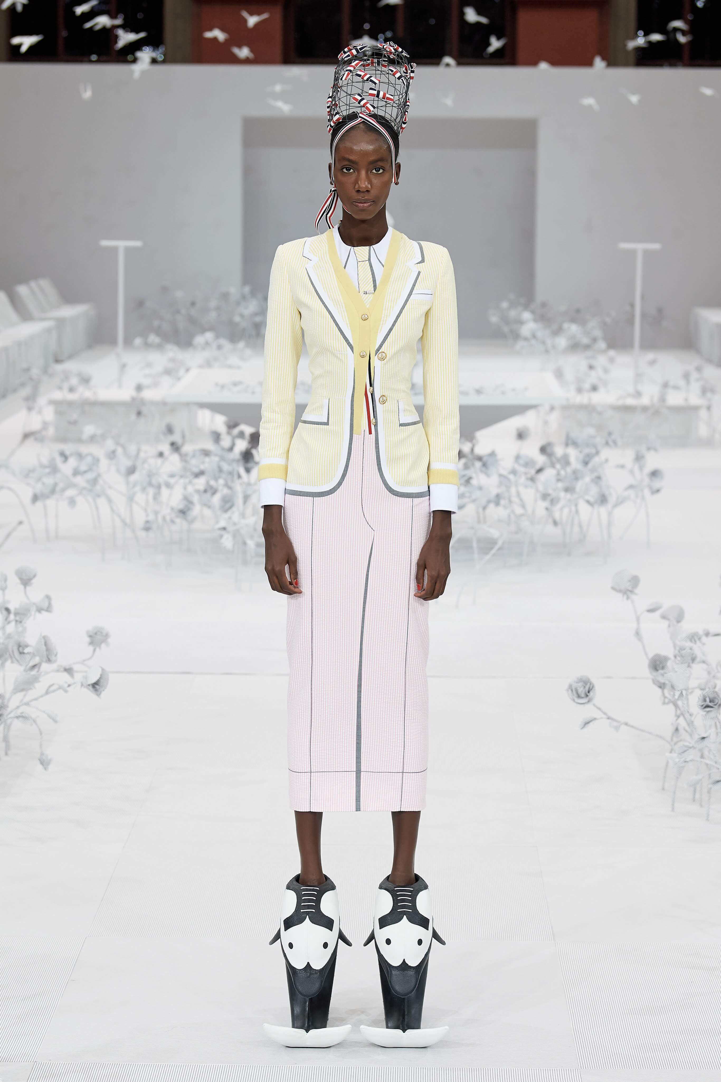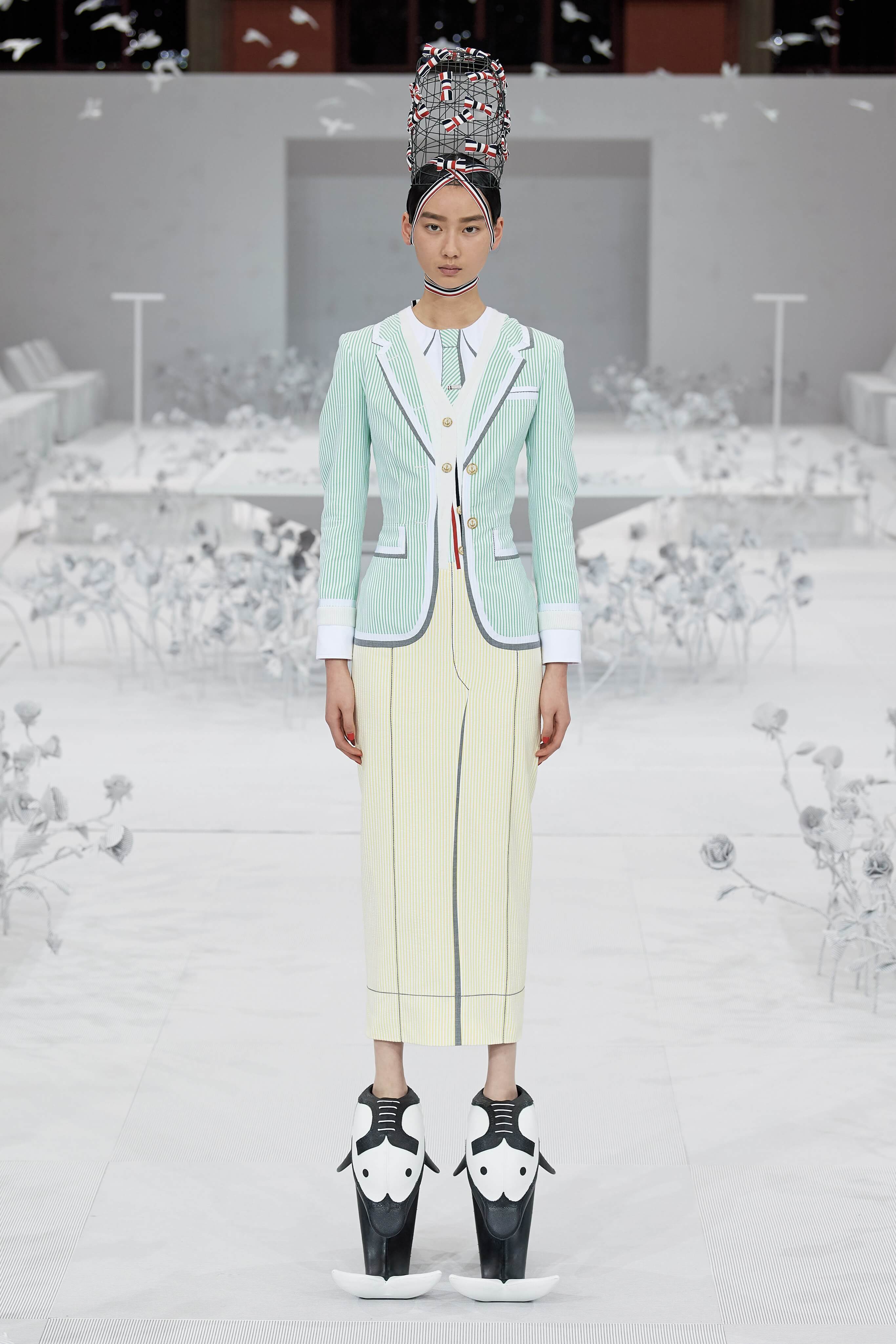 Конфетные костюмы с кринолинами вместо брюк, культовые платья Thom Browne с нарисованными тройками и галстуками, остроносые туфли с бантами, корсеты с розами, напоминающие бейсбольную экипировку, десятки метров прозрачного тюля и необыкновенно женственные платья из собранных в кокетливые драпировки твида и костюмного хлопка — всё это обильно декорировано бантиками и дополнено маленькими соломенными шляпками, которые модели держат в руках на палочках, как леденцы. Шуршащие юбки из наслоений лекал мужских костюмов, цикламеновые румяна, высокие прически с вуалями и неизменно ироничные аппликации на пастельных нарядах, как, например, тряпичный корабль, качающийся на волнах пышной юбки.
