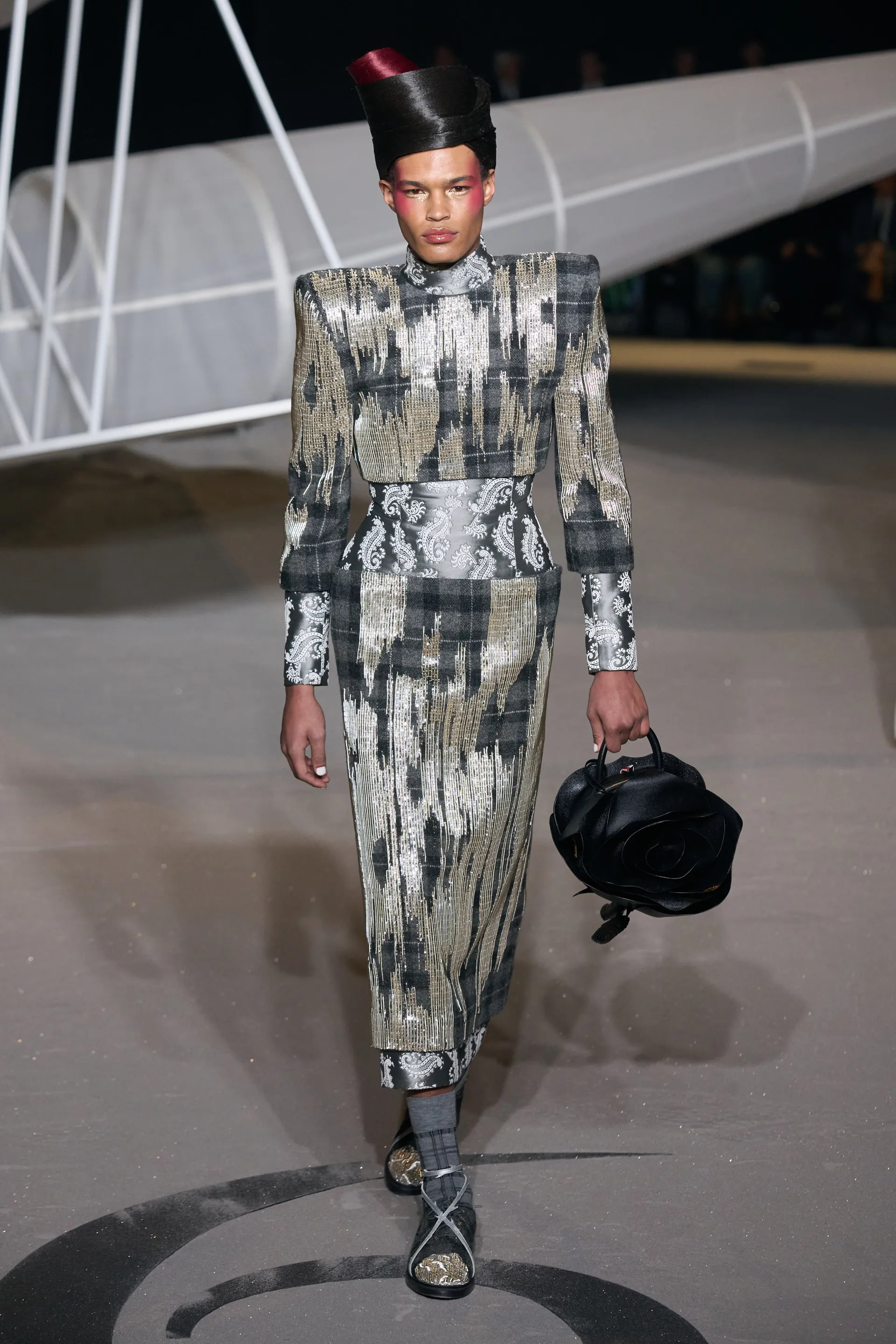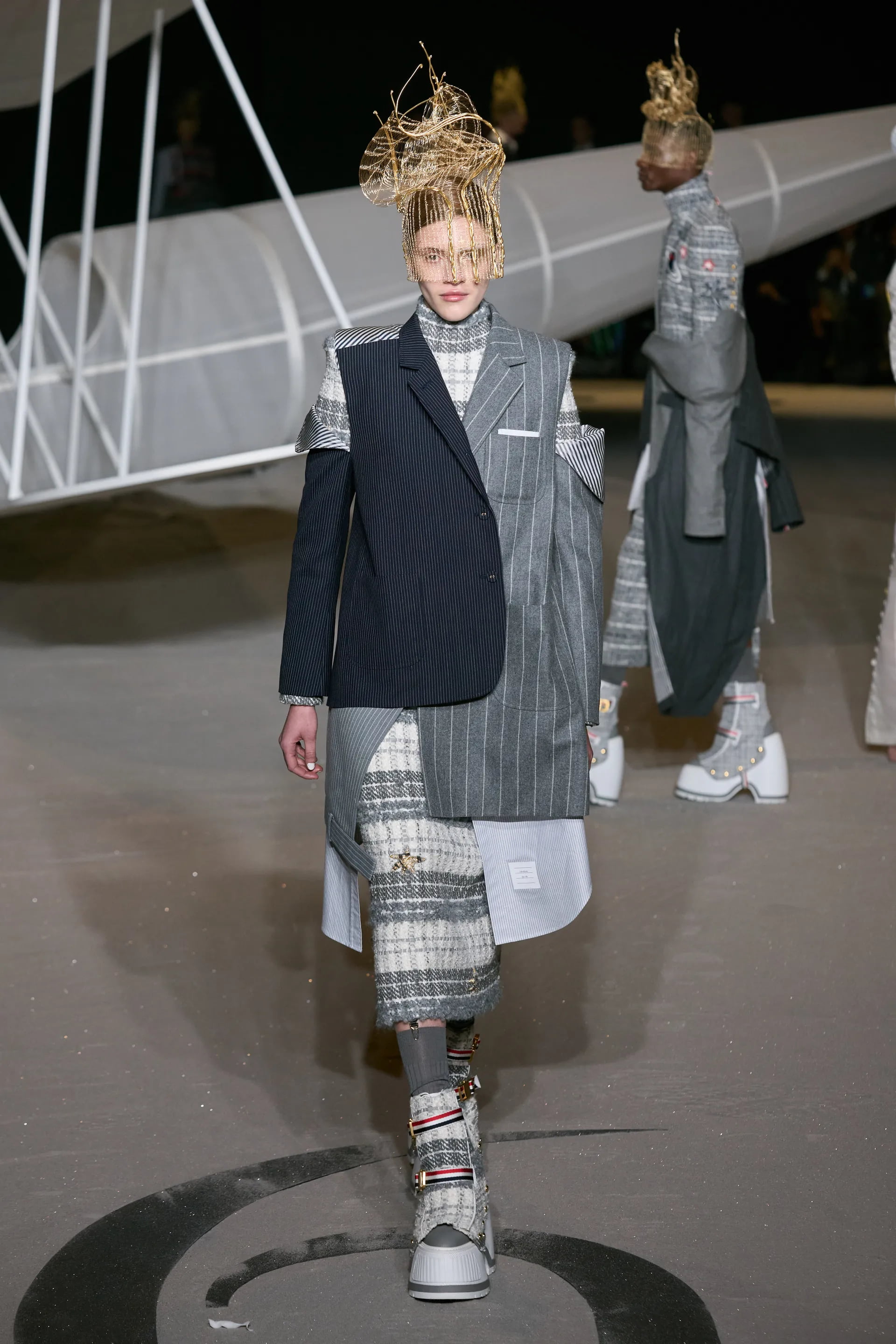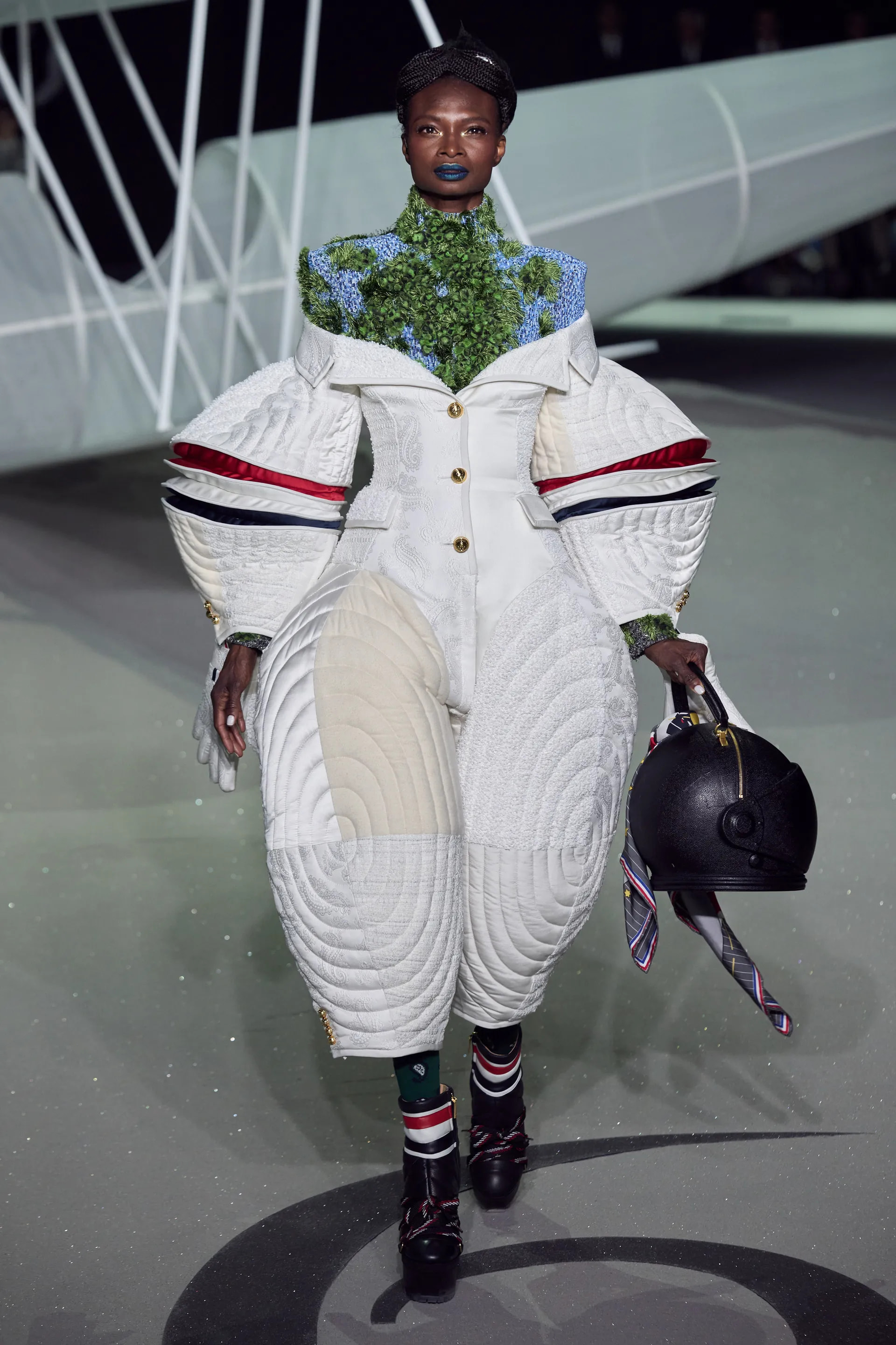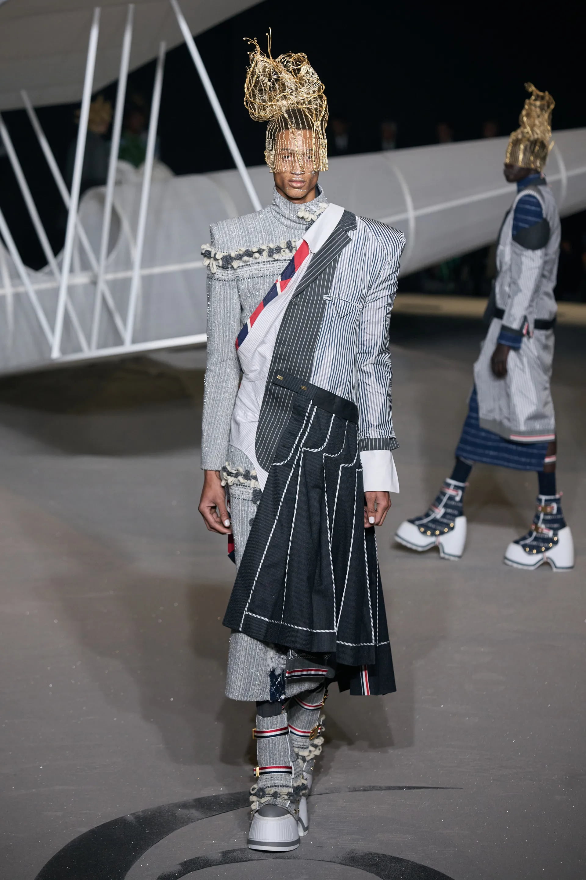 Його шоу тривало понад півгодини, на подіумі був розташований розбитий аероплан, а над ним великі повітряні кулі. Показ розпочався з двох об’ємних образів: максікуртки, оздобленної фірмовими для Thom Browne стрічками синього та червоного кольору, та максіпальта поверх мідісукні букле. Далі дизайнер продовжив історію новели, створивши 7 чоловічих суконь, додаючи різні тематичні принти: троянда, ліхтарник, король та інші.