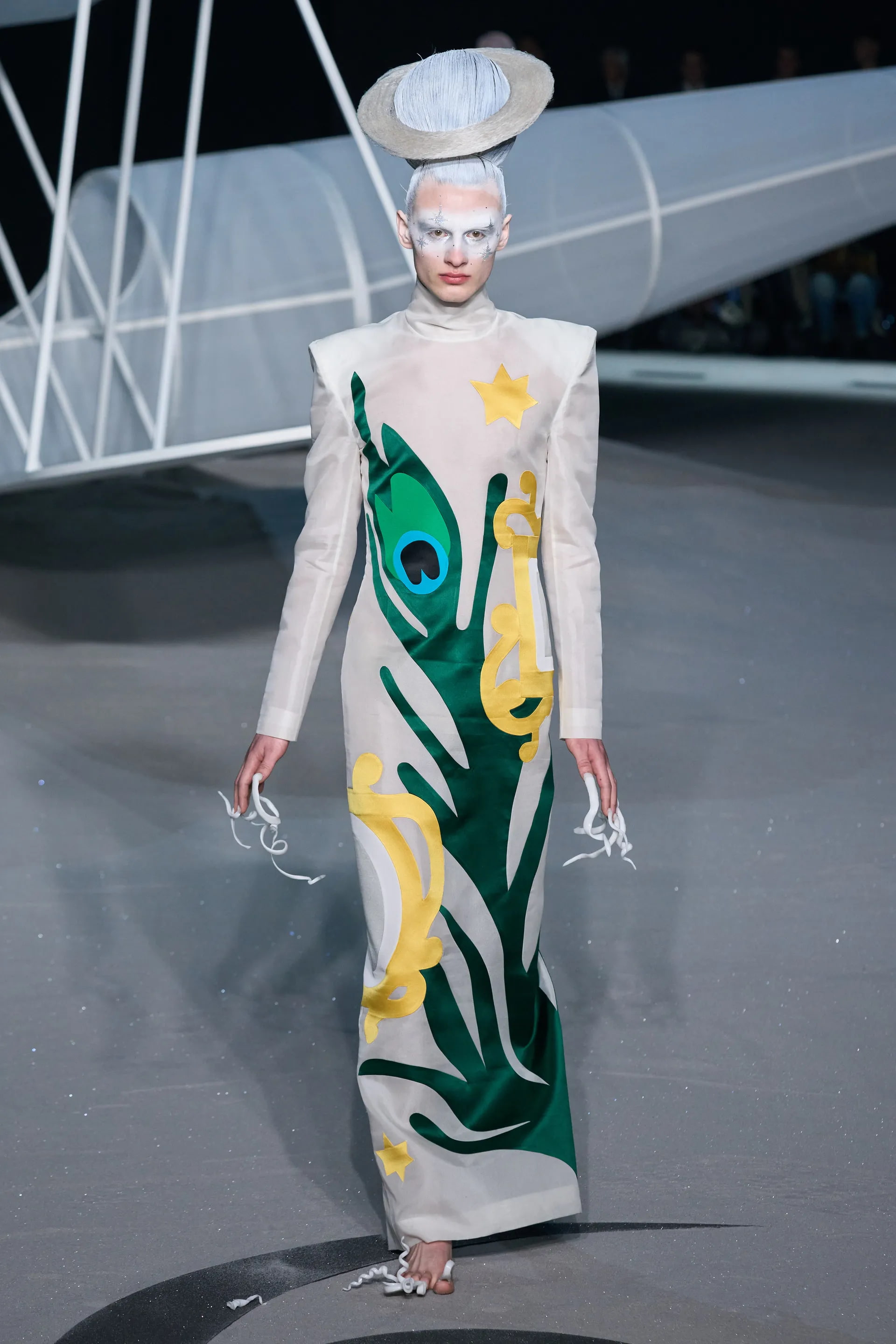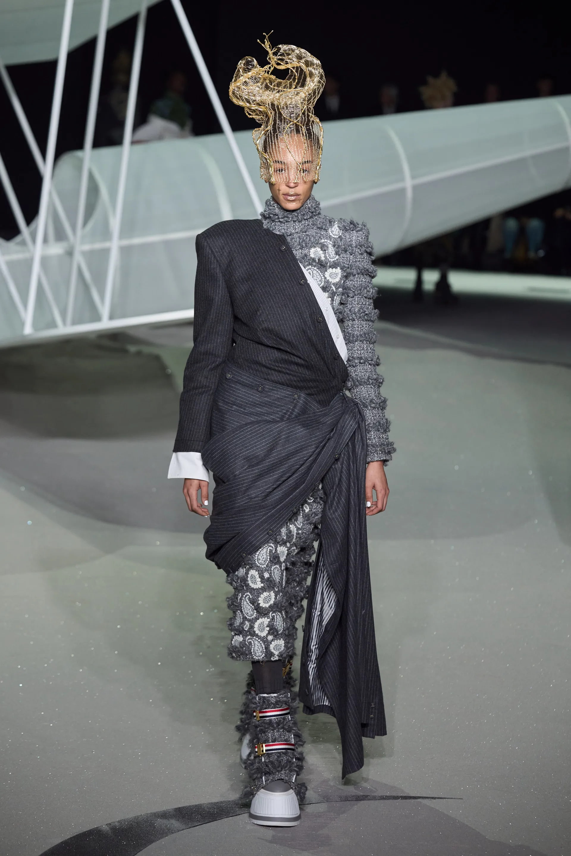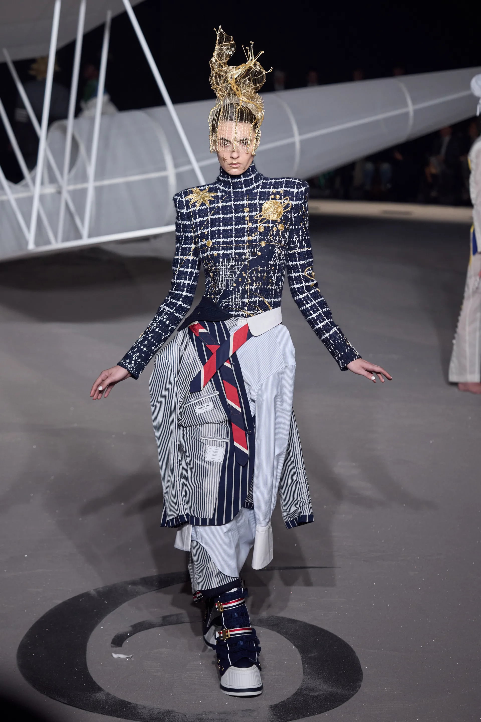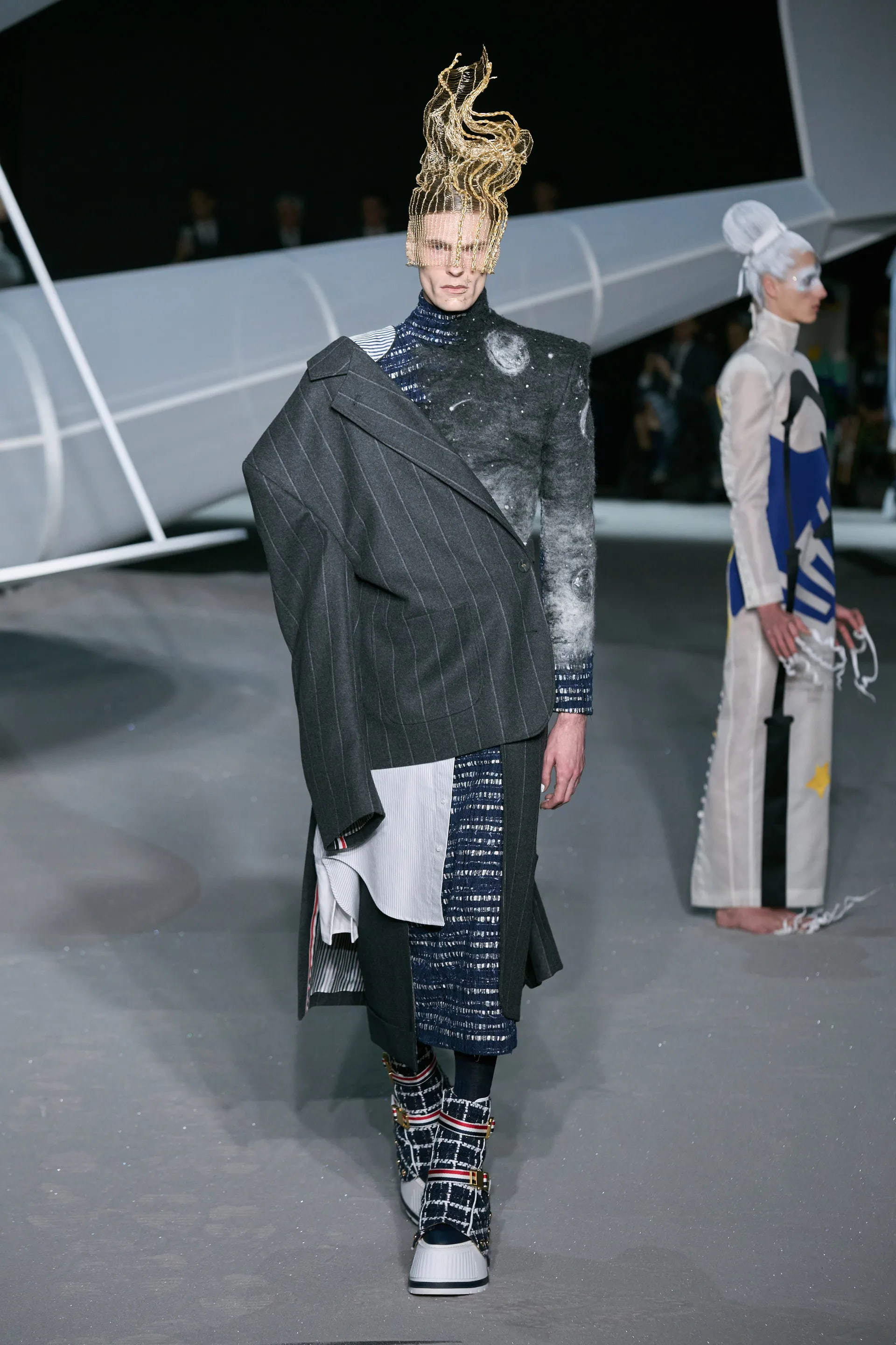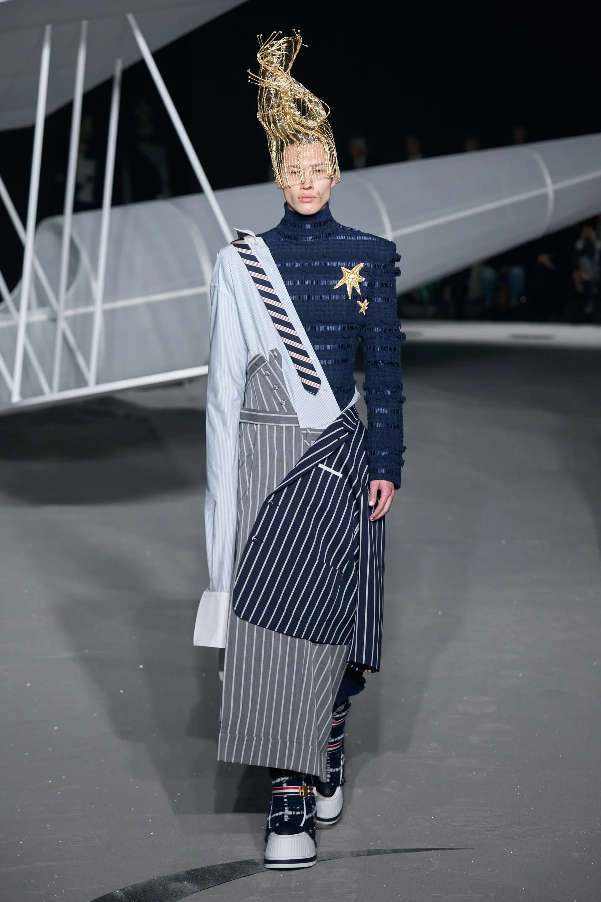 Його шоу тривало понад півгодини, на подіумі був розташований розбитий аероплан, а над ним великі повітряні кулі. Показ розпочався з двох об’ємних образів: максікуртки, оздобленної фірмовими для Thom Browne стрічками синього та червоного кольору, та максіпальта поверх мідісукні букле. Далі дизайнер продовжив історію новели, створивши 7 чоловічих суконь, додаючи різні тематичні принти: троянда, ліхтарник, король та інші.