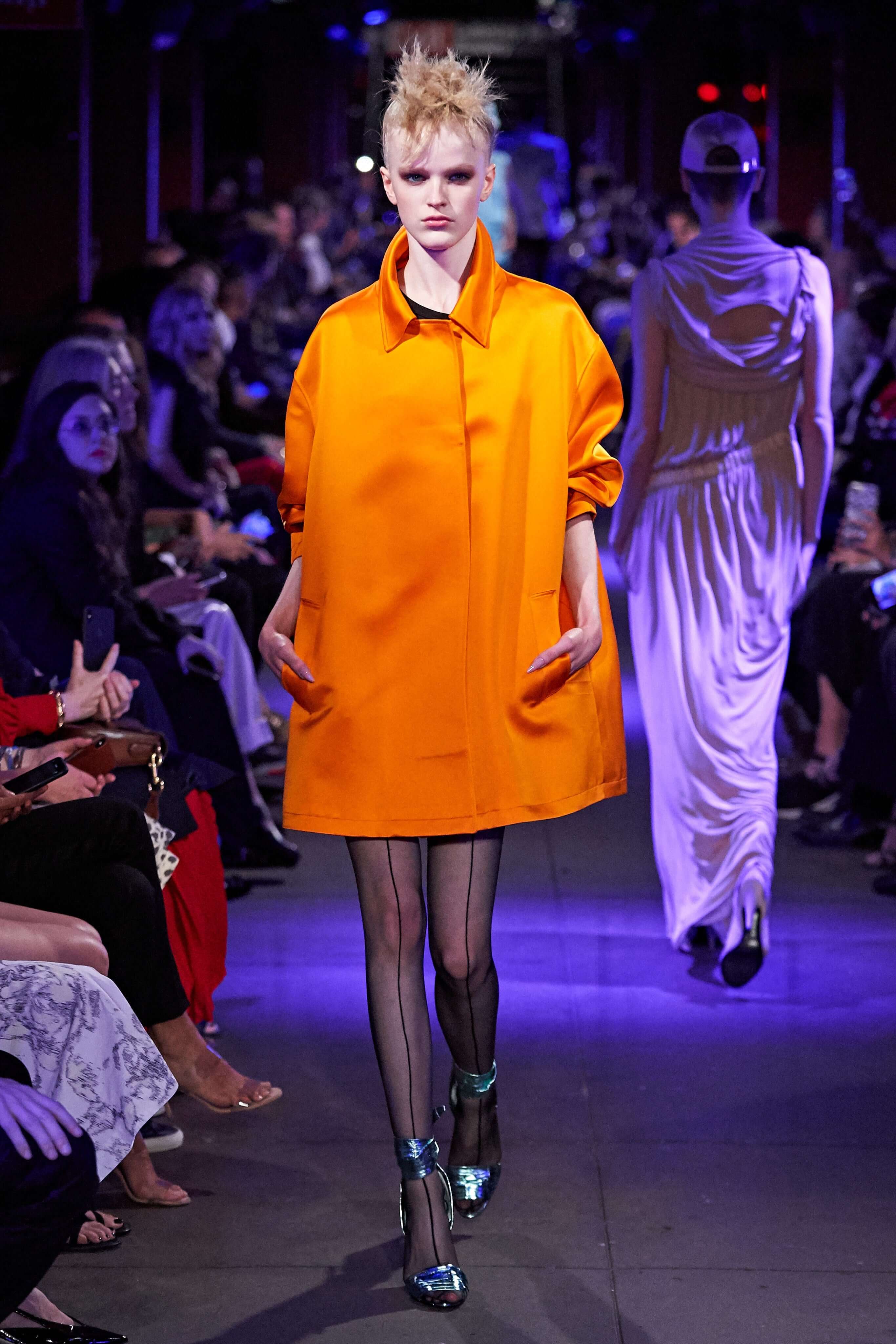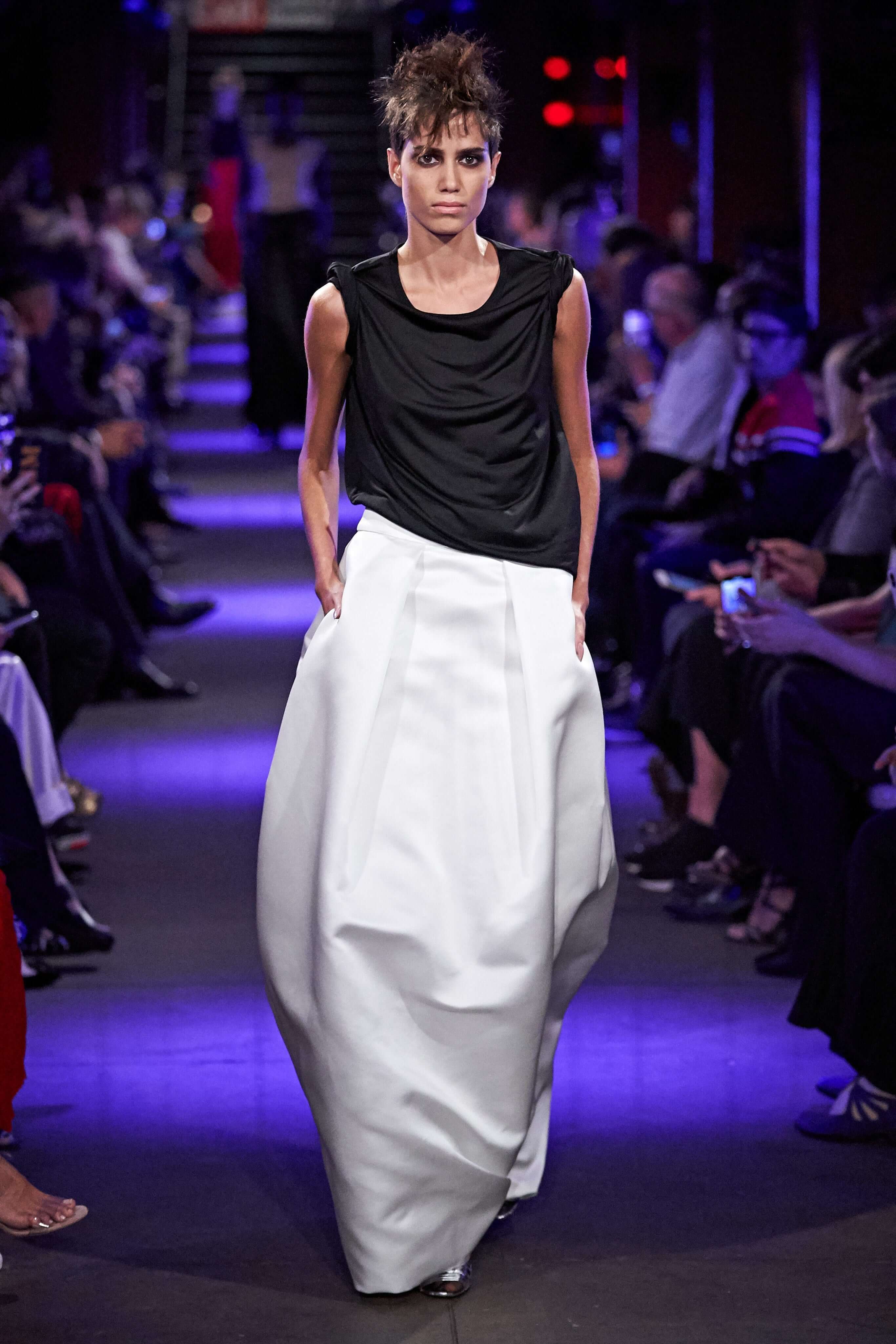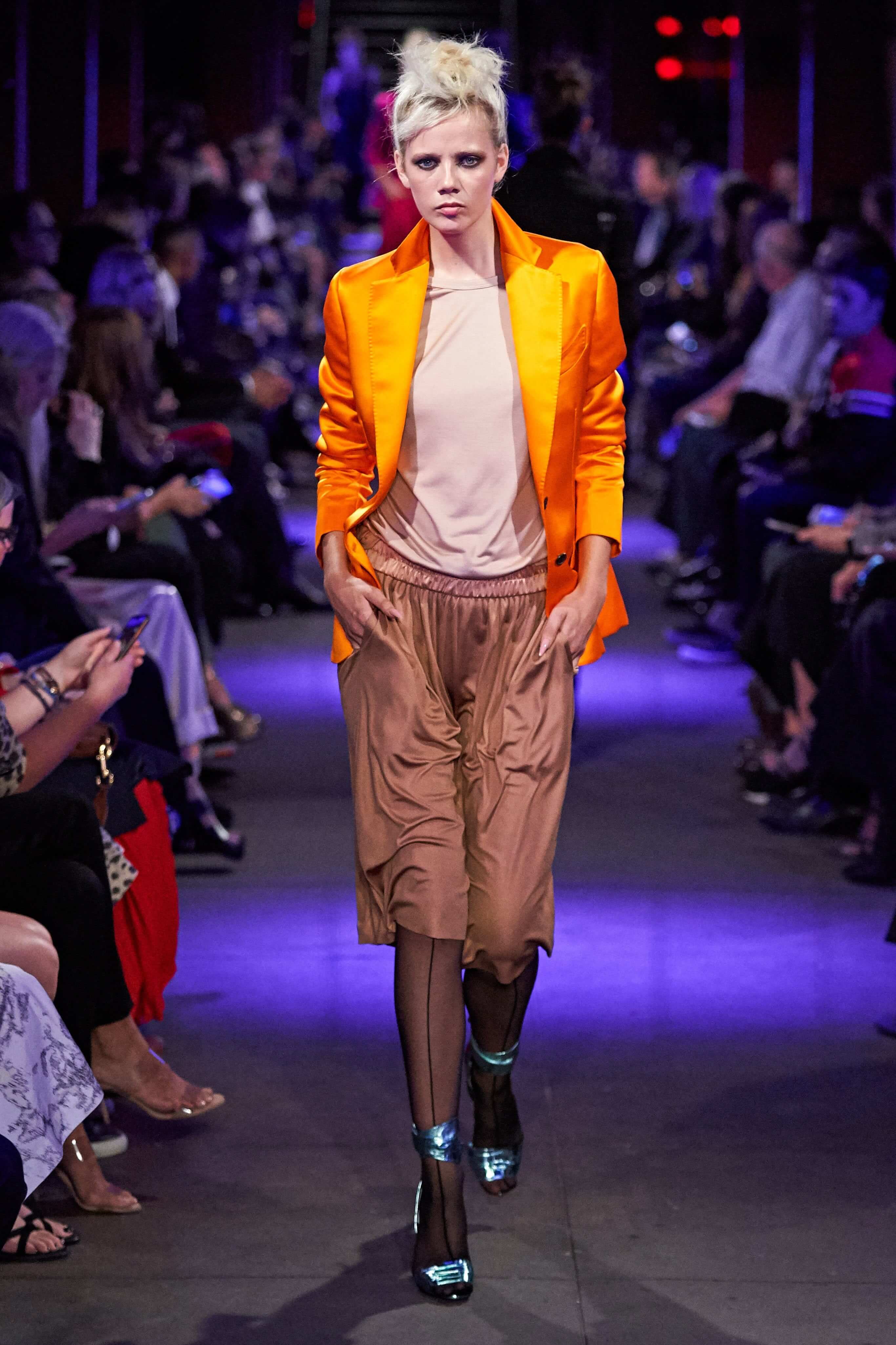 Том Форд продолжает вдохновляться творчеством Ива Сен-Лорана. На этот раз дизайнер представил оммаж коллаборации кутюрье со скульптором и художницей-сюрреалистом Клод Лаланн. В 70-х она сняла слепок с груди модели Верушки Фон Лендорф и сделала золотые накладки для одной из коллекций модельера. На показе Тома Форда модели носили цветные бюсты, повторяющие разные формы женской груди, их дополняли струящиеся брюки-шальвары.