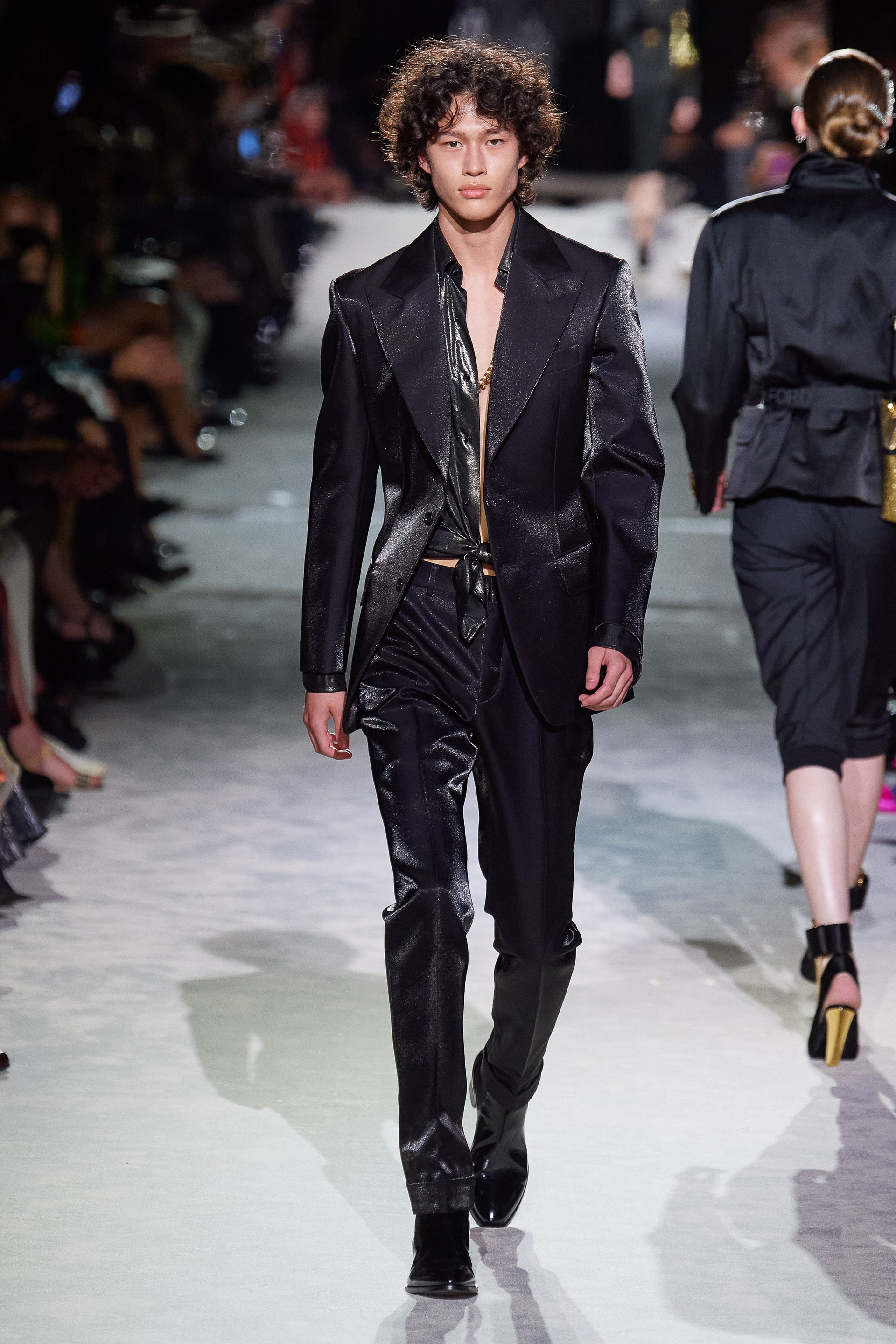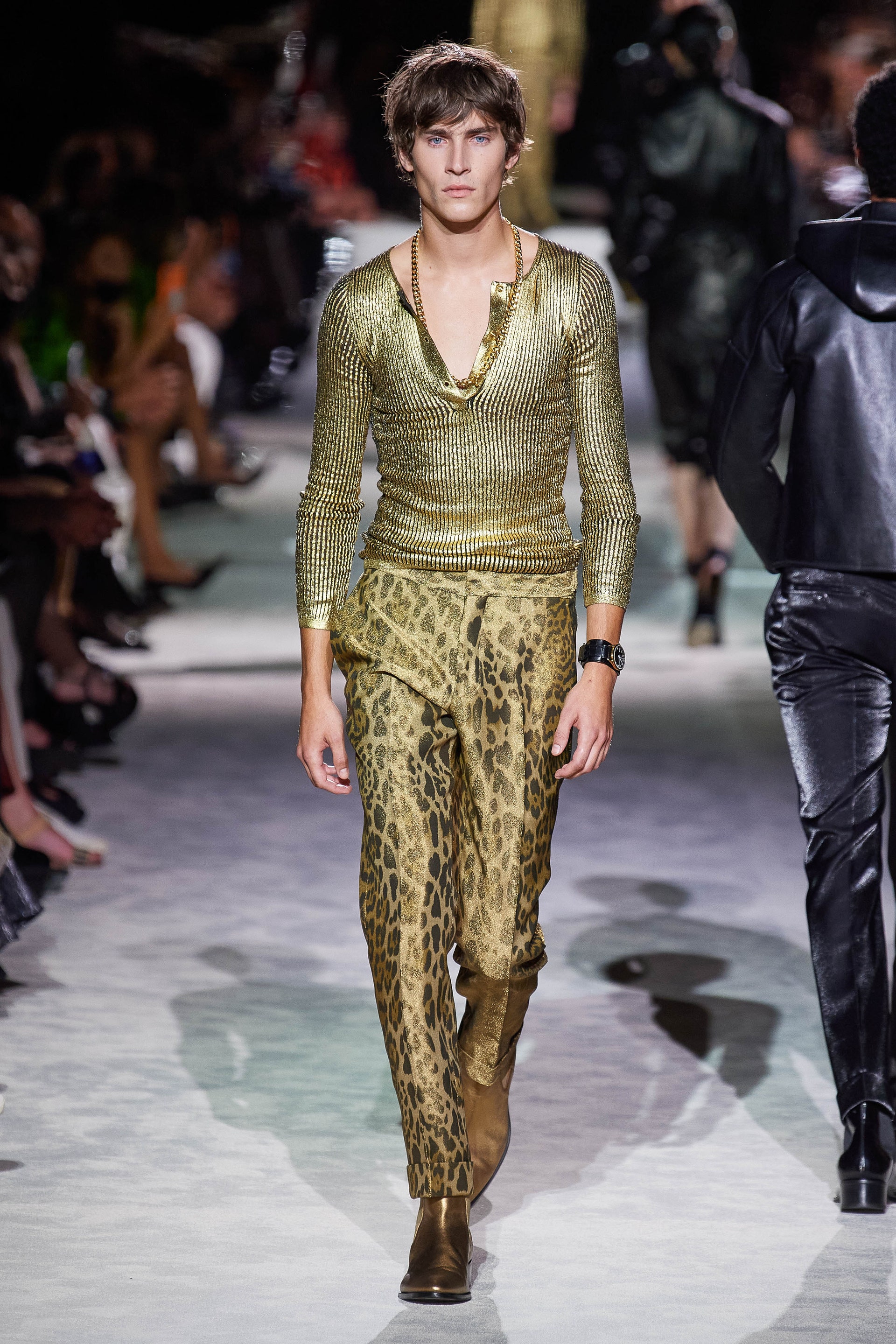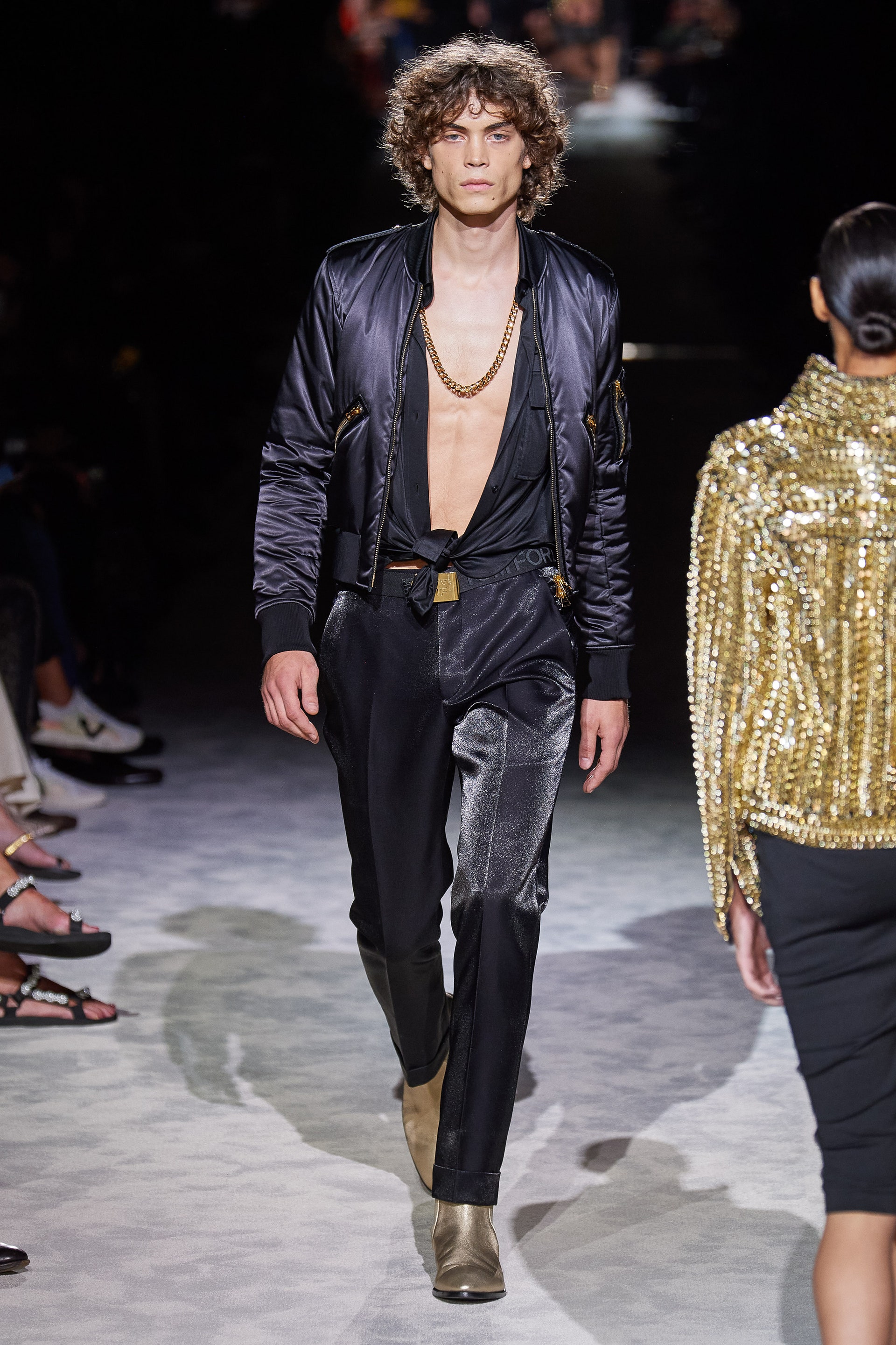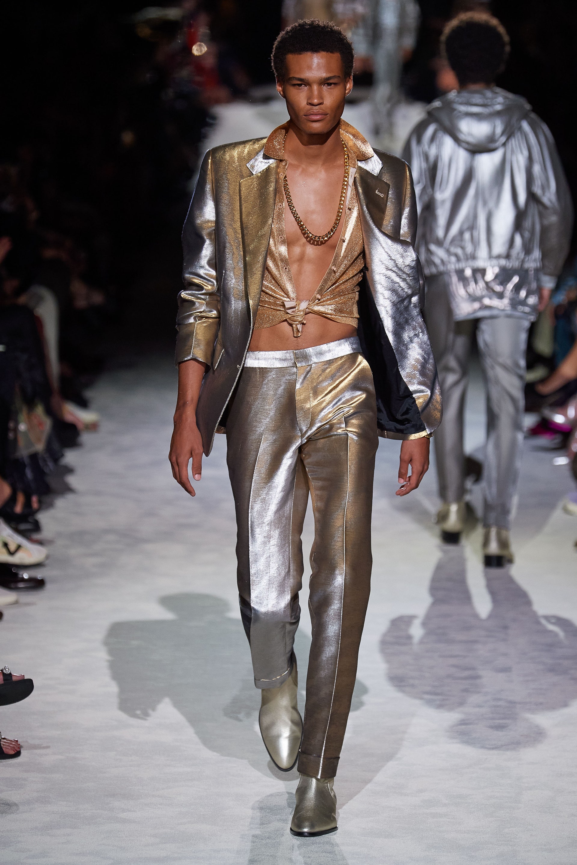 Джинсовые куртки классического кроя инкрустированы золотыми цепями и позументами, базовые трикотажные топы выполнены из металлизированных нитей, строгие рубашки из неонового атласа связаны узлами на талии, а мужские костюмы будто выкрашены из баллонов золотой и серебряной красками одновременно. Форд повторяет свой главный трюк из сезона в сезон: вещи базового кроя превращает в самую эффектную одежду в мире, благодаря исключительно гламурным фактурам и тонкой пропорции свободы и соблазна. Во многом коллекция становится манифестом о надежде, ослепительном гламуре, празднике и обновлении.