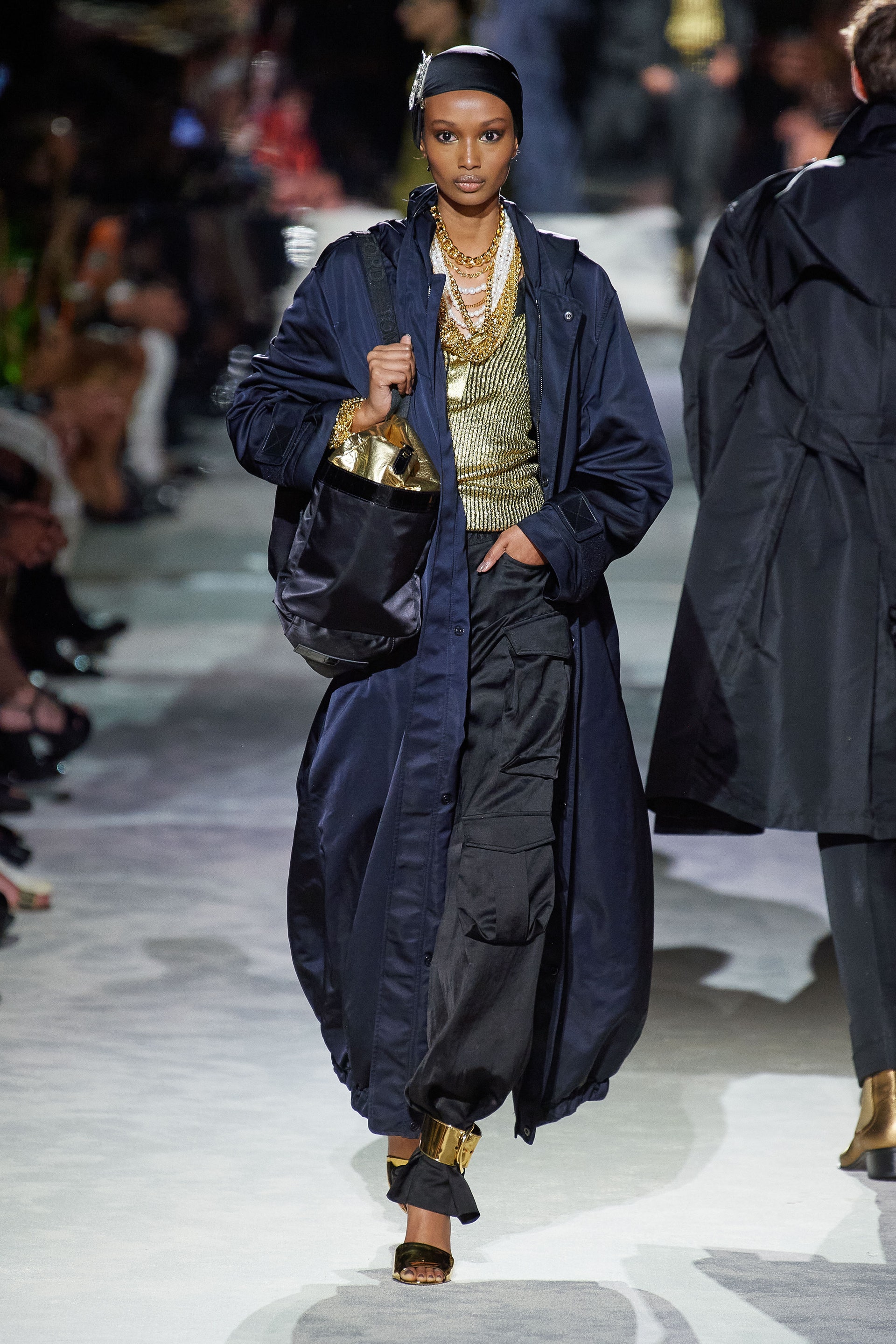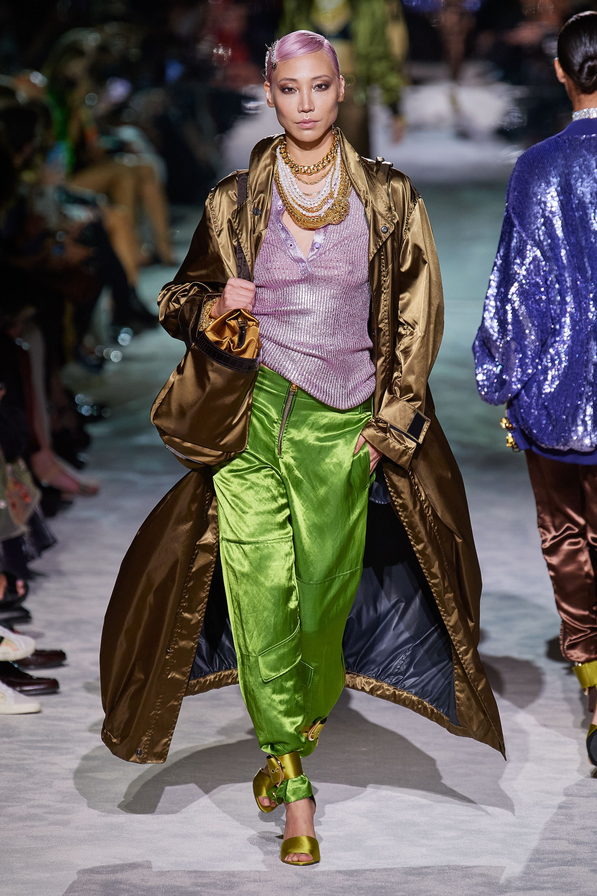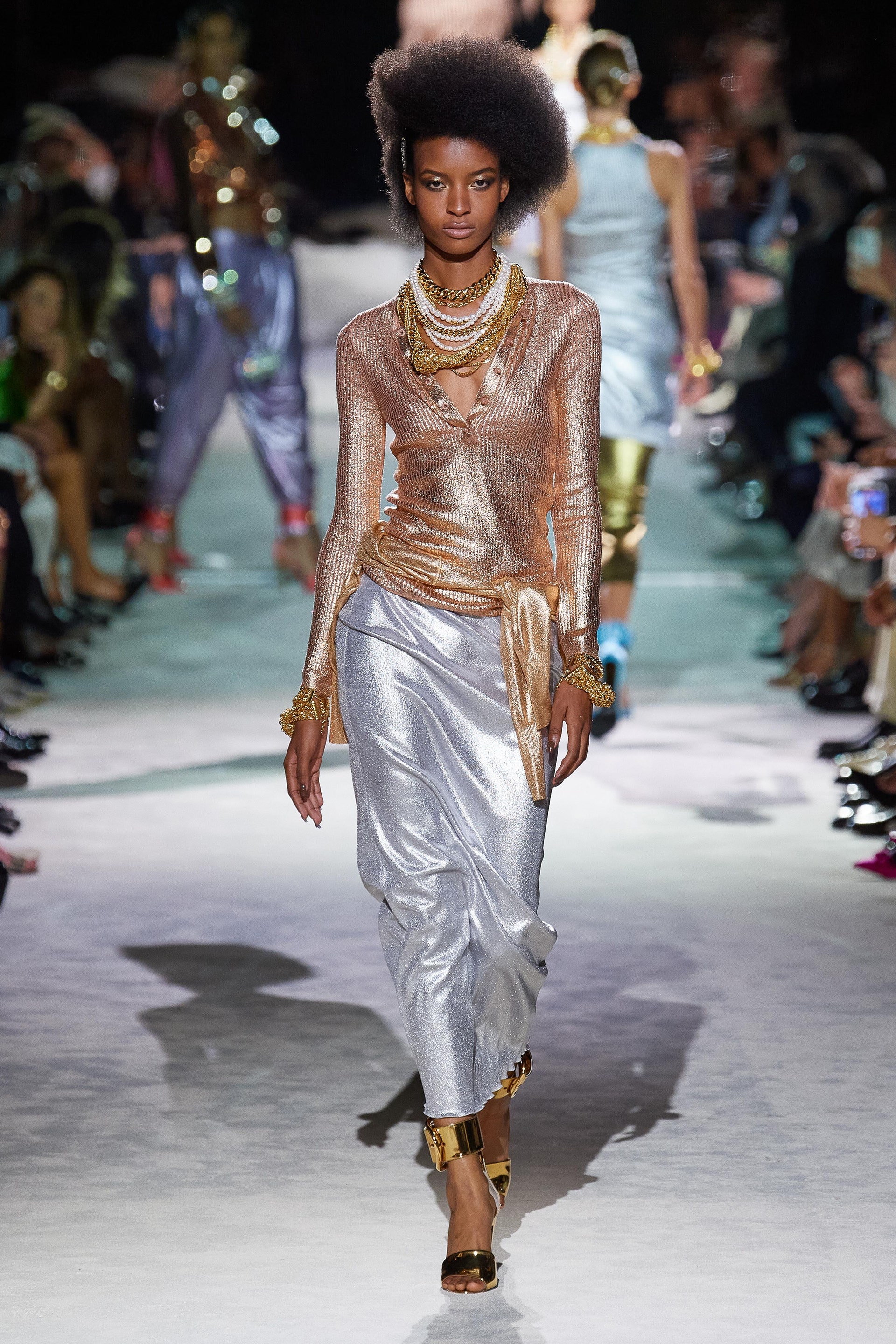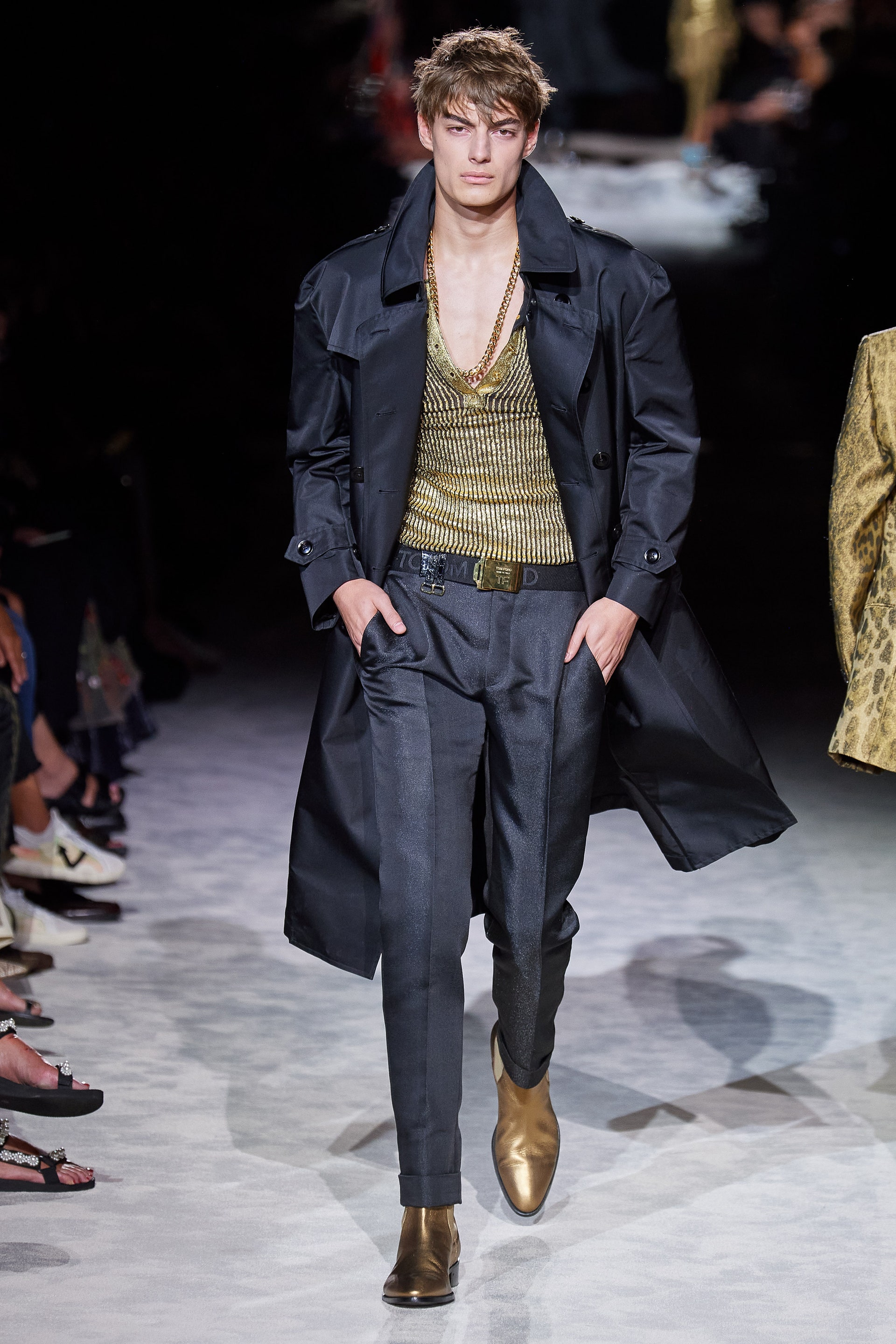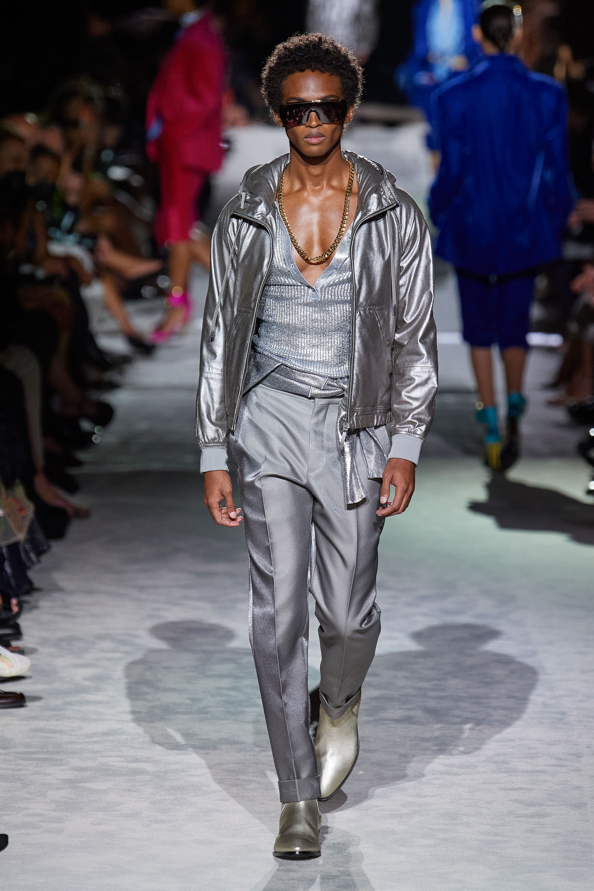 Джинсовые куртки классического кроя инкрустированы золотыми цепями и позументами, базовые трикотажные топы выполнены из металлизированных нитей, строгие рубашки из неонового атласа связаны узлами на талии, а мужские костюмы будто выкрашены из баллонов золотой и серебряной красками одновременно. Форд повторяет свой главный трюк из сезона в сезон: вещи базового кроя превращает в самую эффектную одежду в мире, благодаря исключительно гламурным фактурам и тонкой пропорции свободы и соблазна. Во многом коллекция становится манифестом о надежде, ослепительном гламуре, празднике и обновлении.