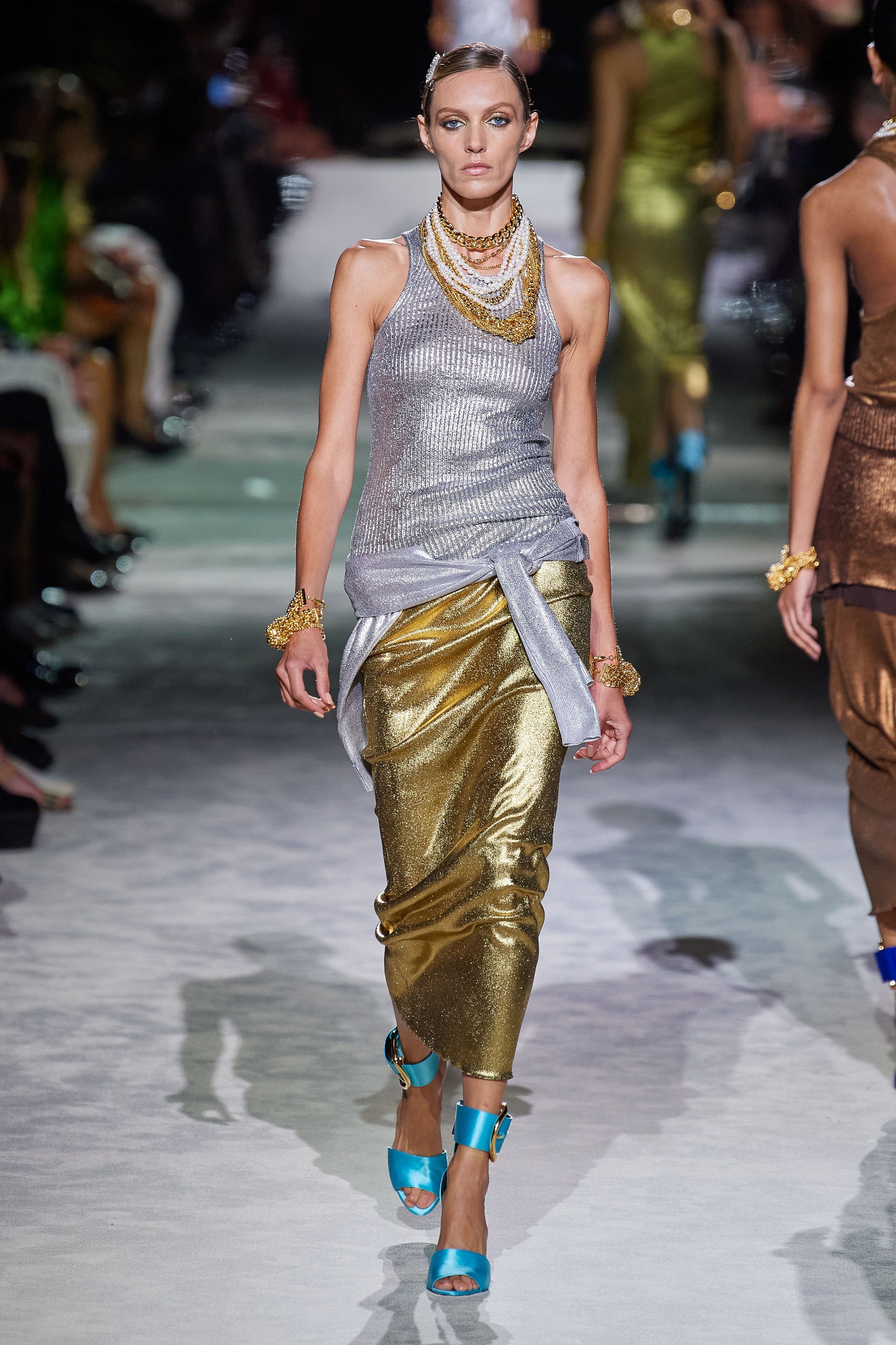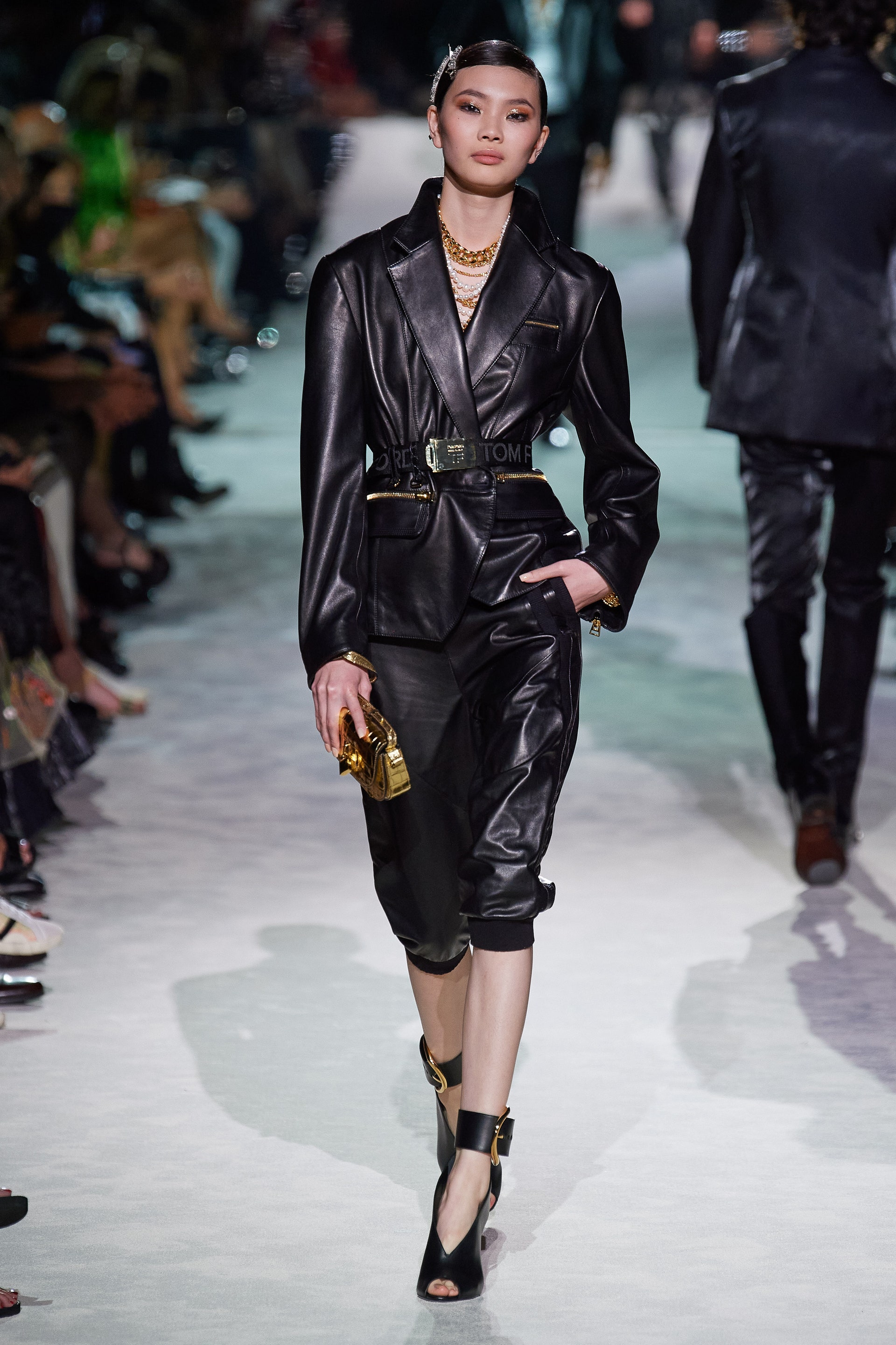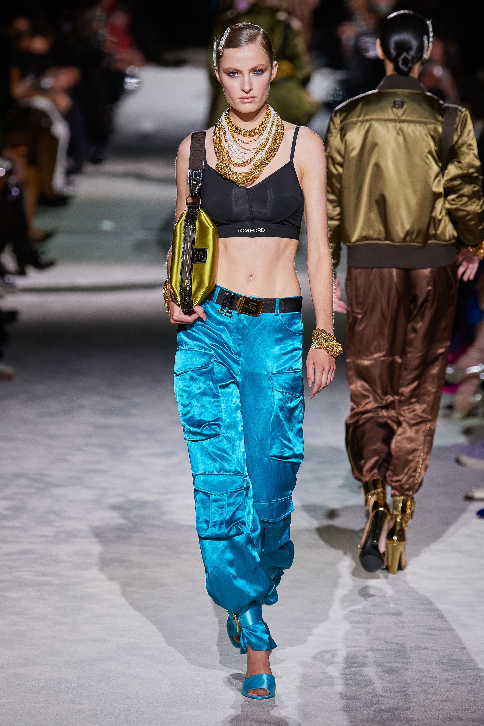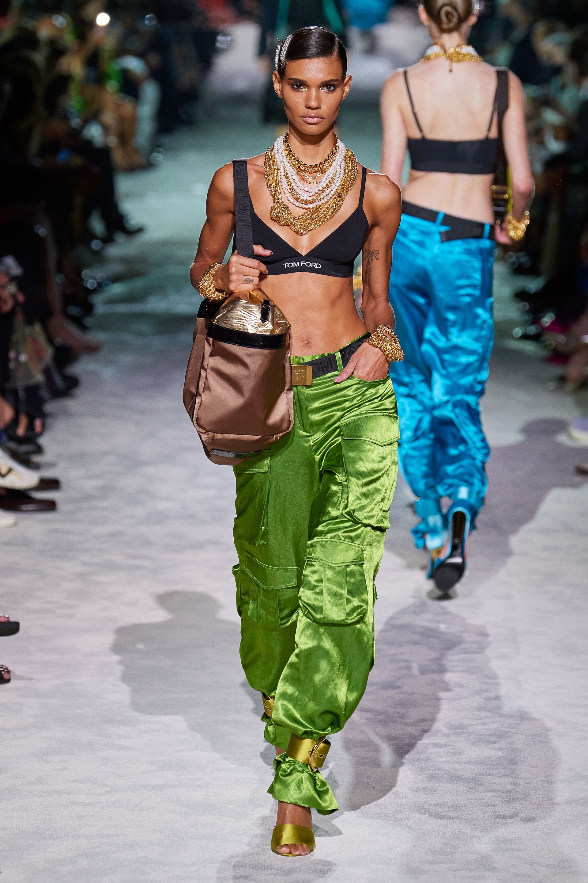 Новая коллекция Тома Форда выглядит так, будто всю предстоящую весну он предлагает провести как одну грандиозную вечеринку. Дресс-код по версии Тома — спорт и излишества: баскетбольные майки и шорты, расшитые неоновыми пайетками, атласные брюки карго с сексуальной низкой посадкой, топы-бикини и сияющие костюмы с золотым леопардовым принтом. Всё это дополняют чокеры и заколки с кристаллами, атласные туфли с блестящими каблуками и многослойные колье из цепей.