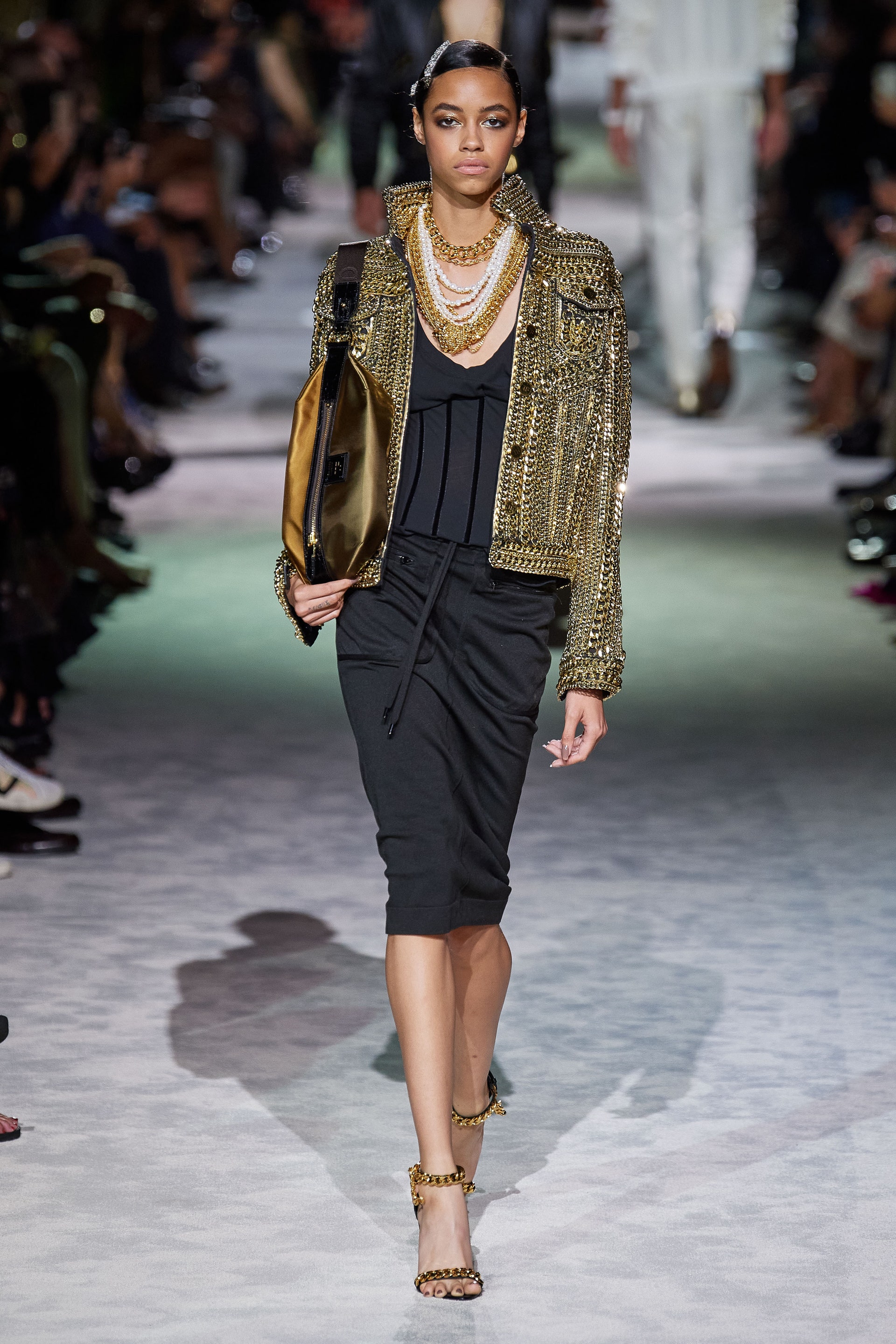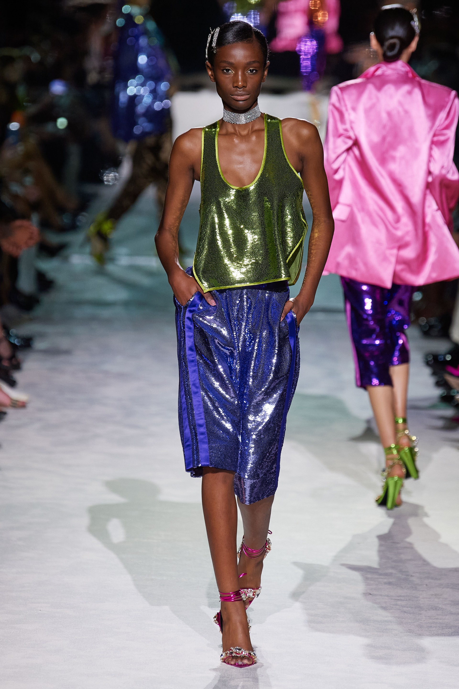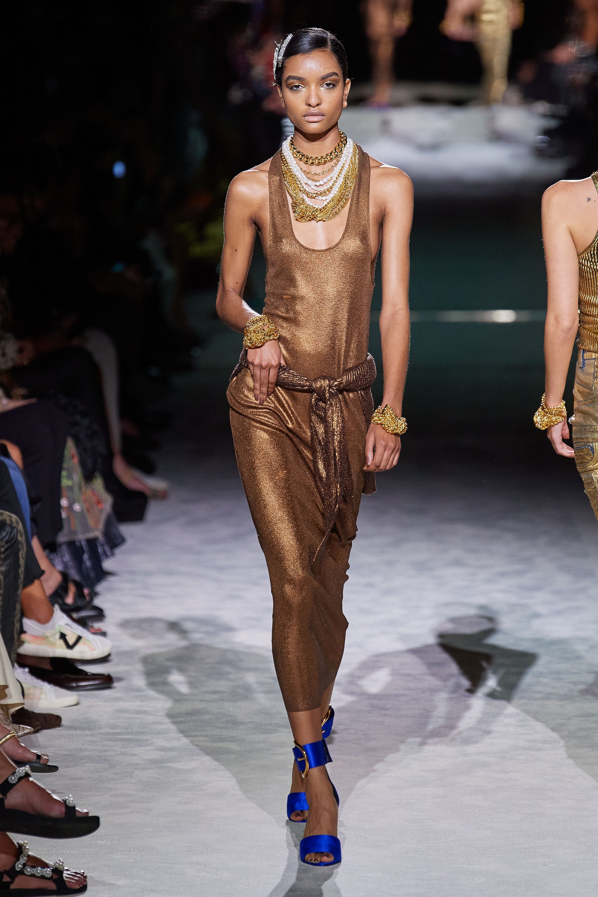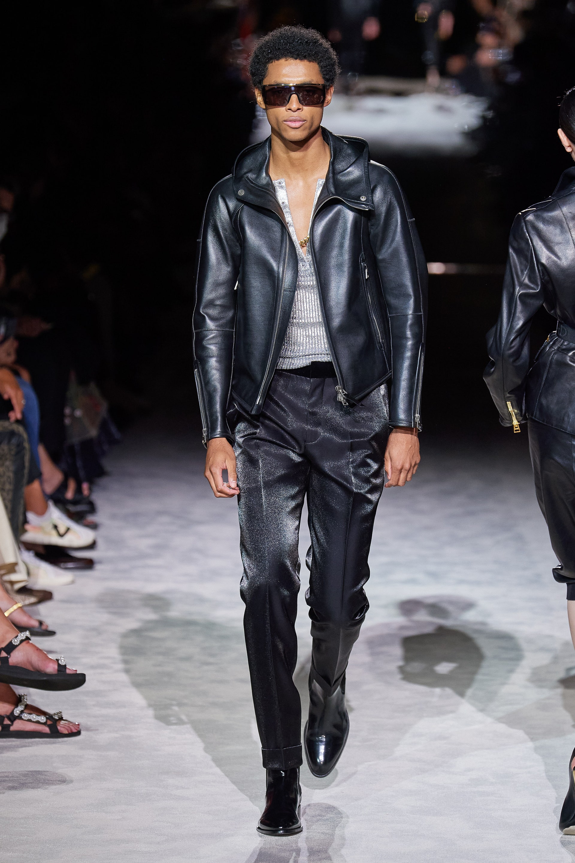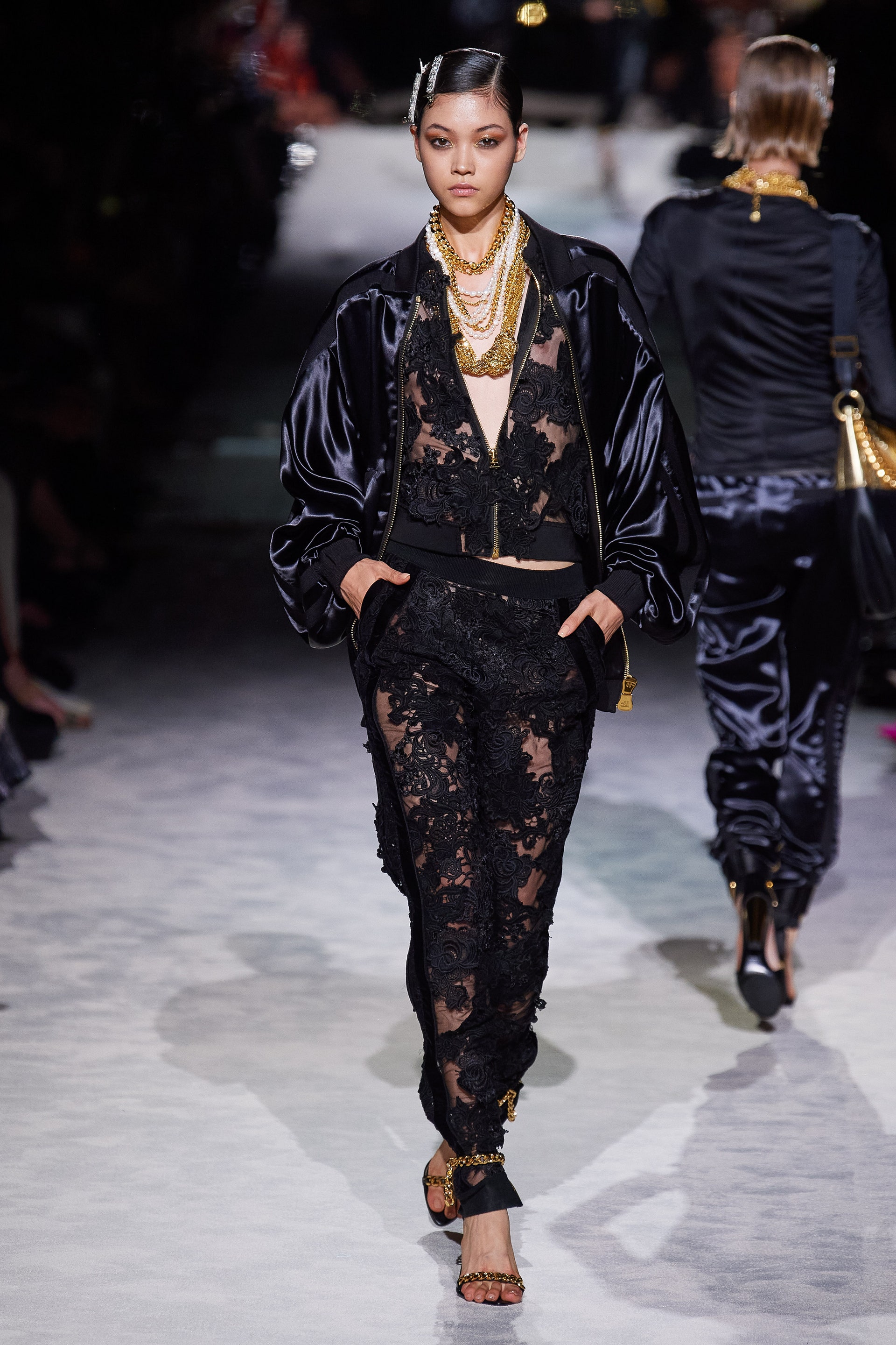 Новая коллекция Тома Форда выглядит так, будто всю предстоящую весну он предлагает провести как одну грандиозную вечеринку. Дресс-код по версии Тома — спорт и излишества: баскетбольные майки и шорты, расшитые неоновыми пайетками, атласные брюки карго с сексуальной низкой посадкой, топы-бикини и сияющие костюмы с золотым леопардовым принтом. Всё это дополняют чокеры и заколки с кристаллами, атласные туфли с блестящими каблуками и многослойные колье из цепей.