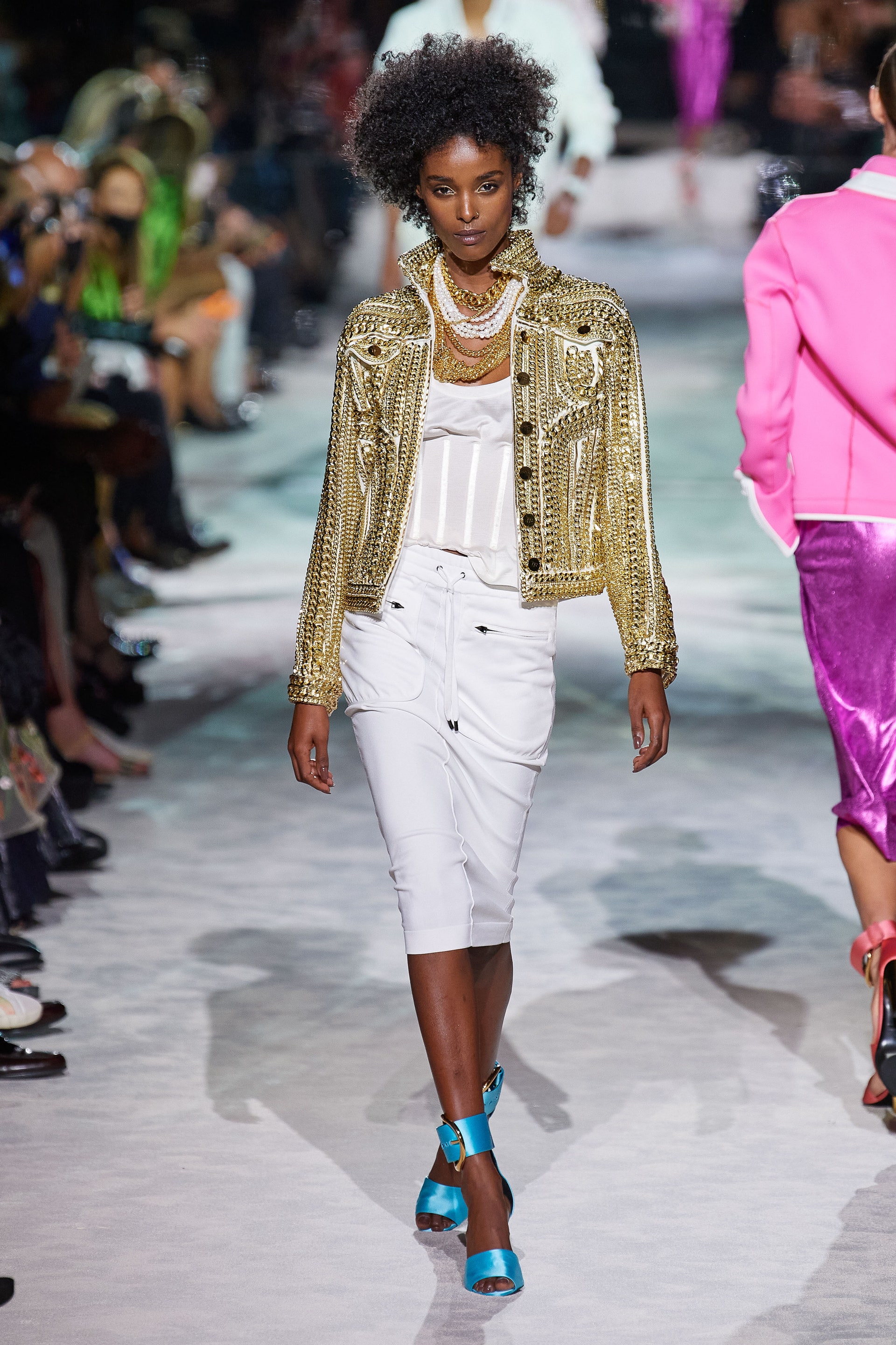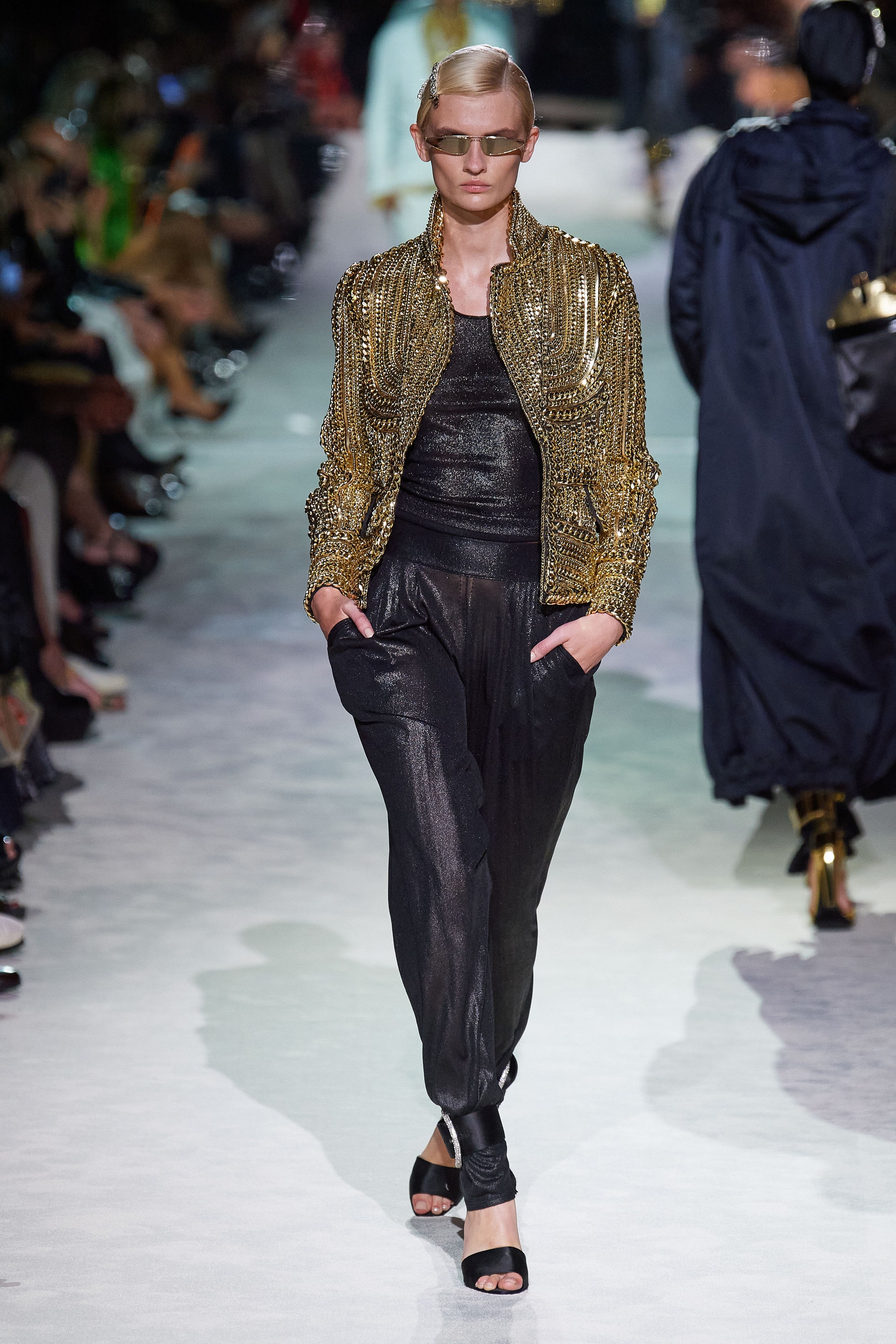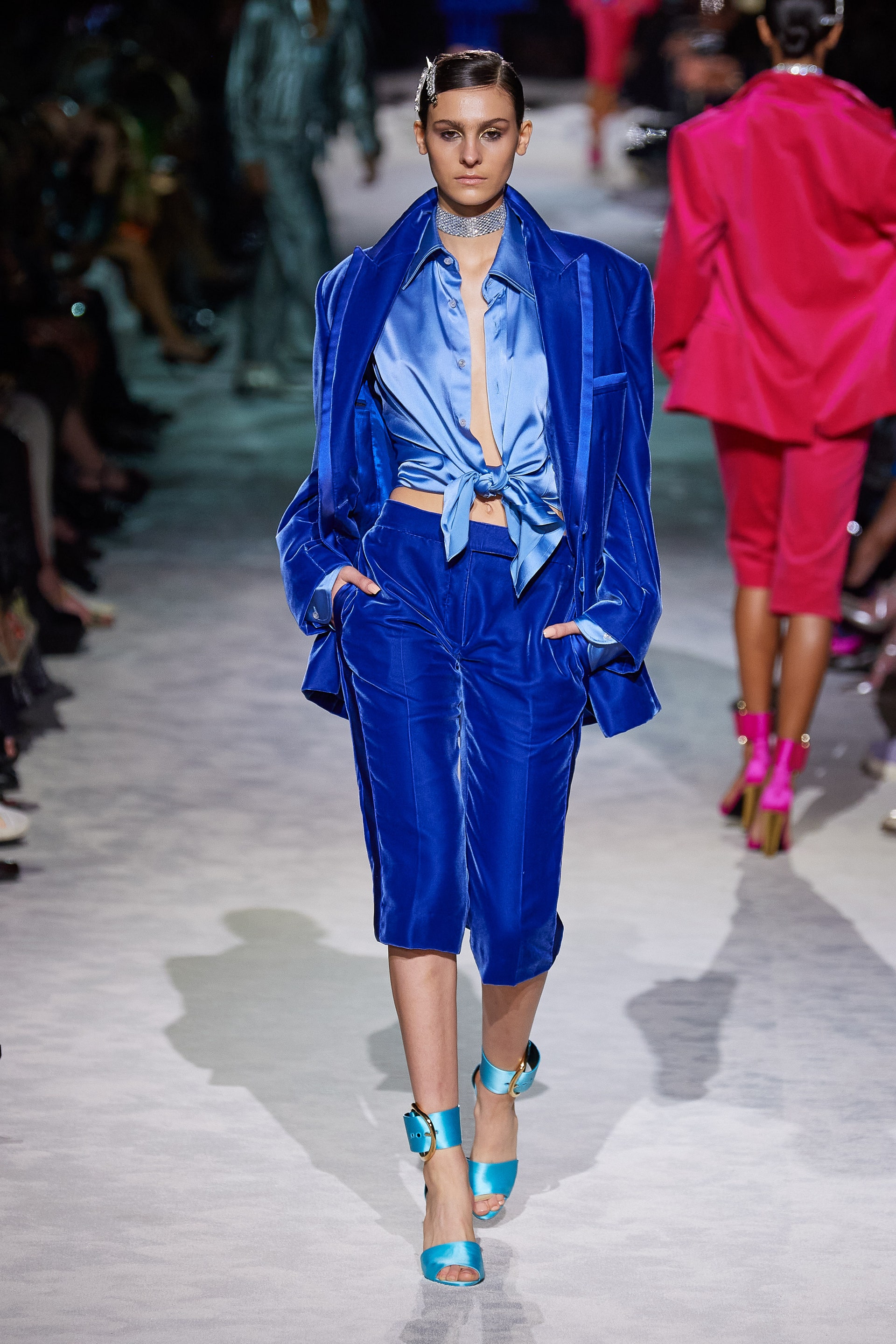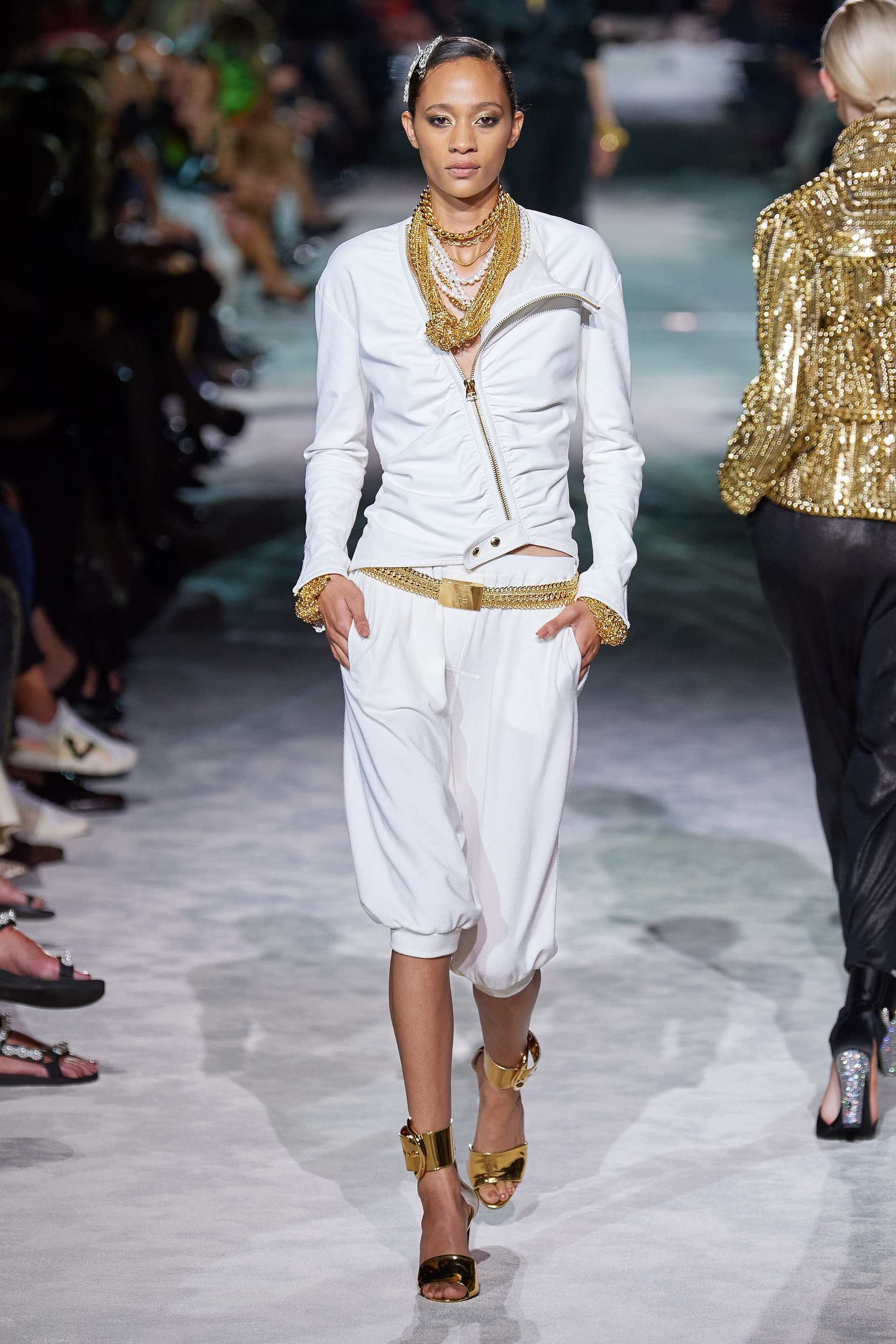 Новая коллекция Тома Форда выглядит так, будто всю предстоящую весну он предлагает провести как одну грандиозную вечеринку. Дресс-код по версии Тома — спорт и излишества: баскетбольные майки и шорты, расшитые неоновыми пайетками, атласные брюки карго с сексуальной низкой посадкой, топы-бикини и сияющие костюмы с золотым леопардовым принтом. Всё это дополняют чокеры и заколки с кристаллами, атласные туфли с блестящими каблуками и многослойные колье из цепей.