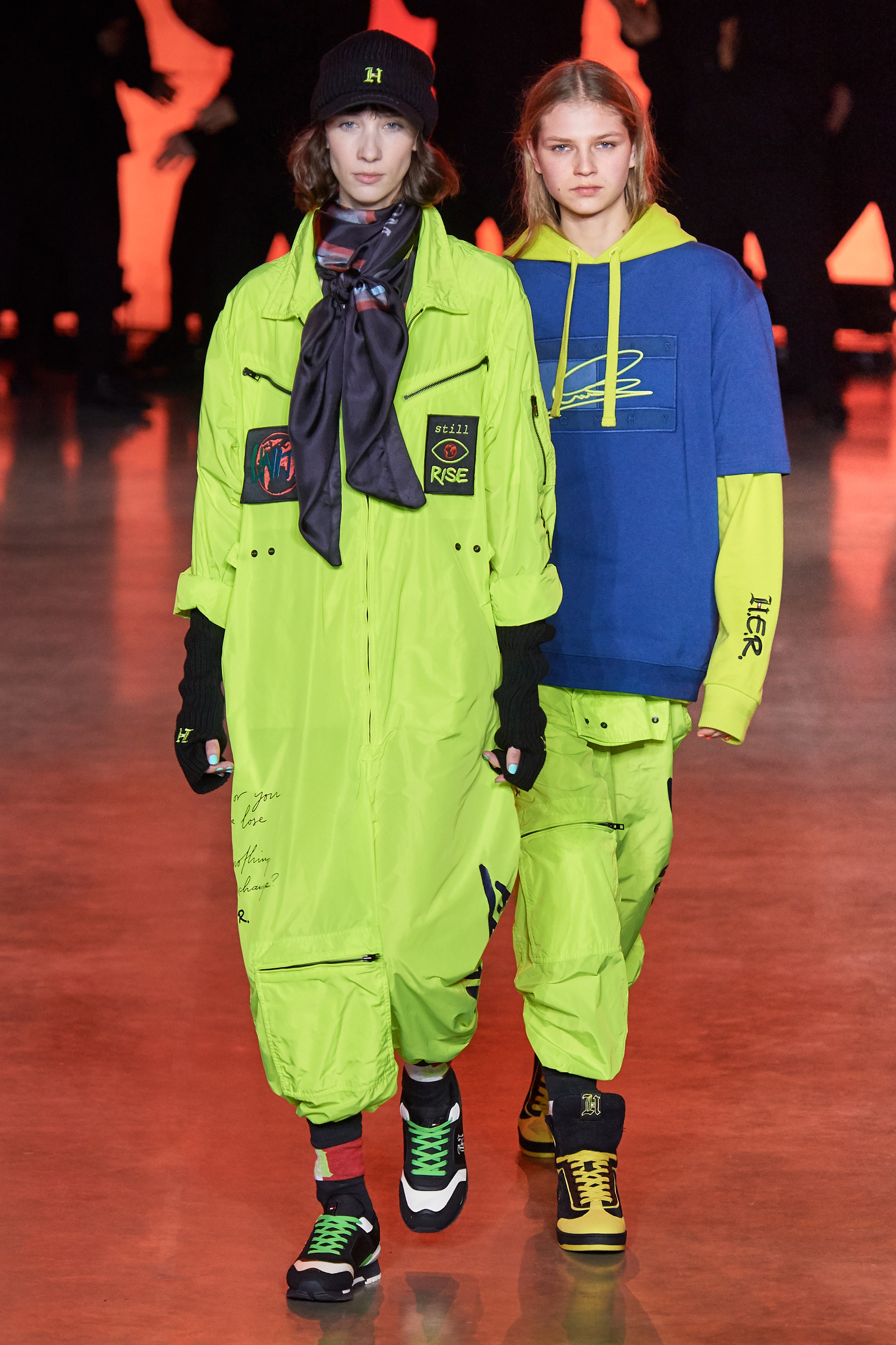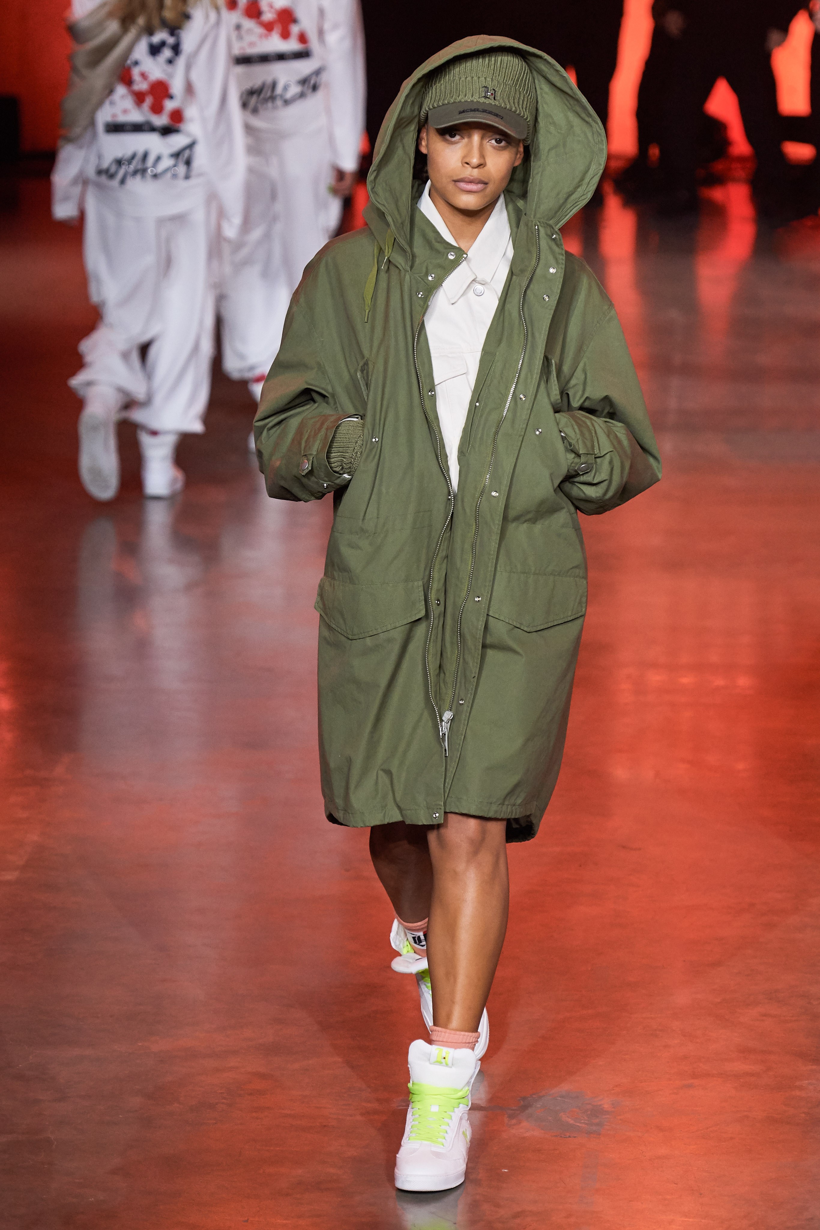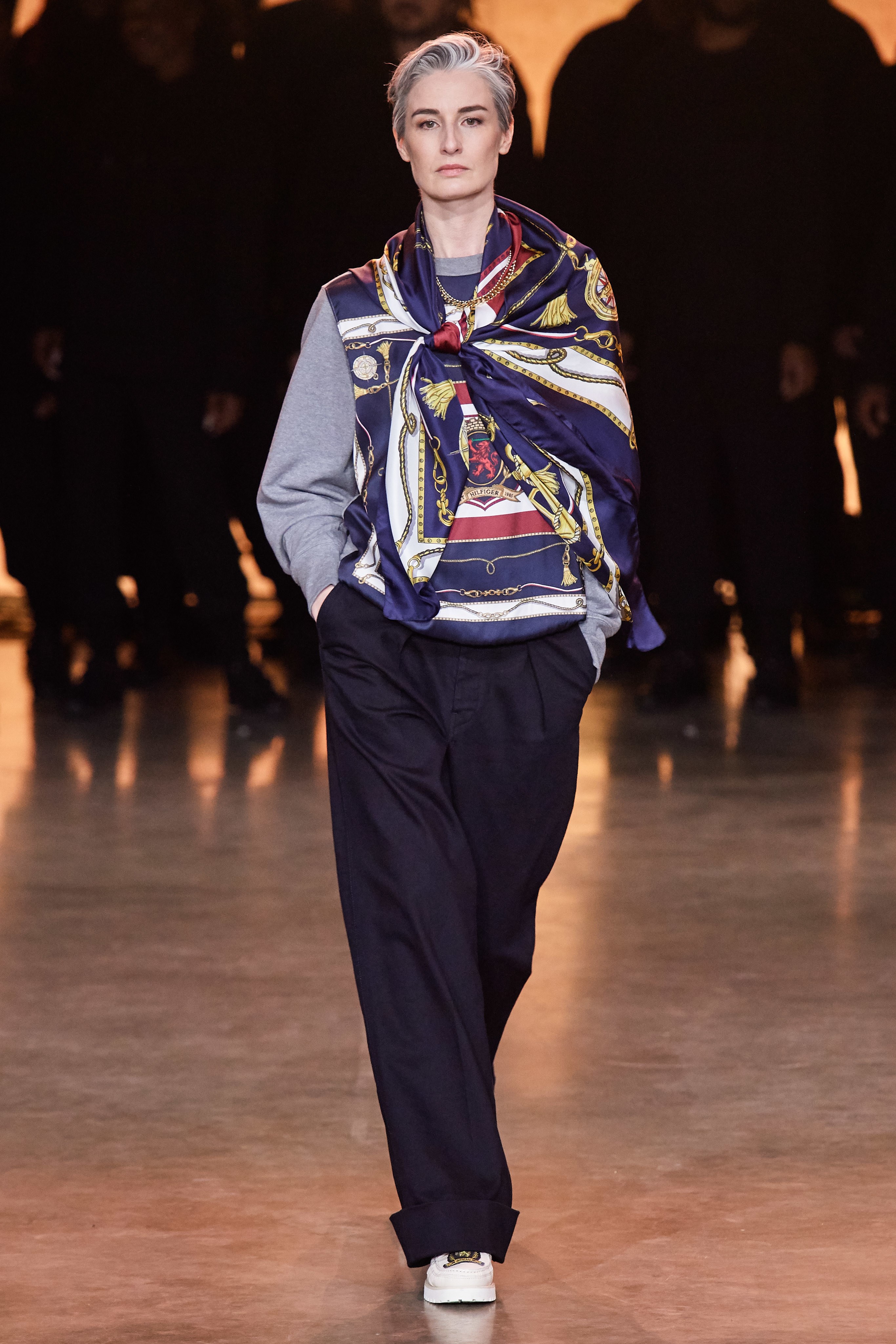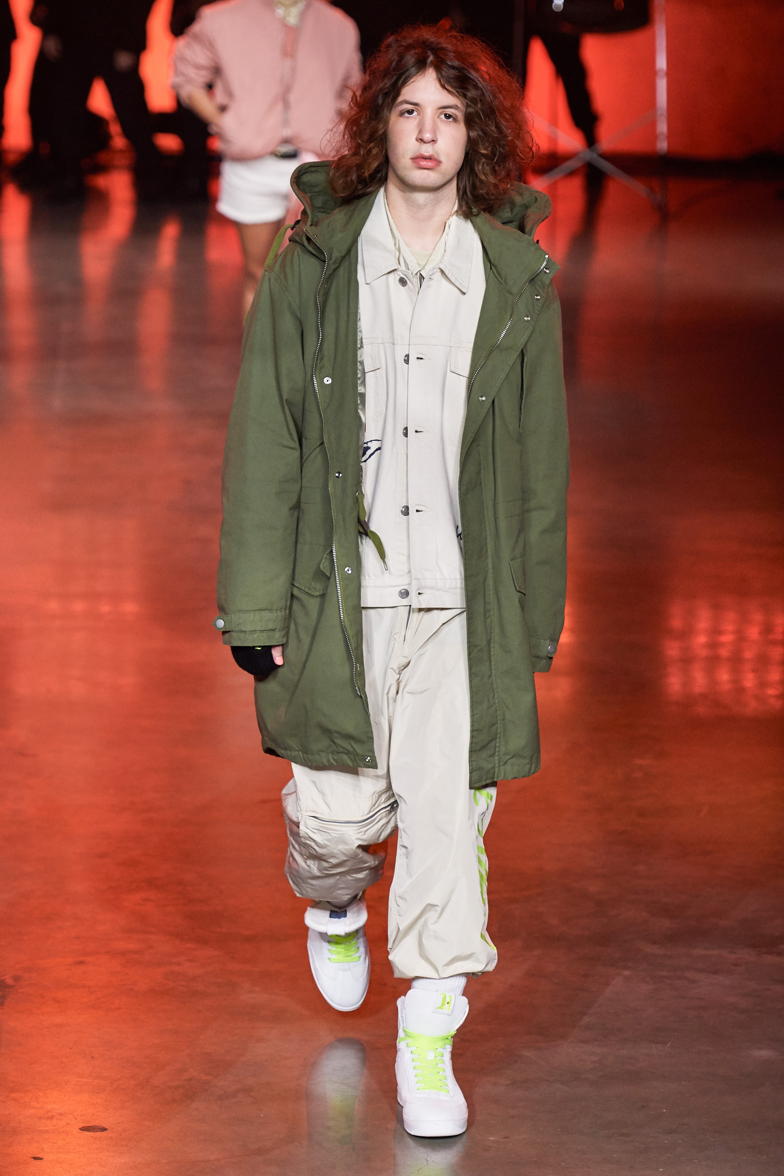 Ключевые элементы: оверсайз-парки и худи с вместительными карманами, светоотражающие ленты на сумках и вещах, светлые костюмы, бомберы, прямые пальто и большие шарфы, "наивные" принты на женственных костюмах.
