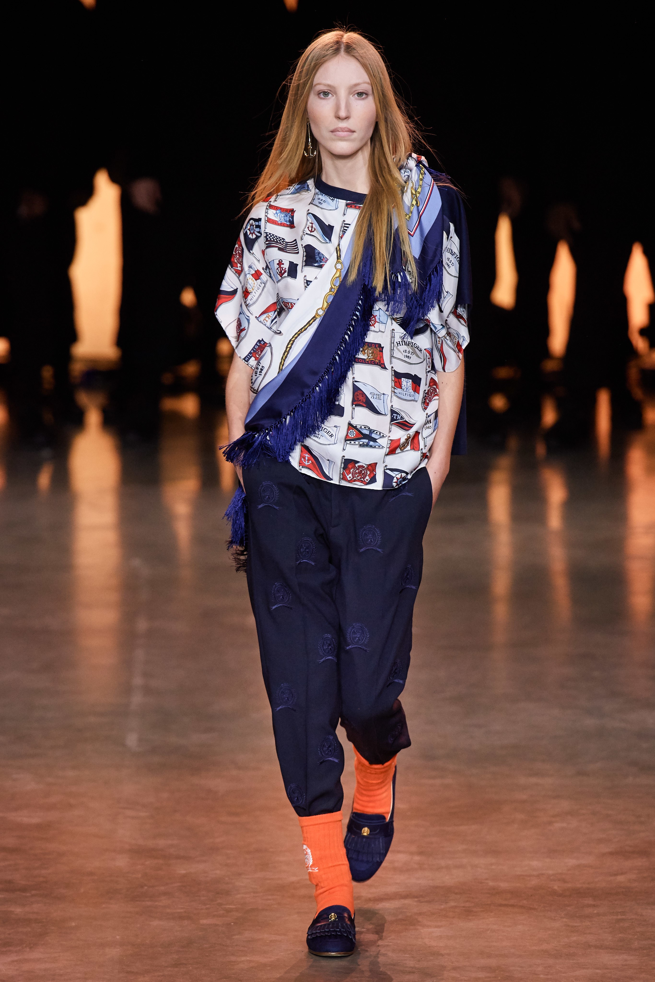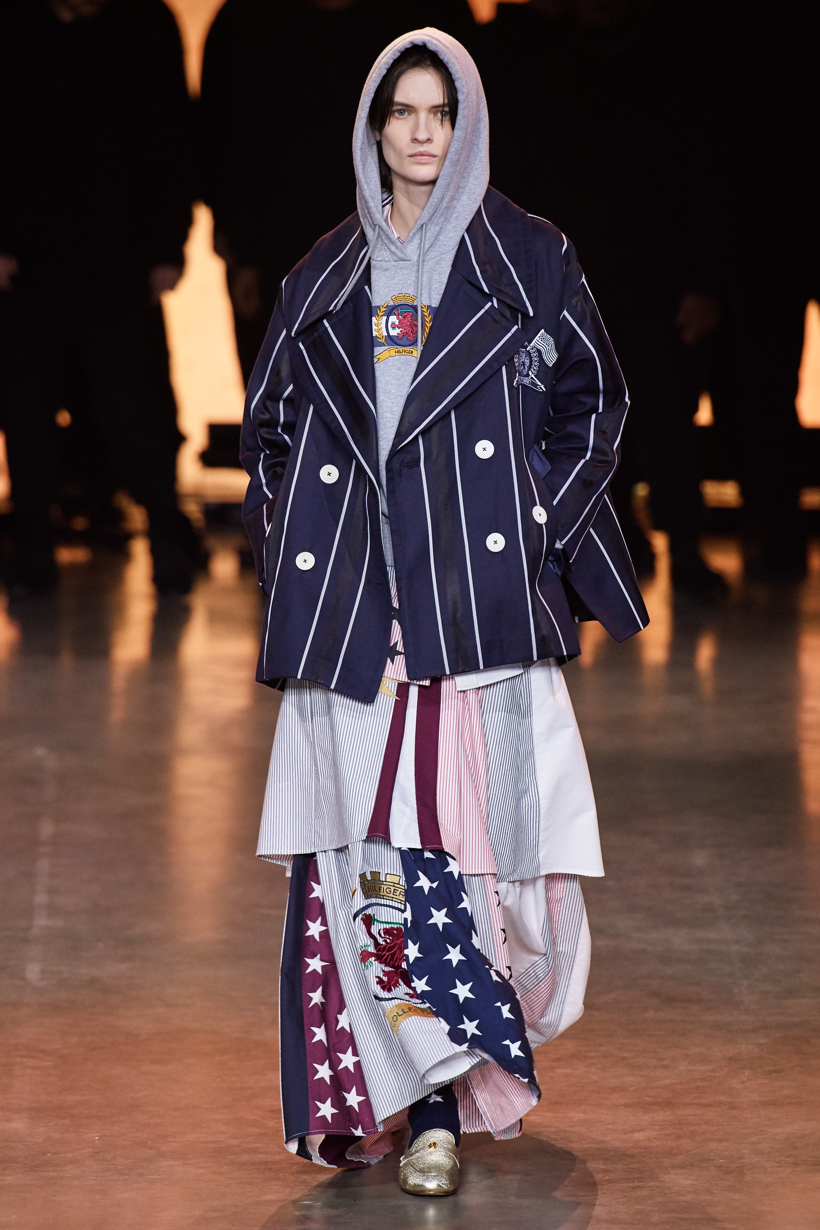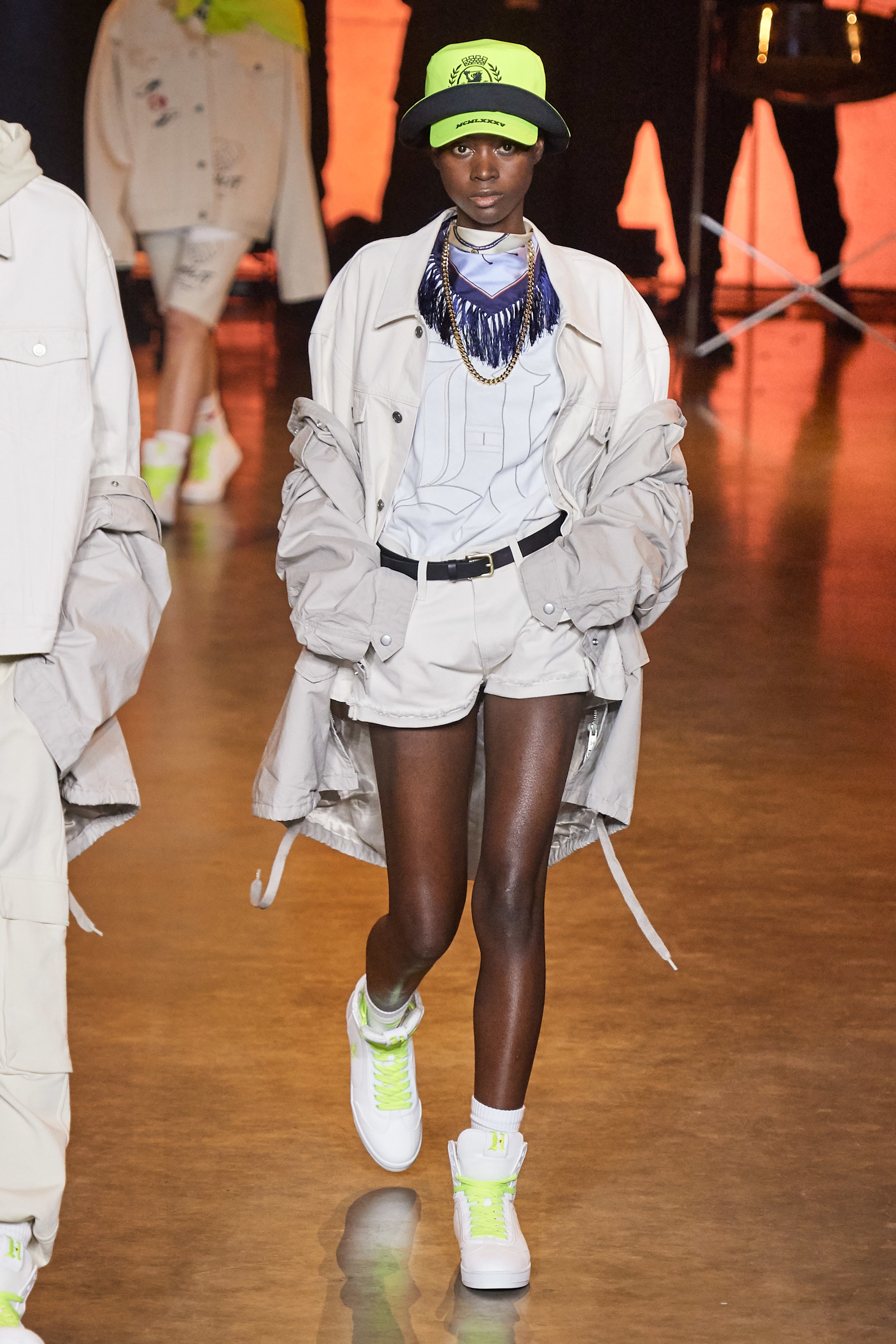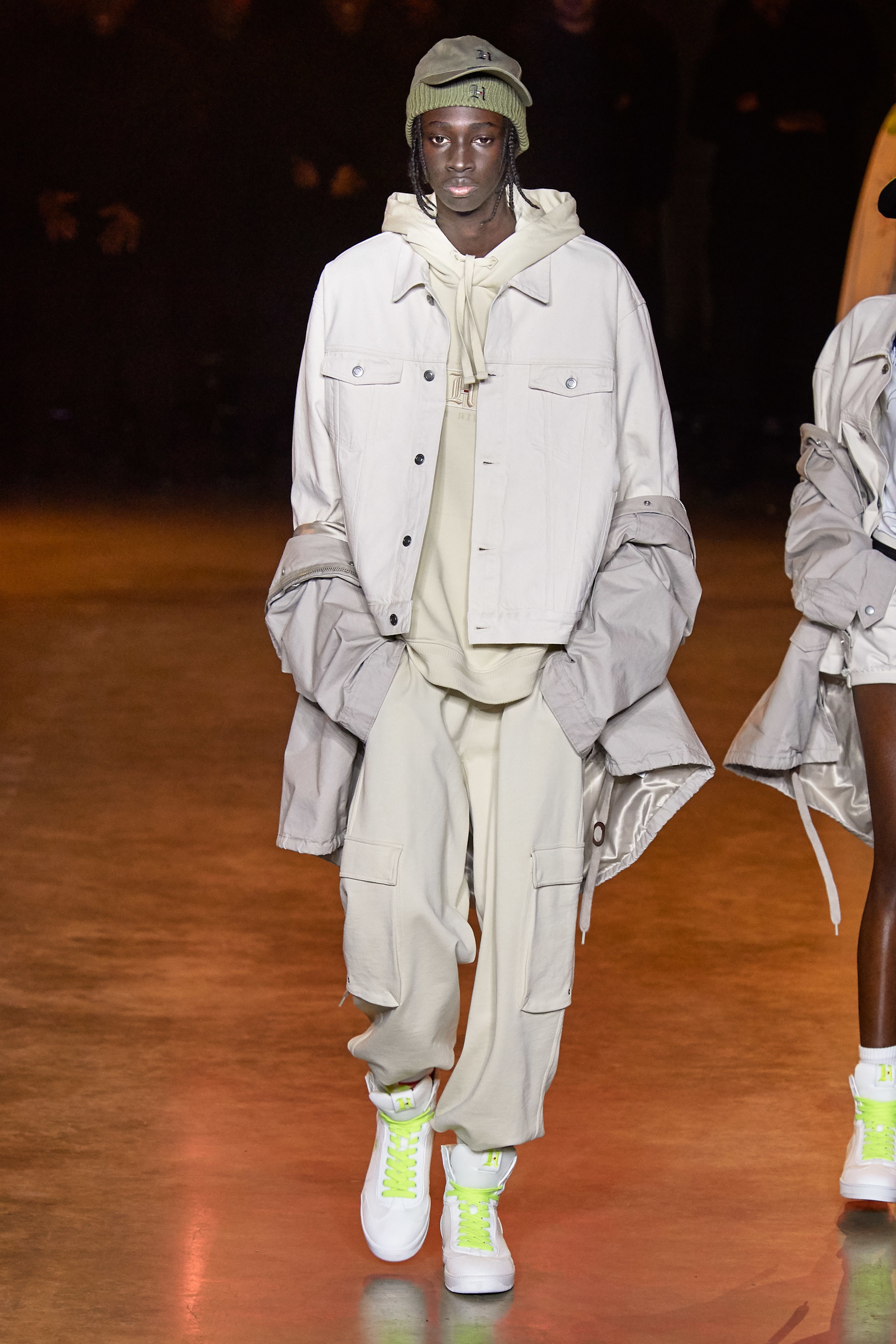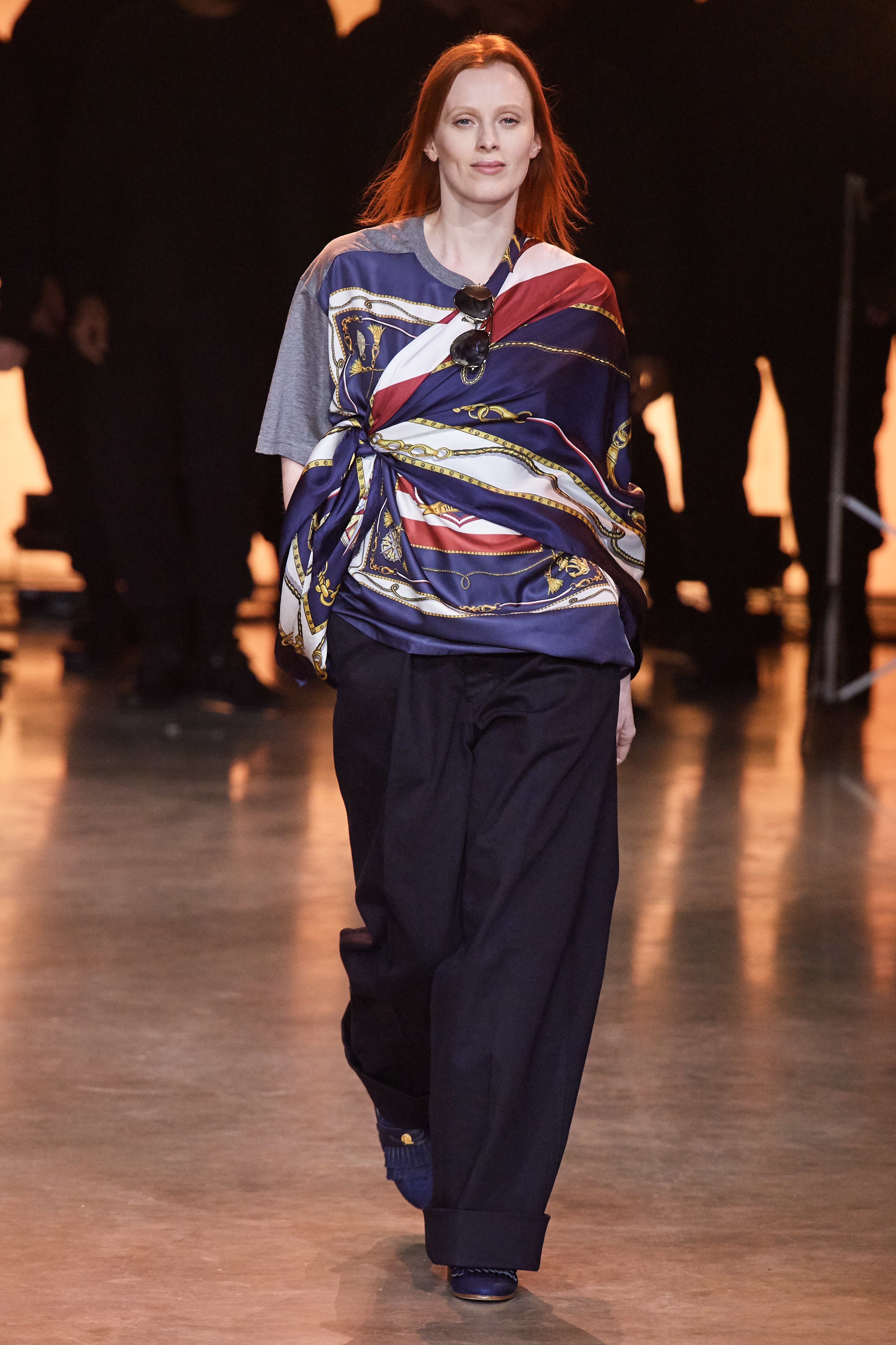 Ключевые элементы: оверсайз-парки и худи с вместительными карманами, светоотражающие ленты на сумках и вещах, светлые костюмы, бомберы, прямые пальто и большие шарфы, "наивные" принты на женственных костюмах.