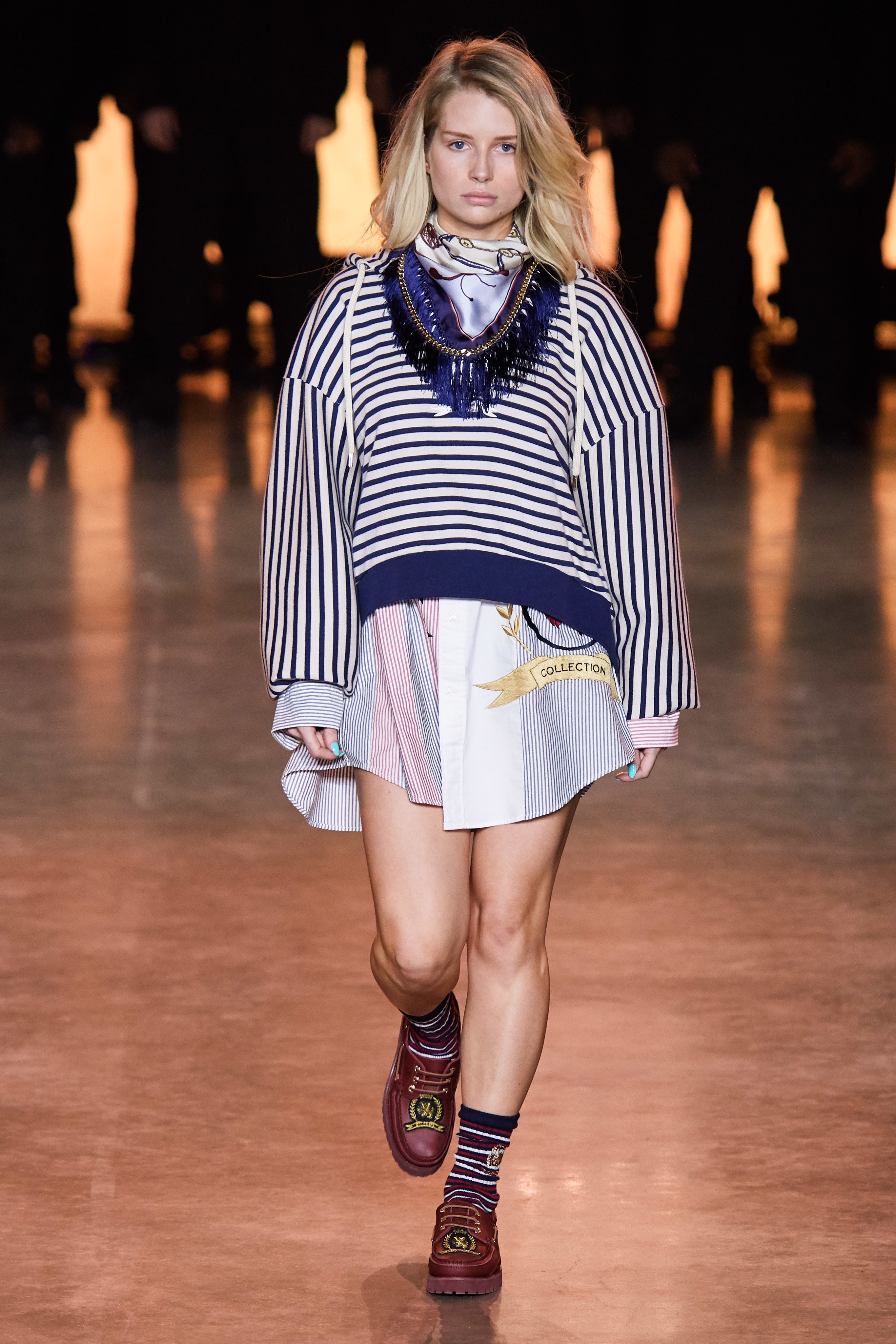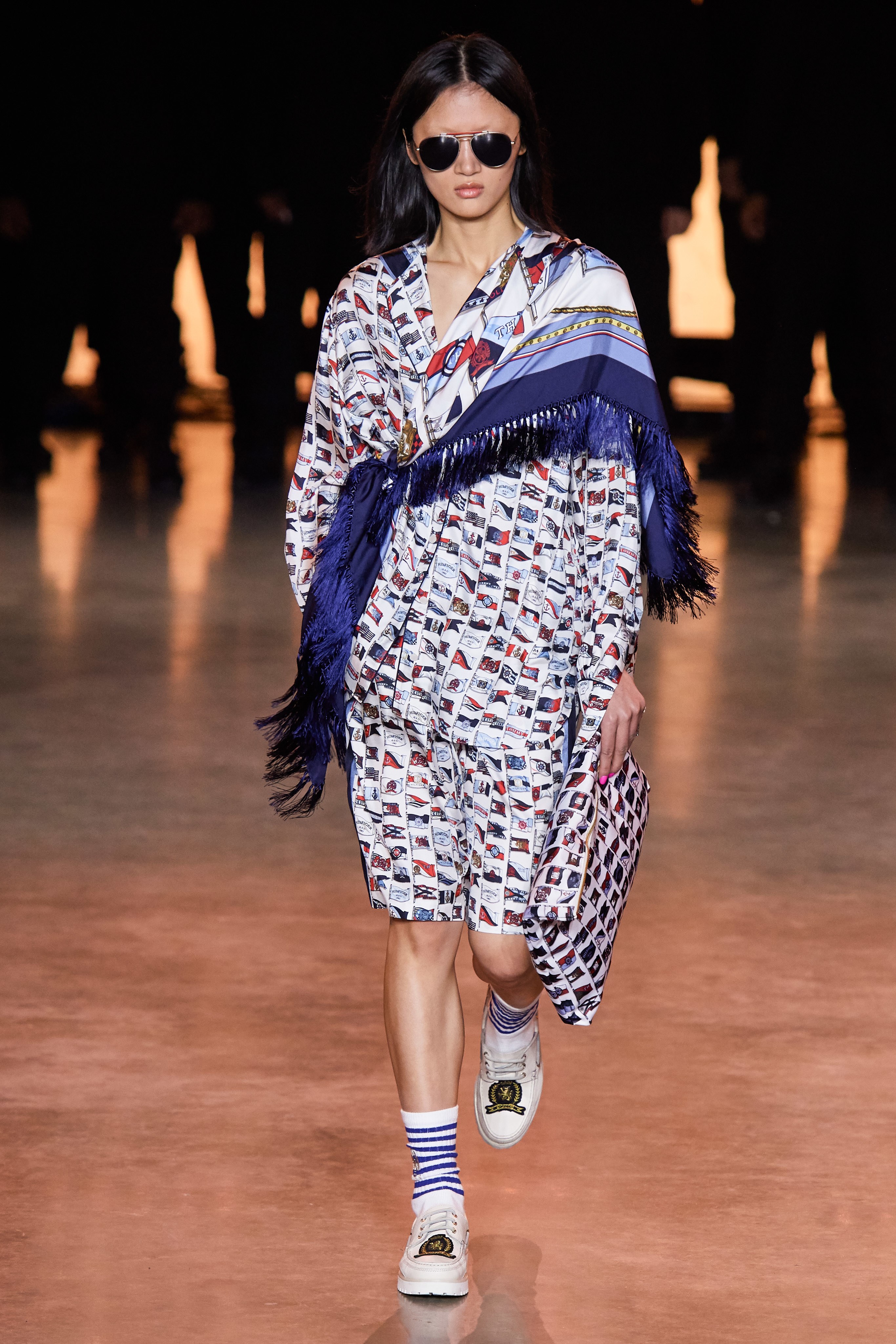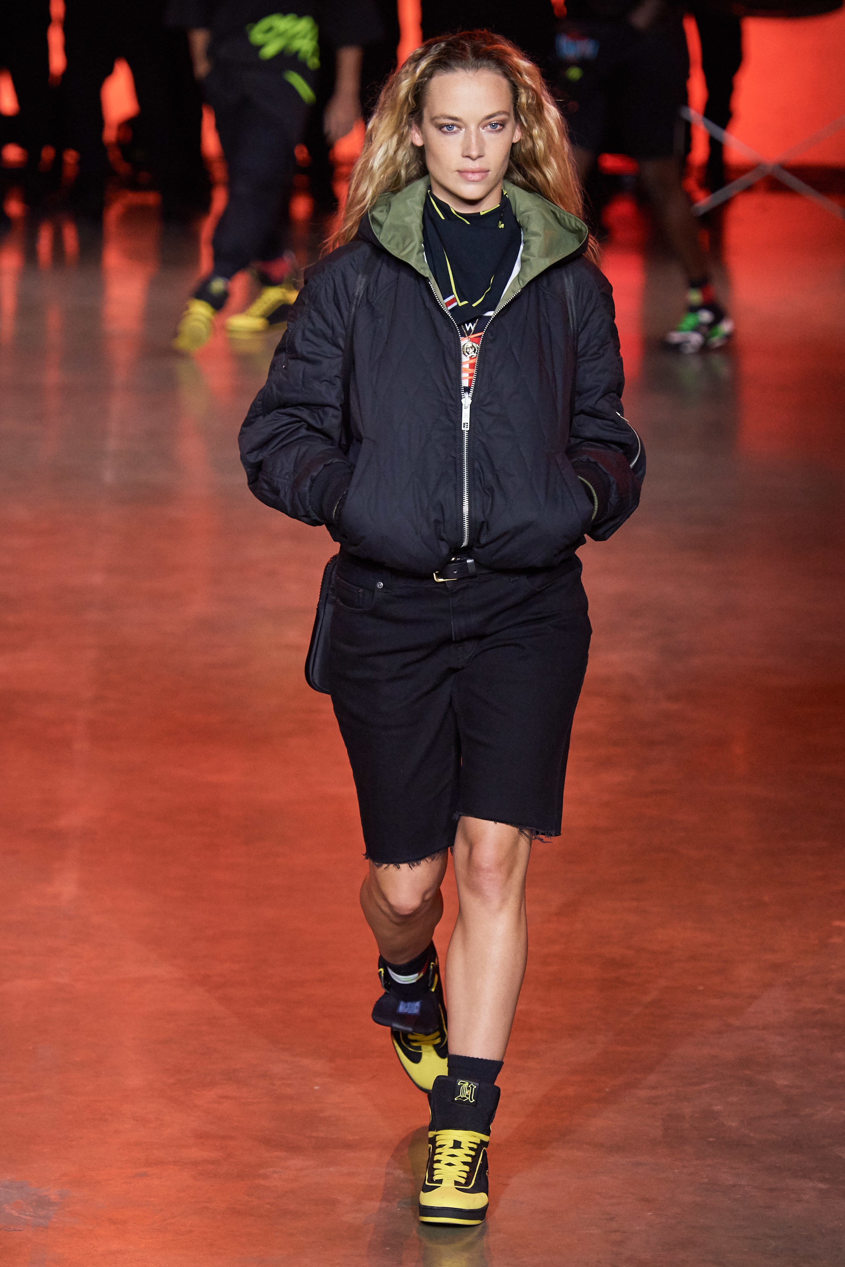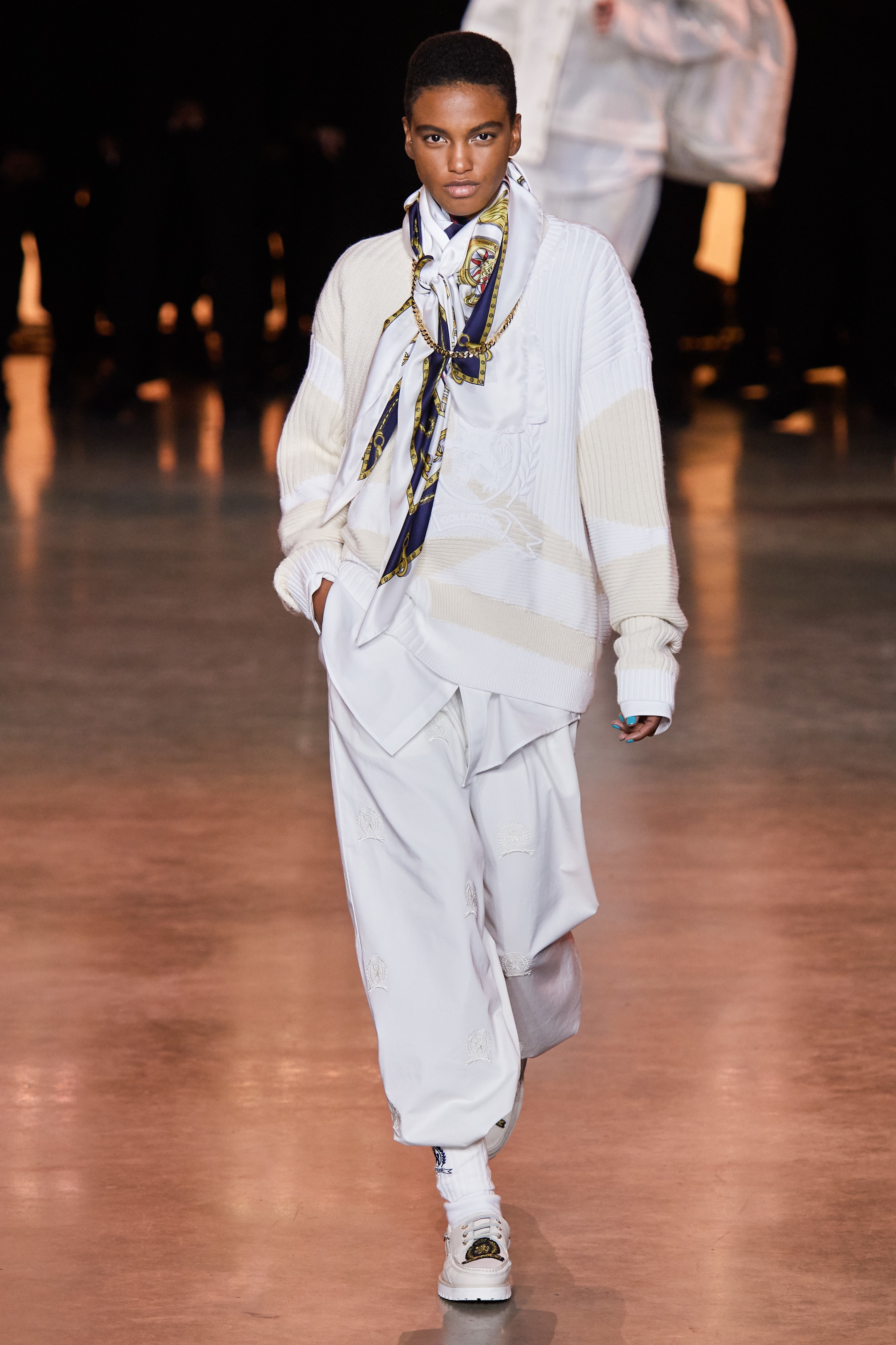 Ключевые элементы: оверсайз-парки и худи с вместительными карманами, светоотражающие ленты на сумках и вещах, светлые костюмы, бомберы, прямые пальто и большие шарфы, "наивные" принты на женственных костюмах.
