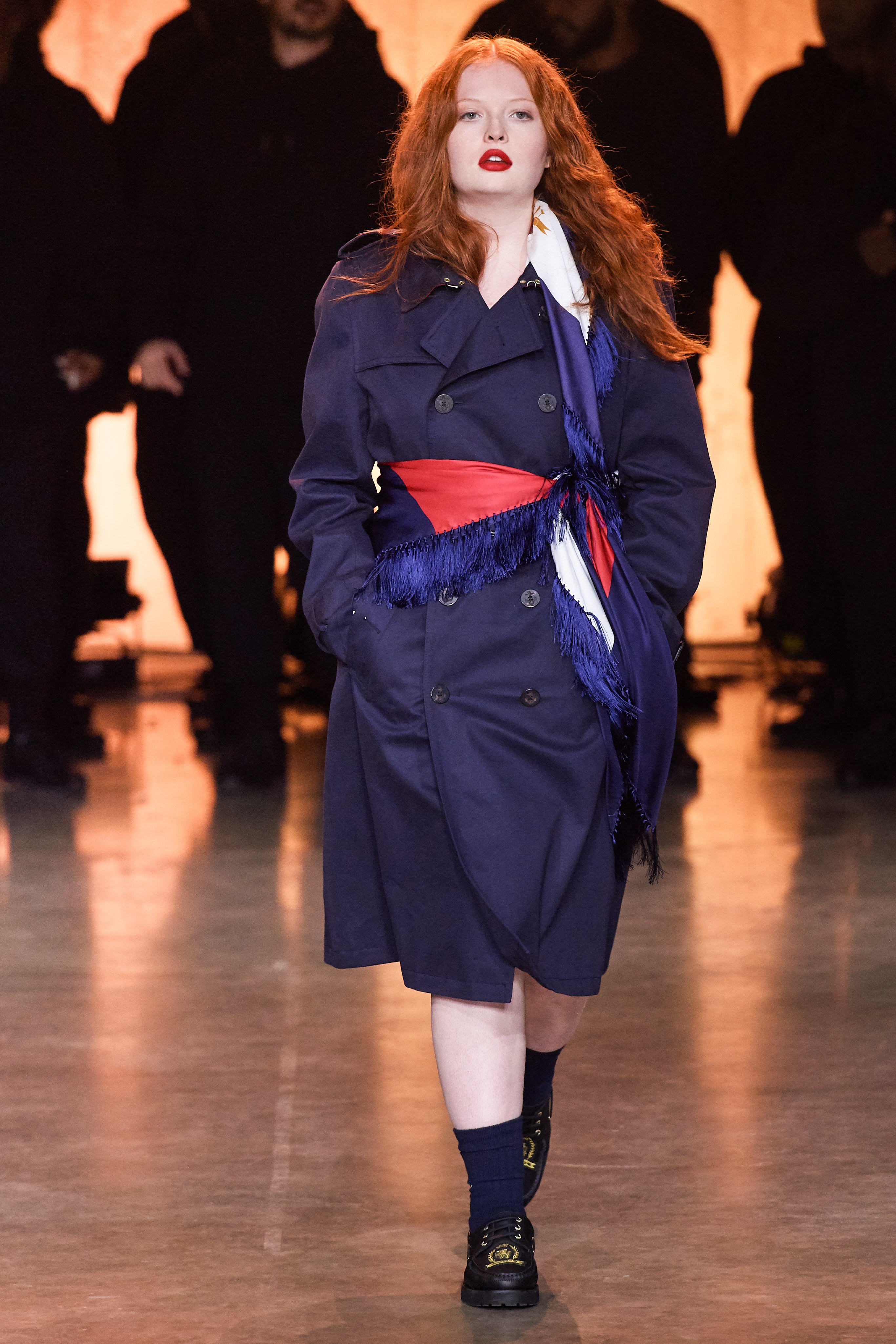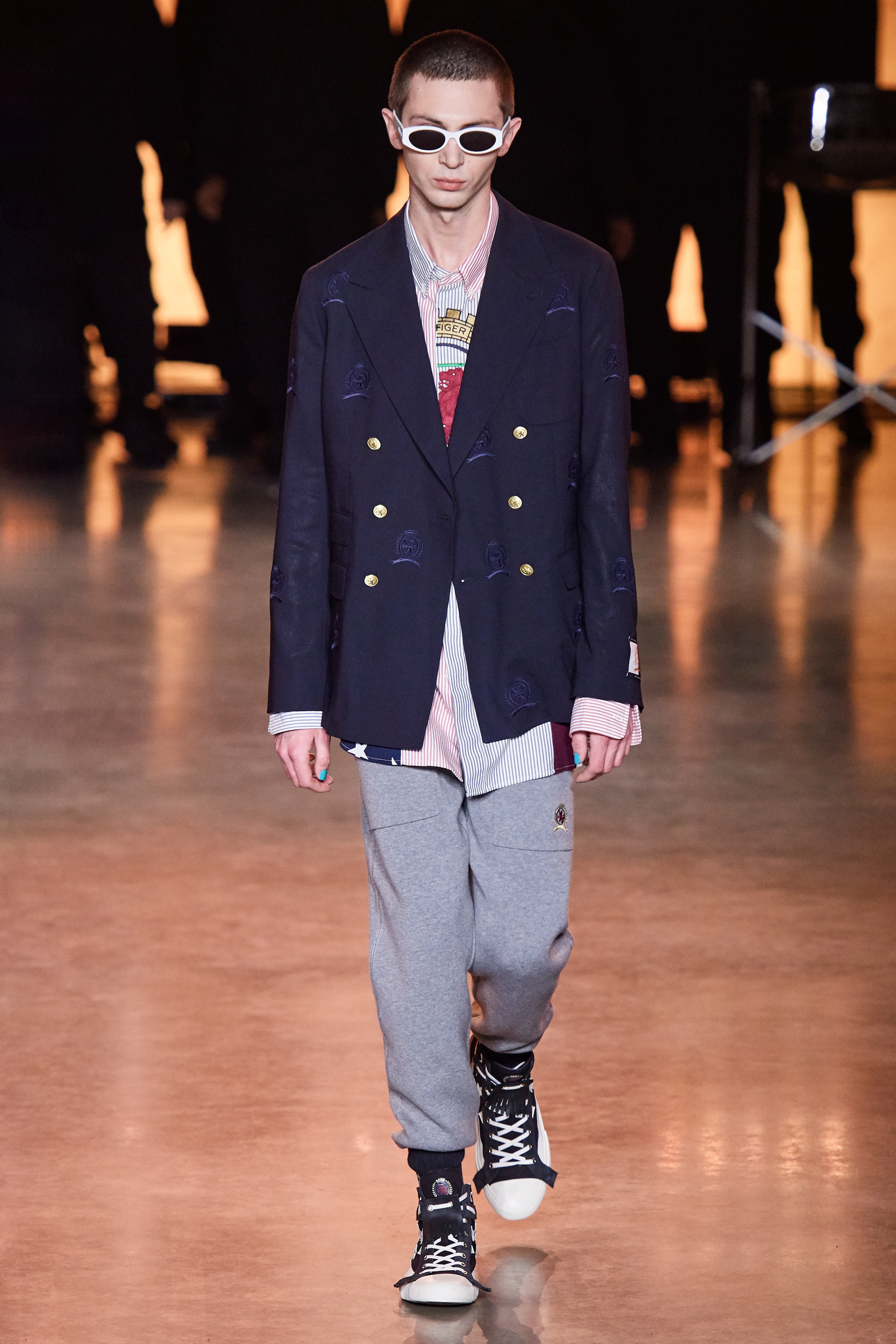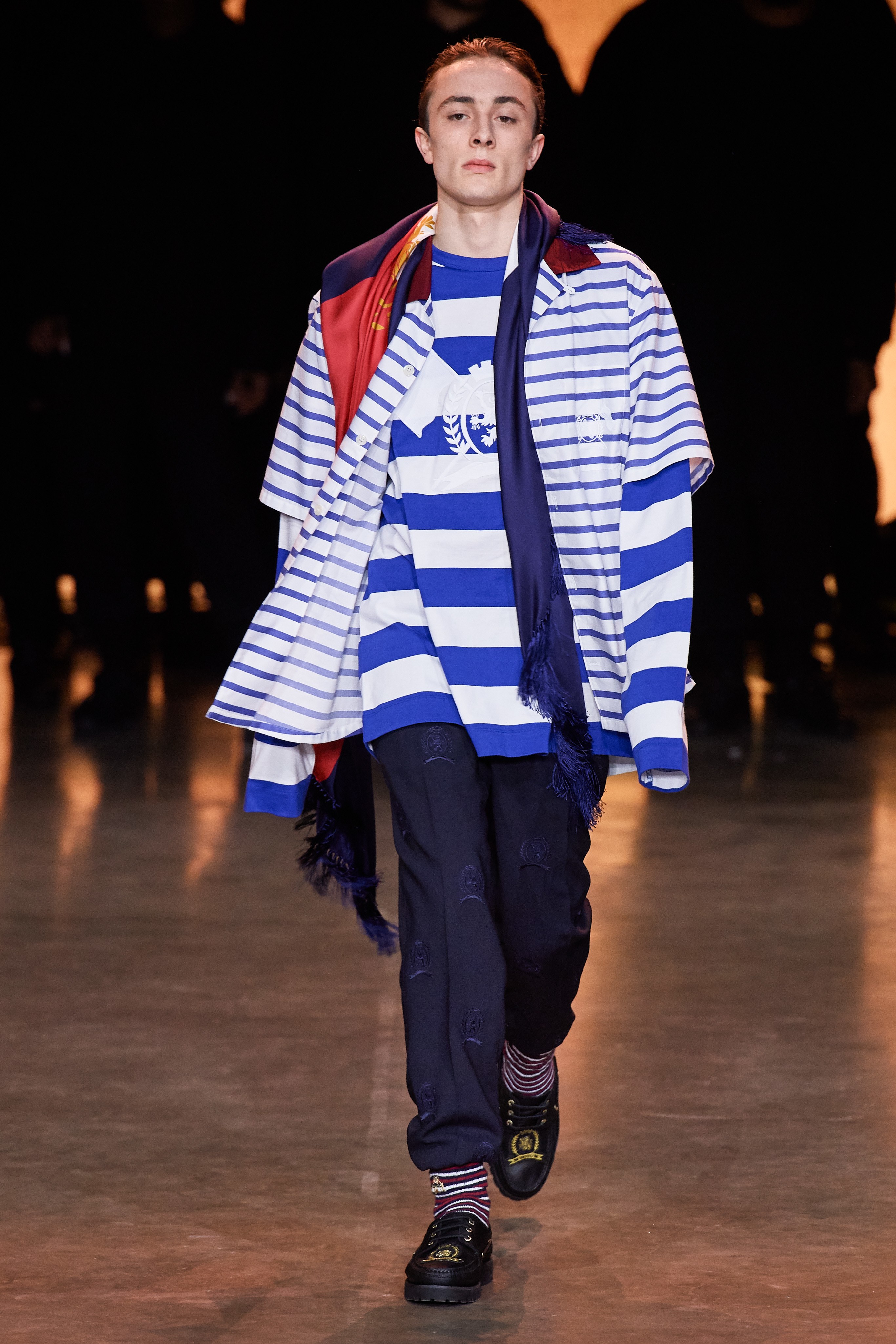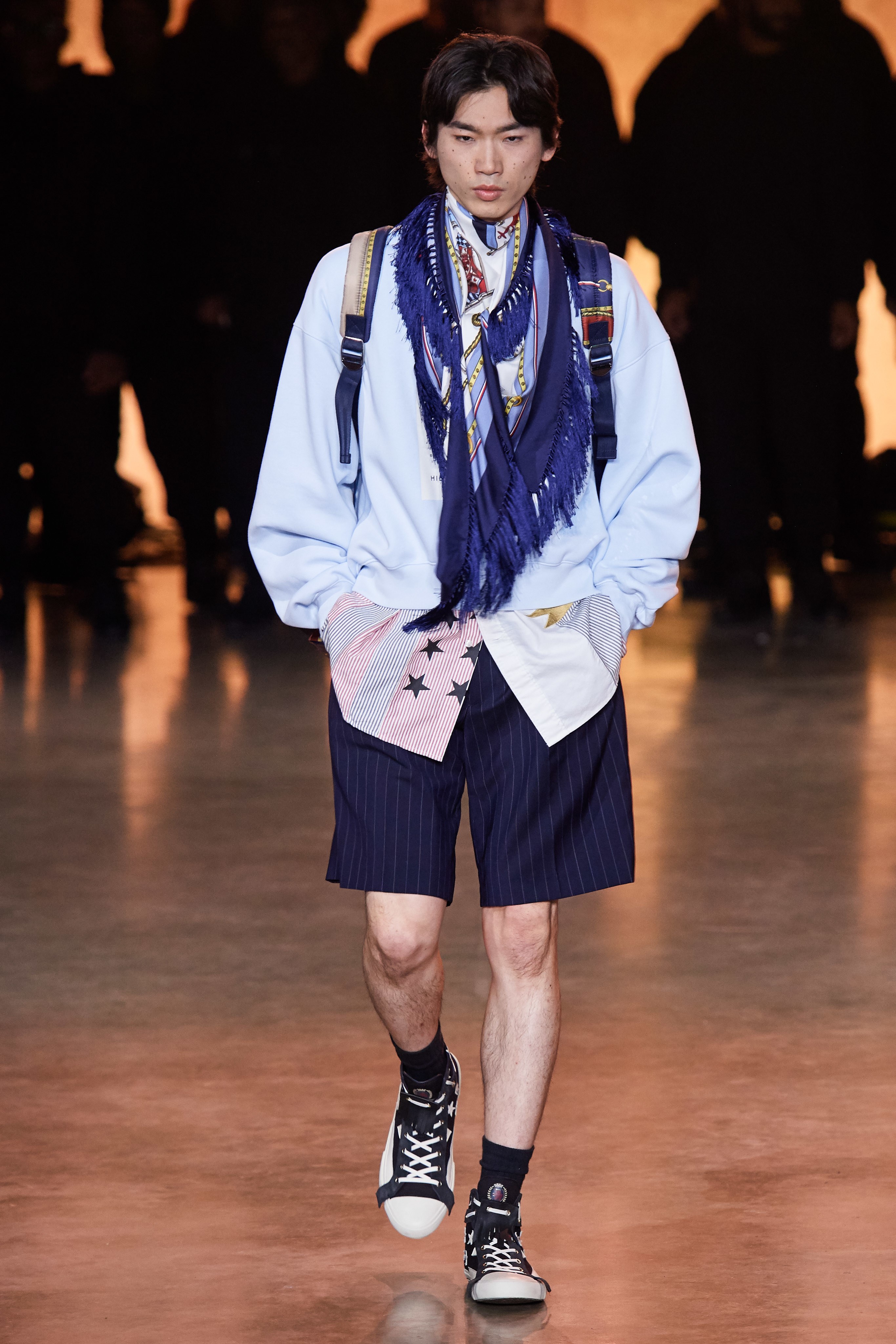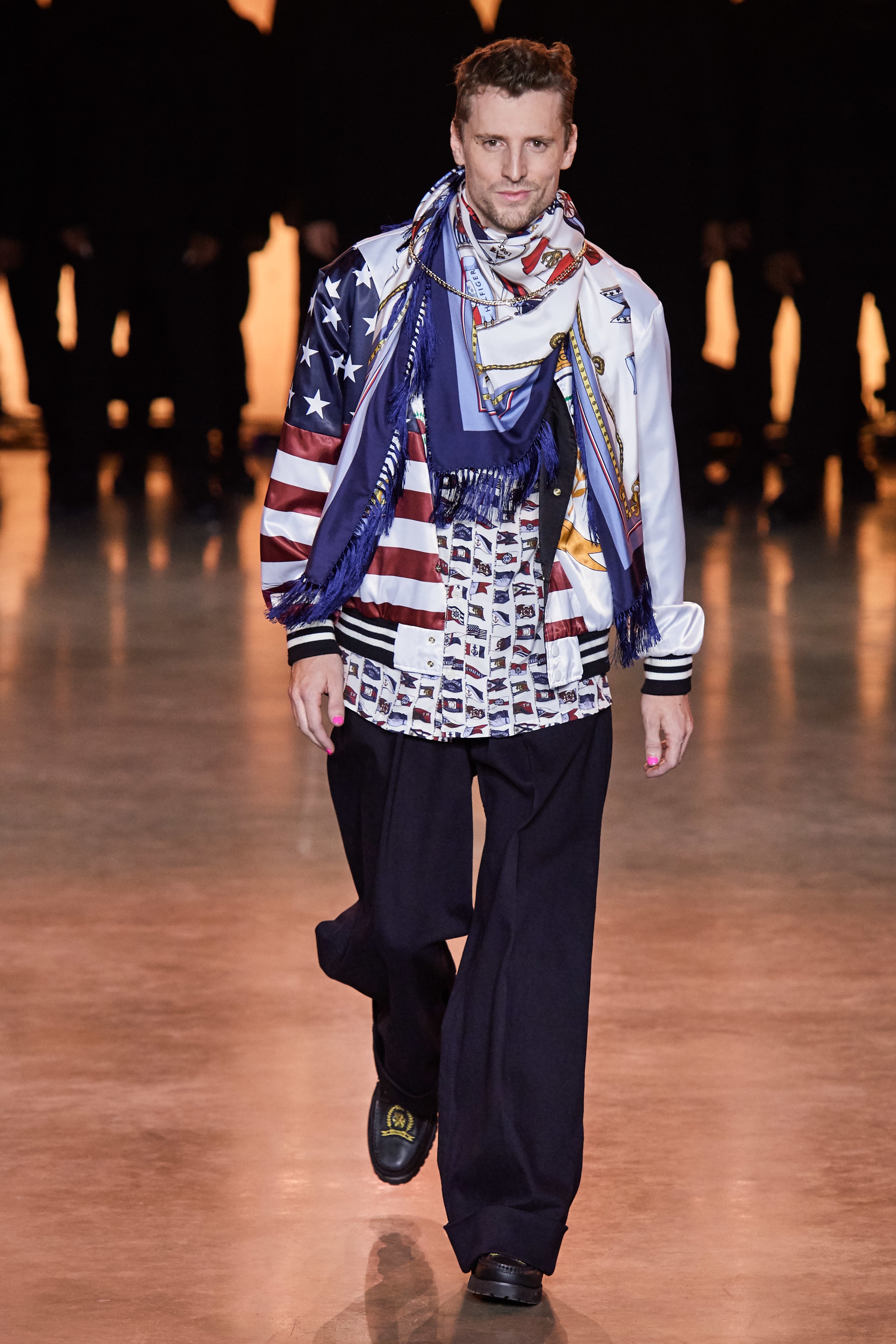 Ключевые элементы: оверсайз-парки и худи с вместительными карманами, светоотражающие ленты на сумках и вещах, светлые костюмы, бомберы, прямые пальто и большие шарфы, "наивные" принты на женственных костюмах.