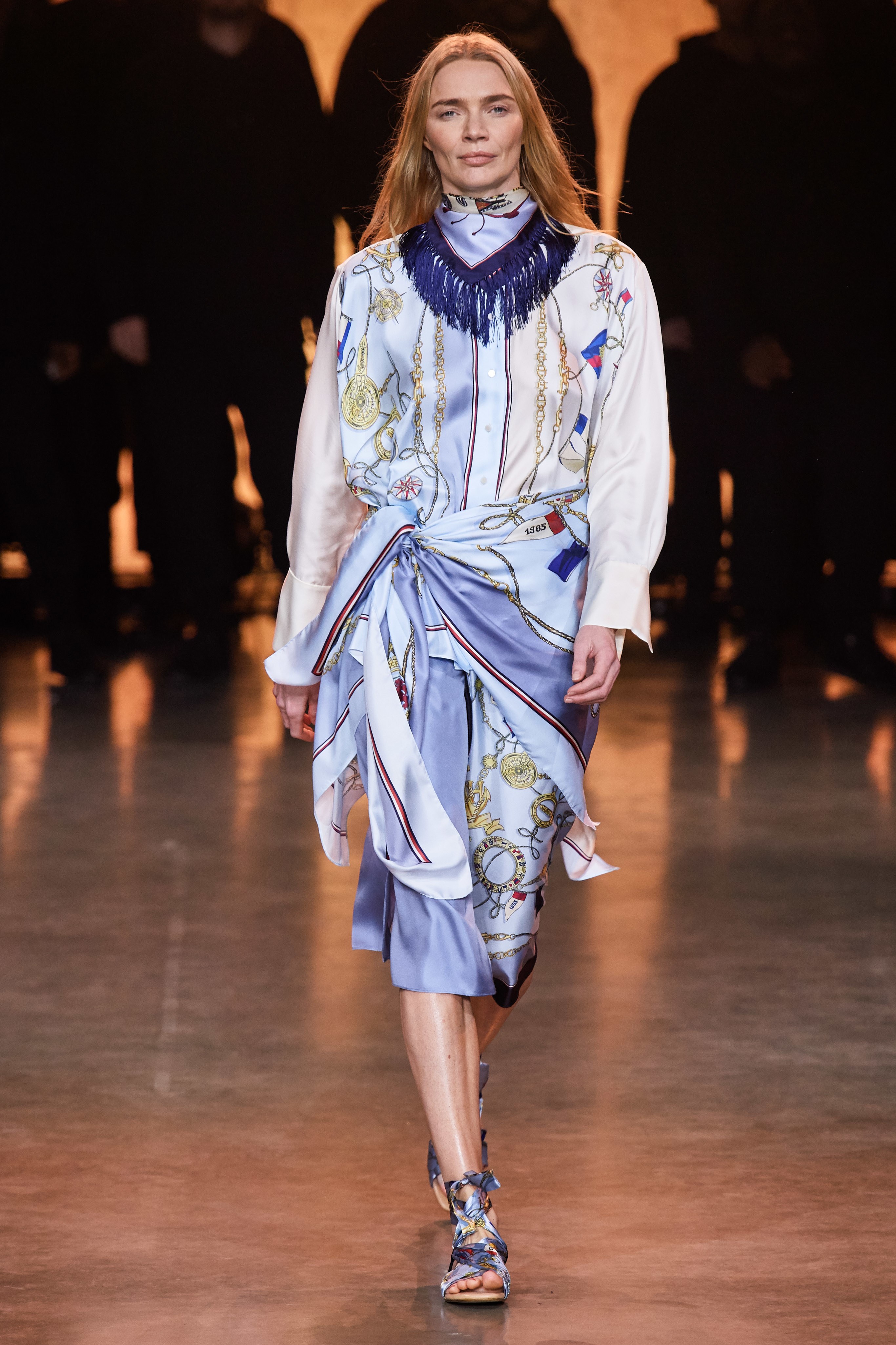 Актуальные тренды: неоновые цвета, многослойность, шелковые шарфы-ленты, обернутые вокруг спортивных и строгих костюмов, спортивные парки и ветровки.