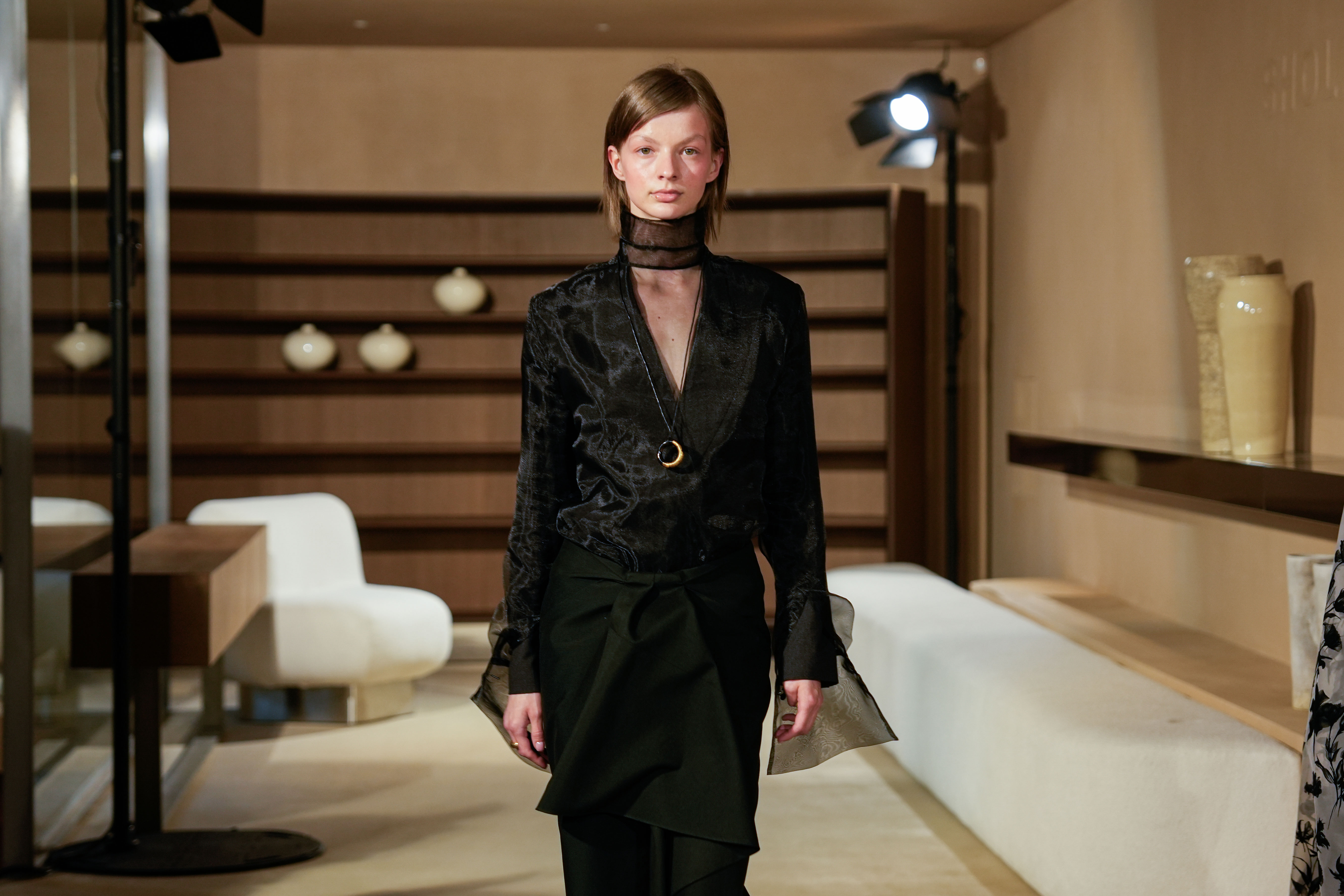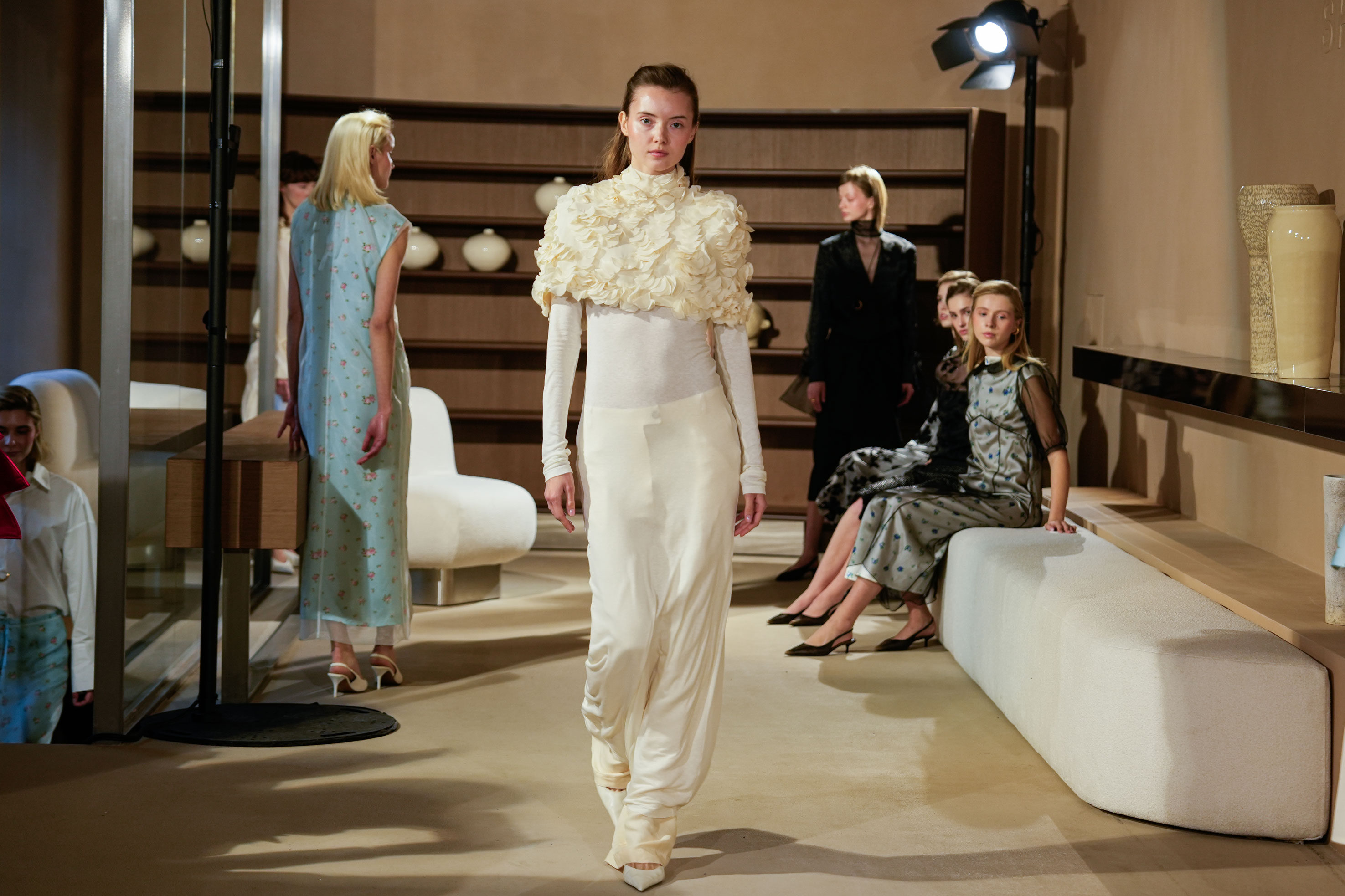 Шви з навмисно випущеними нитками проходять крізь тренчі, спідниці та сукні. Вони додають силуетам бруталізації, створюють напругу між чистотою крою та «неідеальністю» краю. І саме ця напруга формує новий характер жіночності бренду — своєрідний гранж у кольорі ice blue. Той самий прийом з’являється і у взутті, зокрема в ботфортах, які дизайнерка ховає вже не перший рік під багатошаровістю.