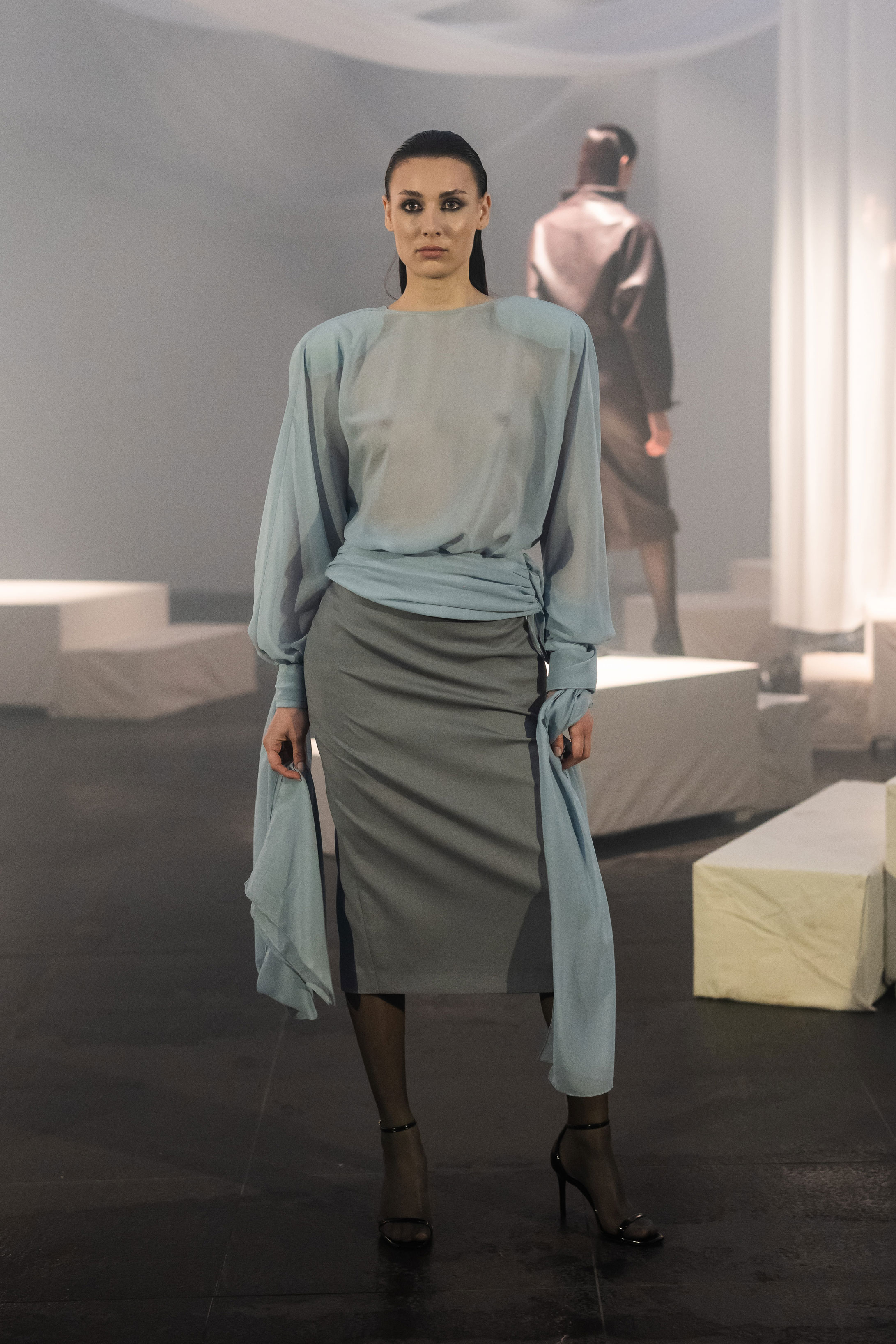 13 березня в Мистецькому Арсеналі в рамках Ukrainian Fashion Week дизайнерка Надя Дзяк представила авторський артперформанс ROOTS OF LIGHT. Подія відображала процес трансформації - від художнього образу до одягу і до артоб’єкта. Під час дії елементи колекції поступово змінювали свою функцію і ставали частиною просторової інсталяції. Через пластику тканини, геометрію, світло та звук дизайнерка досліджувала момент, коли мода переходить у площину художнього жесту.