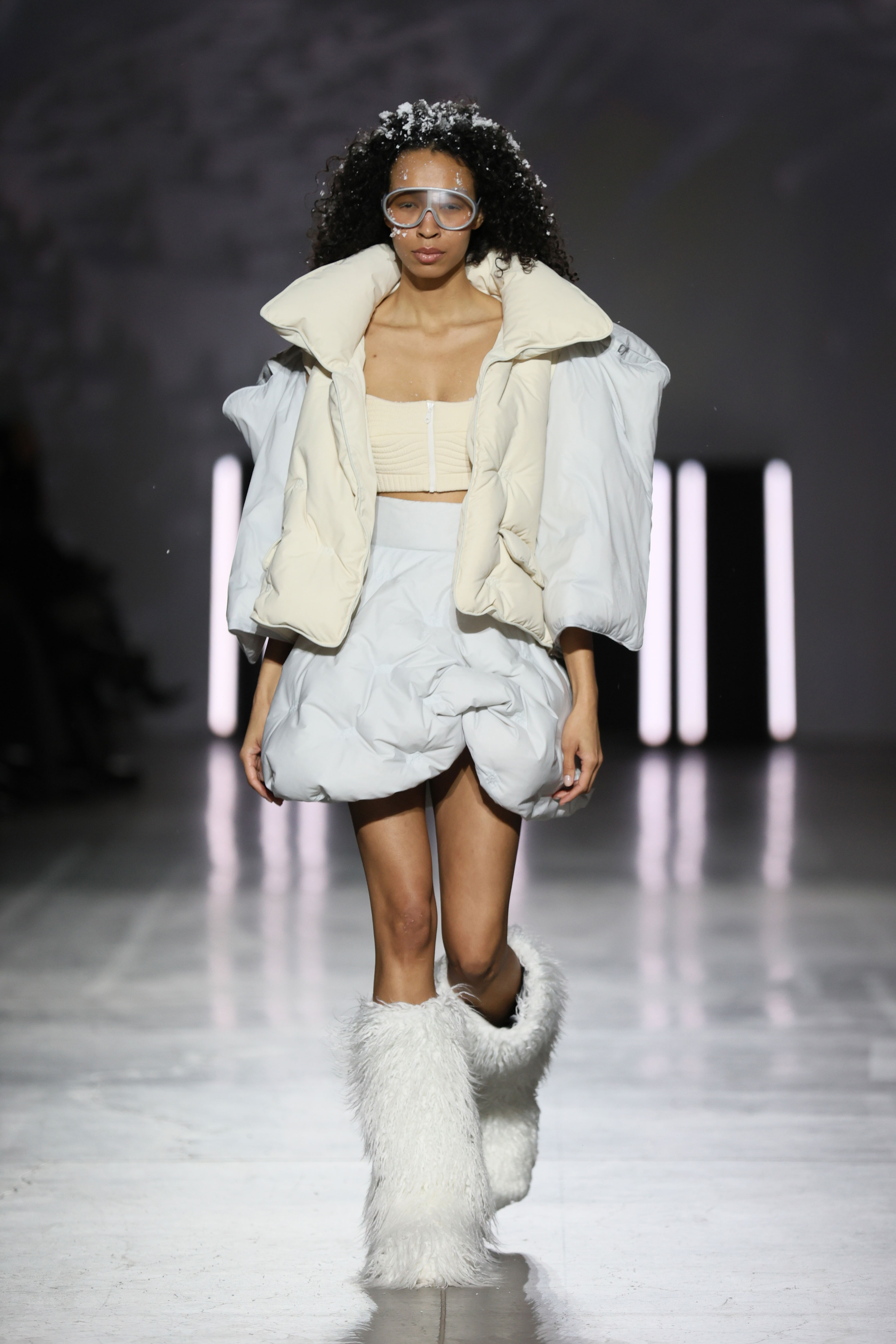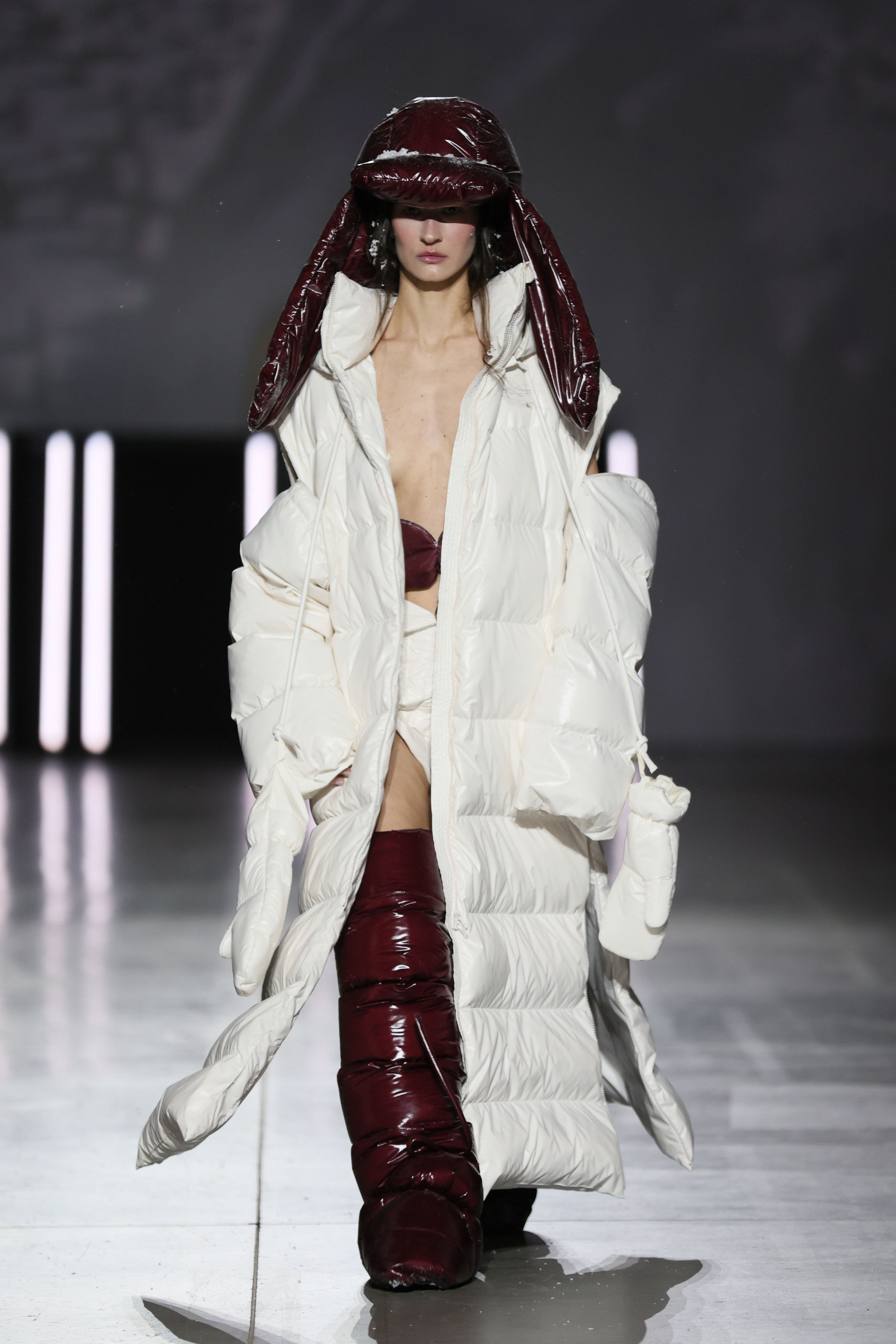 Представляючи свою колекцію на Ukrainian Fashion Week, львівський бренд експериментального одягу C.ICON переосмислив пуховий одяг, відмовляючись від звичайного уявлення про нього як винятково спортивний і повсякденний елемент гардероба. Стьобані костюми, подовжені пальта, костюми, які комбінують анорак зі спідницею в глибокому бордовому відтінку, пухові гетри формували класичні, грайливі та експериментальні образи.