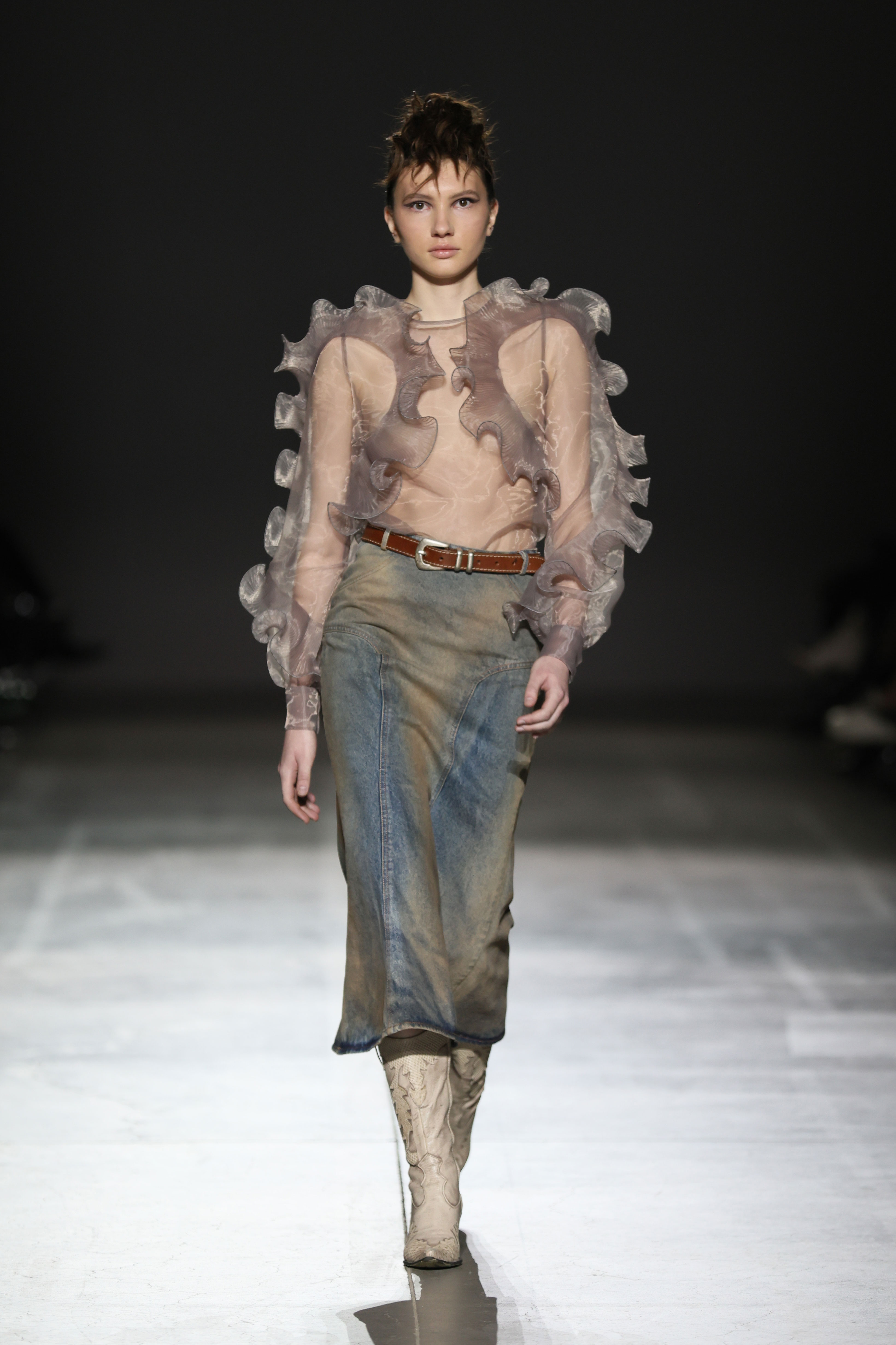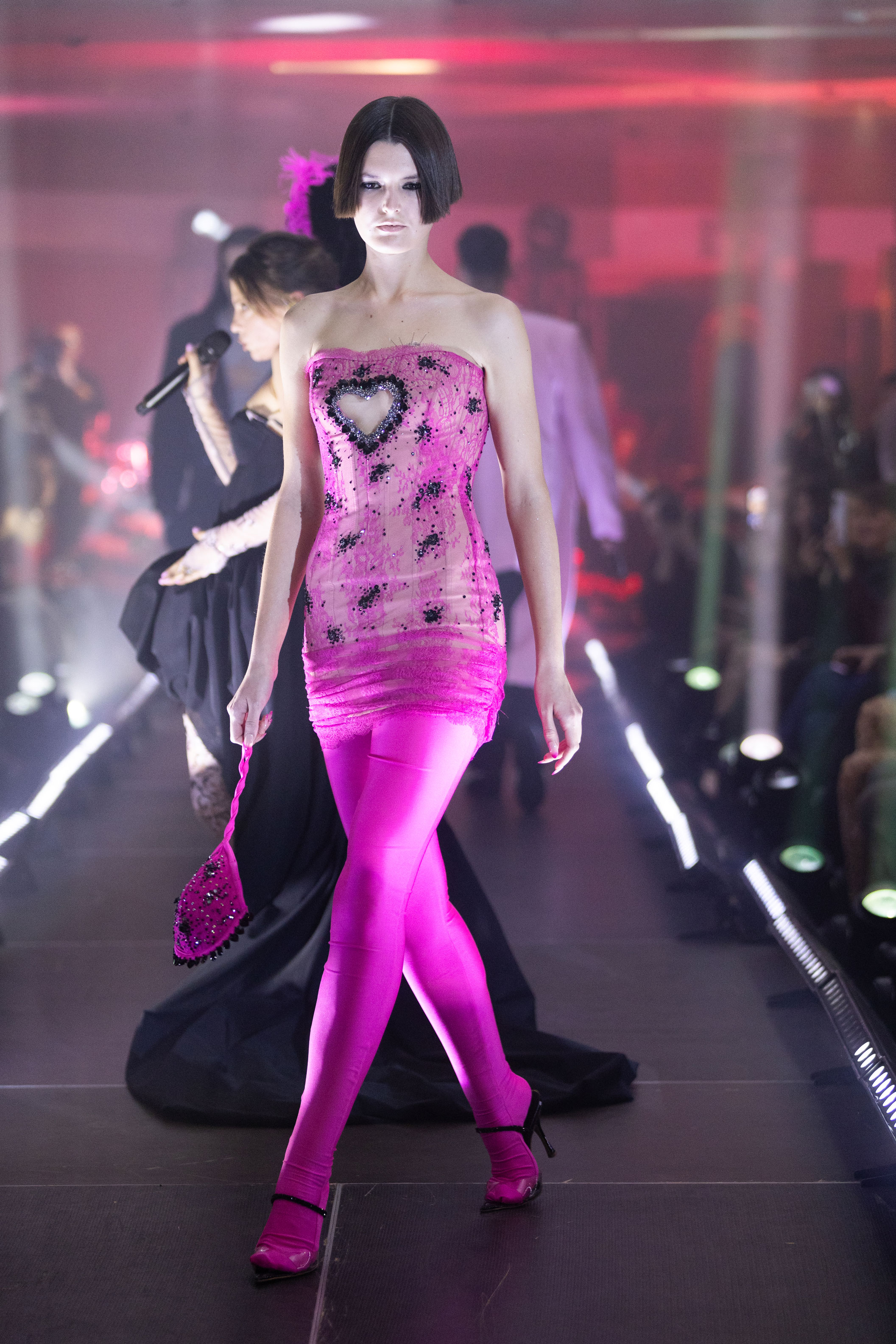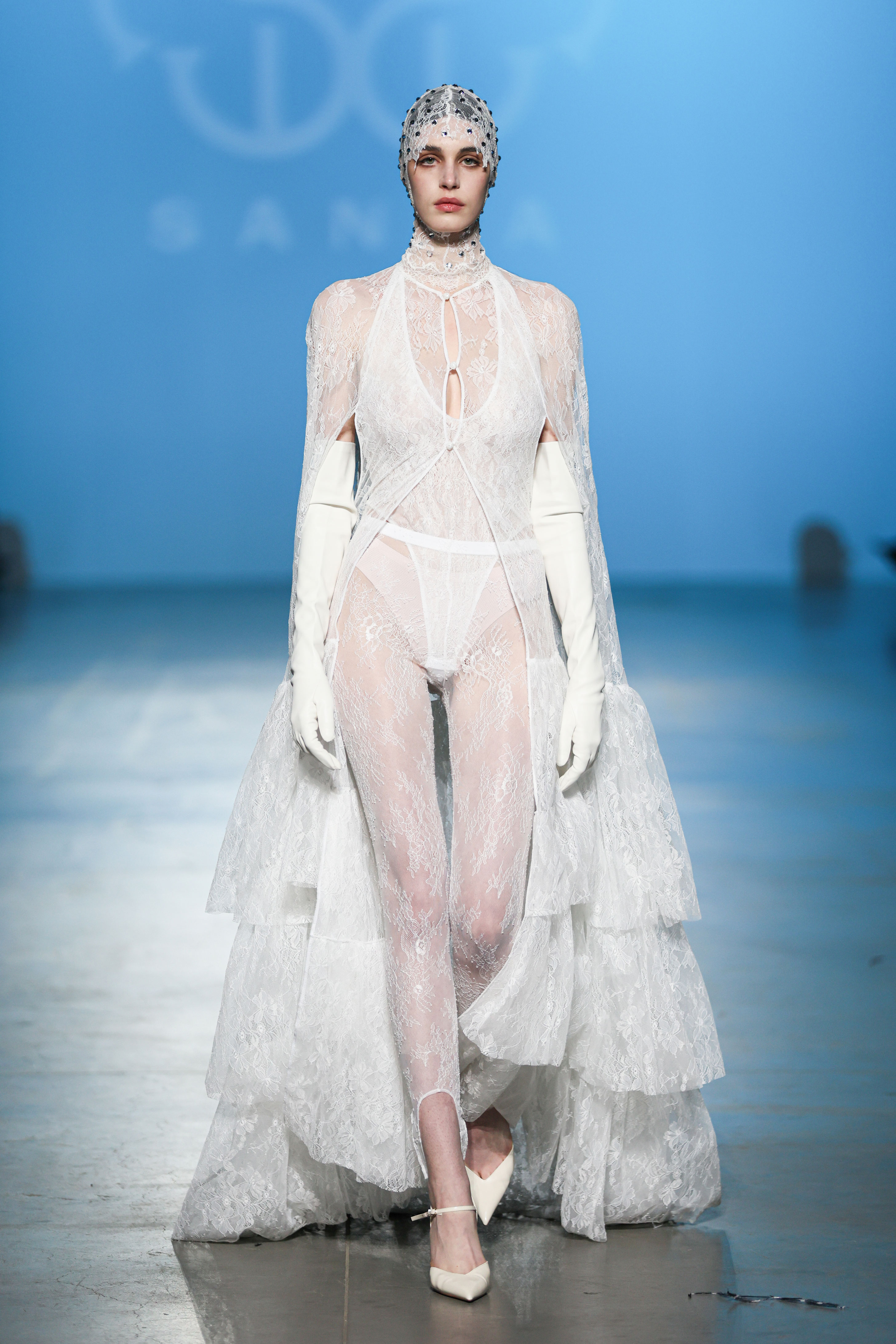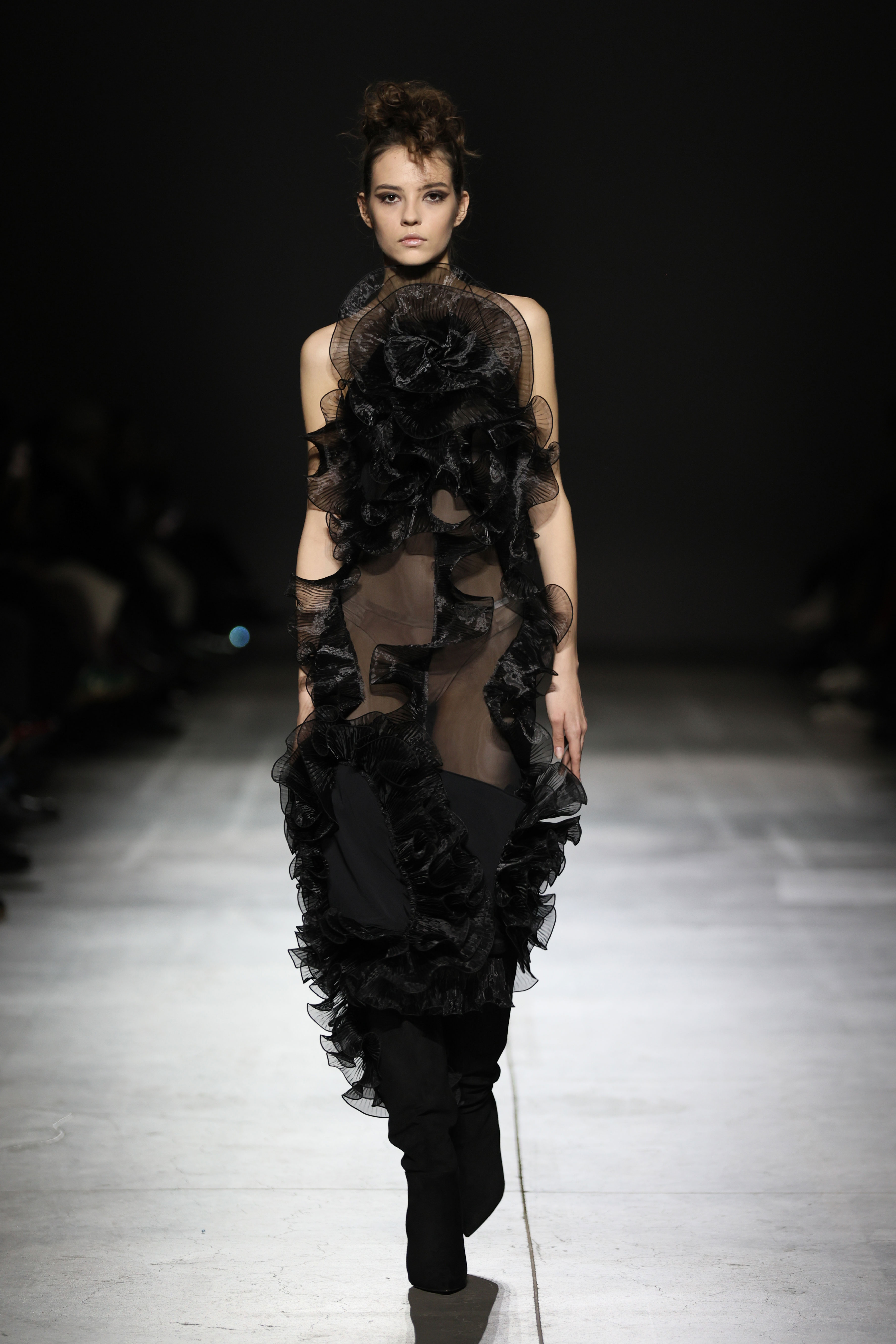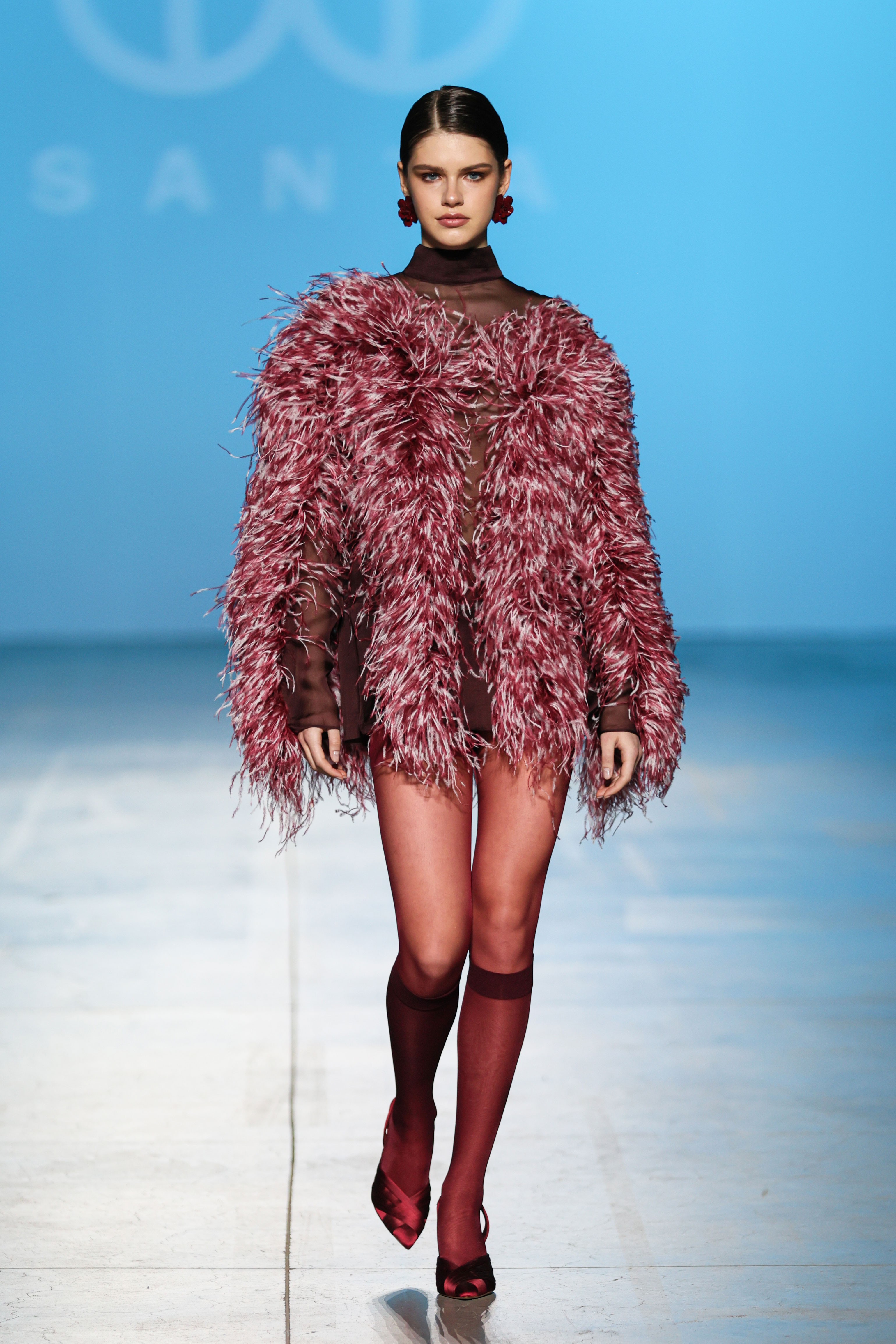На показі SANTA прозоре мереживо зіштовхувалося з щільною текстурою шкіри, продовжуючи філософію бренду про двоїстість жіночної природи, де переплітається чуттєвість і рішучість, грайливість та міць. У колекції з’явилися характерні для SANTA матеріали у вигляді розкішного хутра, об'ємного пір’я, глибокого оксамиту. «Від строгих силуетів суконь і корсетів до масивних плечей жакетів — кожна річ із колекції кидає виклик традиційному сприйняттю жіночого образу», — розповідають у бренді.