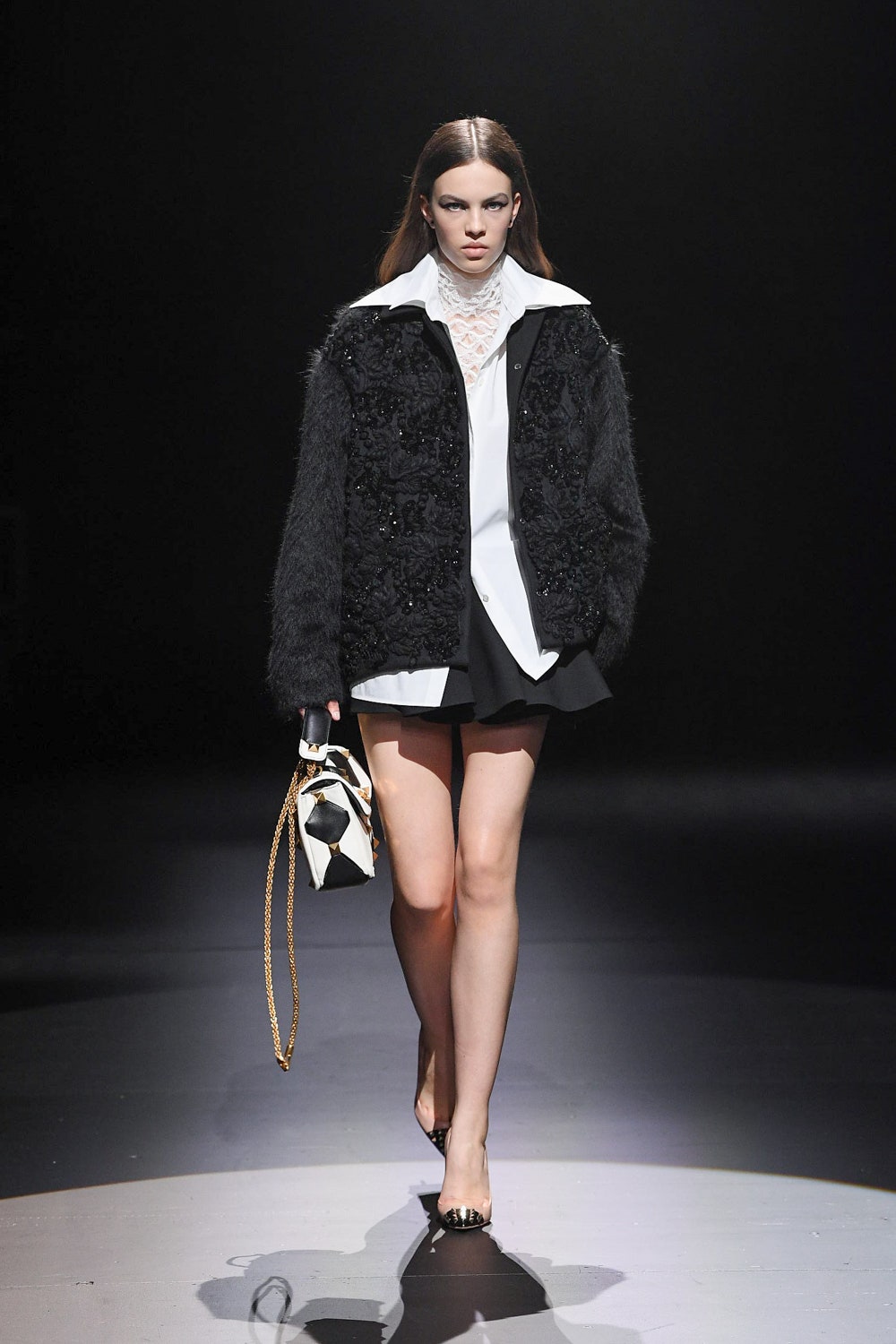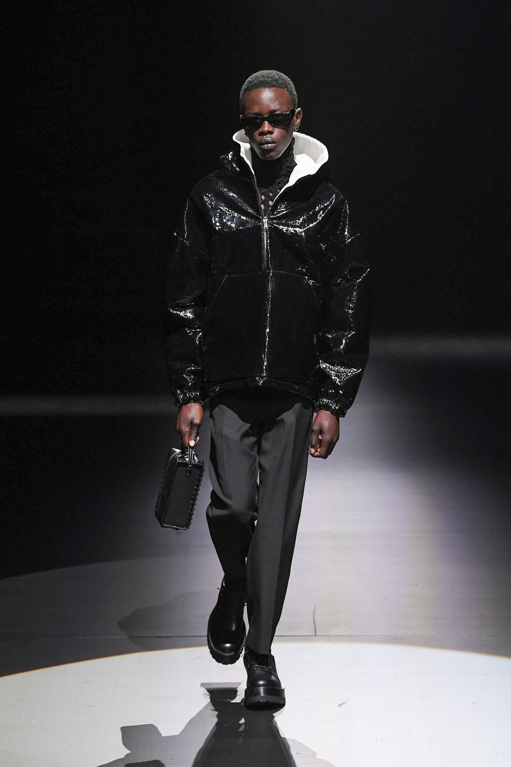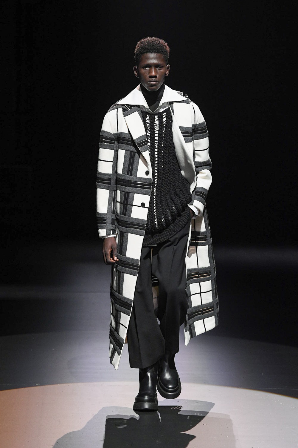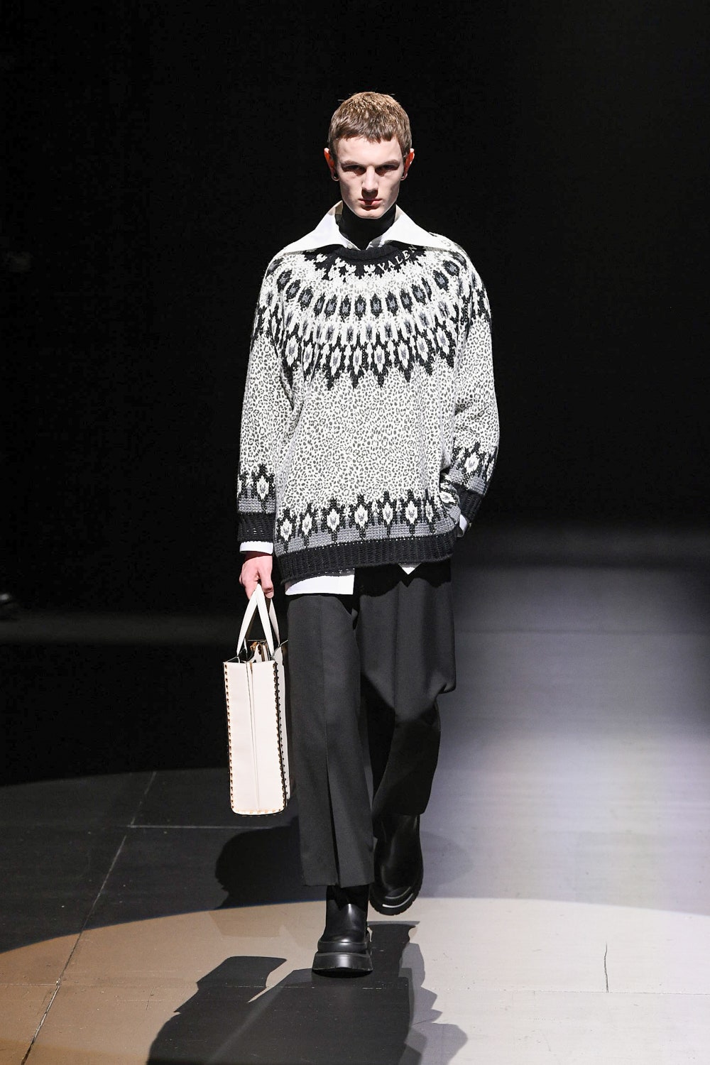 В коллекцию вошли наряды, выдержанные в ахроматической черно-белой гамме: платья и свитеры в резных объемных ромбах, дубленки и бомберы в графичных "лоскутных" орнаментах, мужские объемные кожаные куртки и пушистые мохеровые пальто. Вместо пуговиц на женских рубашках красуются ленты, кейпы и анораки украшены объемными цветами, плетением и геометричными принтами, а разбавляют строгую гамму золотой дубленый пиджак, золотой свитер, серебряное филигранное платье и сияющий, будто усыпанный звездами вечерний кейп. Одежда коллекции выглядит так, будто и правда создана для того, чтобы в ней отправляться в театр или филармонию, при этом не прибегая к срочному переодеванию. Так, формальной и строгой выглядит мужская парка-кейп, а спортивный женский свитер декорирован пайетками. Белые рубашки с отложными воротниками и вовсе могут стать неотъемлемой частью модного гардероба для тех, кто возвращается к офисной работе и не хочет пропускать вечеринки.