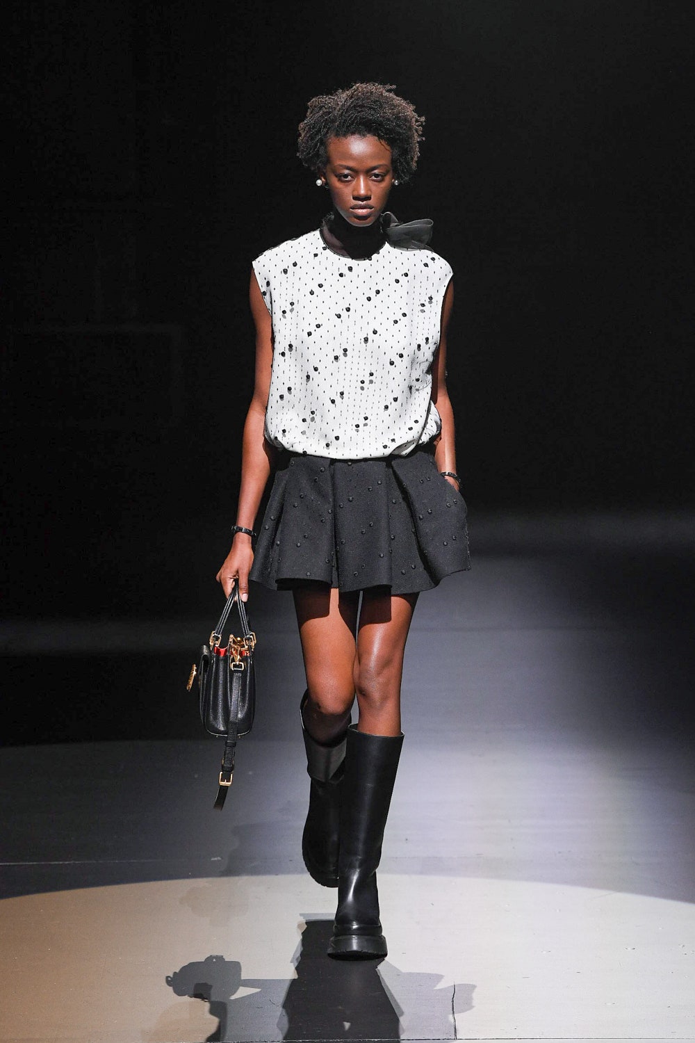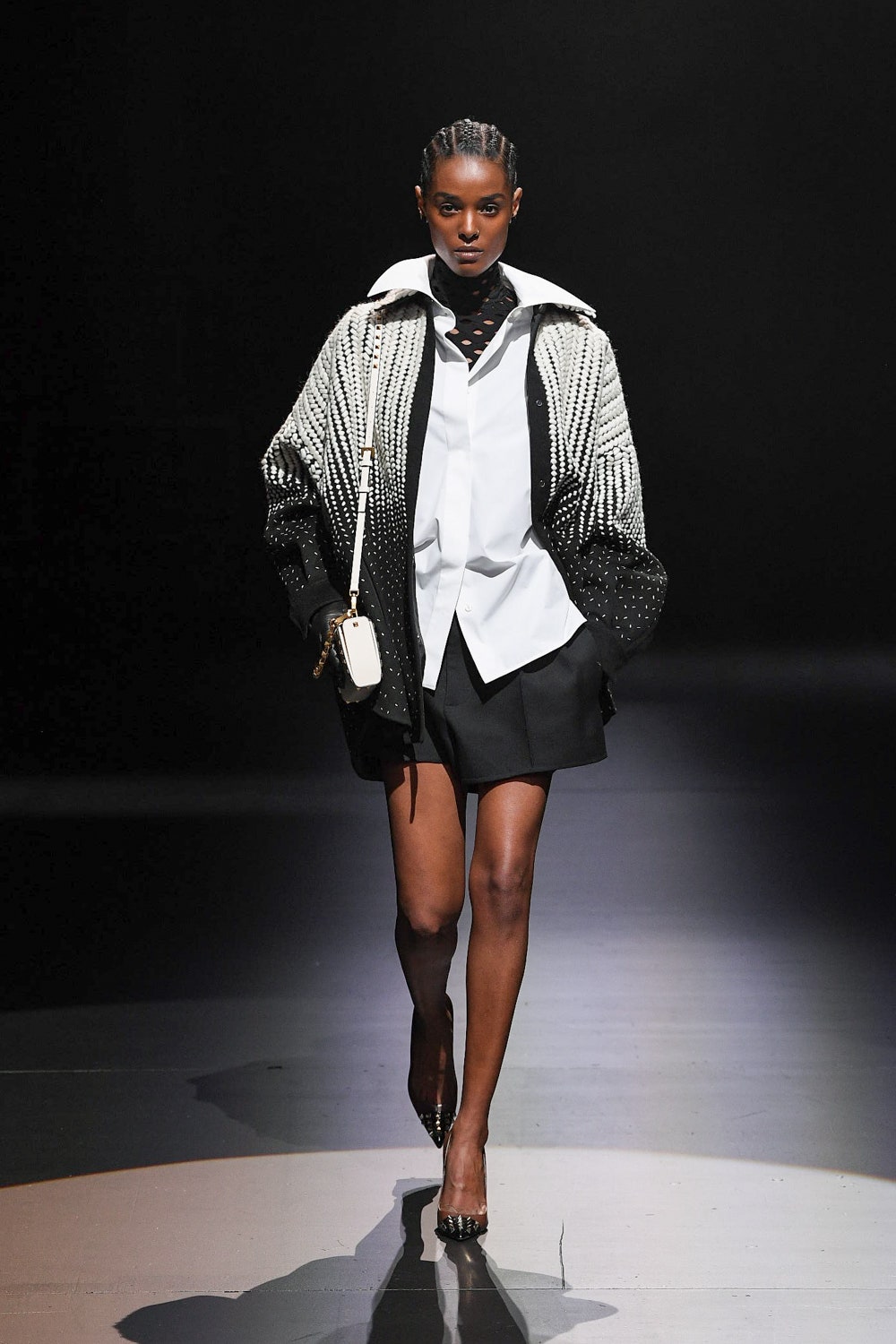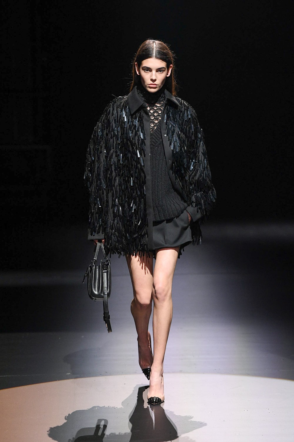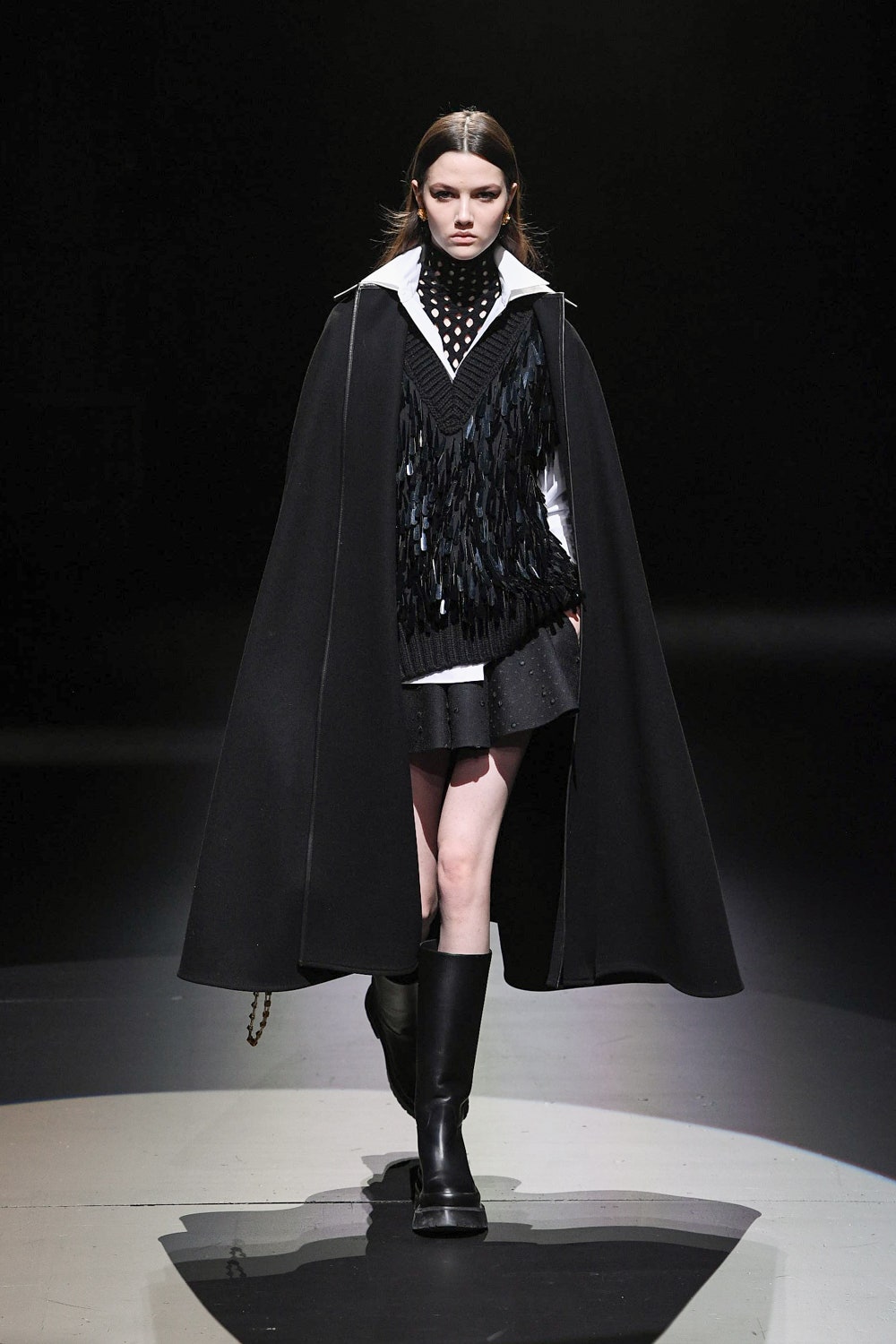 В коллекцию вошли наряды, выдержанные в ахроматической черно-белой гамме: платья и свитеры в резных объемных ромбах, дубленки и бомберы в графичных "лоскутных" орнаментах, мужские объемные кожаные куртки и пушистые мохеровые пальто. Вместо пуговиц на женских рубашках красуются ленты, кейпы и анораки украшены объемными цветами, плетением и геометричными принтами, а разбавляют строгую гамму золотой дубленый пиджак, золотой свитер, серебряное филигранное платье и сияющий, будто усыпанный звездами вечерний кейп. Одежда коллекции выглядит так, будто и правда создана для того, чтобы в ней отправляться в театр или филармонию, при этом не прибегая к срочному переодеванию. Так, формальной и строгой выглядит мужская парка-кейп, а спортивный женский свитер декорирован пайетками. Белые рубашки с отложными воротниками и вовсе могут стать неотъемлемой частью модного гардероба для тех, кто возвращается к офисной работе и не хочет пропускать вечеринки.