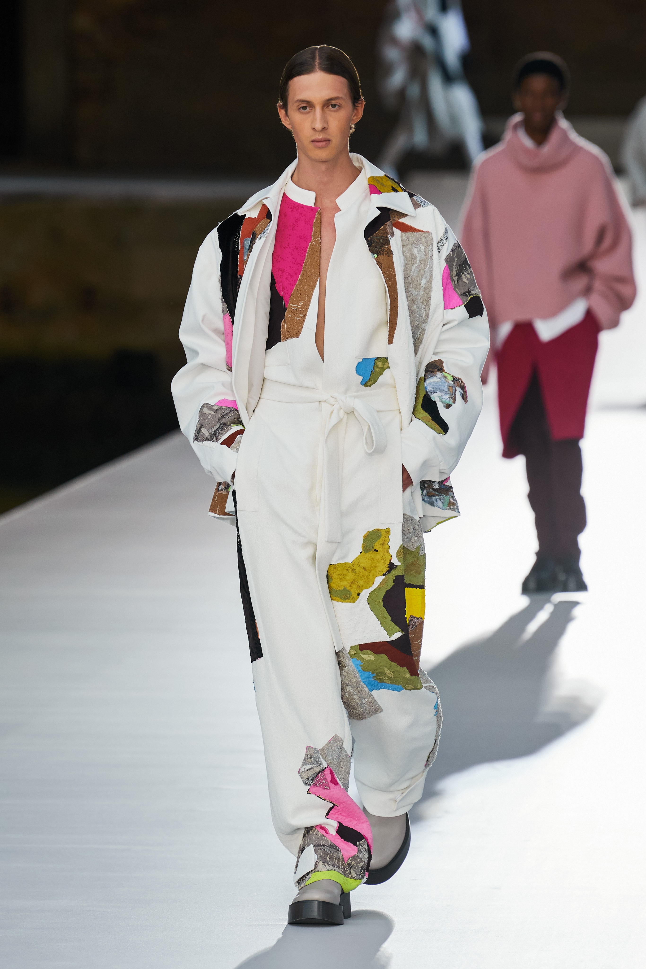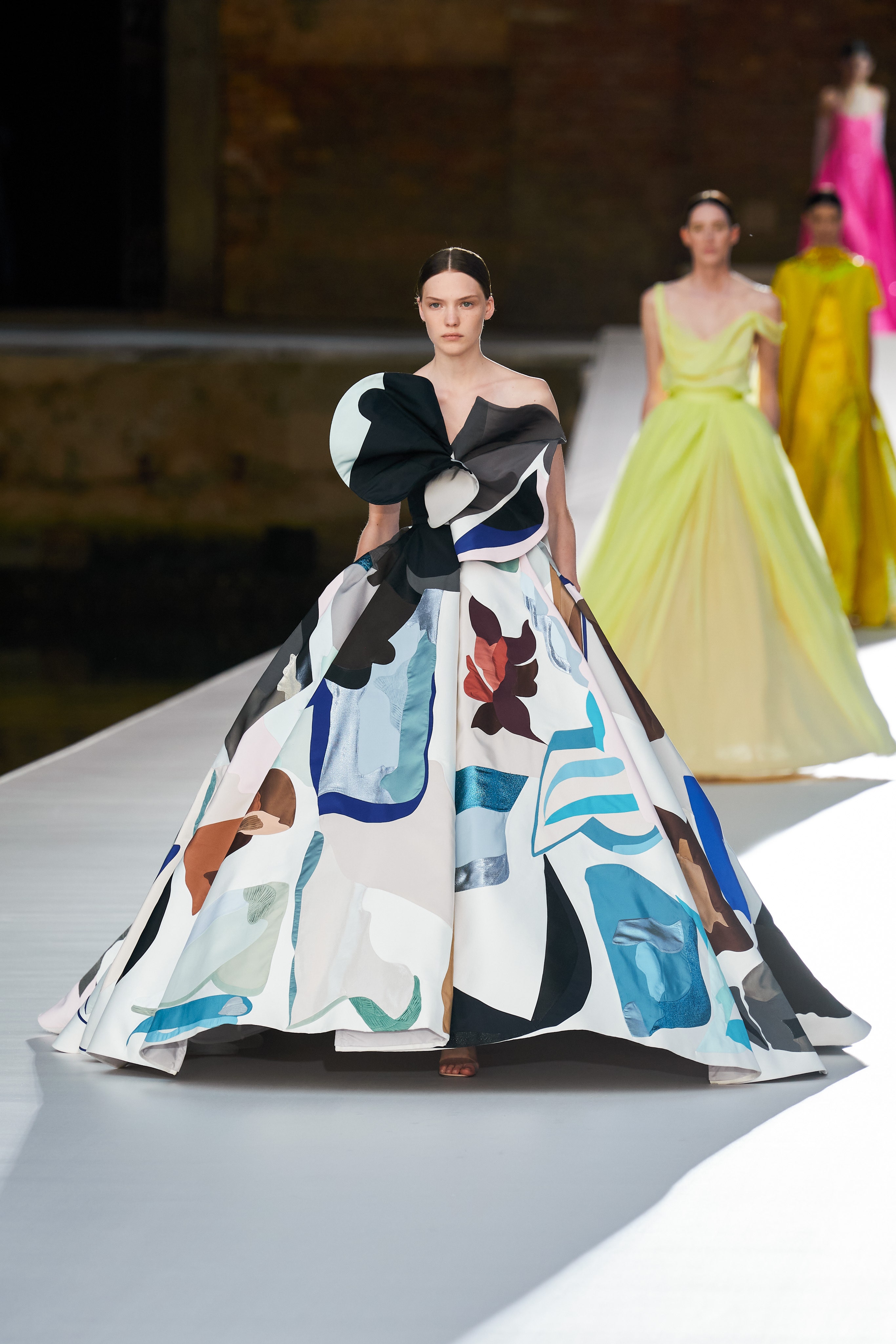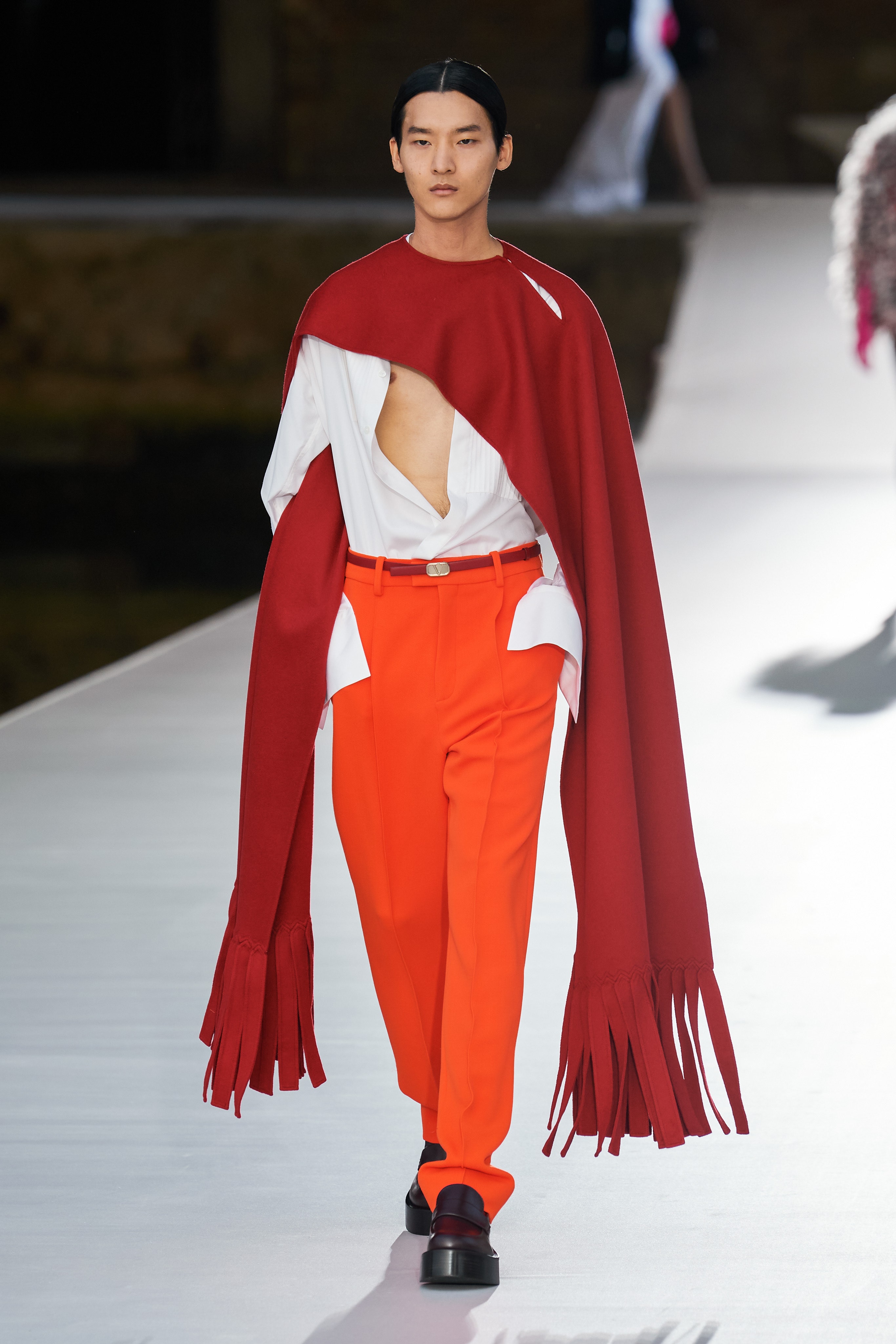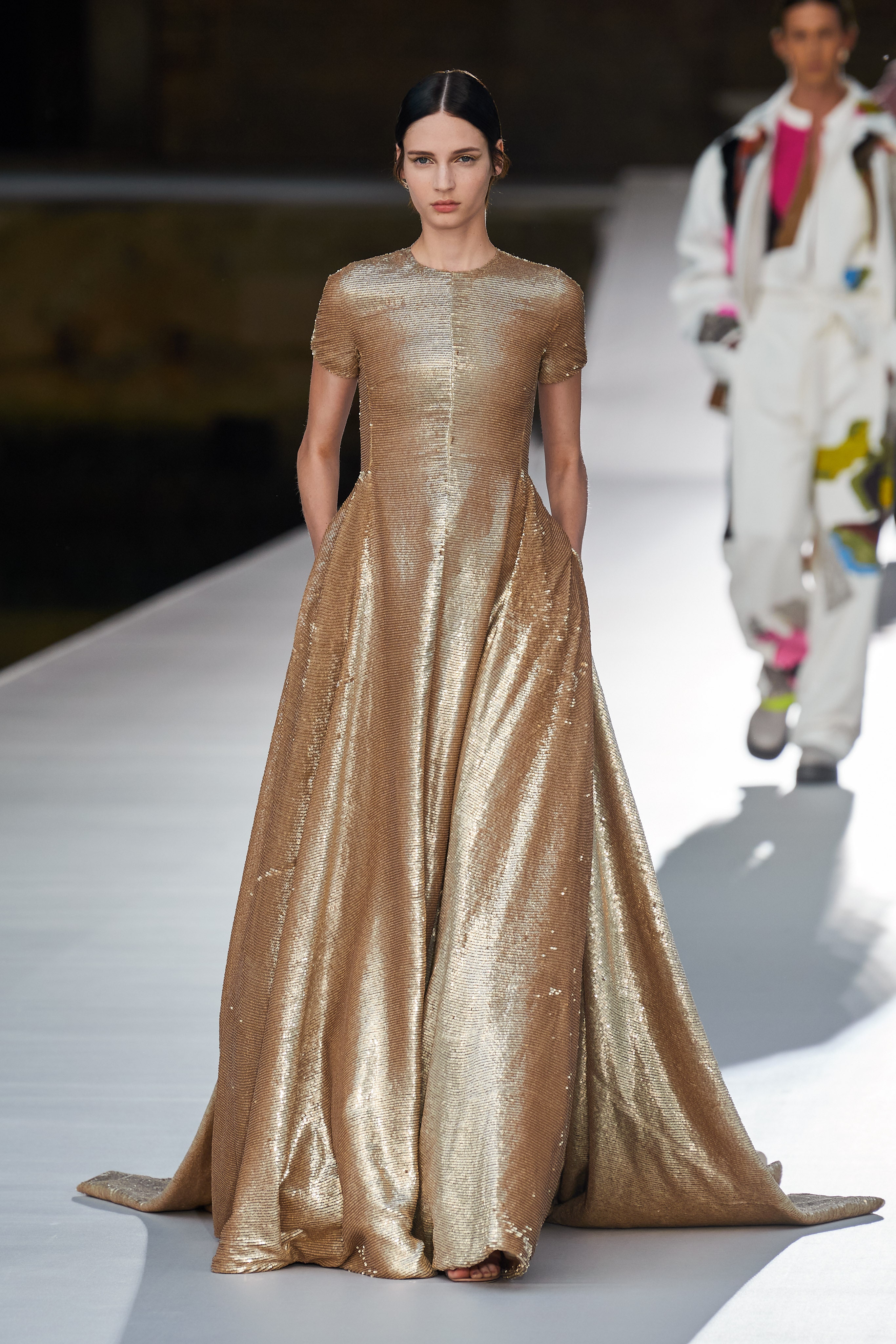 Так, в предзакатном свете, среди гостей в белых одеждах, появились модели в бальных платьях исключительных оттенков, которые так любит Пиччоли. Цветовая игра затронула и мужскую линию коллекции. Винно-бордовые пончо были перекинуты через плечи поверх белых сорочек, заправленных в алые брюки, блестящие сиреневые накидки прикрывали лавандовые мужские топы, платья оттенков розового фламинго, аквамарина, лазурита и календулы, а мужские костюмы чередовались от берилловых до драгоценно-аметистовых. Пьерпаоло так же с легкостью наслоил мужские юбки поверх брюк, короткие пальто балмакааны — поверх рубашек и блестящих маек. Вереница образов также была насыщена объемными платьями-баллонами цвета какао, драпированными нарядами и шубами из текстильных лепестков, напоминающих цветы календулы. Одним из самых величественных стало платье с крупной аппликацией на груди, расписанное абстрактными мотивами. Дизайнер дополнил образы неизменными театральными перчатками выше локтя, "невидимыми" босоножками и экстравагантными туфлями Dr. Martens. Филип Трейси создал для Valentino разлапистые шляпы из перьев, которые двигались подобно медузам при ходьбе. В силуэтах Пиччоли, как и ранее, угадывается деликатный и негласный оммаж скульптурным платьям итальянского модельера Роберто Капуччи и творениям самого Валентино.