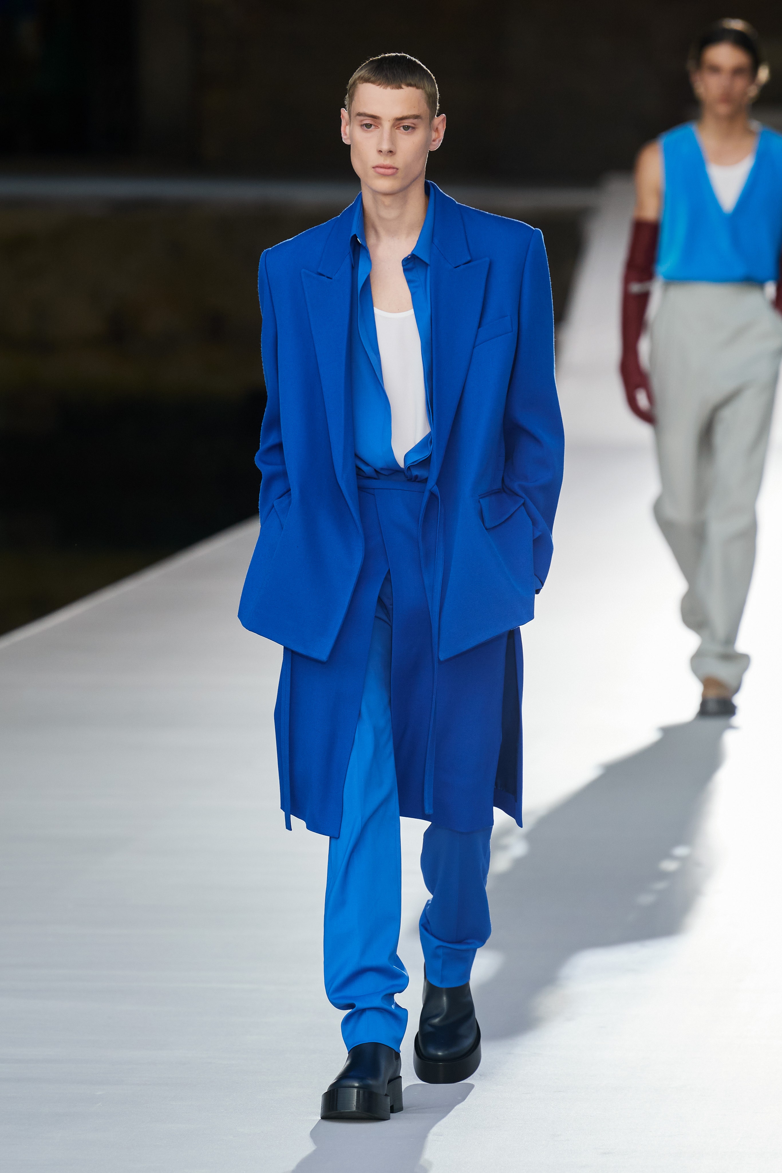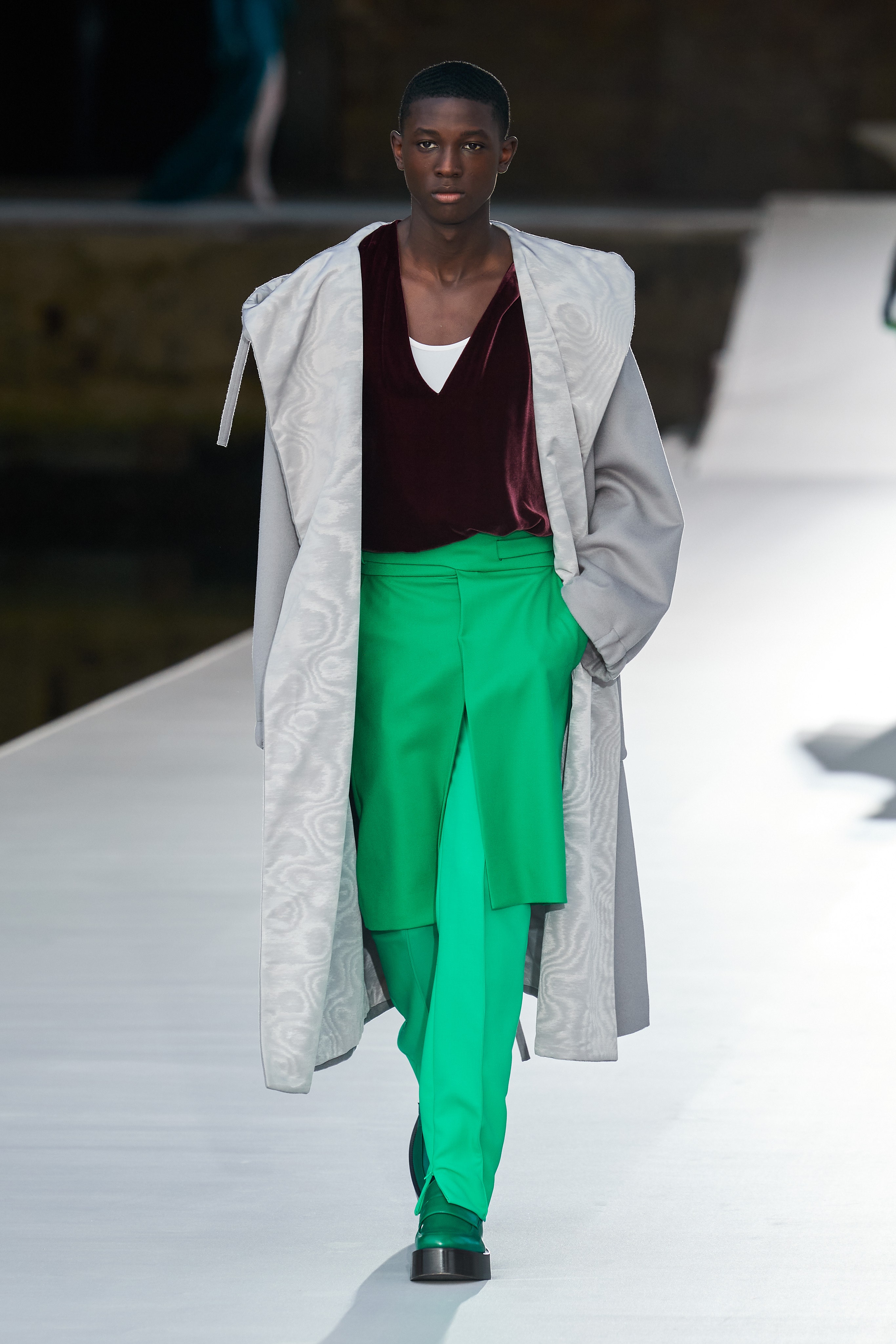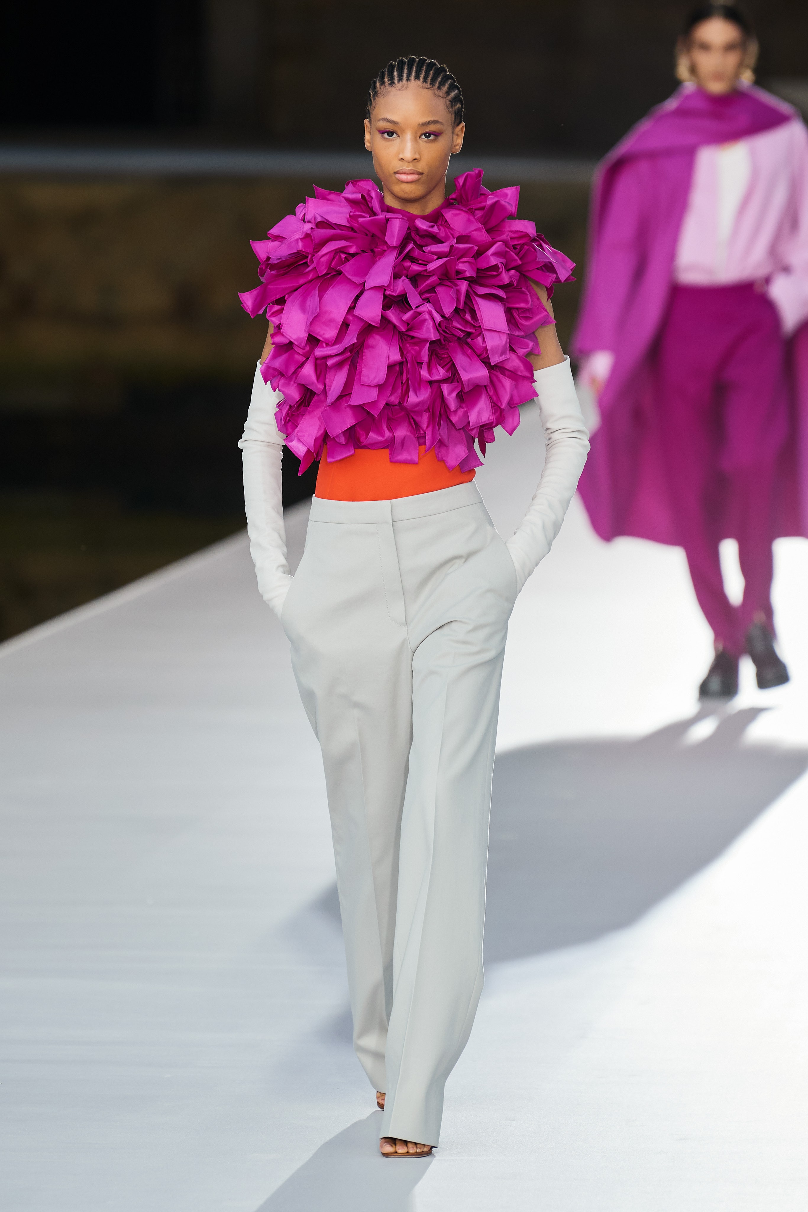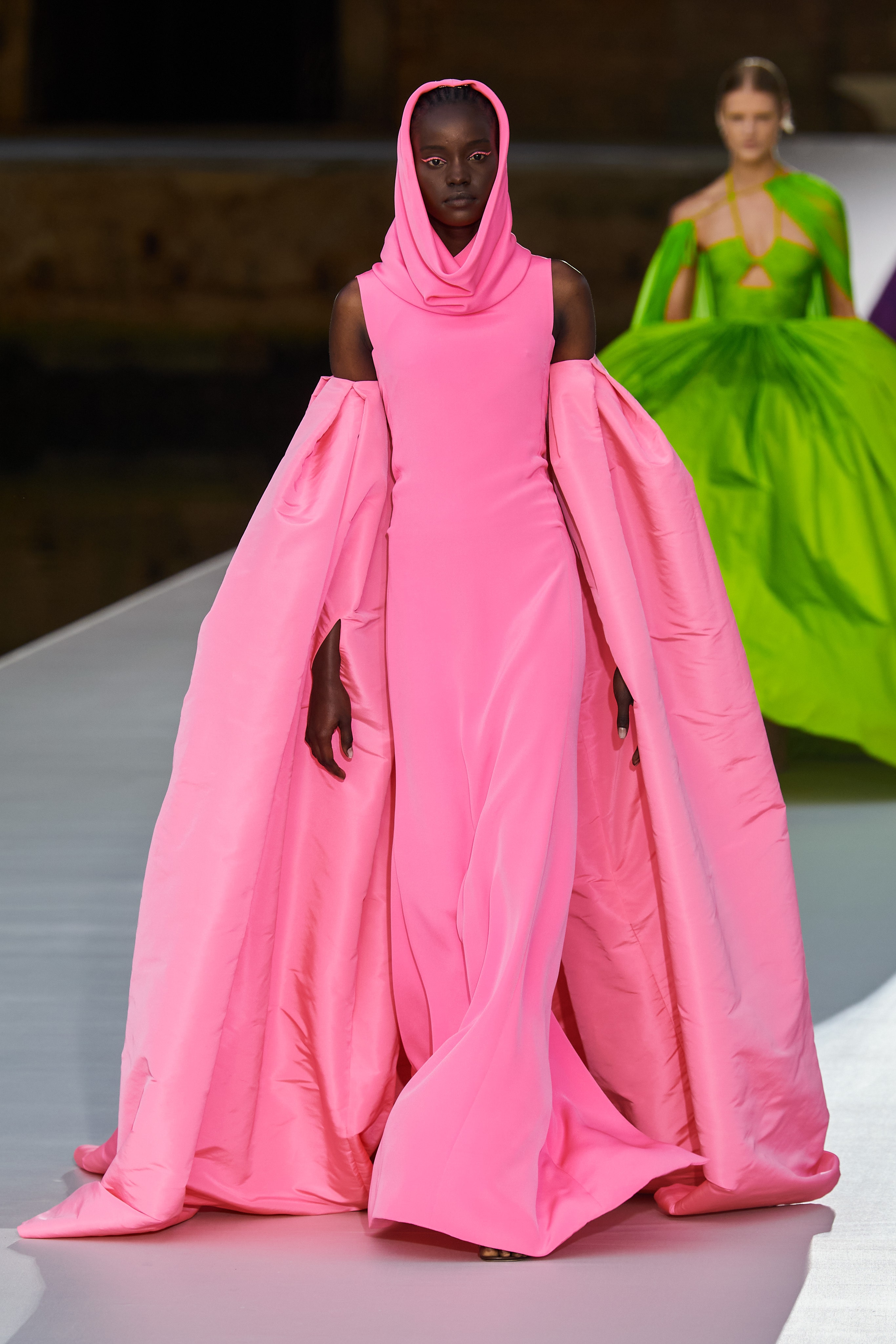 Так, в предзакатном свете, среди гостей в белых одеждах, появились модели в бальных платьях исключительных оттенков, которые так любит Пиччоли. Цветовая игра затронула и мужскую линию коллекции. Винно-бордовые пончо были перекинуты через плечи поверх белых сорочек, заправленных в алые брюки, блестящие сиреневые накидки прикрывали лавандовые мужские топы, платья оттенков розового фламинго, аквамарина, лазурита и календулы, а мужские костюмы чередовались от берилловых до драгоценно-аметистовых. Пьерпаоло так же с легкостью наслоил мужские юбки поверх брюк, короткие пальто балмакааны — поверх рубашек и блестящих маек. Вереница образов также была насыщена объемными платьями-баллонами цвета какао, драпированными нарядами и шубами из текстильных лепестков, напоминающих цветы календулы. Одним из самых величественных стало платье с крупной аппликацией на груди, расписанное абстрактными мотивами. Дизайнер дополнил образы неизменными театральными перчатками выше локтя, "невидимыми" босоножками и экстравагантными туфлями Dr. Martens. Филип Трейси создал для Valentino разлапистые шляпы из перьев, которые двигались подобно медузам при ходьбе. В силуэтах Пиччоли, как и ранее, угадывается деликатный и негласный оммаж скульптурным платьям итальянского модельера Роберто Капуччи и творениям самого Валентино.
