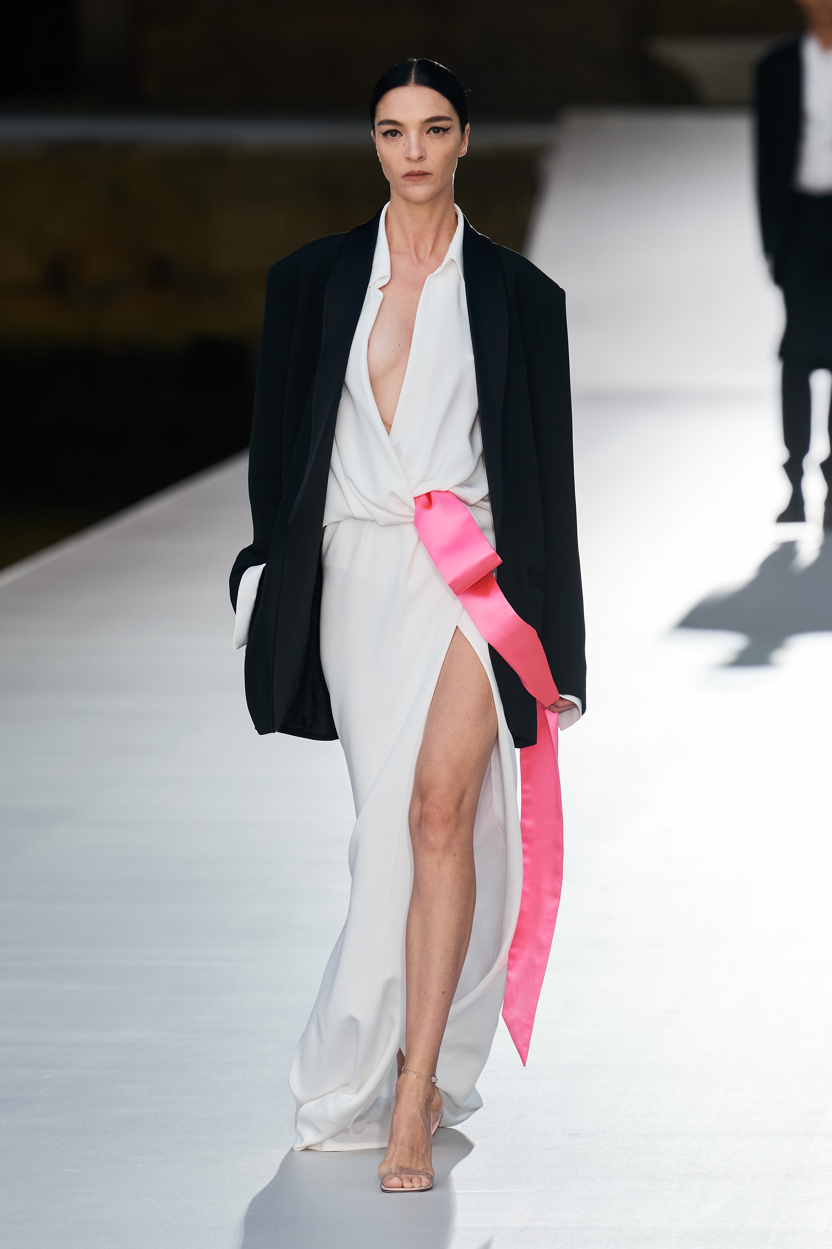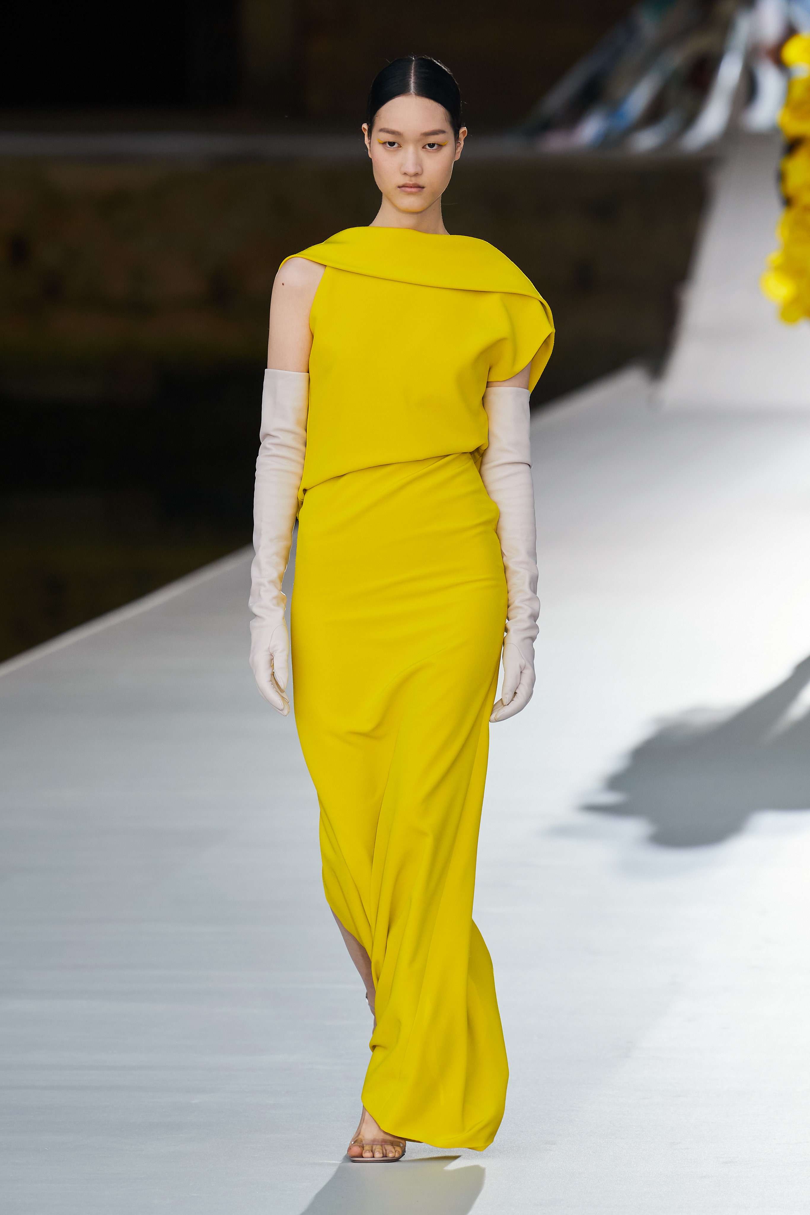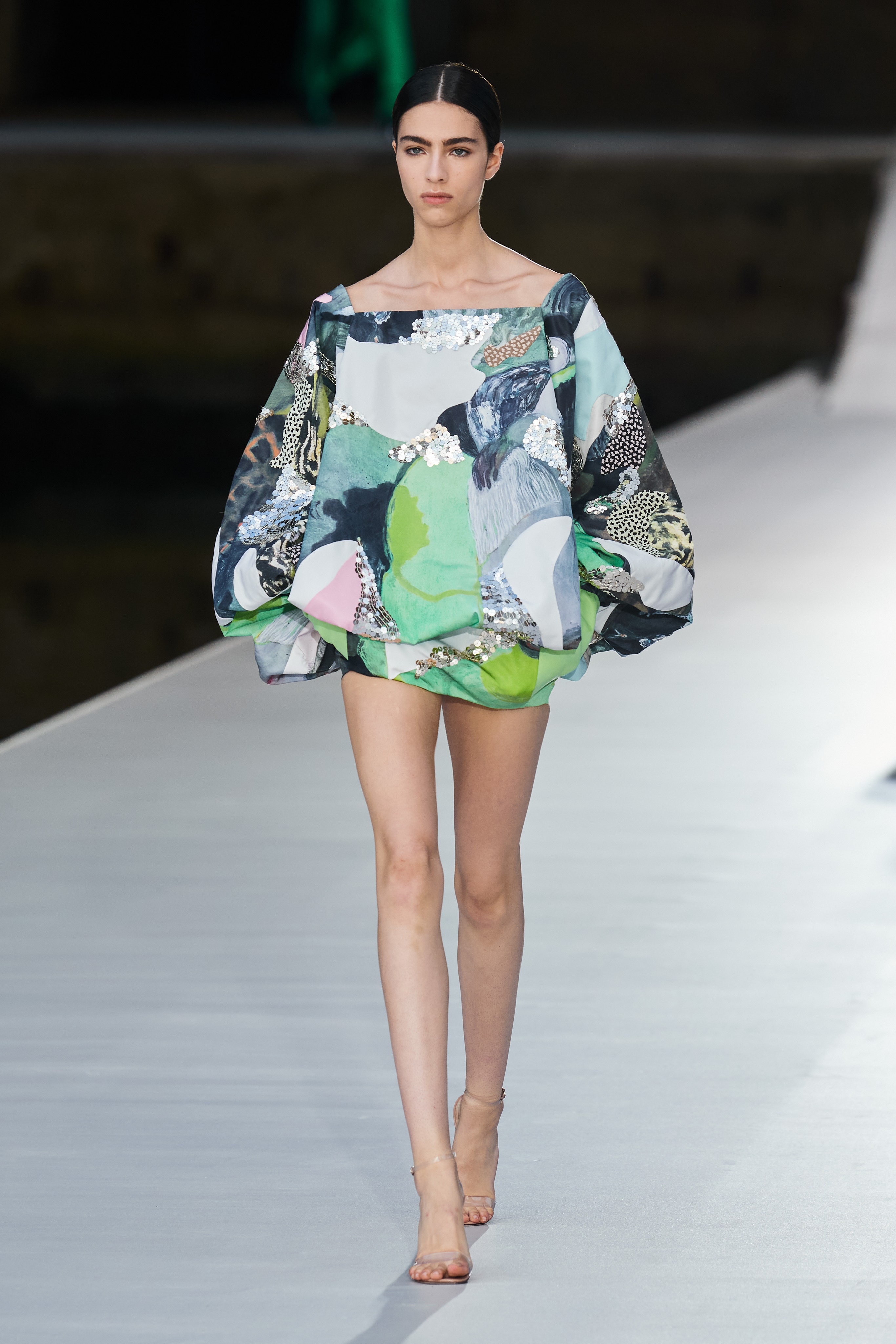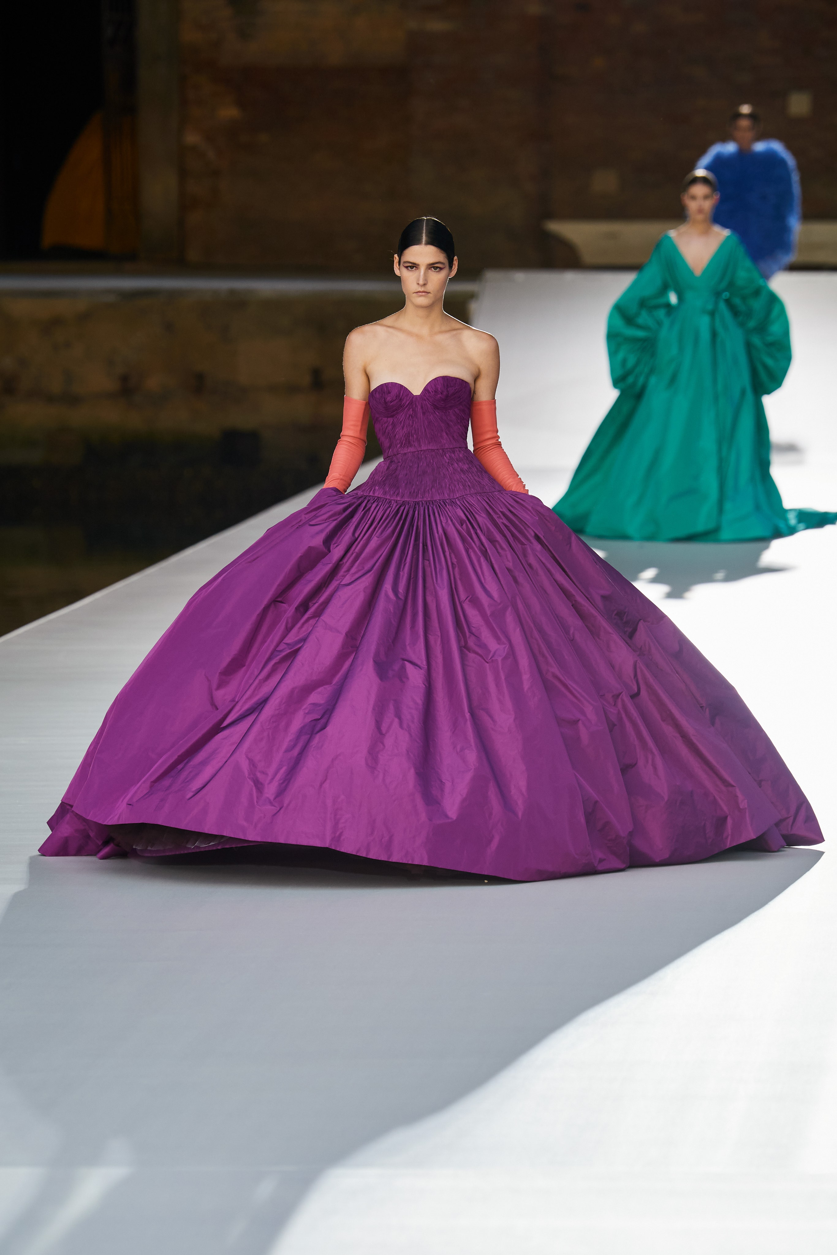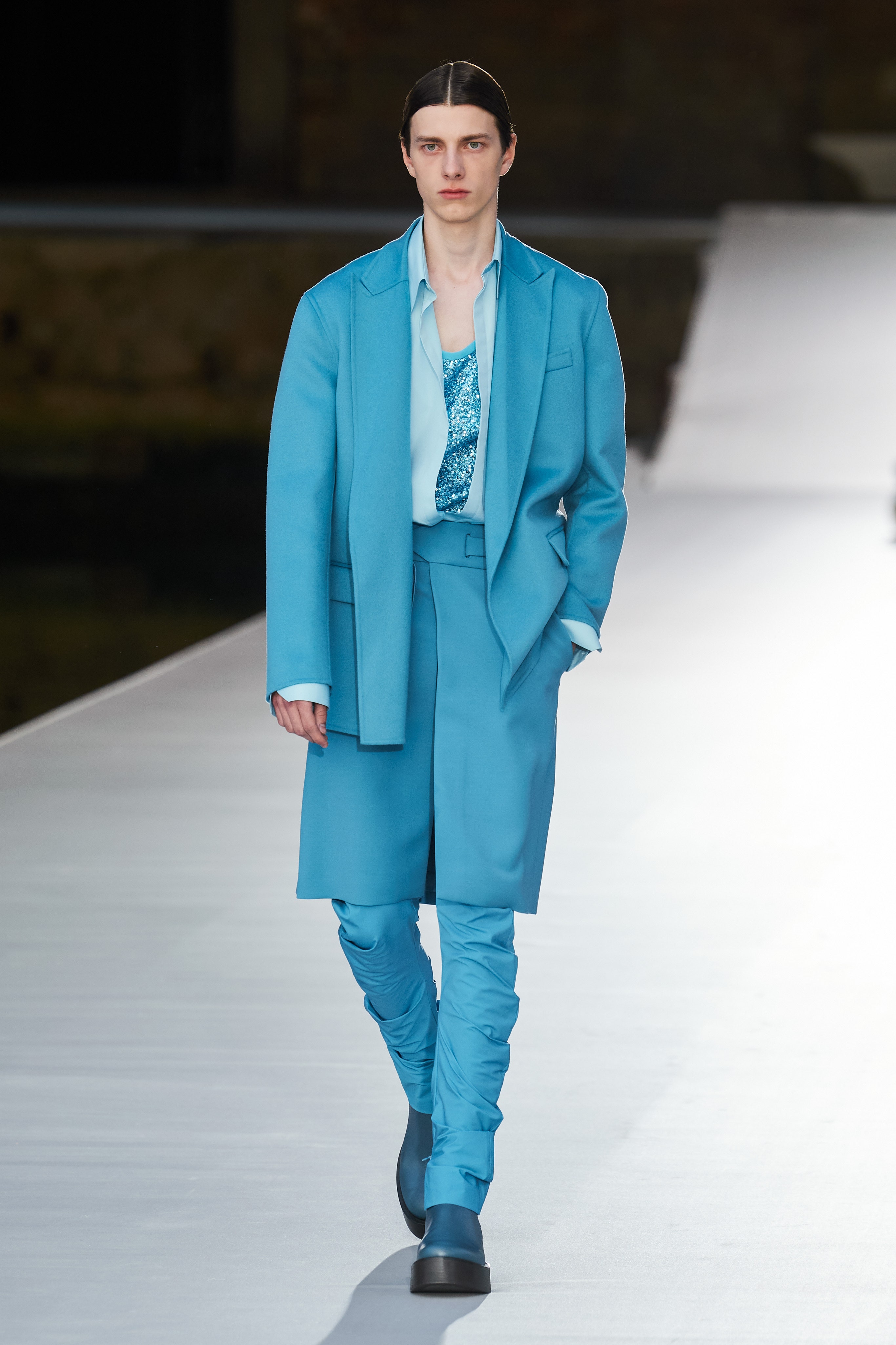 Так, в предзакатном свете, среди гостей в белых одеждах, появились модели в бальных платьях исключительных оттенков, которые так любит Пиччоли. Цветовая игра затронула и мужскую линию коллекции. Винно-бордовые пончо были перекинуты через плечи поверх белых сорочек, заправленных в алые брюки, блестящие сиреневые накидки прикрывали лавандовые мужские топы, платья оттенков розового фламинго, аквамарина, лазурита и календулы, а мужские костюмы чередовались от берилловых до драгоценно-аметистовых. Пьерпаоло так же с легкостью наслоил мужские юбки поверх брюк, короткие пальто балмакааны — поверх рубашек и блестящих маек. Вереница образов также была насыщена объемными платьями-баллонами цвета какао, драпированными нарядами и шубами из текстильных лепестков, напоминающих цветы календулы. Одним из самых величественных стало платье с крупной аппликацией на груди, расписанное абстрактными мотивами. Дизайнер дополнил образы неизменными театральными перчатками выше локтя, "невидимыми" босоножками и экстравагантными туфлями Dr. Martens. Филип Трейси создал для Valentino разлапистые шляпы из перьев, которые двигались подобно медузам при ходьбе. В силуэтах Пиччоли, как и ранее, угадывается деликатный и негласный оммаж скульптурным платьям итальянского модельера Роберто Капуччи и творениям самого Валентино.