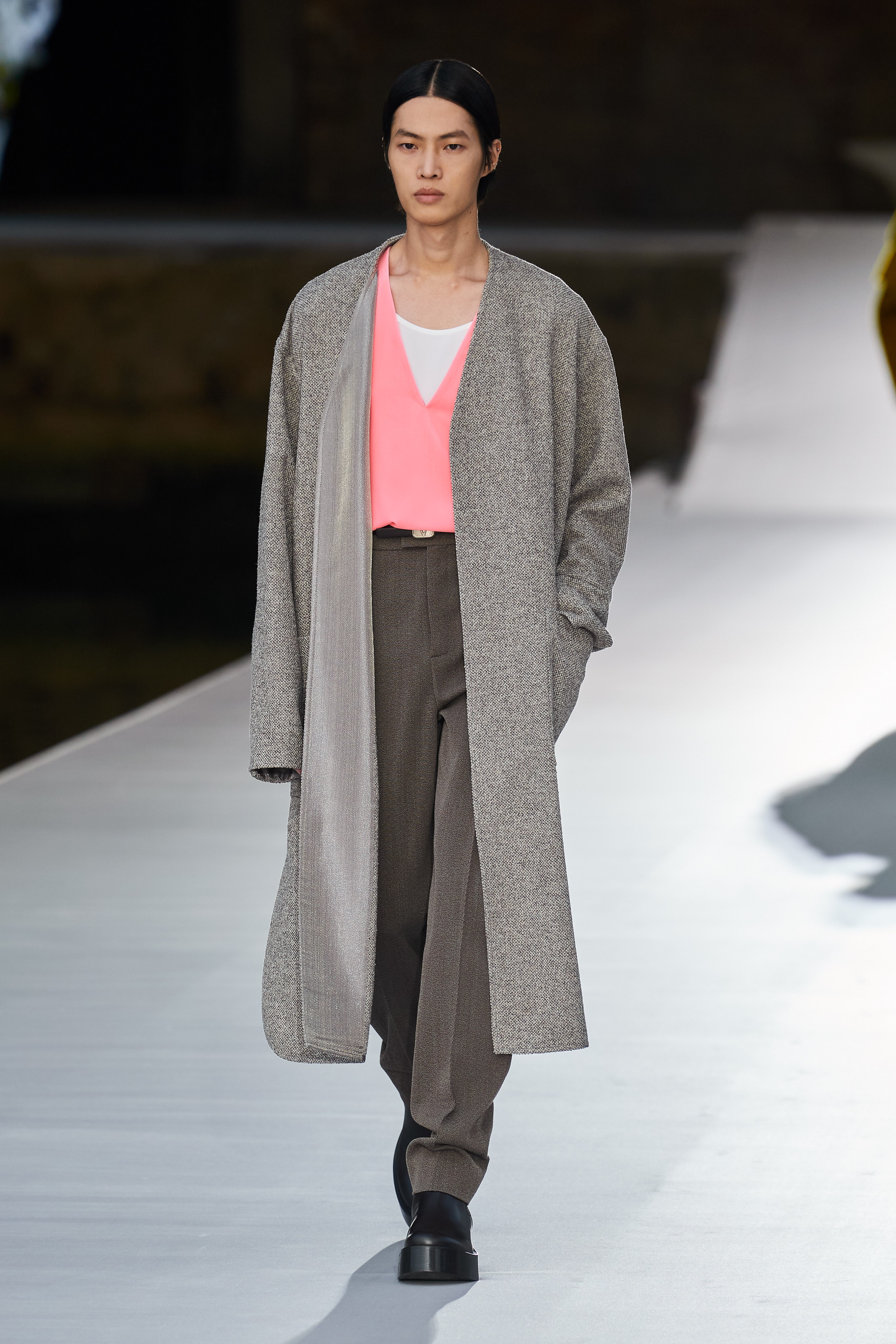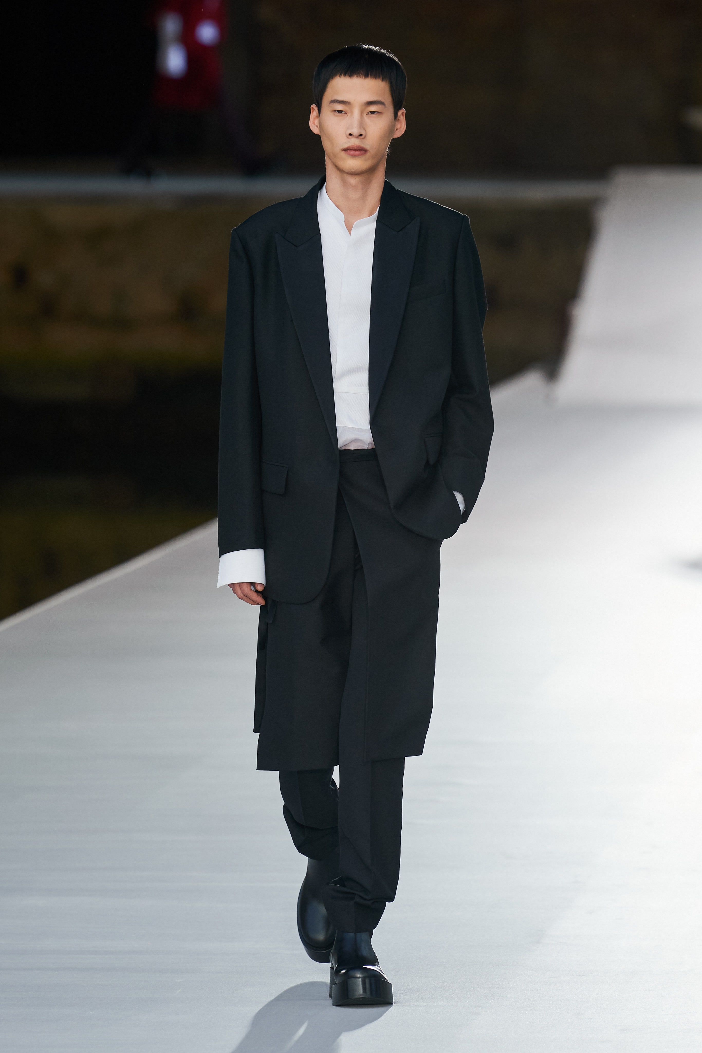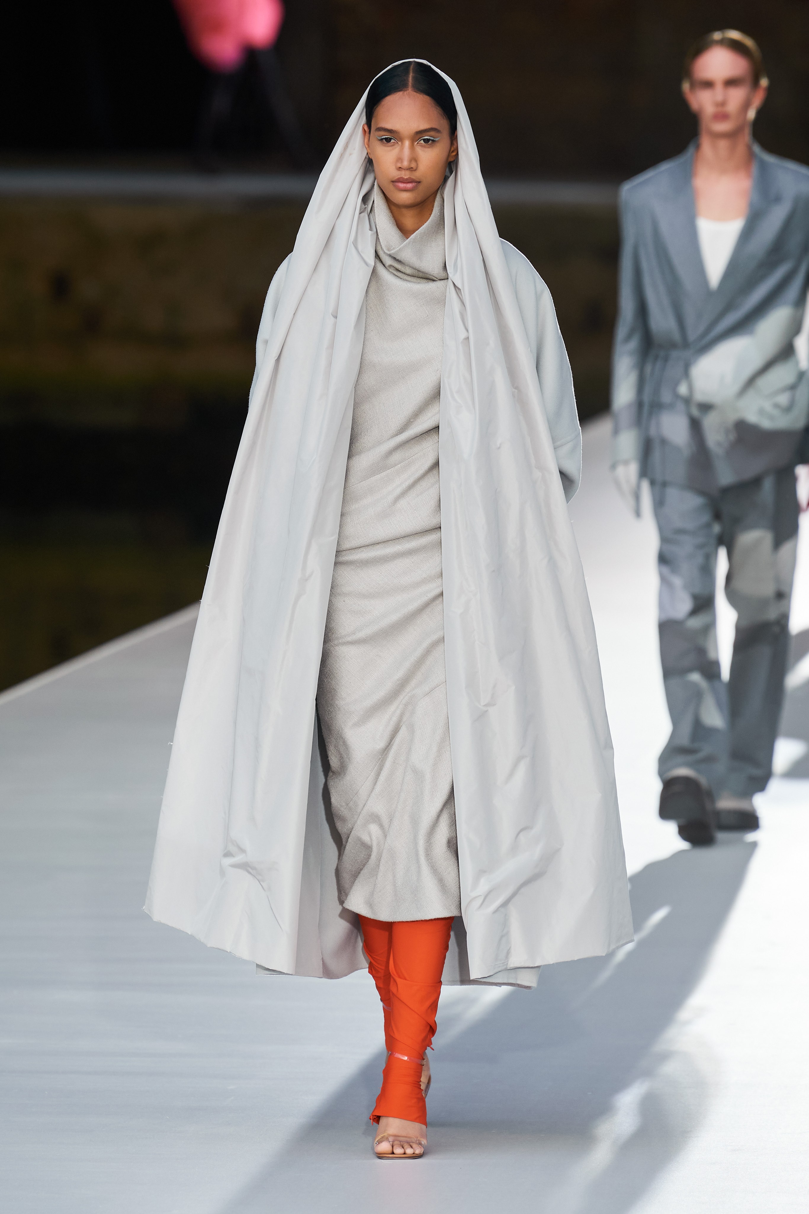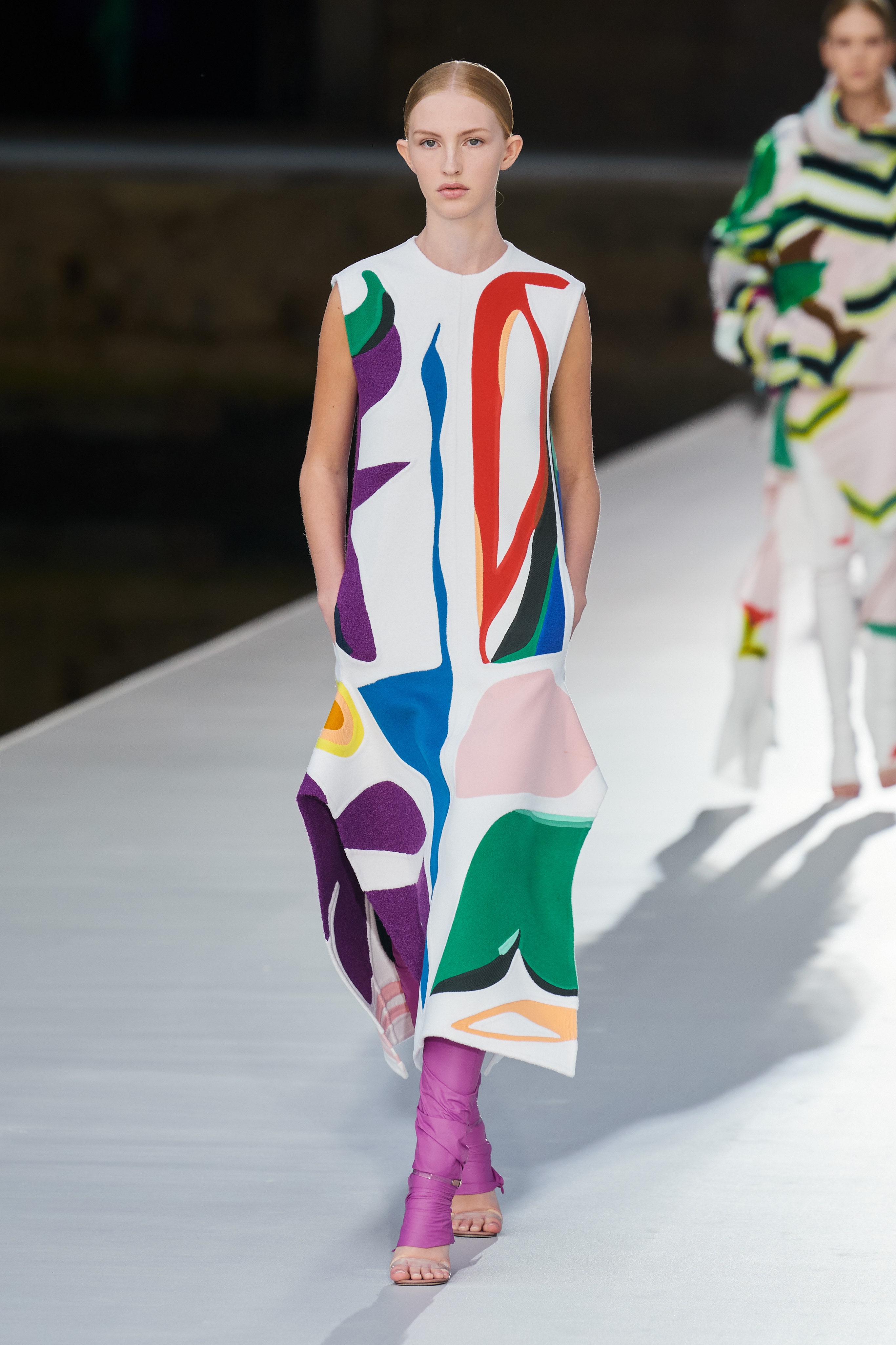 Так, в предзакатном свете, среди гостей в белых одеждах, появились модели в бальных платьях исключительных оттенков, которые так любит Пиччоли. Цветовая игра затронула и мужскую линию коллекции. Винно-бордовые пончо были перекинуты через плечи поверх белых сорочек, заправленных в алые брюки, блестящие сиреневые накидки прикрывали лавандовые мужские топы, платья оттенков розового фламинго, аквамарина, лазурита и календулы, а мужские костюмы чередовались от берилловых до драгоценно-аметистовых. Пьерпаоло так же с легкостью наслоил мужские юбки поверх брюк, короткие пальто балмакааны — поверх рубашек и блестящих маек. Вереница образов также была насыщена объемными платьями-баллонами цвета какао, драпированными нарядами и шубами из текстильных лепестков, напоминающих цветы календулы. Одним из самых величественных стало платье с крупной аппликацией на груди, расписанное абстрактными мотивами. Дизайнер дополнил образы неизменными театральными перчатками выше локтя, "невидимыми" босоножками и экстравагантными туфлями Dr. Martens. Филип Трейси создал для Valentino разлапистые шляпы из перьев, которые двигались подобно медузам при ходьбе. В силуэтах Пиччоли, как и ранее, угадывается деликатный и негласный оммаж скульптурным платьям итальянского модельера Роберто Капуччи и творениям самого Валентино.