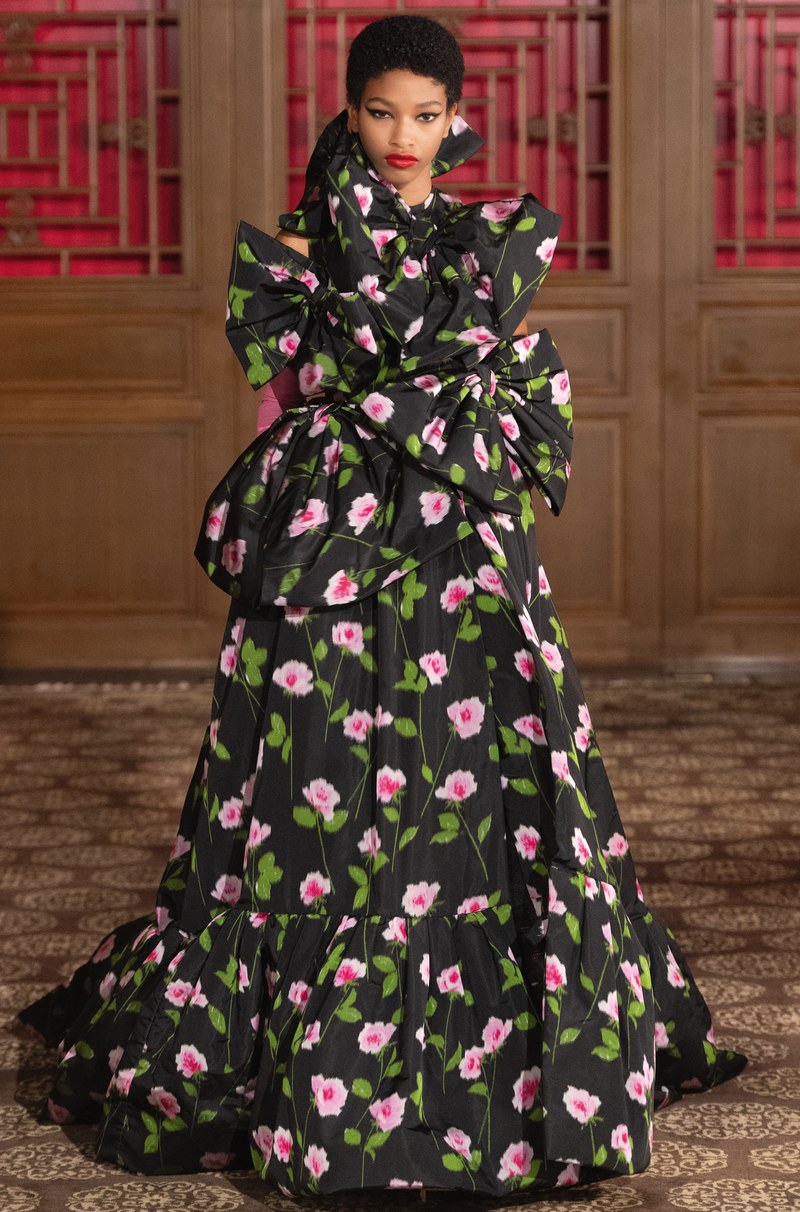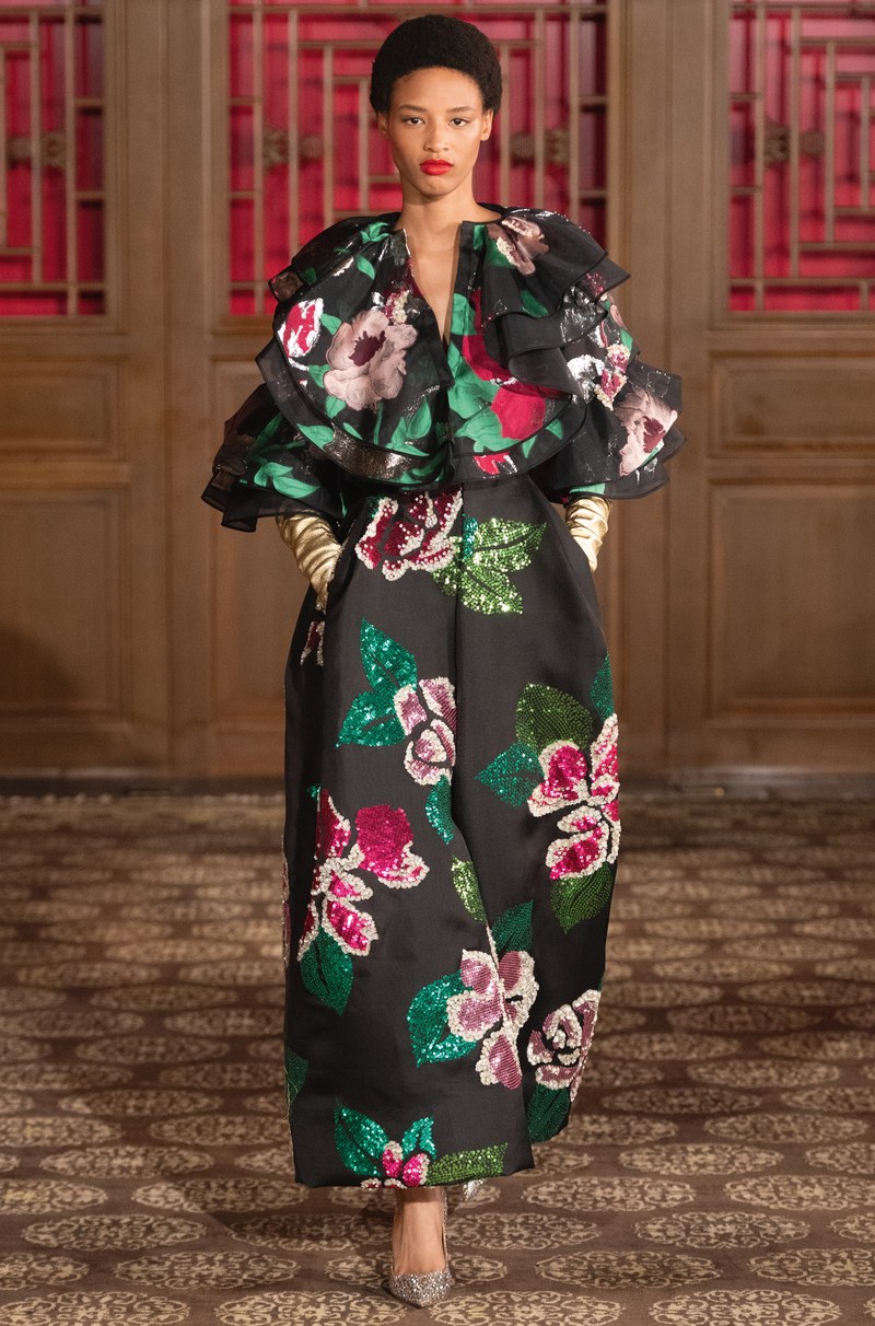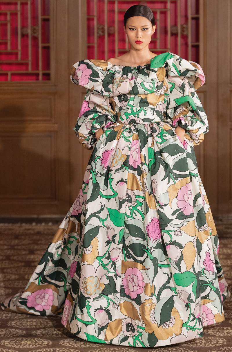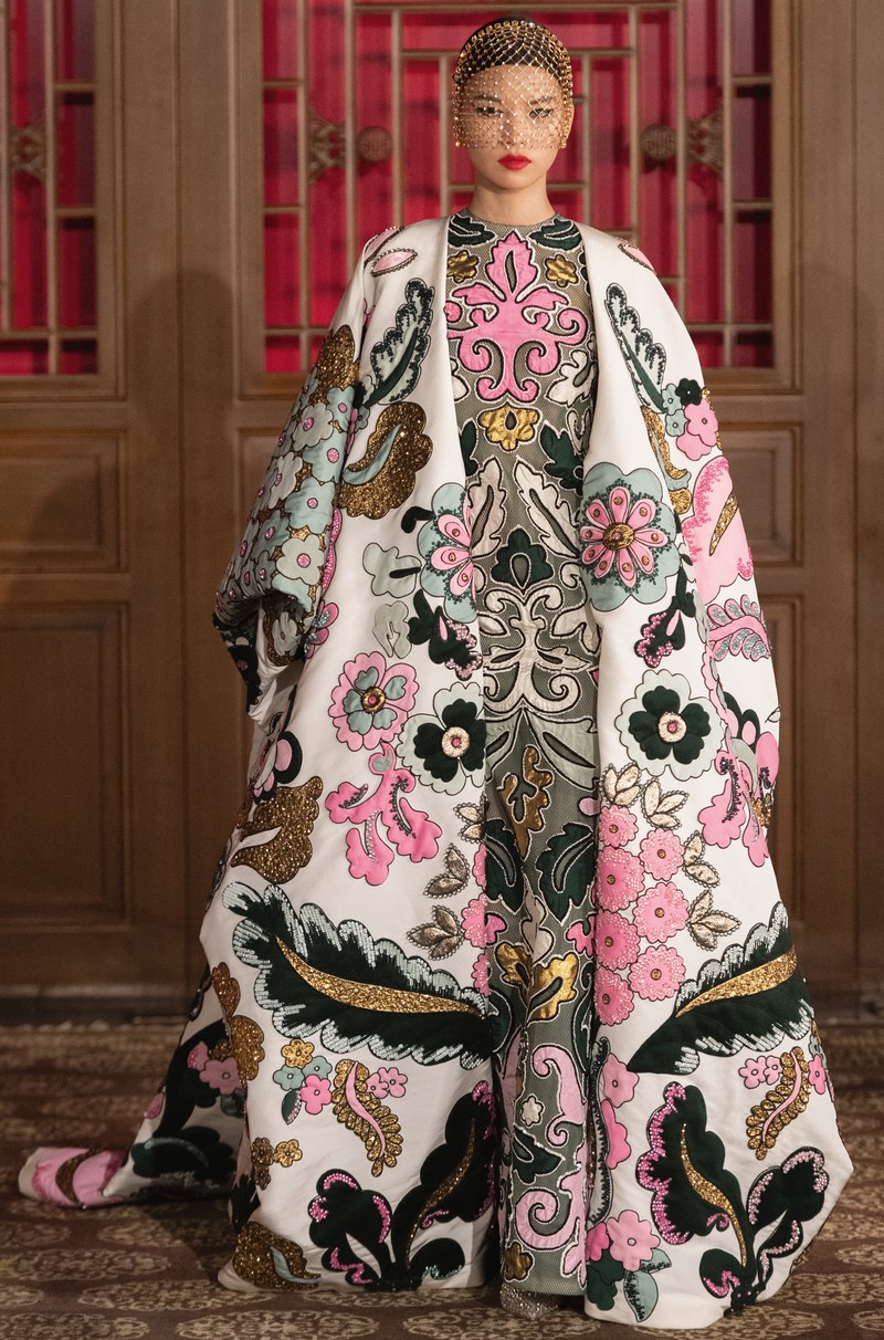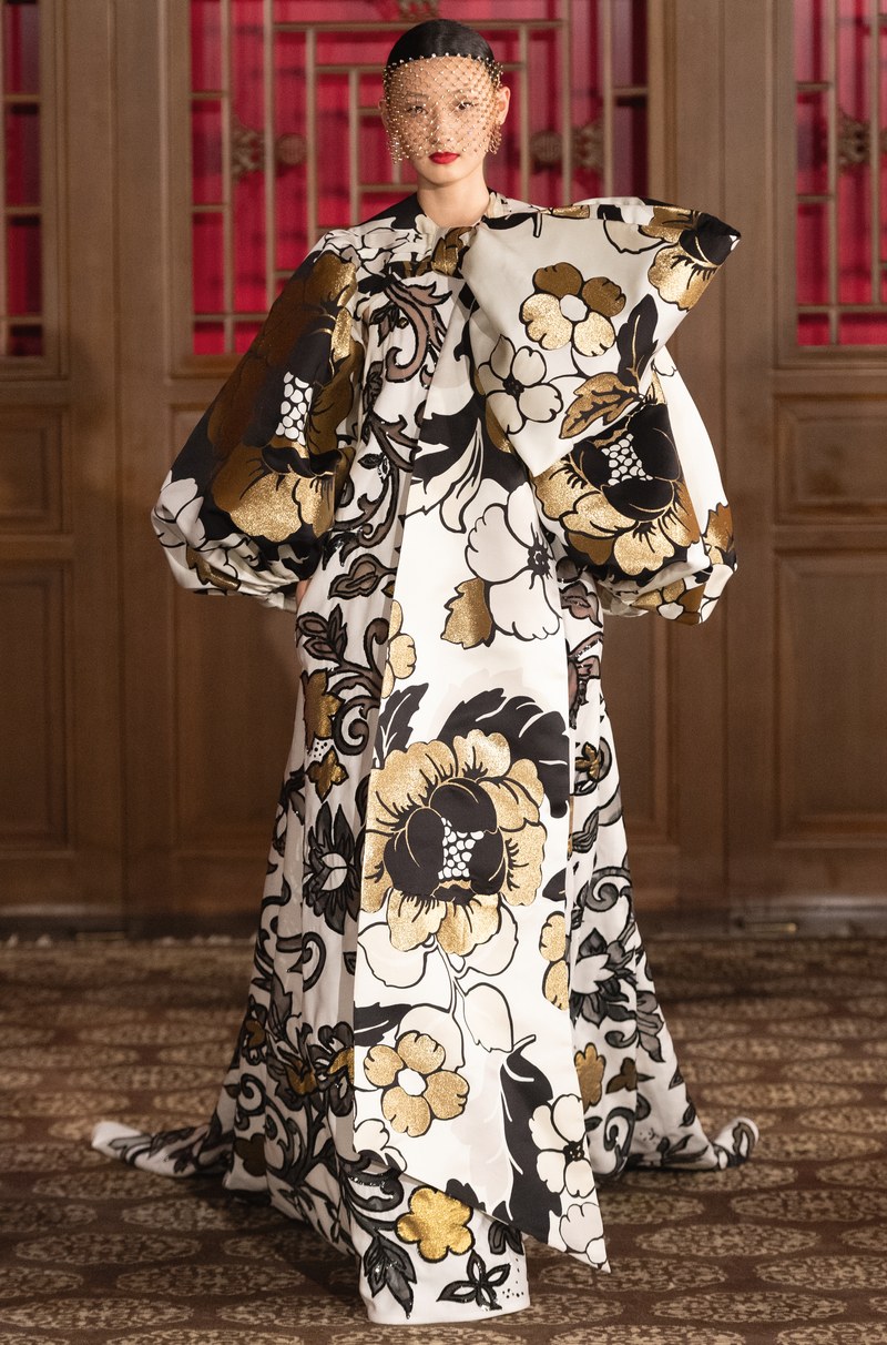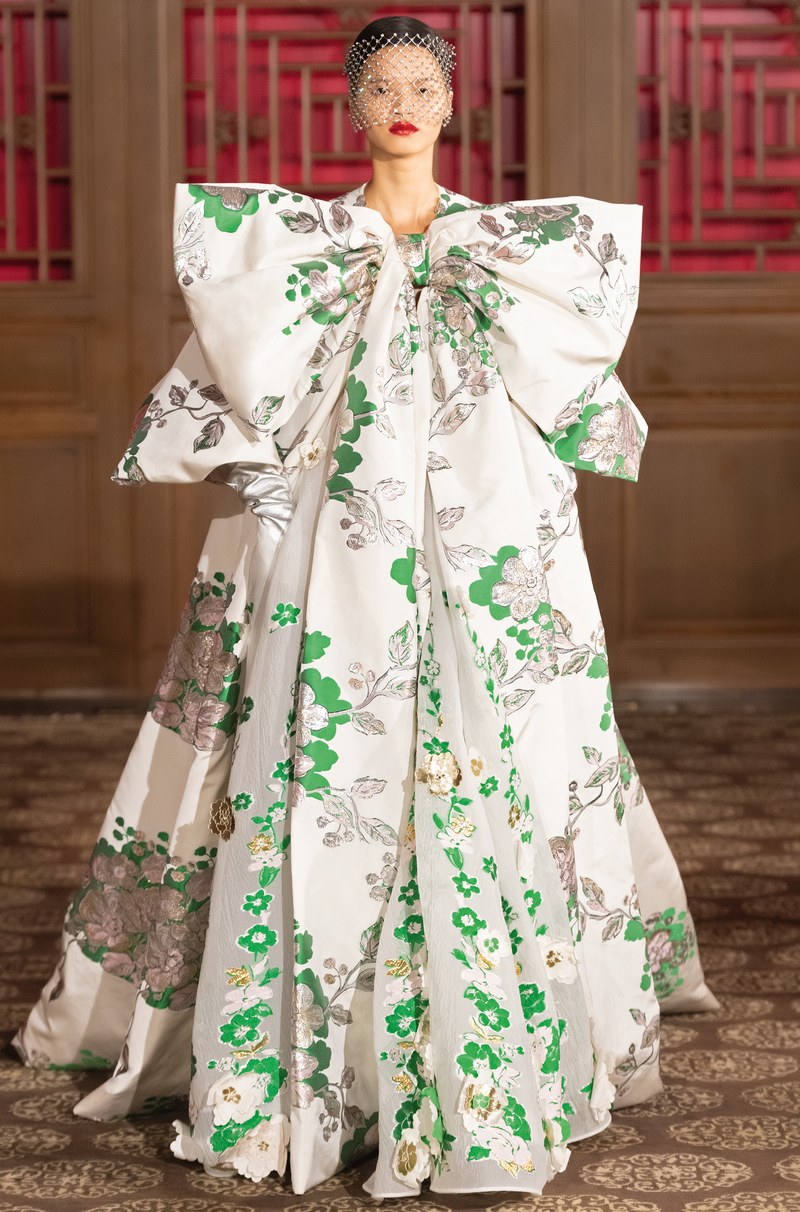 В коллекцию вошли гиперобъемные платья, кейпы, собранные из множества бантов, многоярусные наряды из сотен рюшей и оборок, а также брючные комплекты и пальто в романтичных принтах, напоминающих орнаменты эпохи Возрождения.