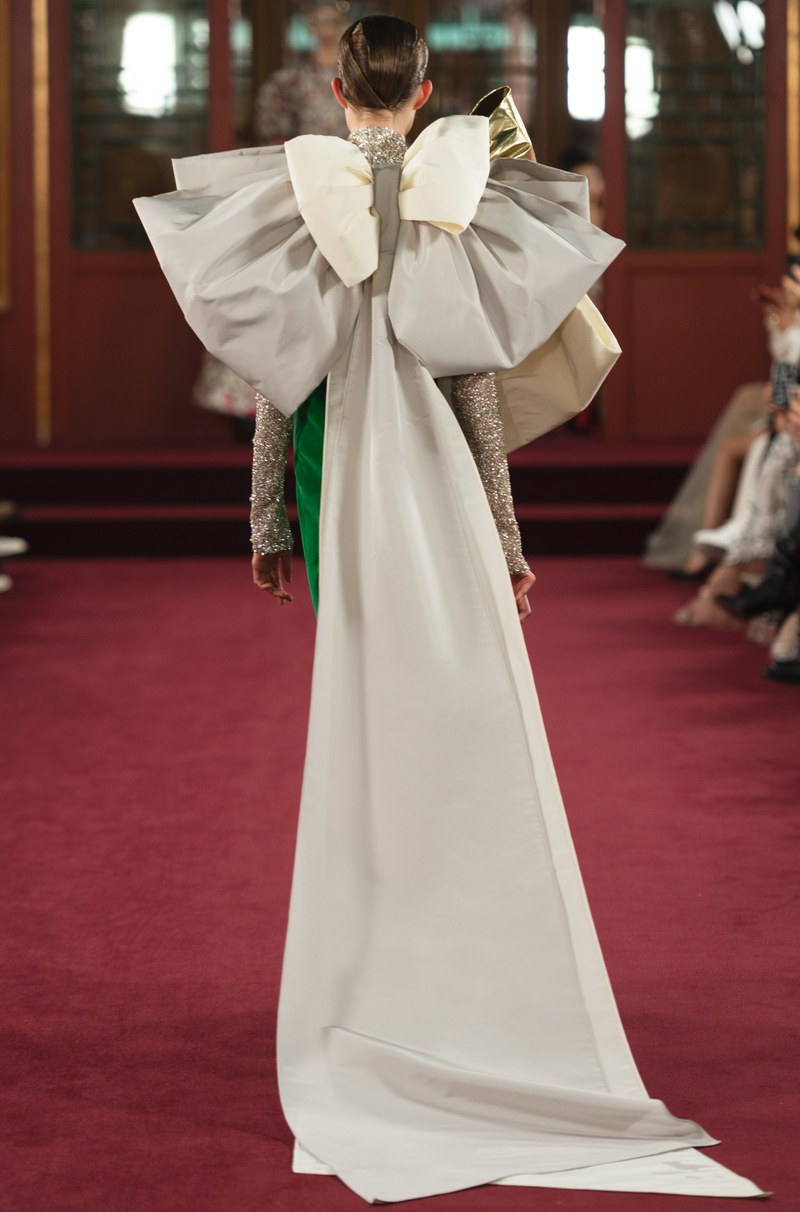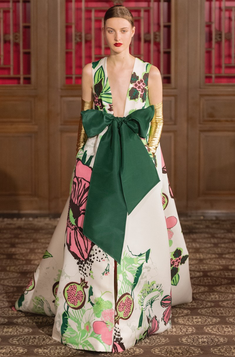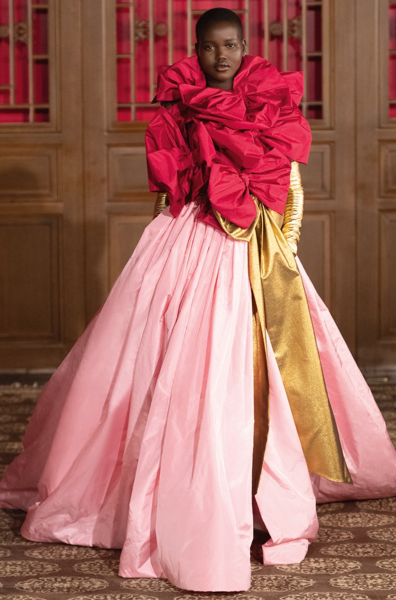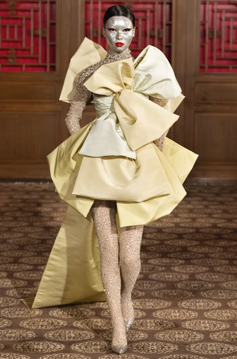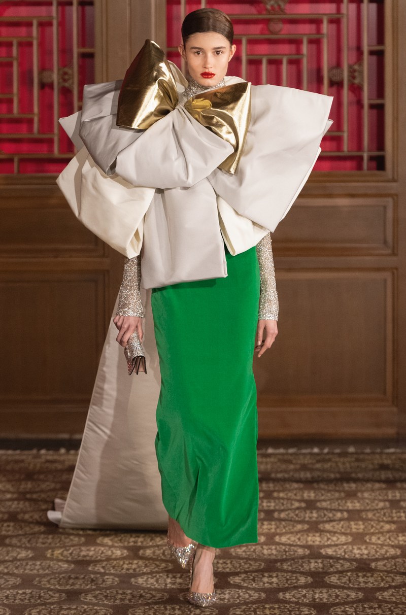 В коллекцию вошли гиперобъемные платья, кейпы, собранные из множества бантов, многоярусные наряды из сотен рюшей и оборок, а также брючные комплекты и пальто в романтичных принтах, напоминающих орнаменты эпохи Возрождения.