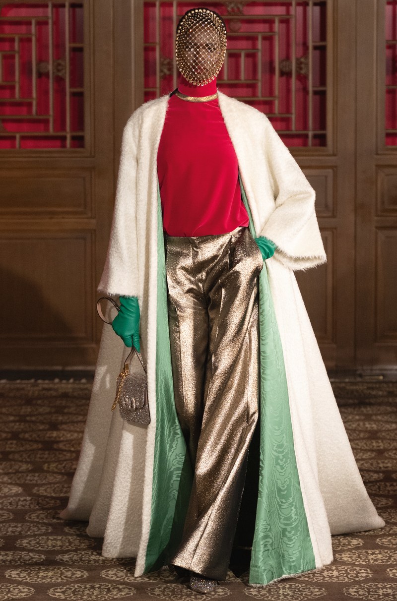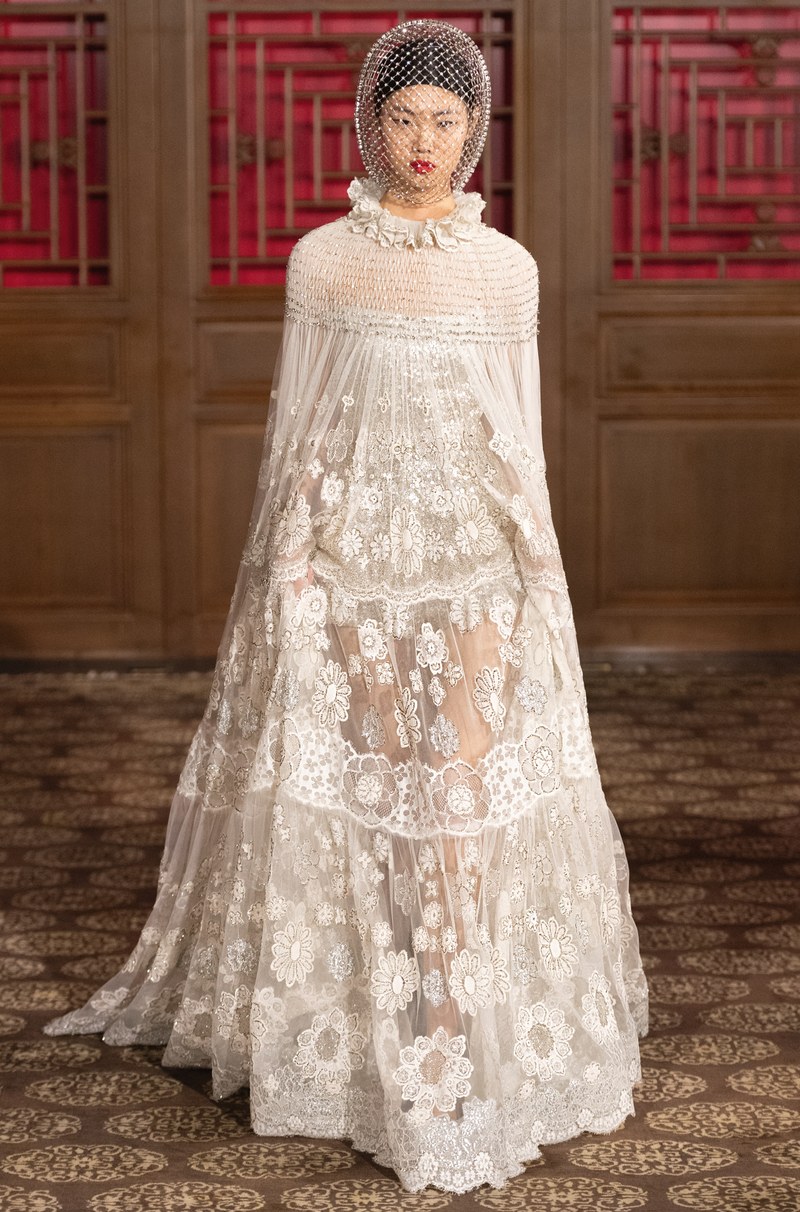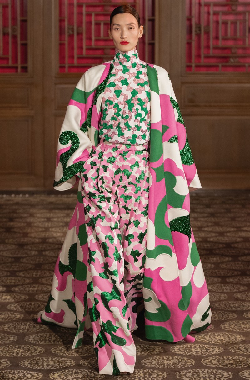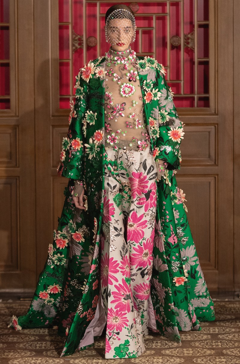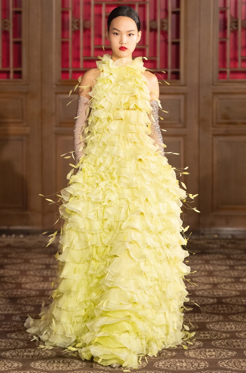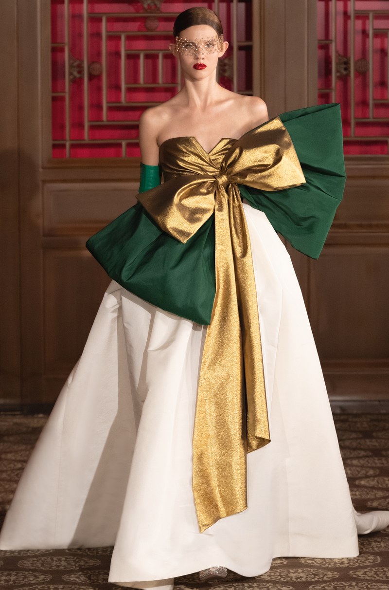 В коллекцию вошли гиперобъемные платья, кейпы, собранные из множества бантов, многоярусные наряды из сотен рюшей и оборок, а также брючные комплекты и пальто в романтичных принтах, напоминающих орнаменты эпохи Возрождения.