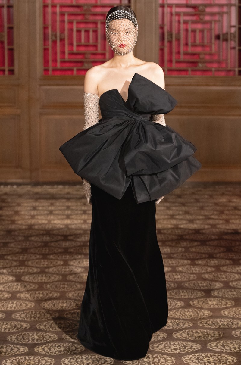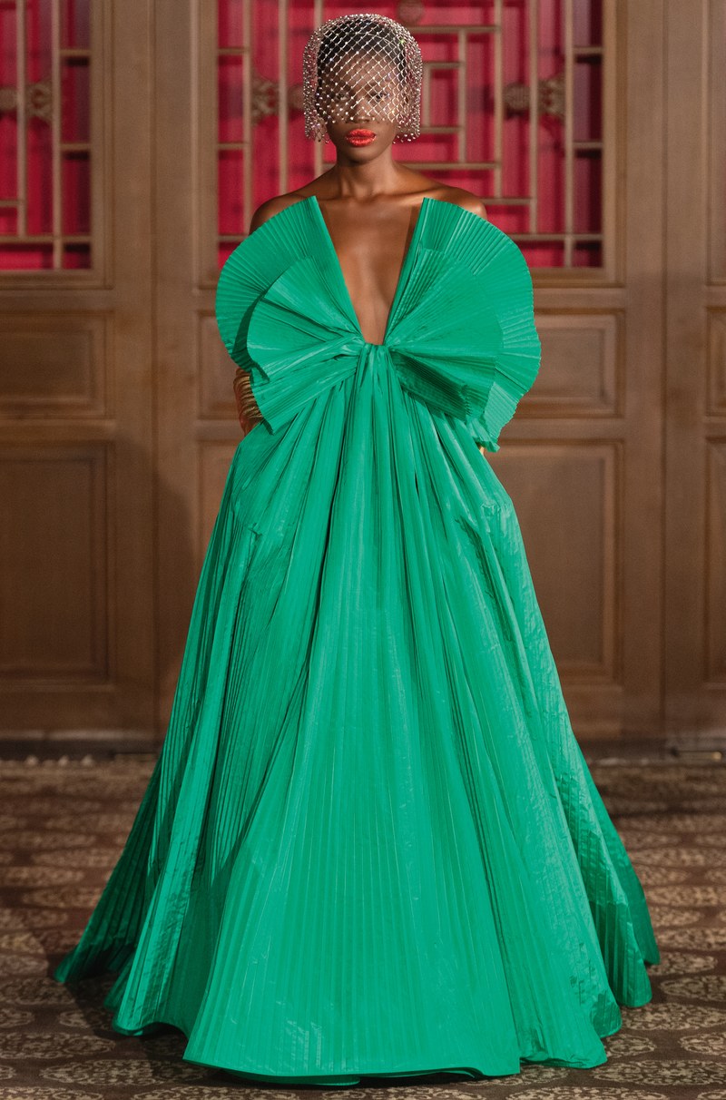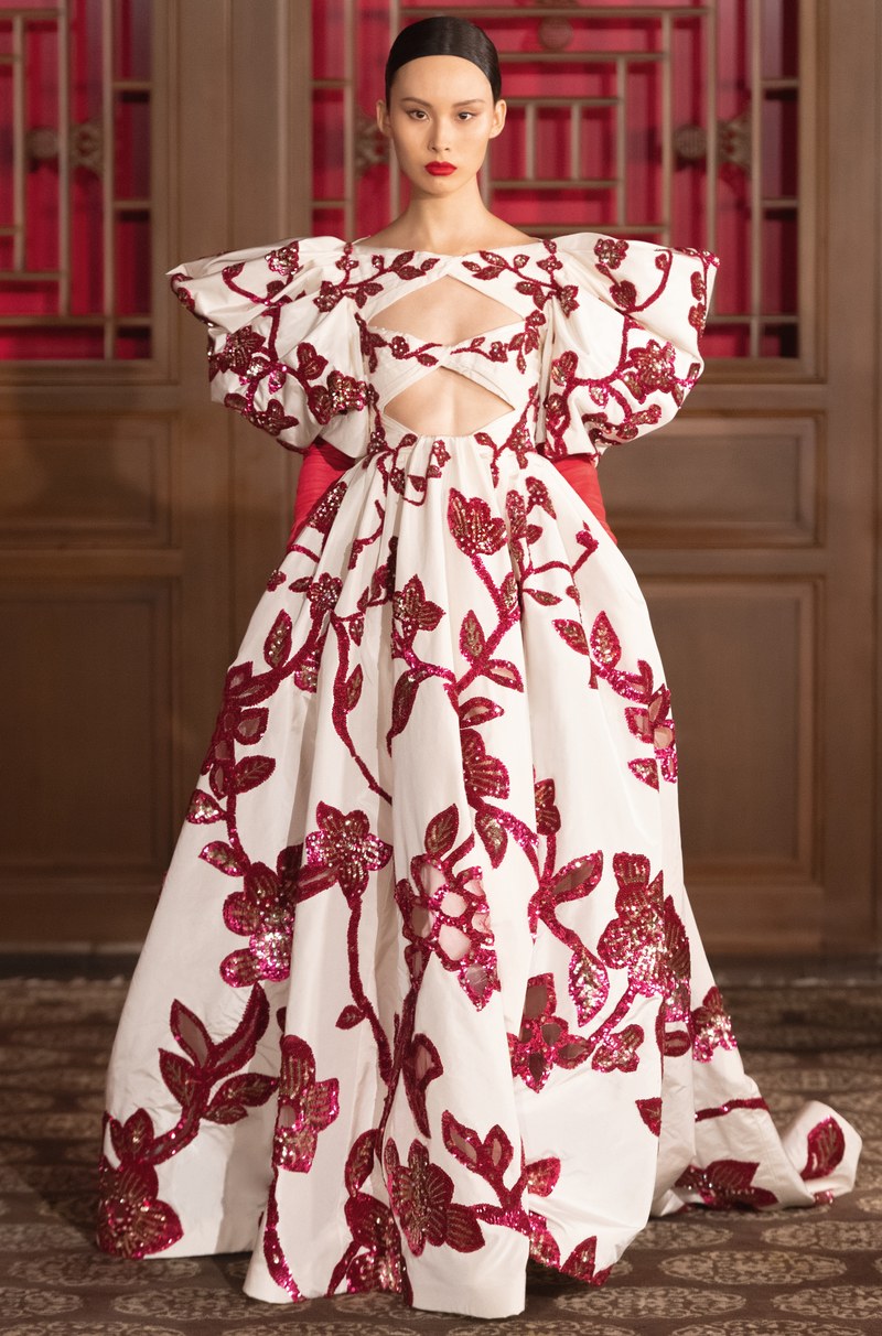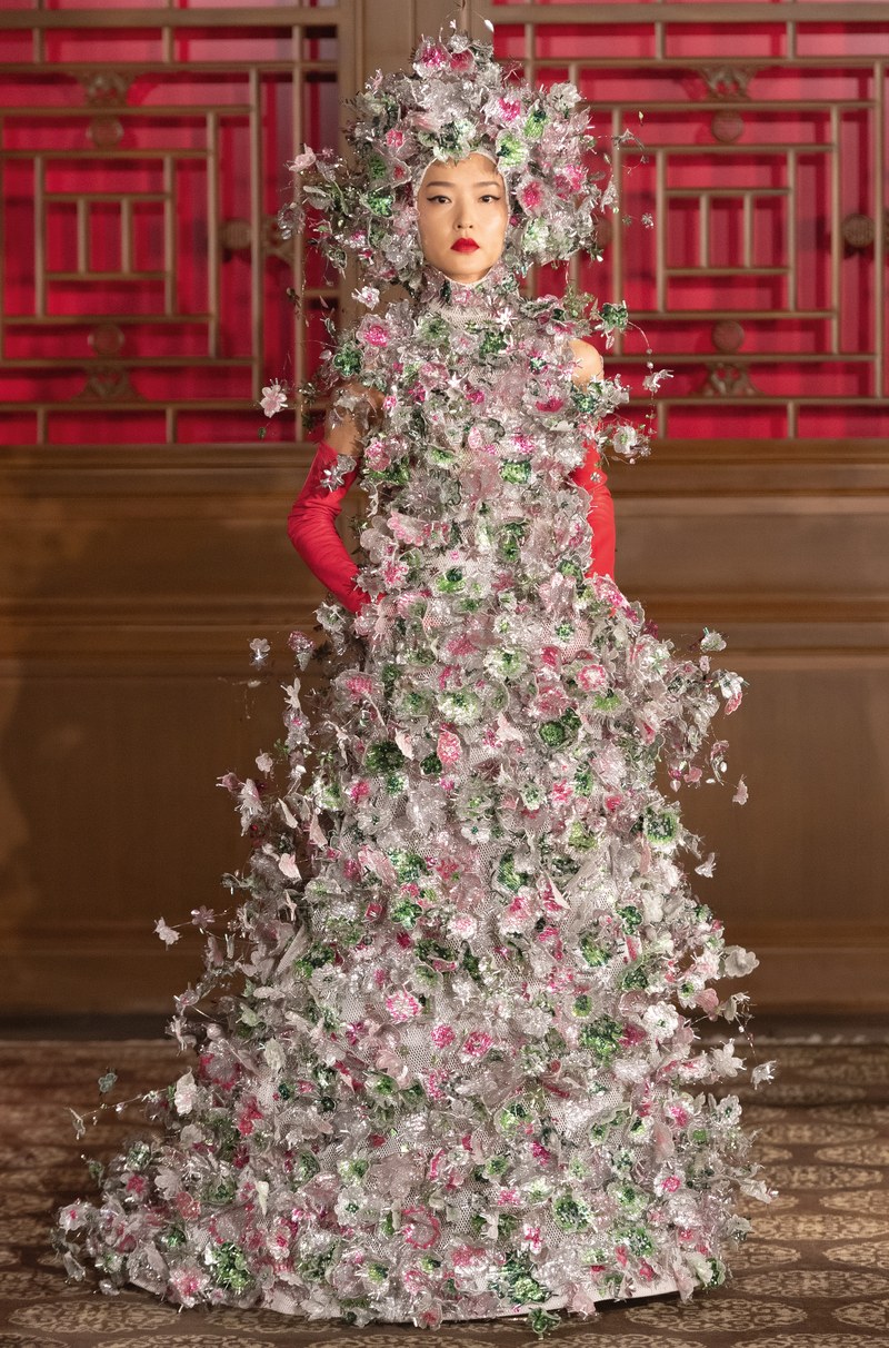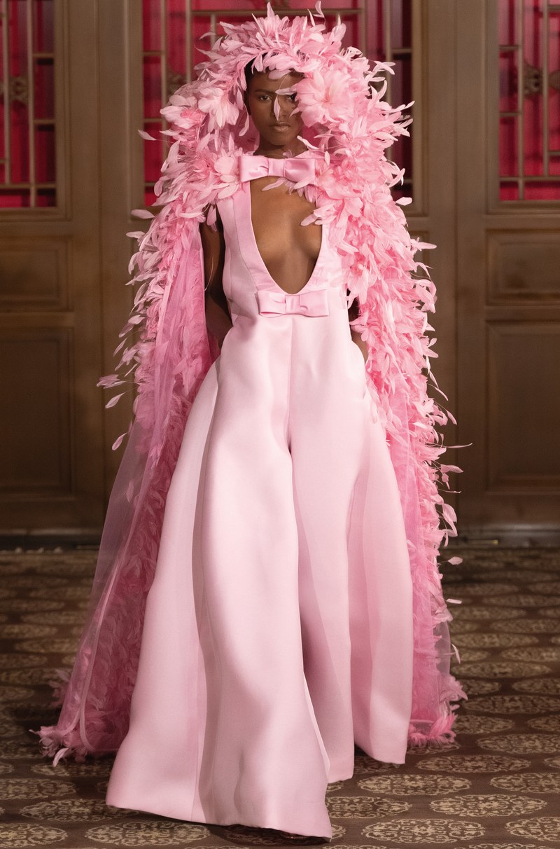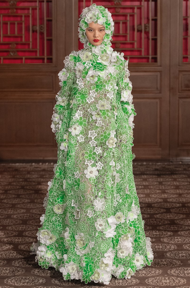 В коллекцию вошли гиперобъемные платья, кейпы, собранные из множества бантов, многоярусные наряды из сотен рюшей и оборок, а также брючные комплекты и пальто в романтичных принтах, напоминающих орнаменты эпохи Возрождения.