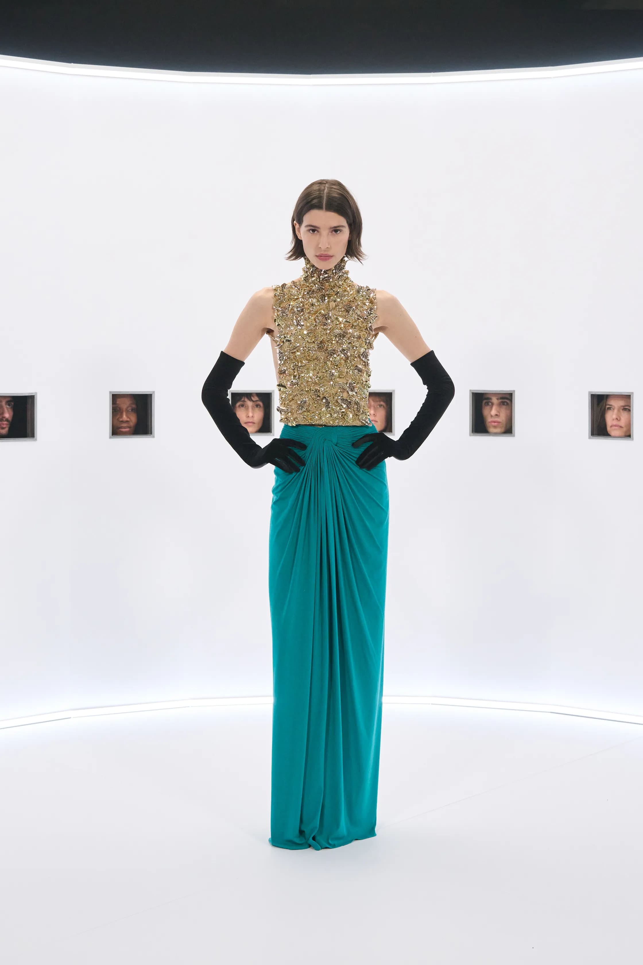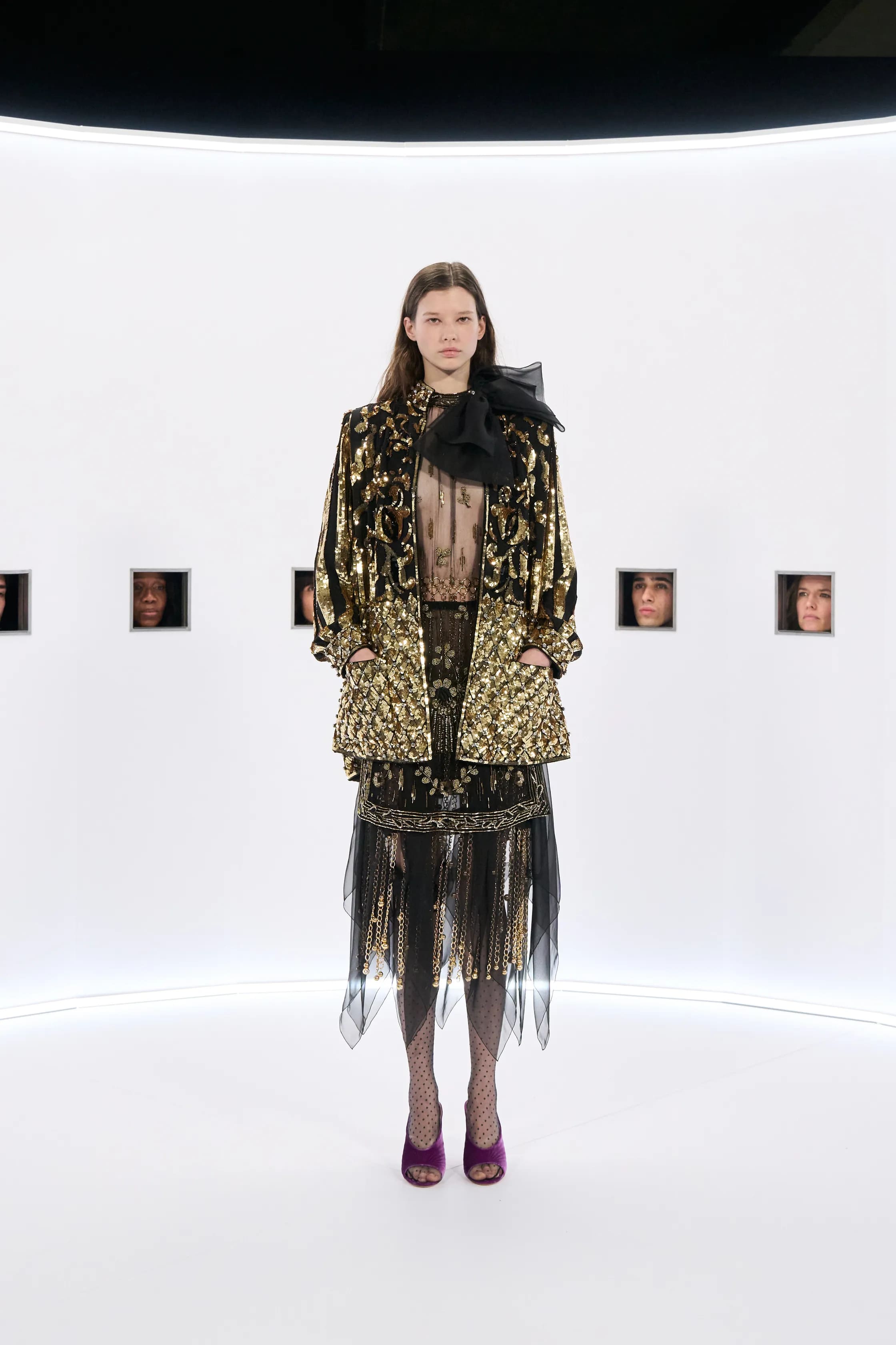 Ода кінематографу, до речі, близького для самого Мікеле, який проводив один із показів для Gucci в Голлівуді, продовжилася й в образах з нової кутюрної колекції. Сукні в оксамиті та шовку мали глибокі декольте, були розшиті камінням та лелітками чи складно драпіровані. Частину з образів прикрашало пір’я — не лише на одязі, але й на богемних аксесуарах, що імітували хвости павичів.