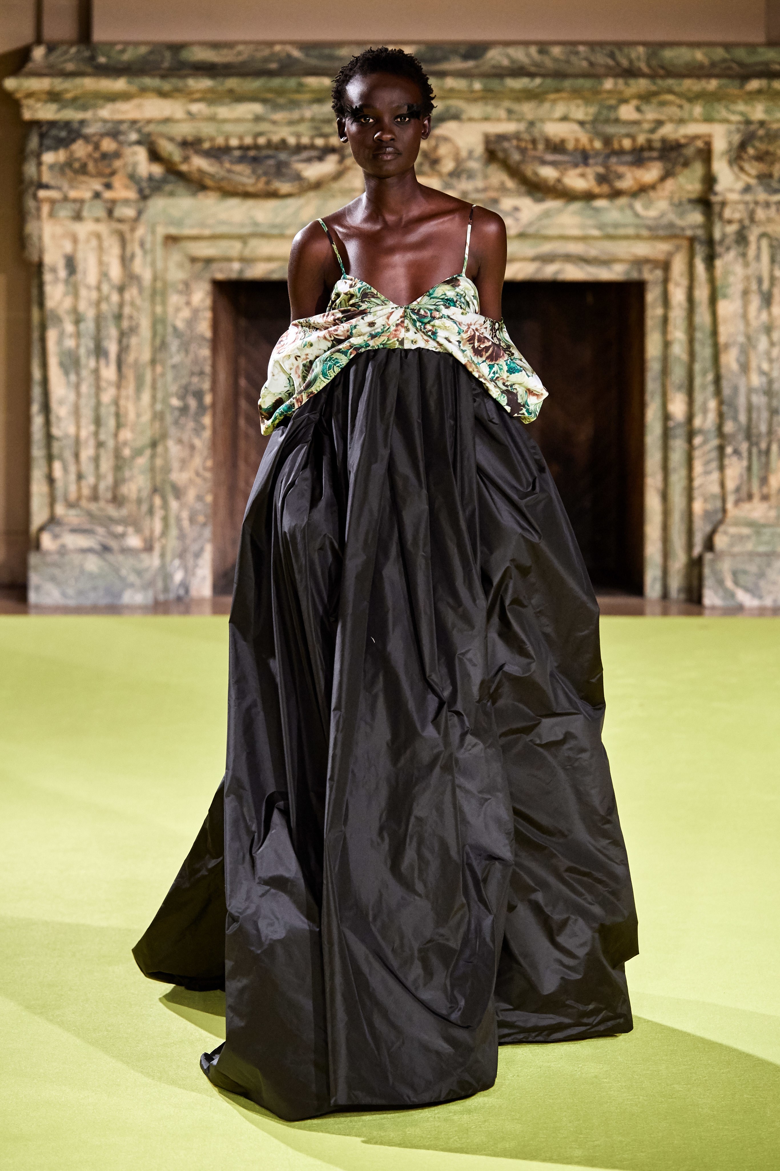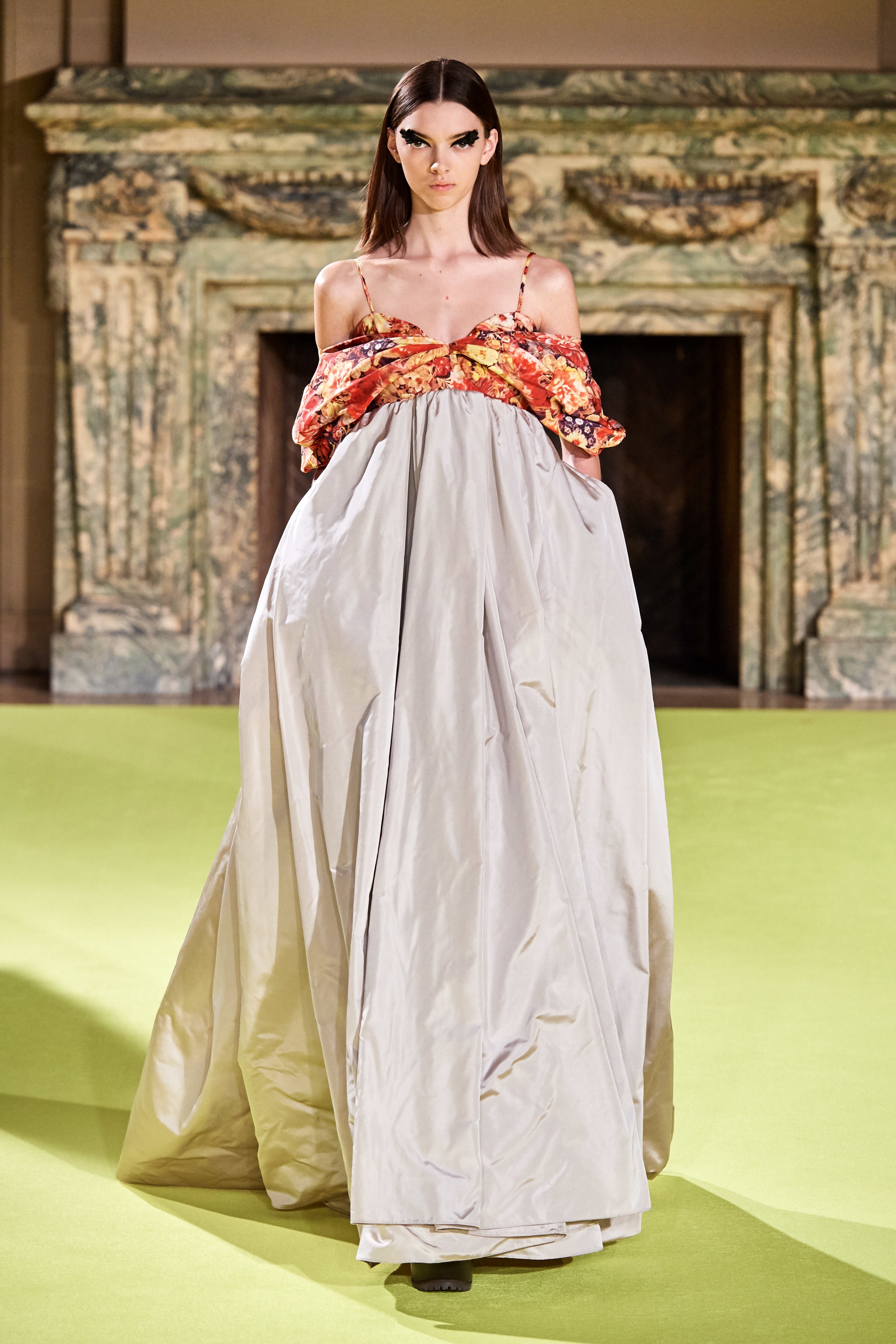 Актуальные тренды: крупные цветочные принты, "голые" платья и топы, объемные рукава, корсеты, пышные оборки, театральные перчатки.