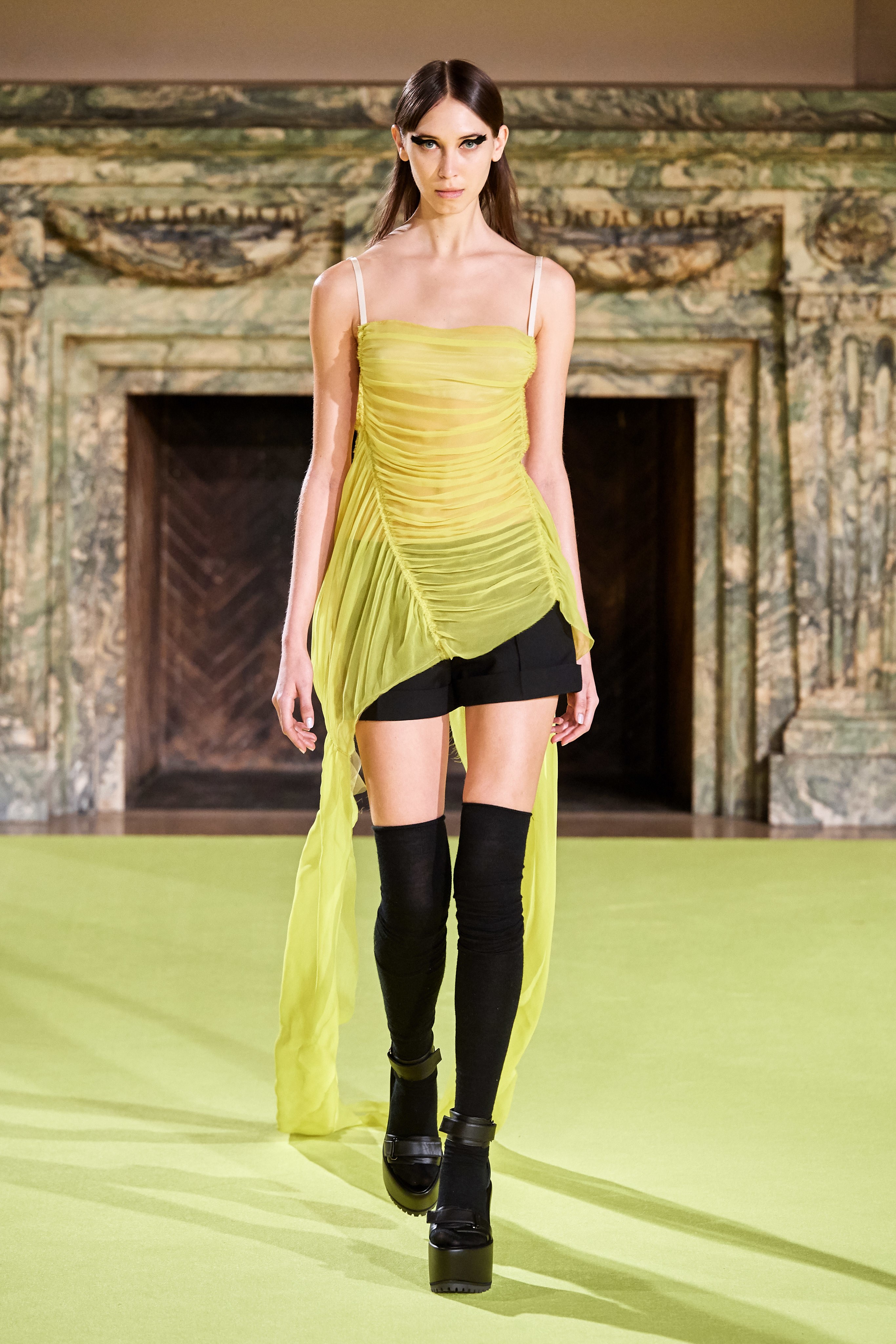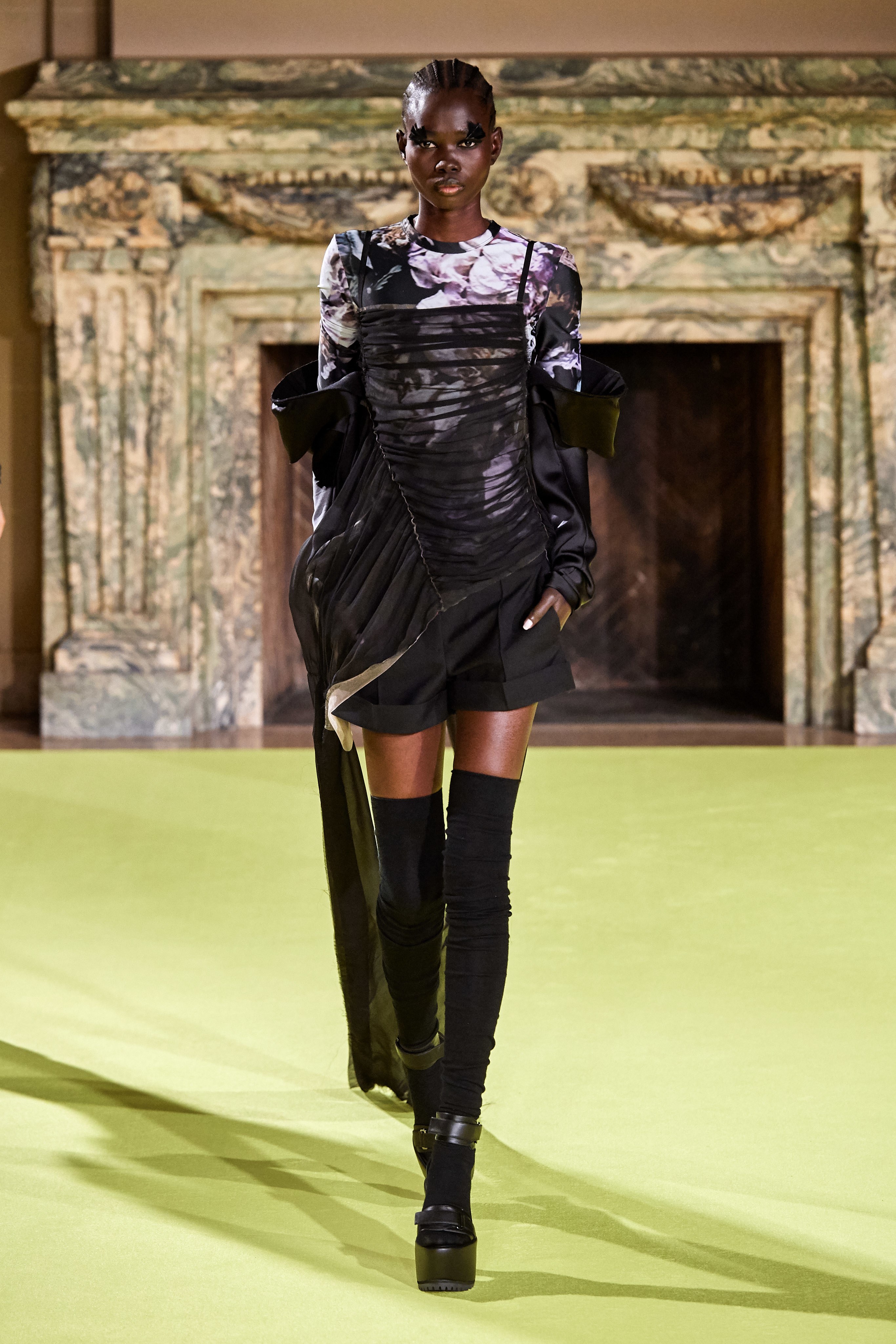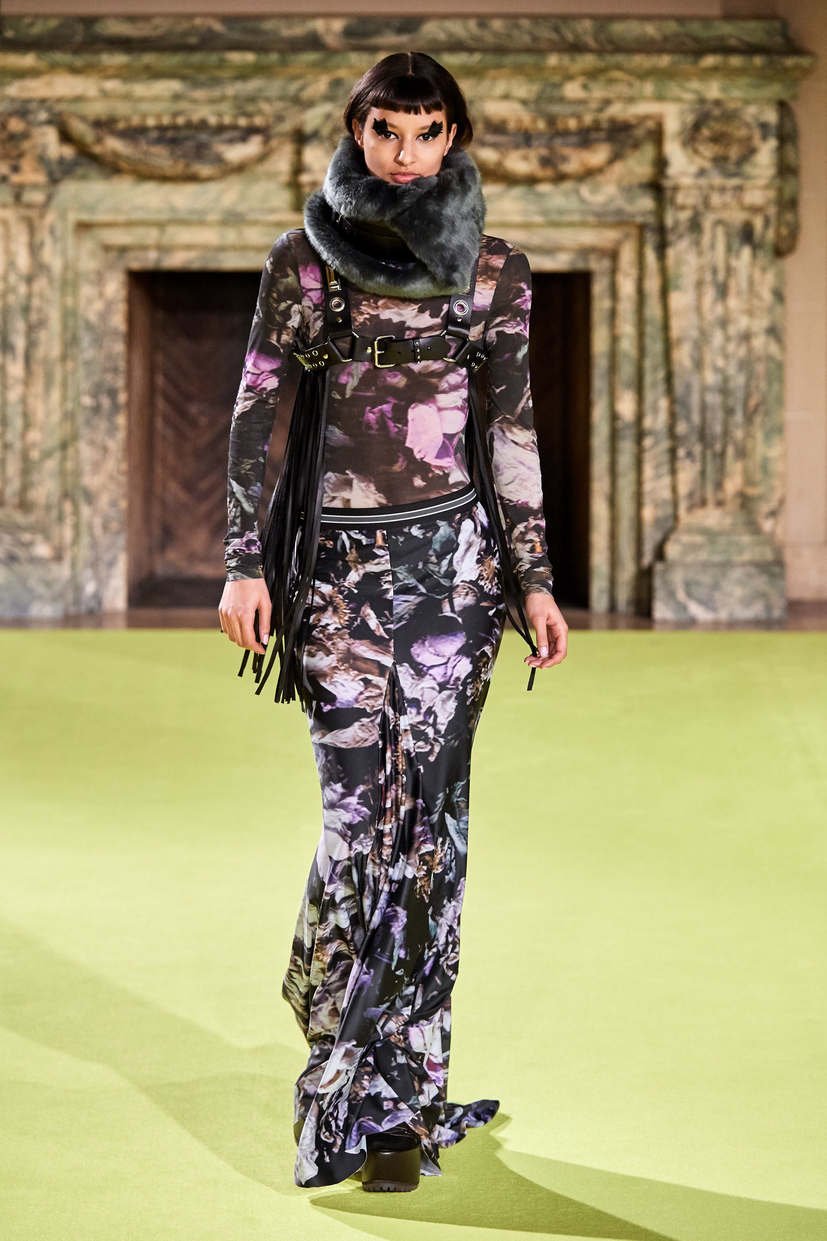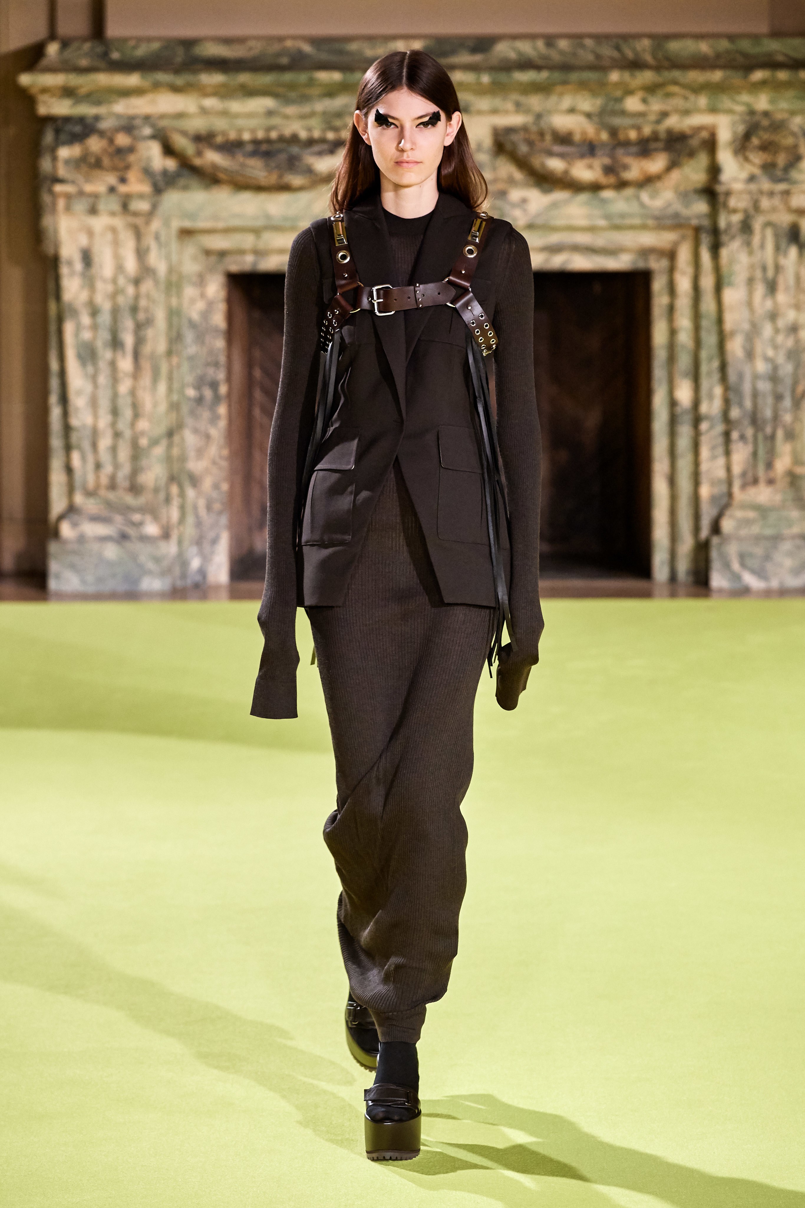 На что обратить внимание: прозрачное платье поверх топа и шорт, кожаные харнессы-сбруи поверх строгих костюмов, сочетание нежных цветов и брутальных аксессуаров.