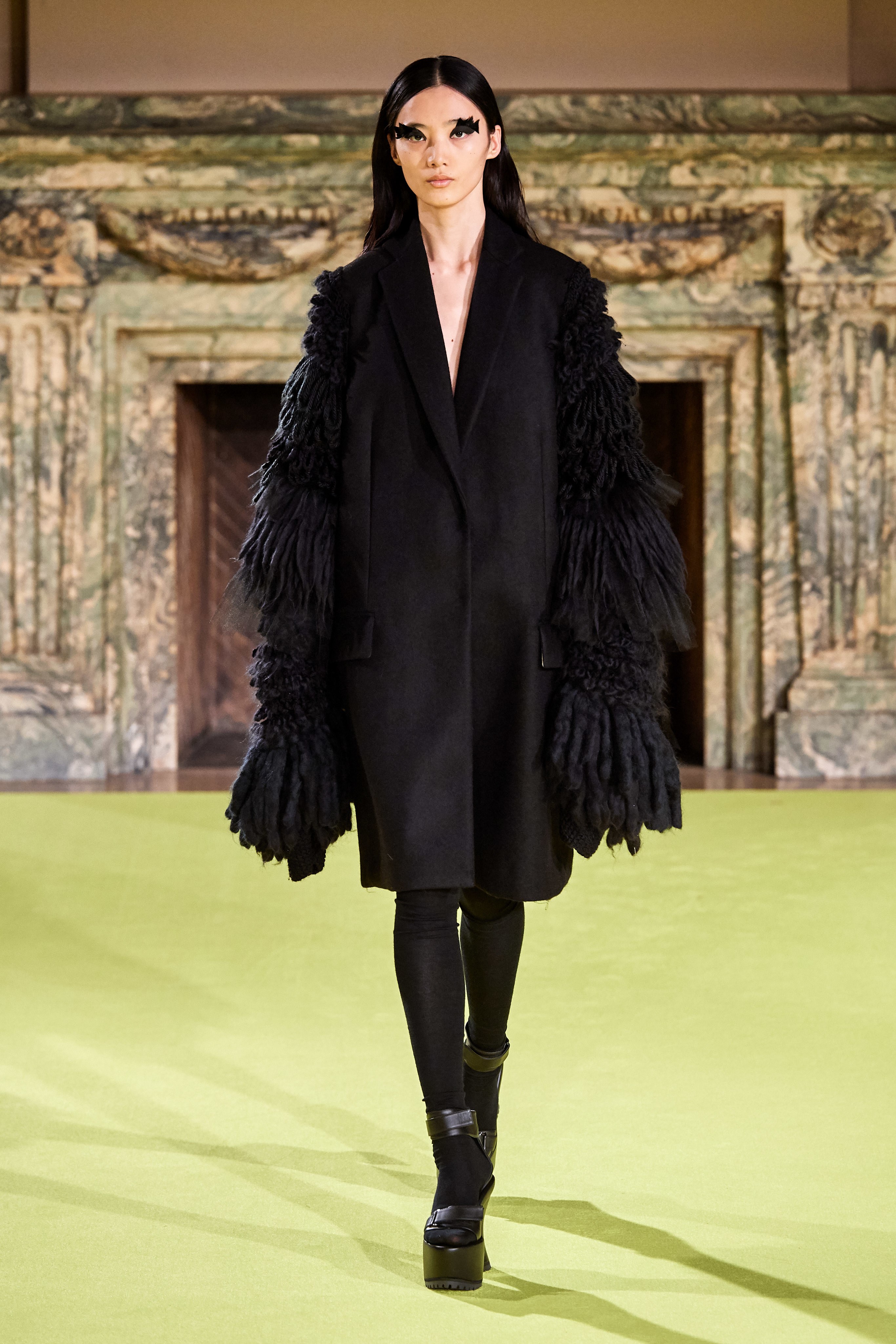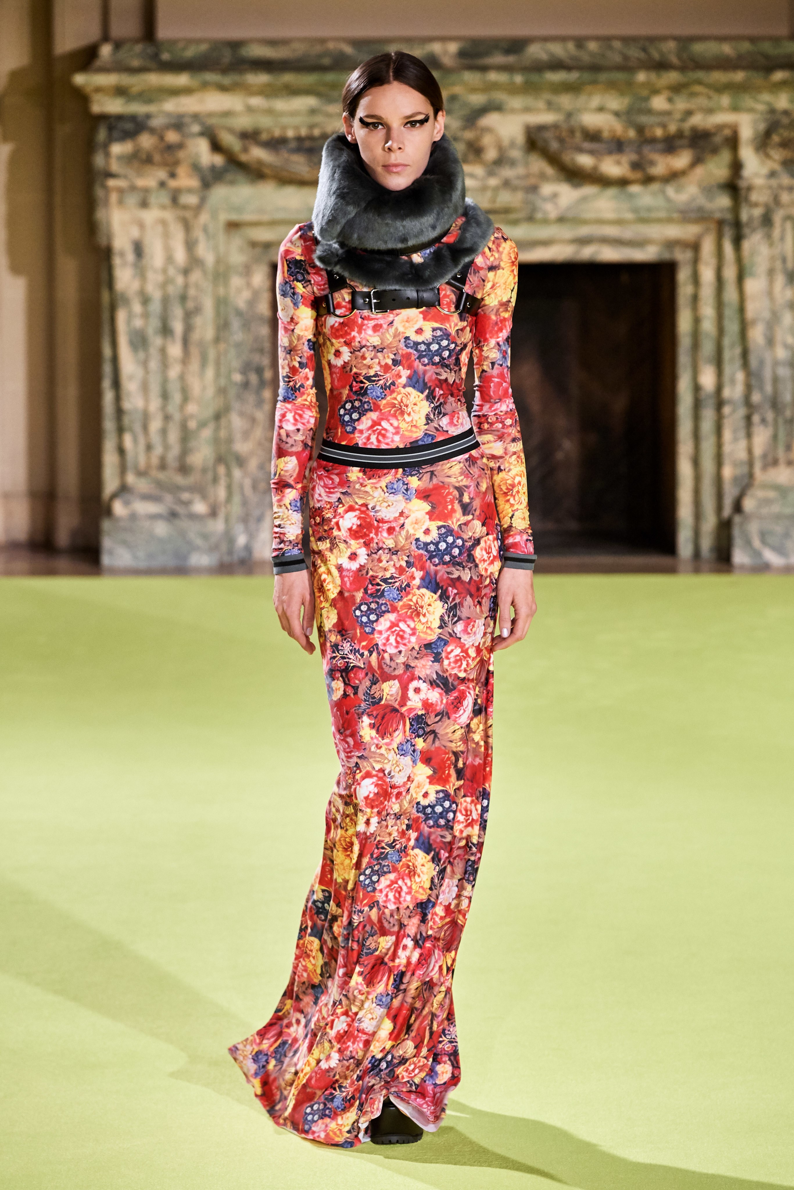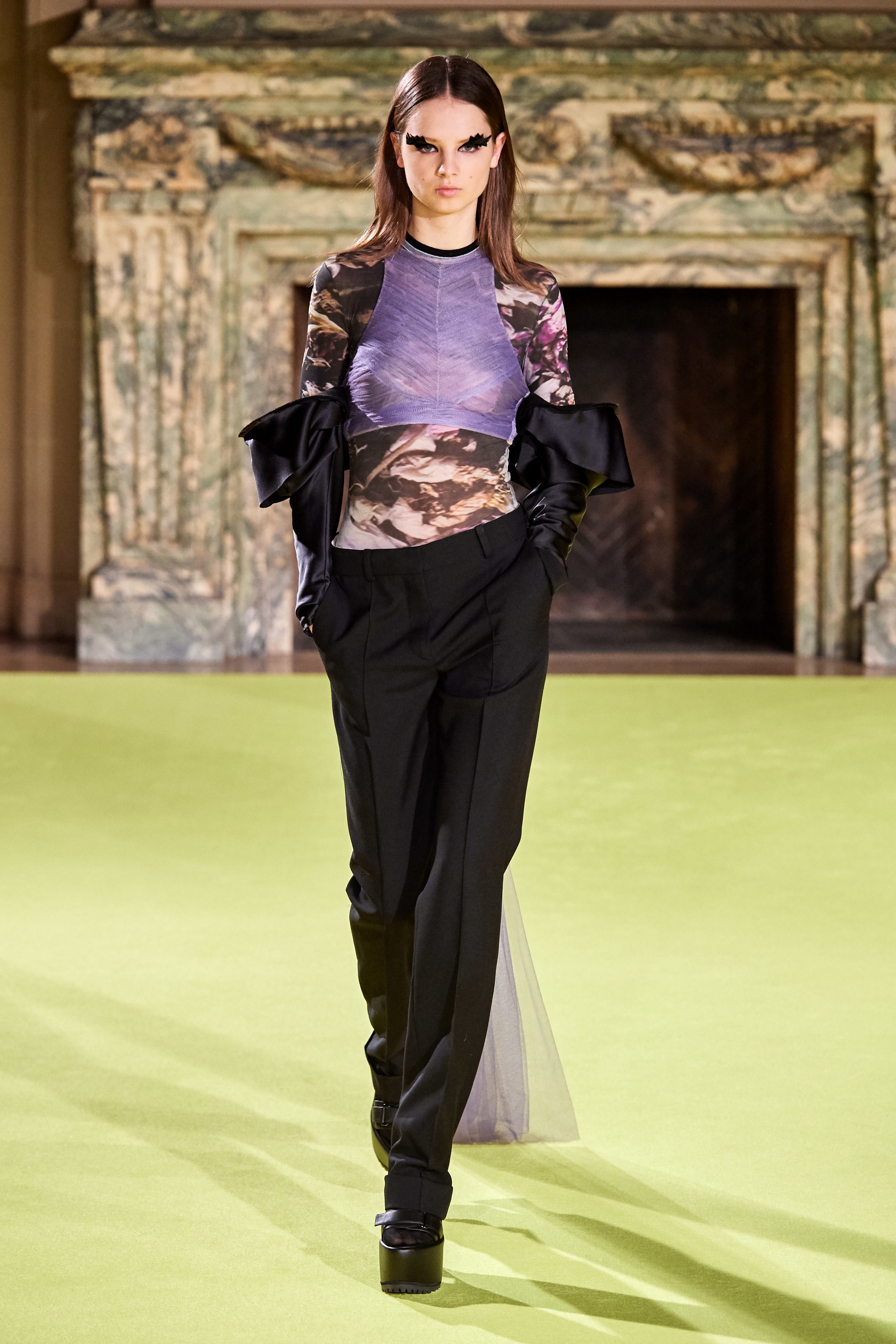 В коллекцию также вошли женственные блузы-гольфы и юбки миди, покрытые крупными принтами из садовых роз и хризантем, элегантные пальто с имитацией плюмажа и объемными рукавами-крыльями.