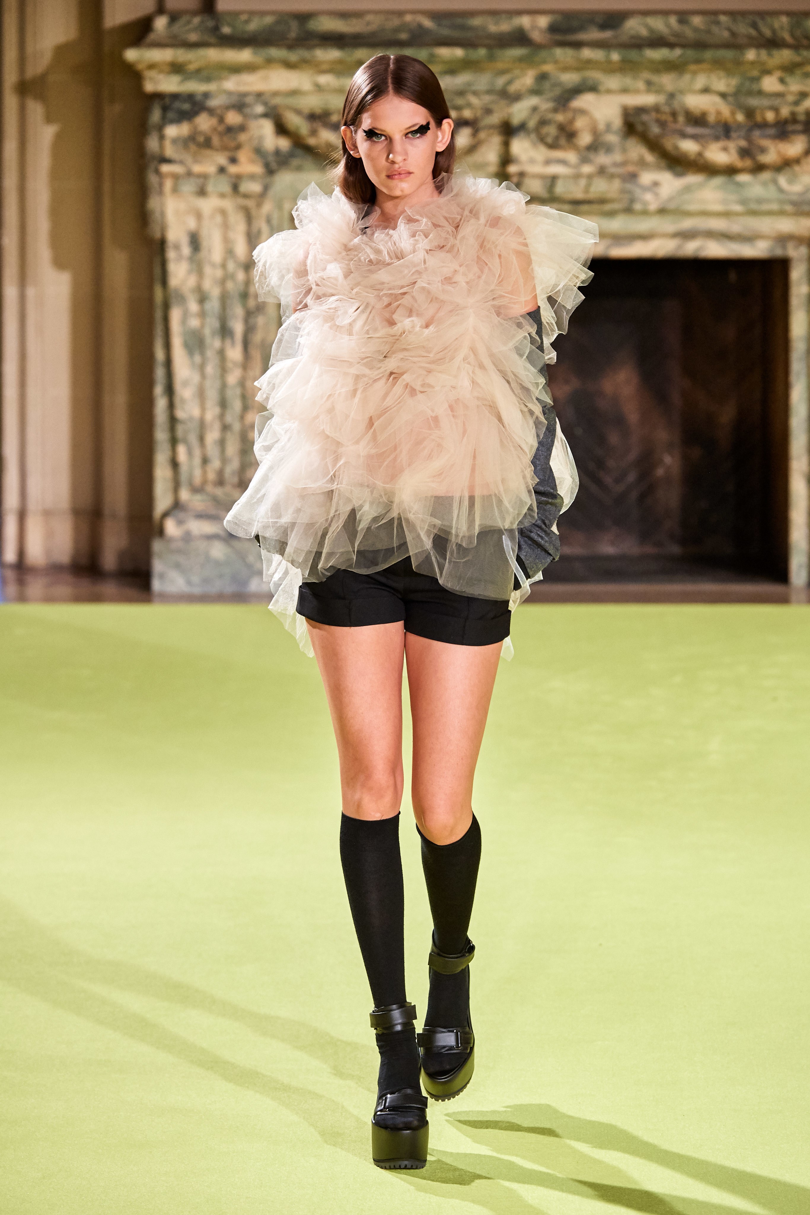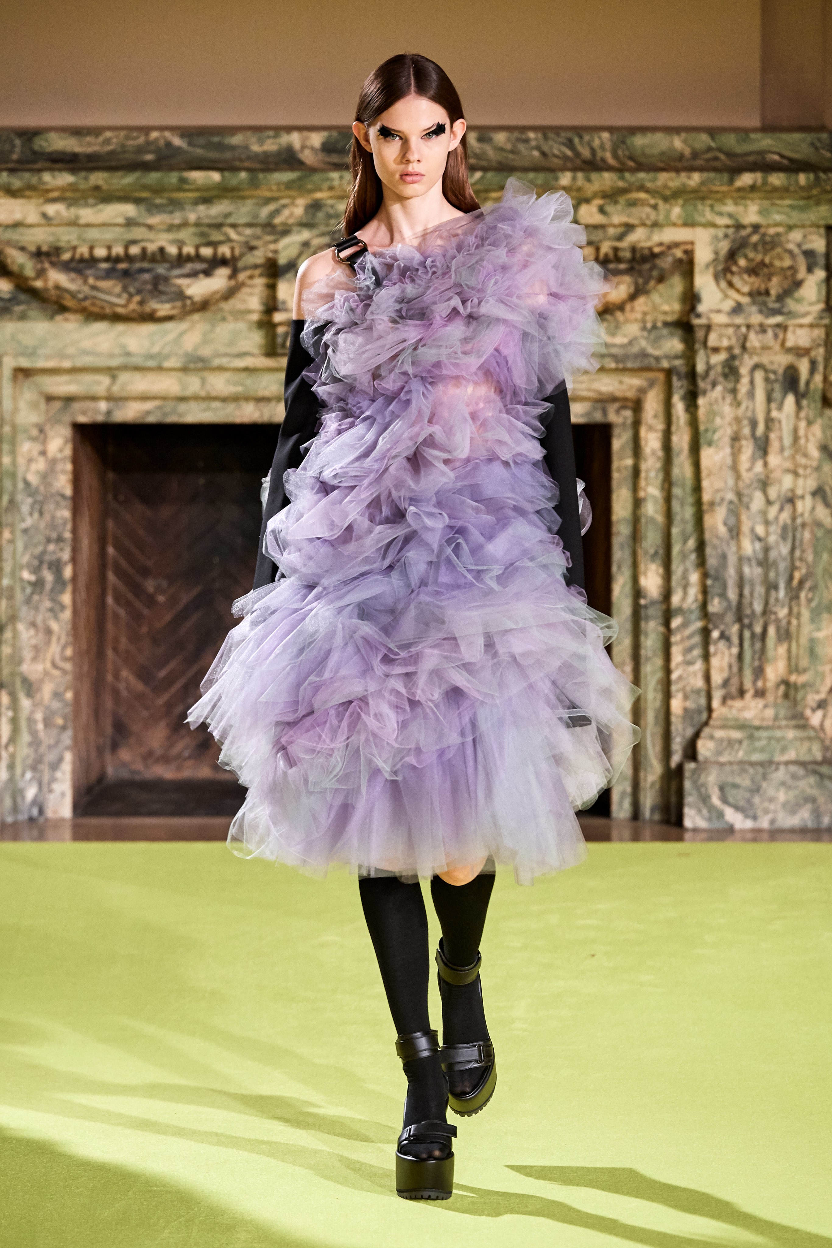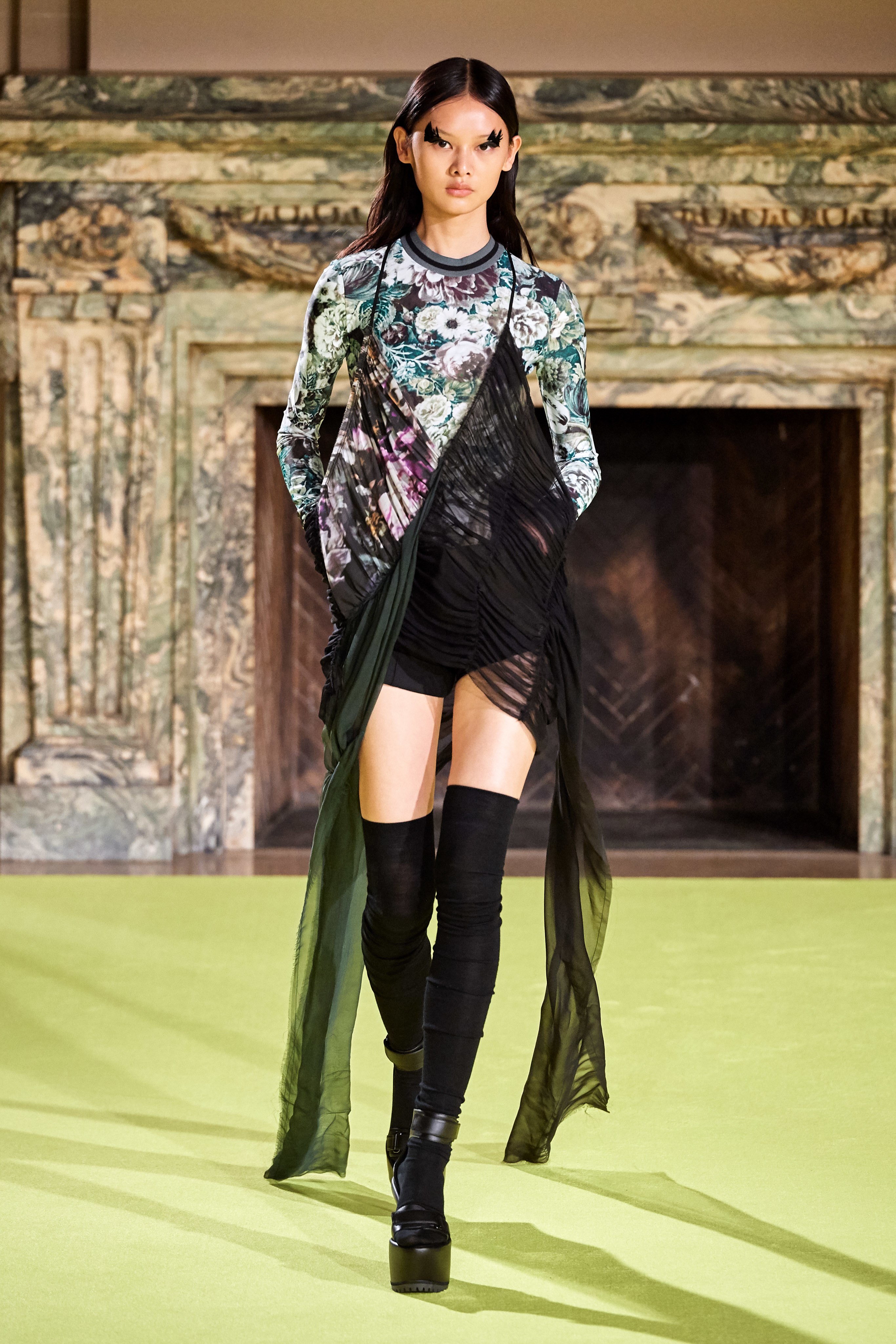 В коллекцию также вошли женственные блузы-гольфы и юбки миди, покрытые крупными принтами из садовых роз и хризантем, элегантные пальто с имитацией плюмажа и объемными рукавами-крыльями.