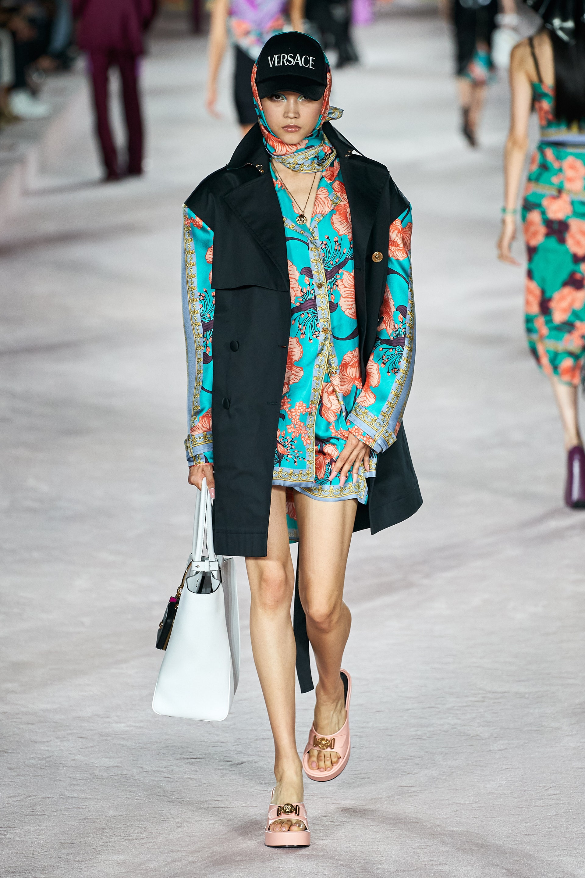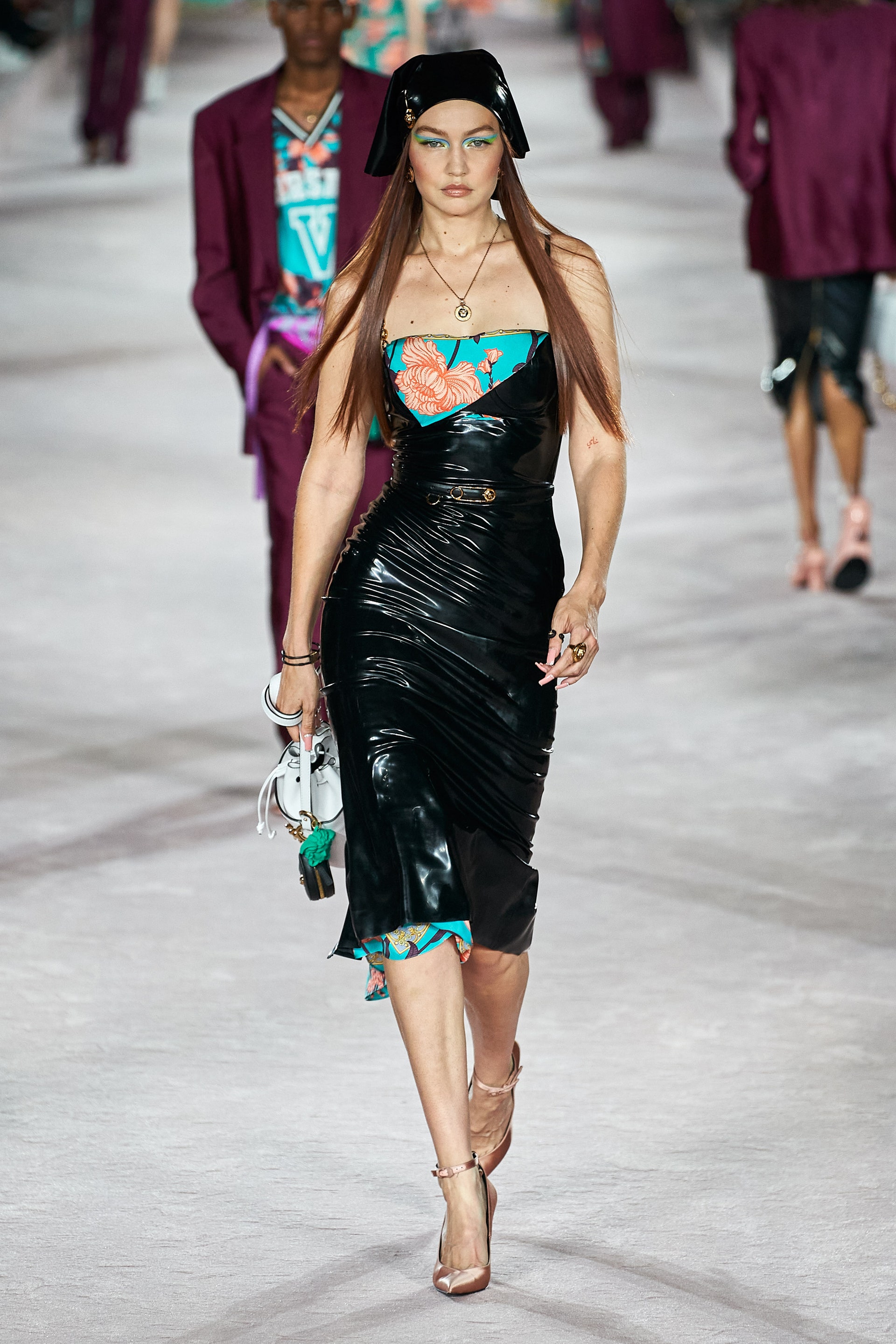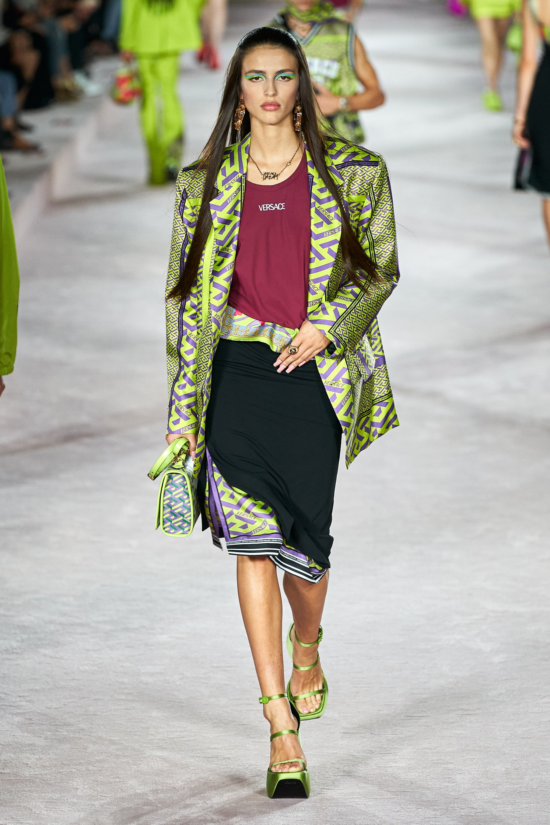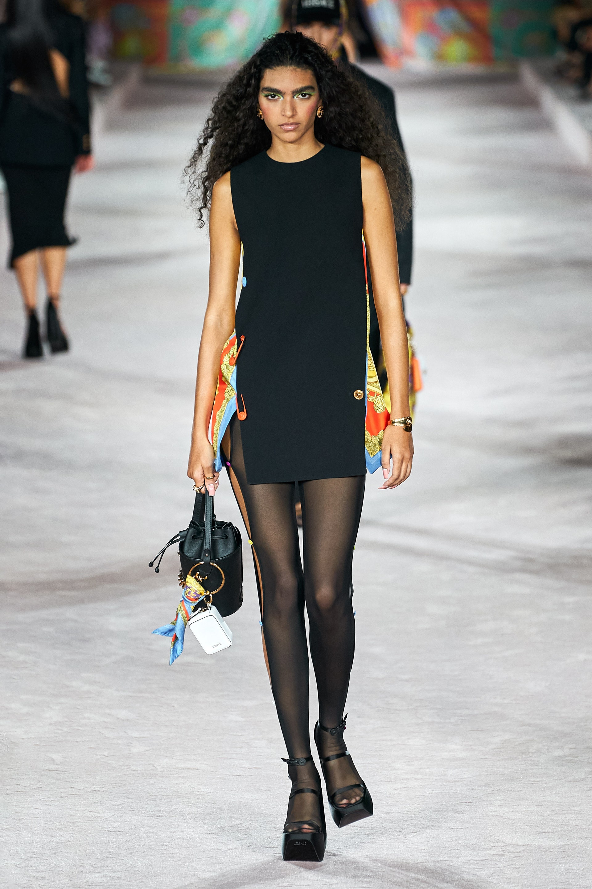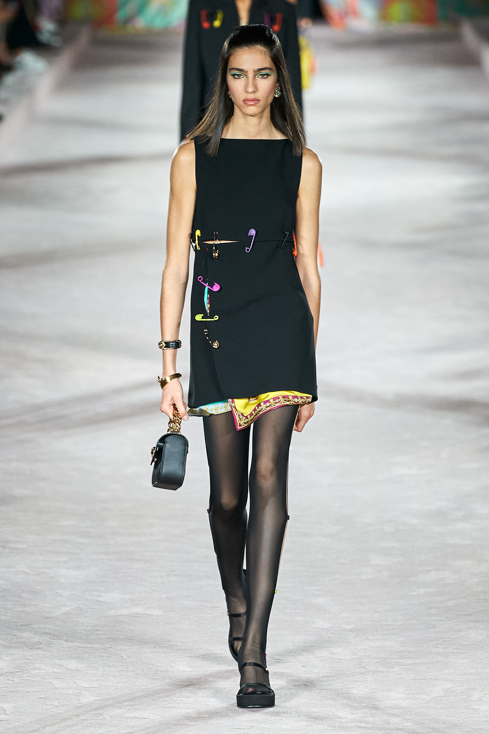 В серебристом платье, цитирующем один из главных хитов Versace из 90-х, также появилась и Лурдес Леон. Узнаваемые булавки украсили почти всю коллекцию. Также на показе были представлены шелковые пижамы, спортивные плащи-кейпы и костюмы с архивным принтом "Медуза" и La Greca. Пестрые шелковые платки превратились в мужские топы и подкладки в классических костюмах и платьях, виднеющиеся сквозь разрезы.