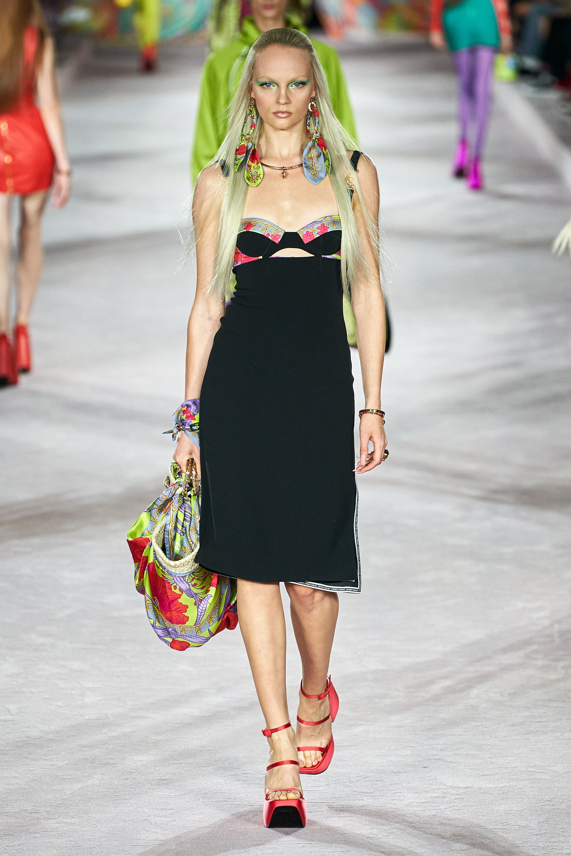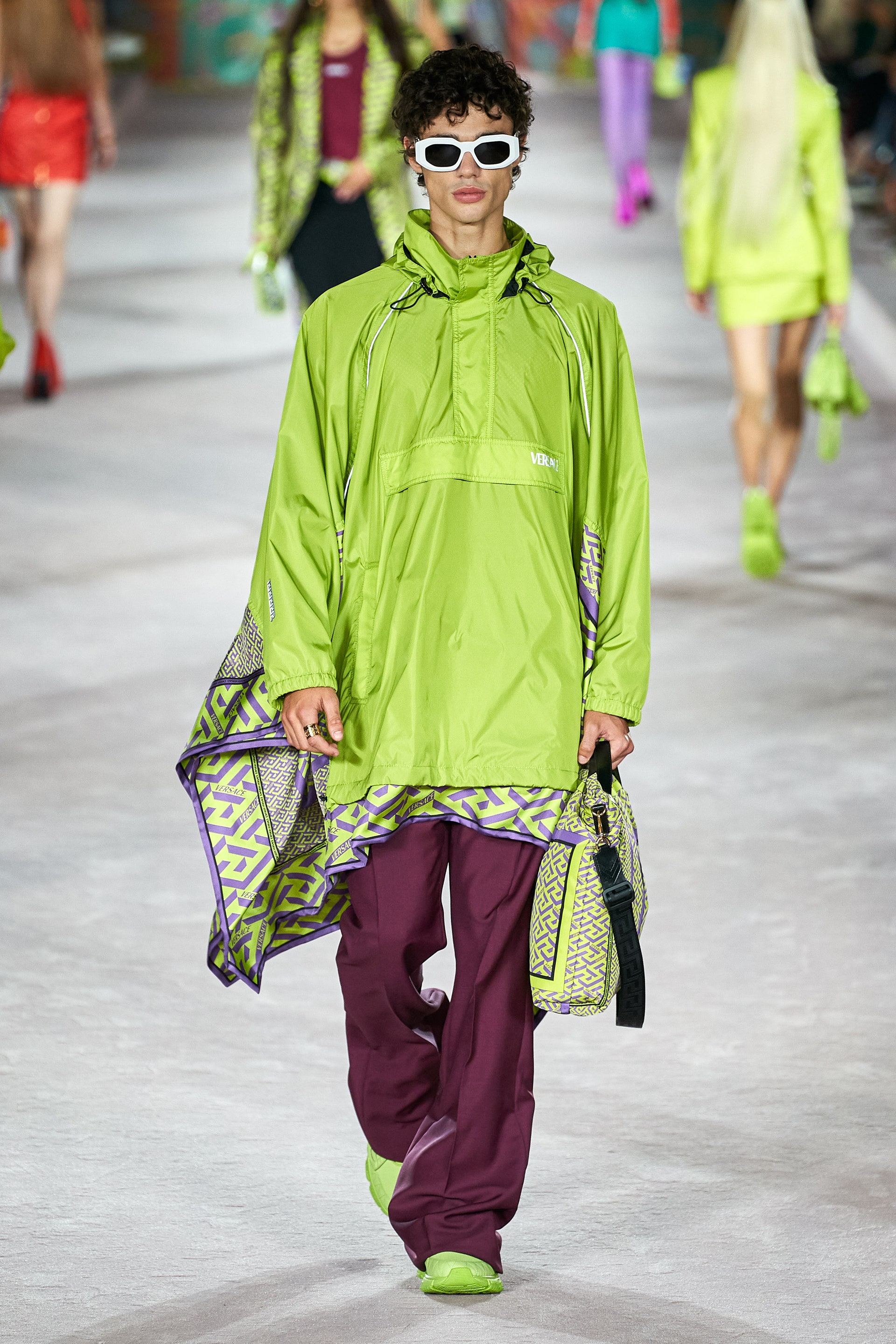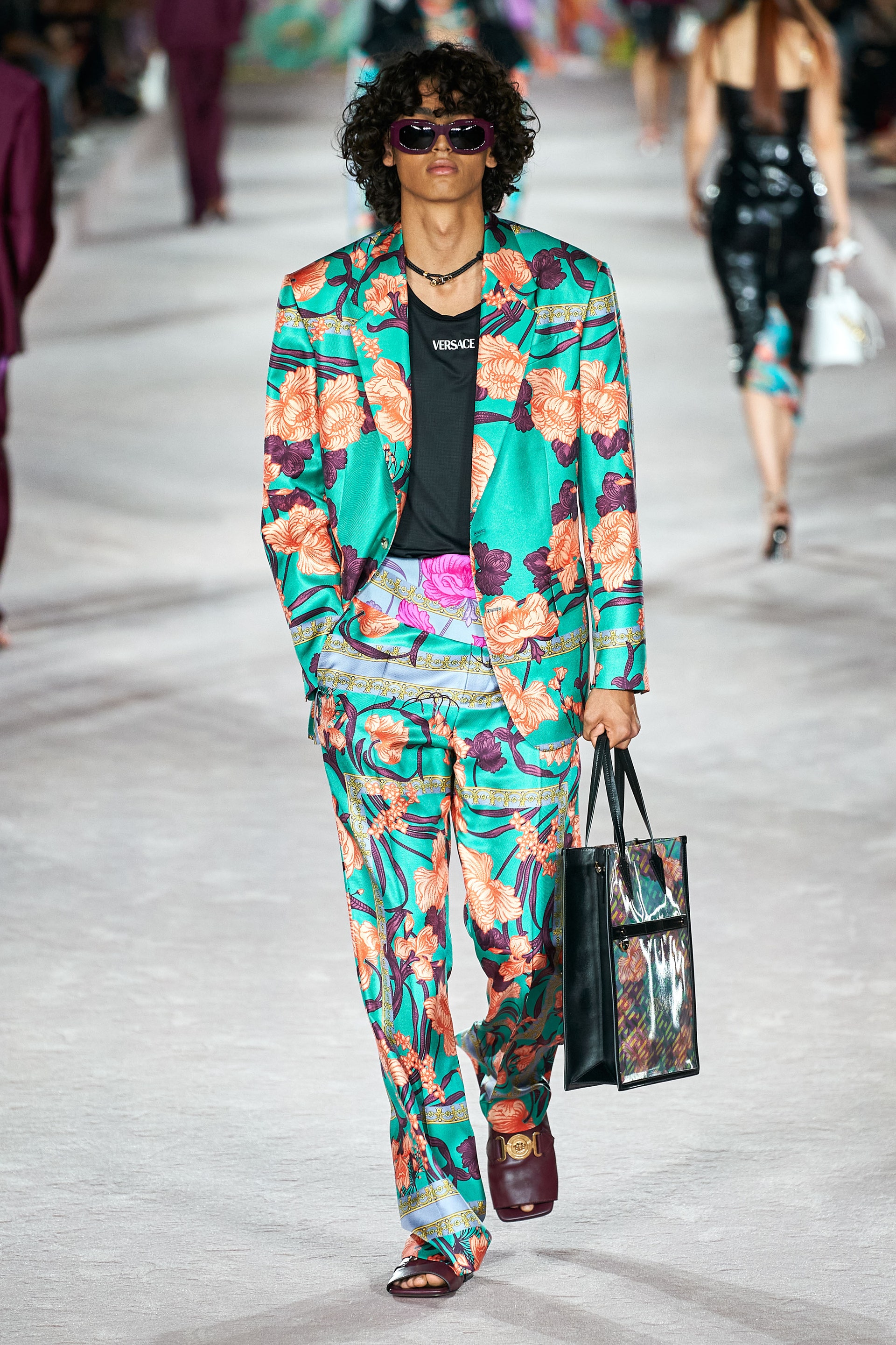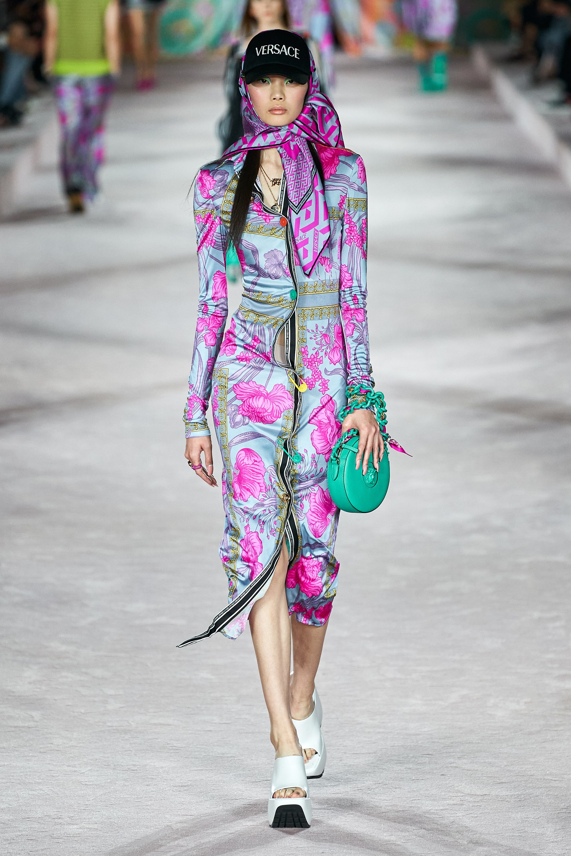 В серебристом платье, цитирующем один из главных хитов Versace из 90-х, также появилась и Лурдес Леон. Узнаваемые булавки украсили почти всю коллекцию. Также на показе были представлены шелковые пижамы, спортивные плащи-кейпы и костюмы с архивным принтом "Медуза" и La Greca. Пестрые шелковые платки превратились в мужские топы и подкладки в классических костюмах и платьях, виднеющиеся сквозь разрезы.