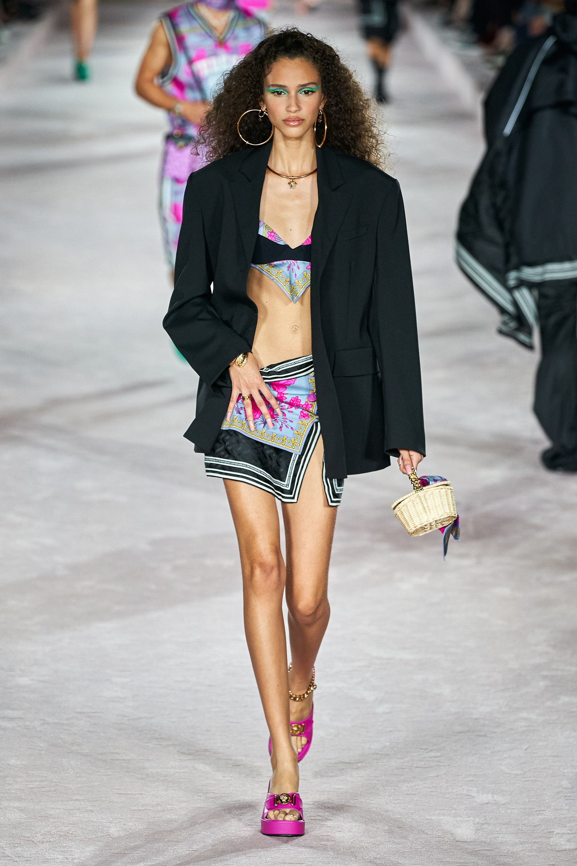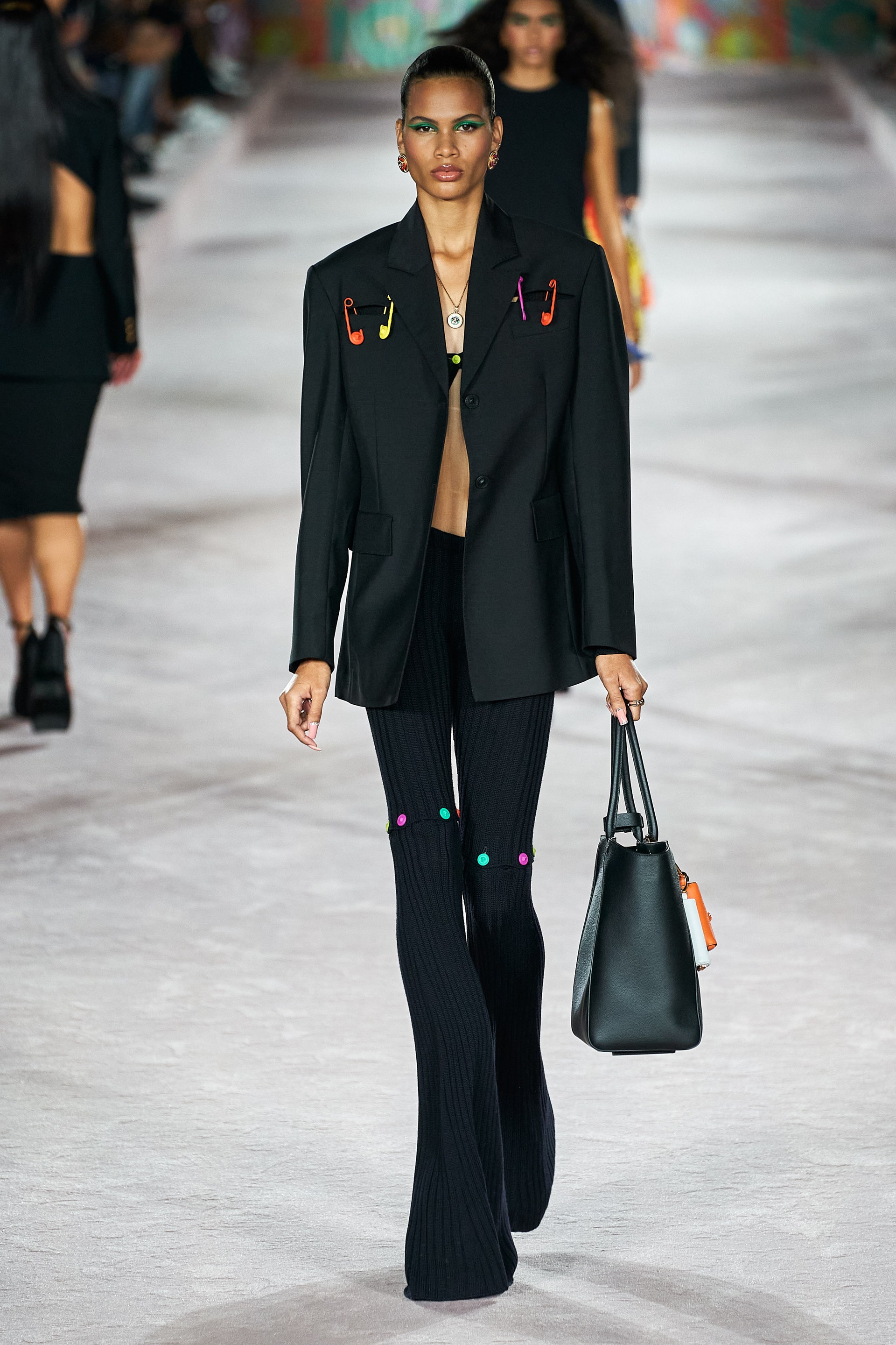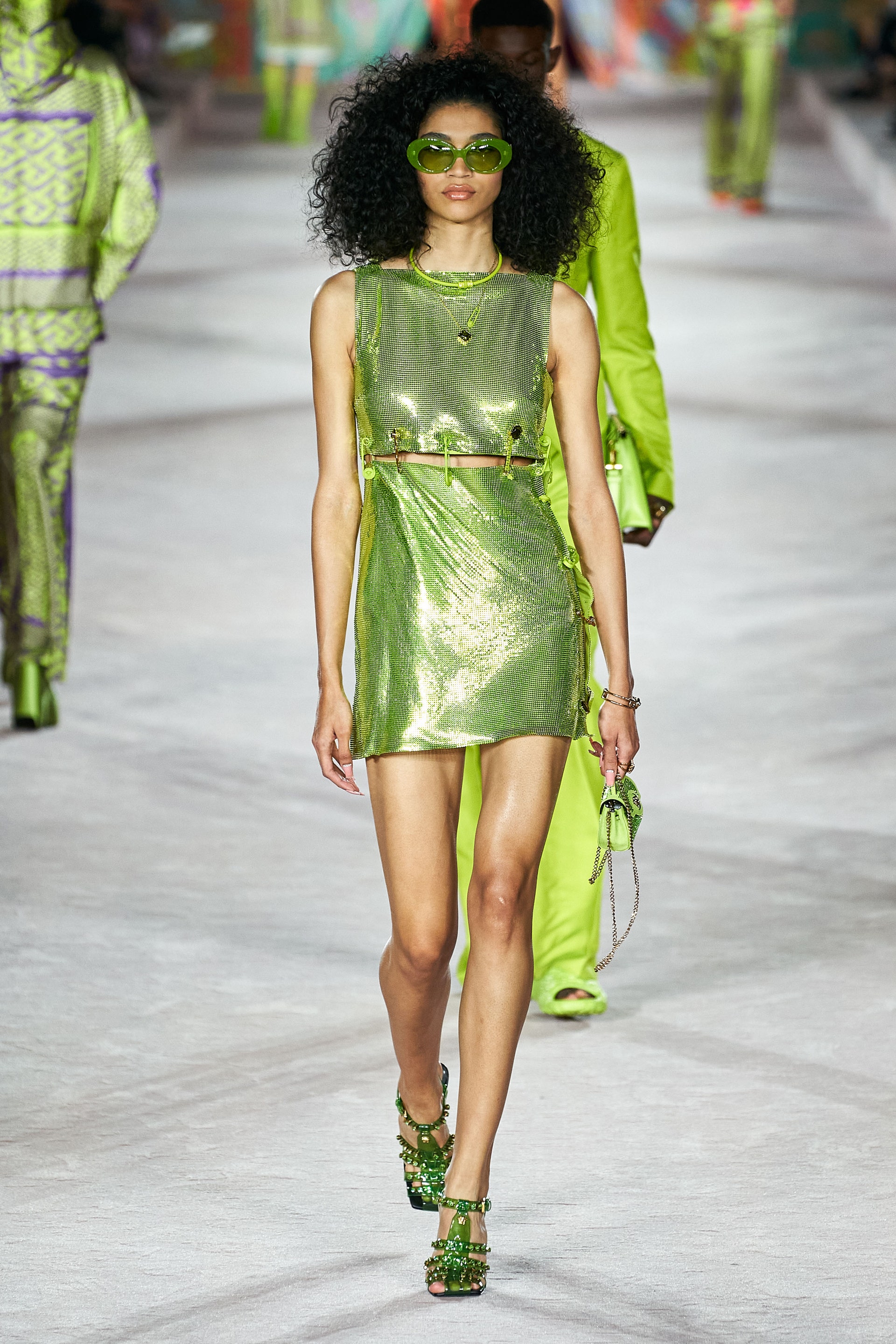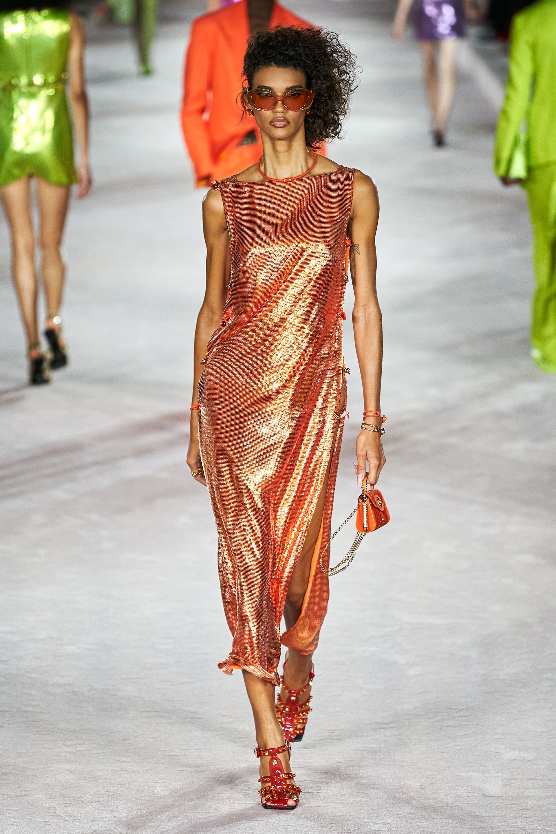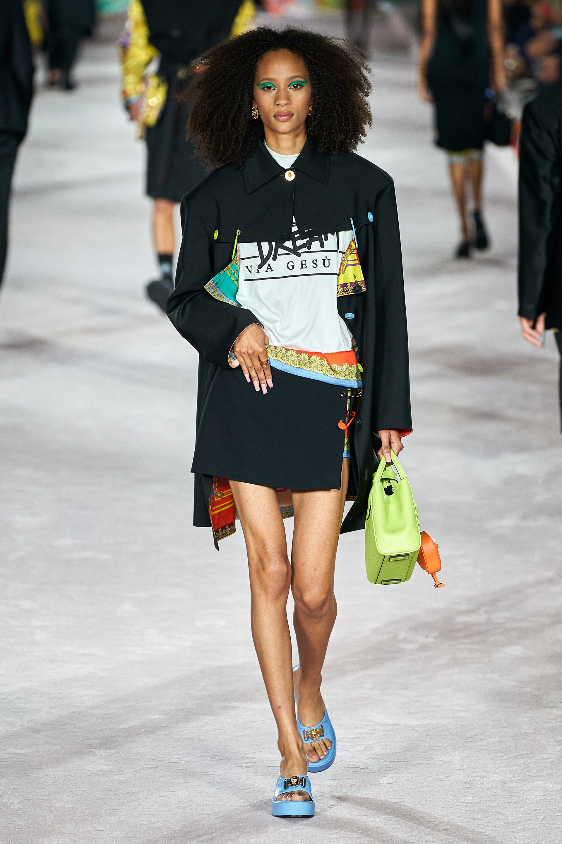 В серебристом платье, цитирующем один из главных хитов Versace из 90-х, также появилась и Лурдес Леон. Узнаваемые булавки украсили почти всю коллекцию. Также на показе были представлены шелковые пижамы, спортивные плащи-кейпы и костюмы с архивным принтом "Медуза" и La Greca. Пестрые шелковые платки превратились в мужские топы и подкладки в классических костюмах и платьях, виднеющиеся сквозь разрезы.