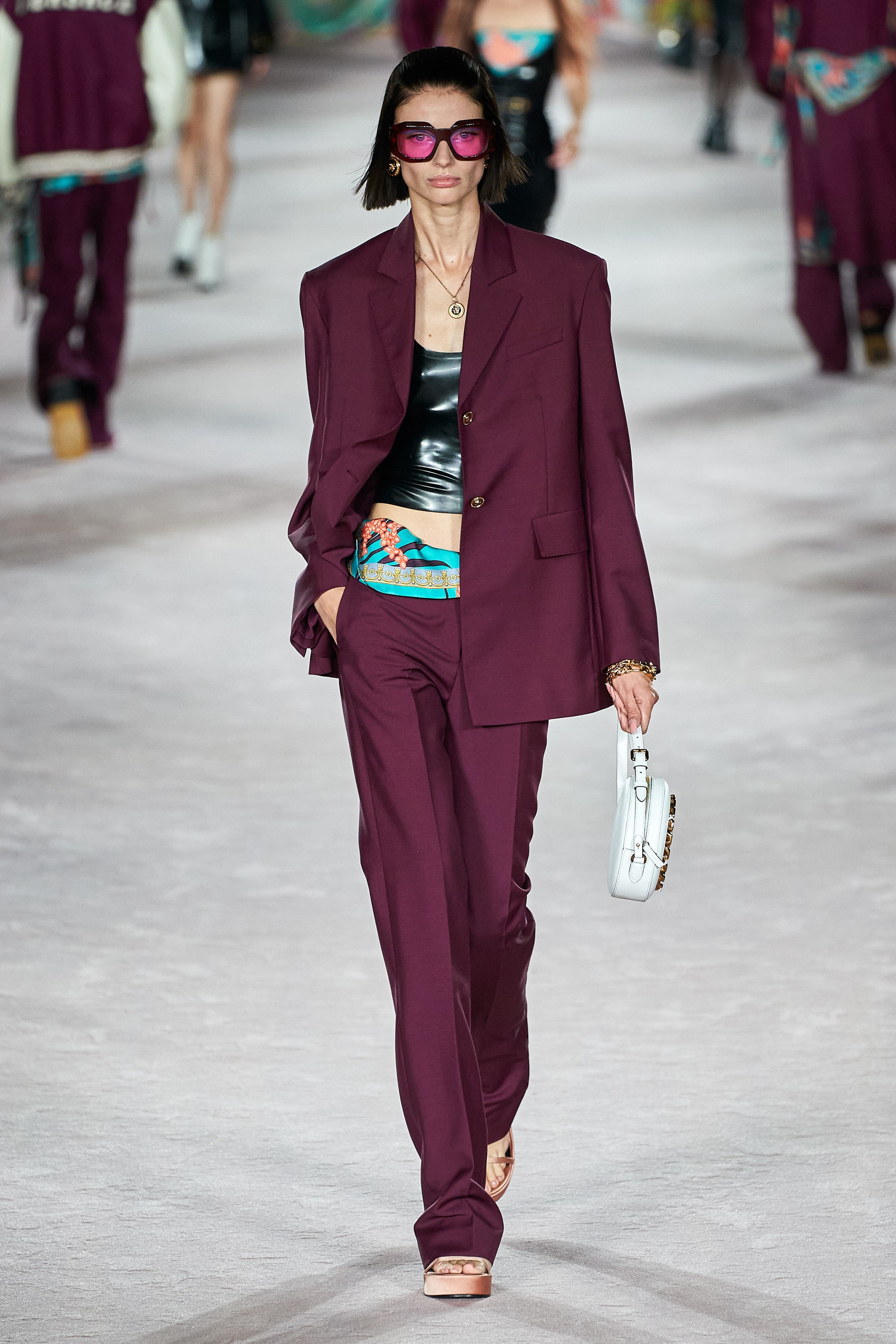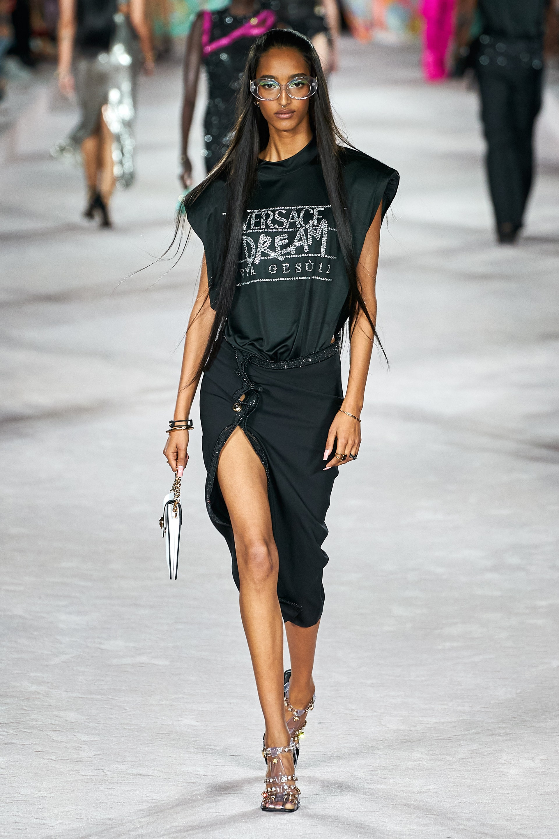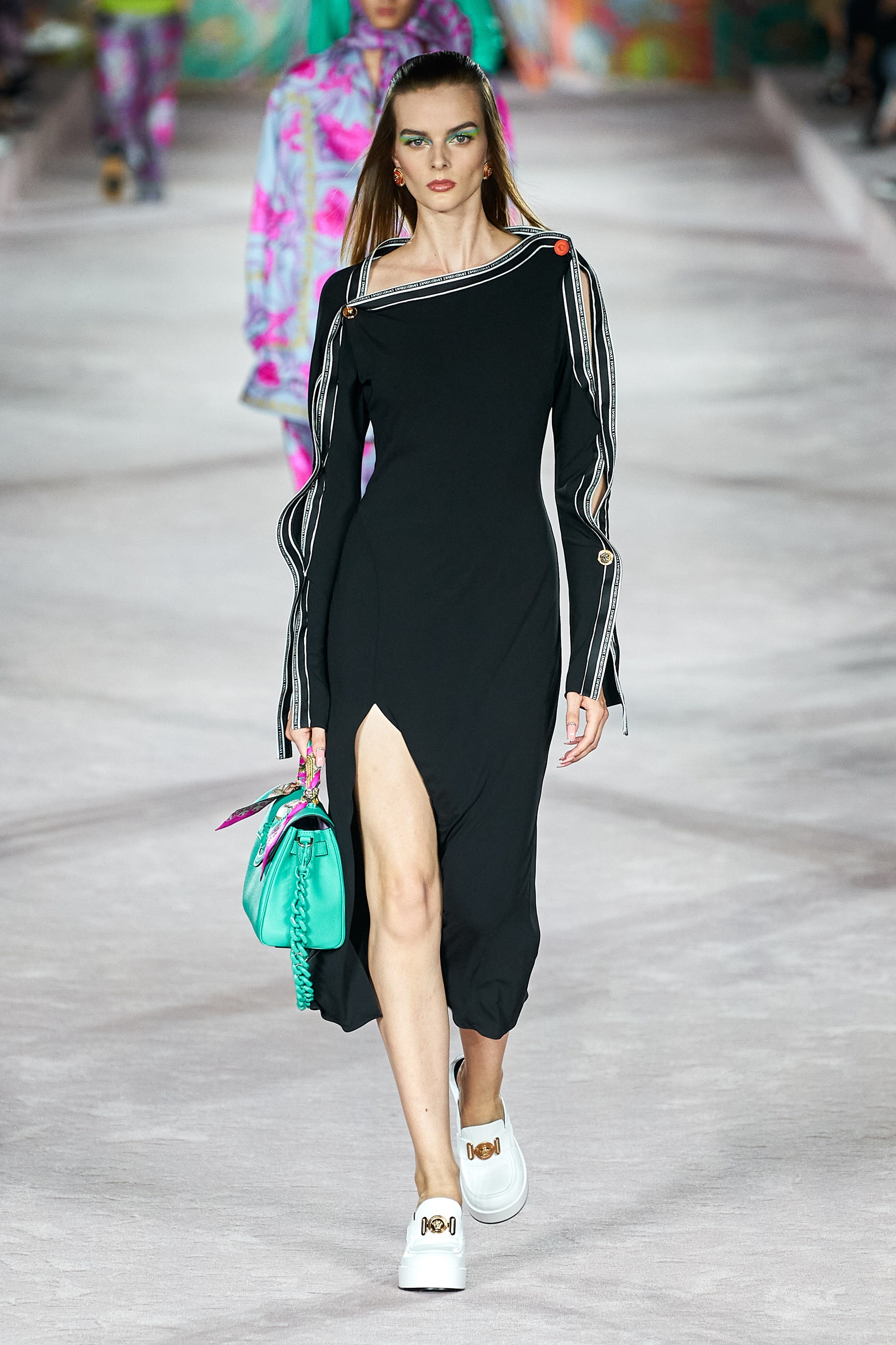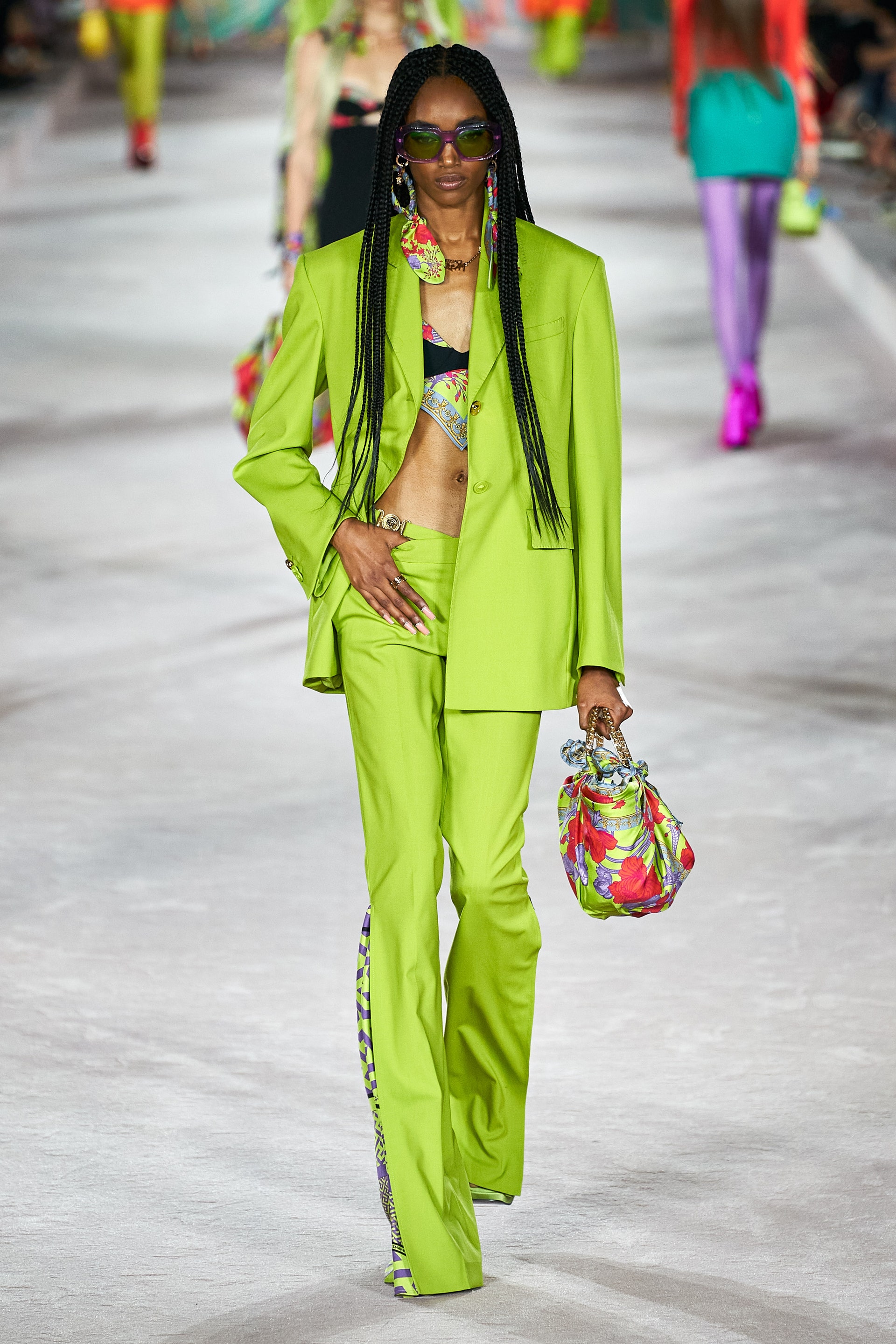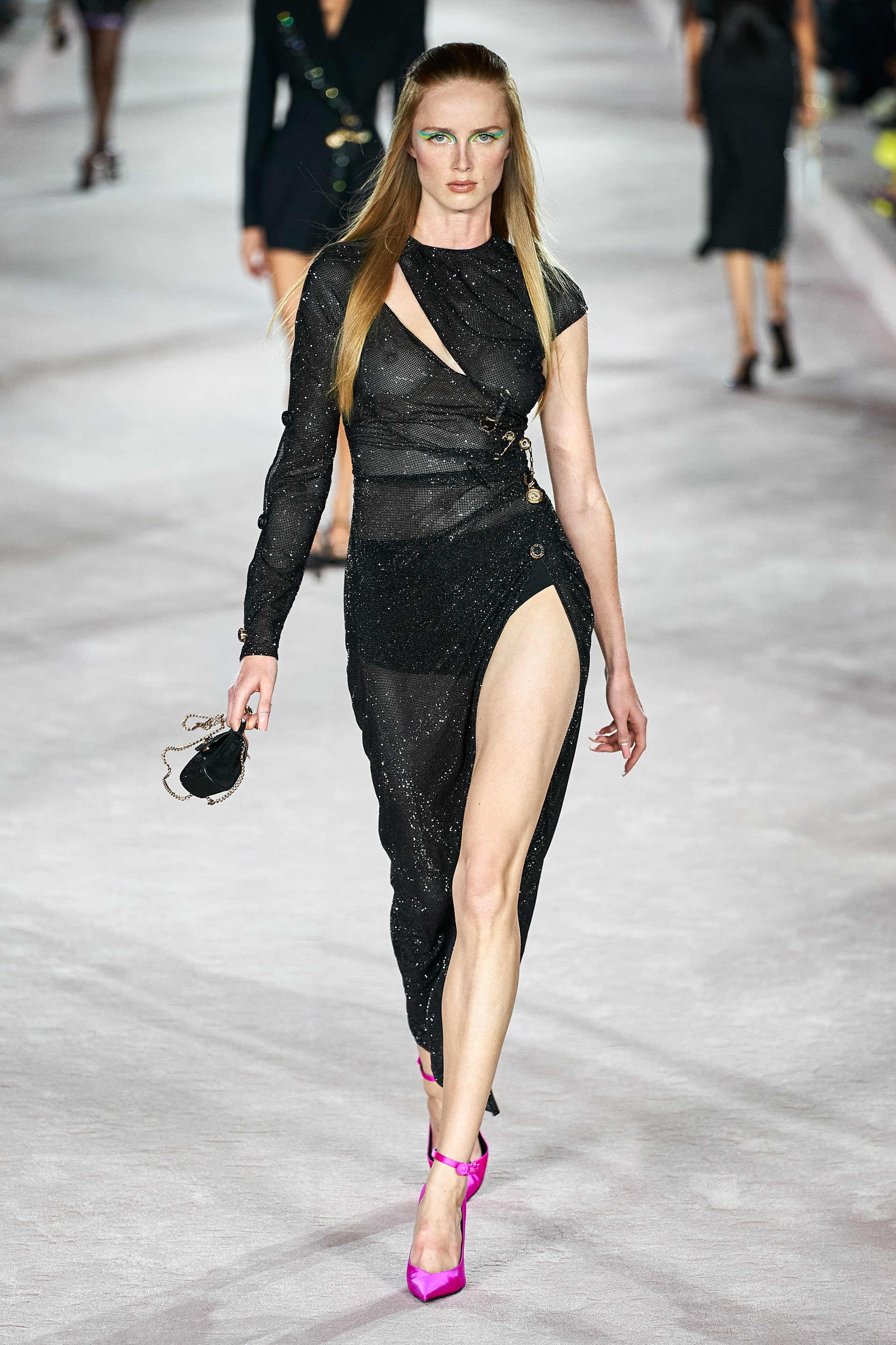 В серебристом платье, цитирующем один из главных хитов Versace из 90-х, также появилась и Лурдес Леон. Узнаваемые булавки украсили почти всю коллекцию. Также на показе были представлены шелковые пижамы, спортивные плащи-кейпы и костюмы с архивным принтом "Медуза" и La Greca. Пестрые шелковые платки превратились в мужские топы и подкладки в классических костюмах и платьях, виднеющиеся сквозь разрезы.