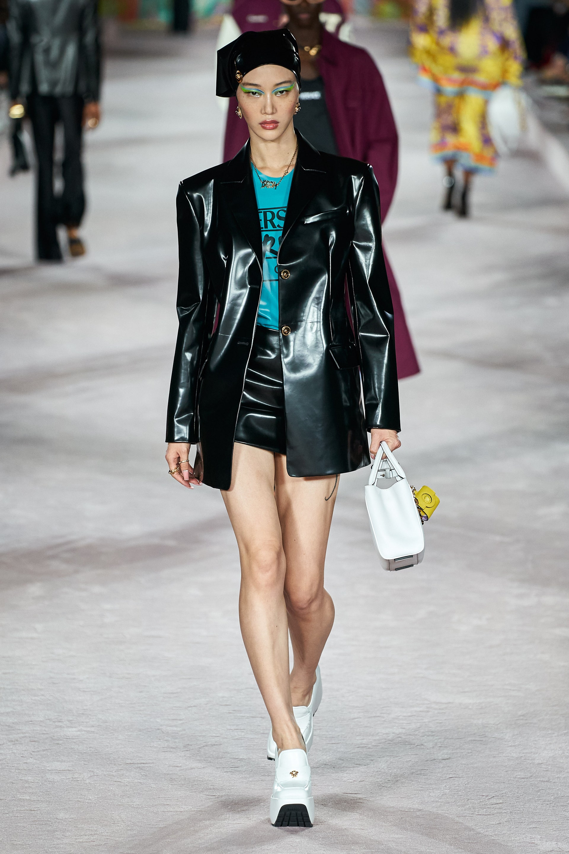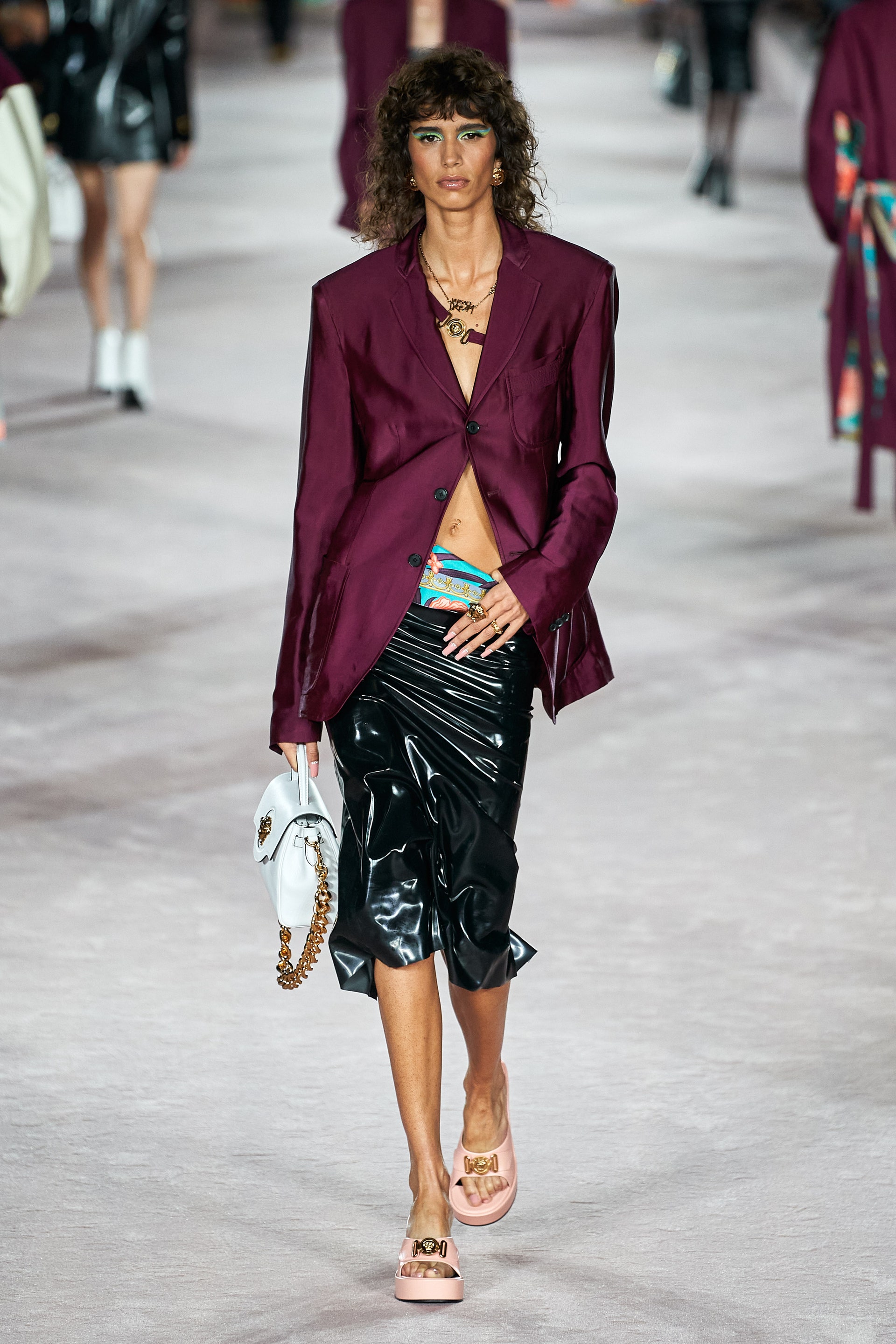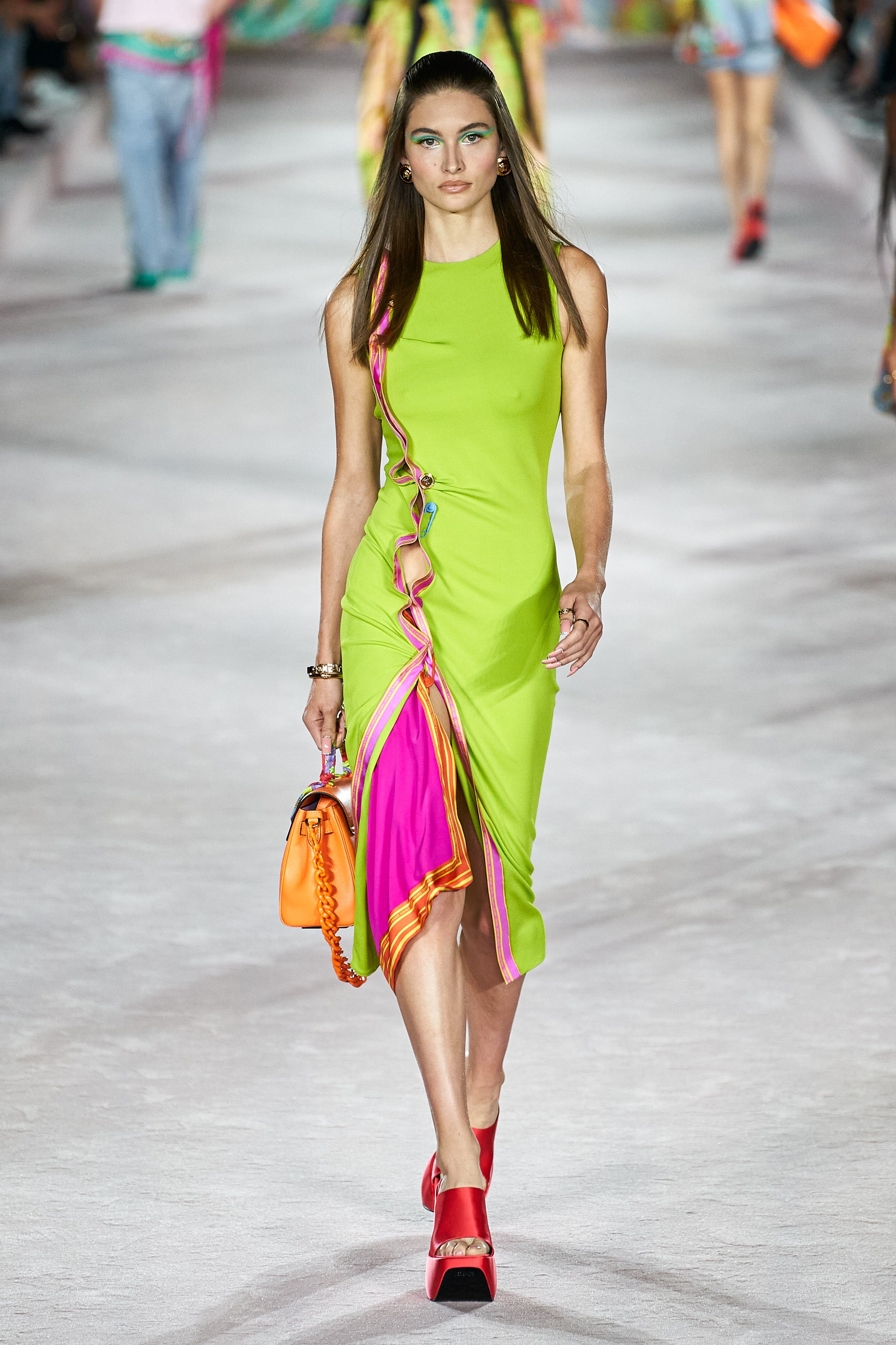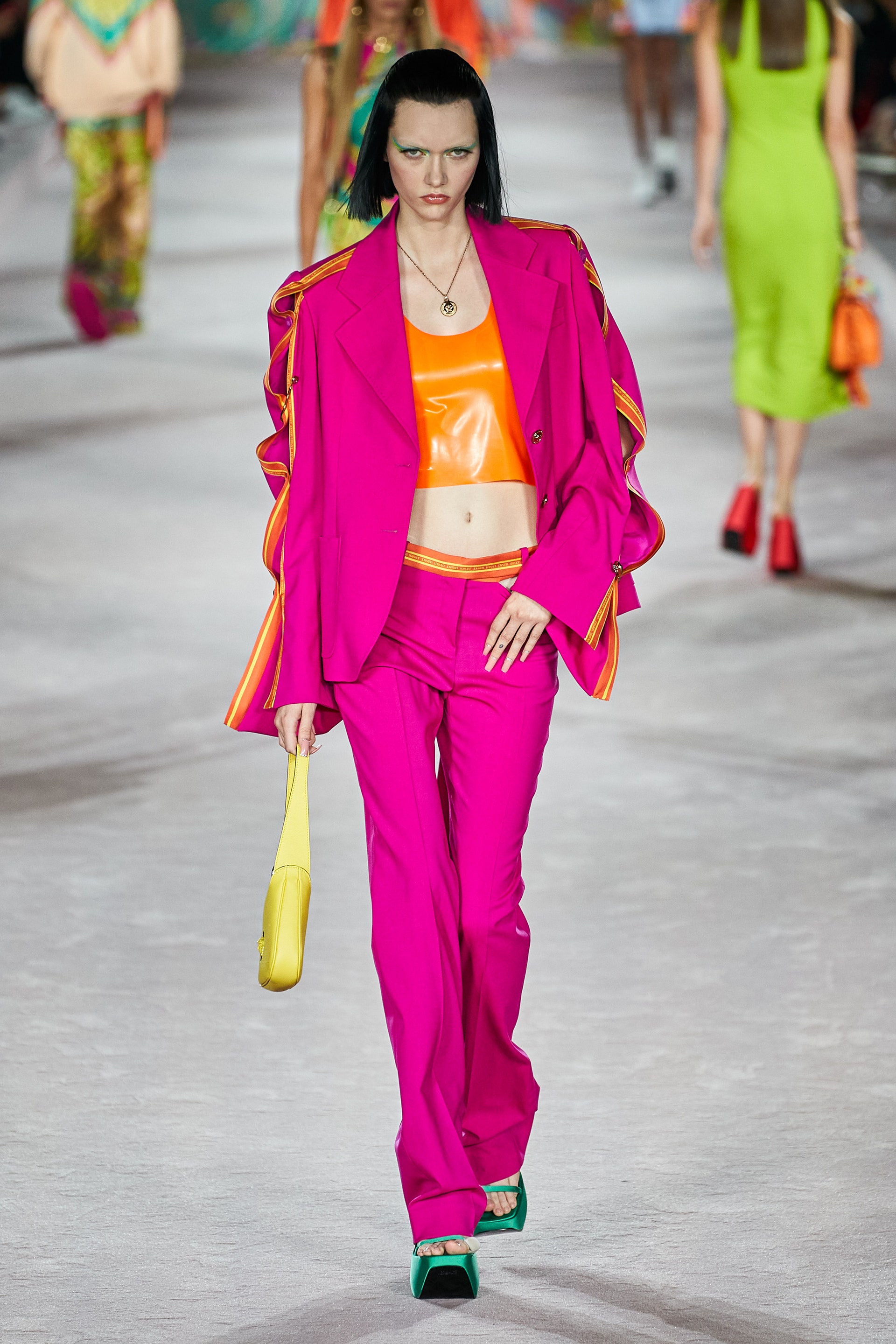 В серебристом платье, цитирующем один из главных хитов Versace из 90-х, также появилась и Лурдес Леон. Узнаваемые булавки украсили почти всю коллекцию. Также на показе были представлены шелковые пижамы, спортивные плащи-кейпы и костюмы с архивным принтом "Медуза" и La Greca. Пестрые шелковые платки превратились в мужские топы и подкладки в классических костюмах и платьях, виднеющиеся сквозь разрезы.