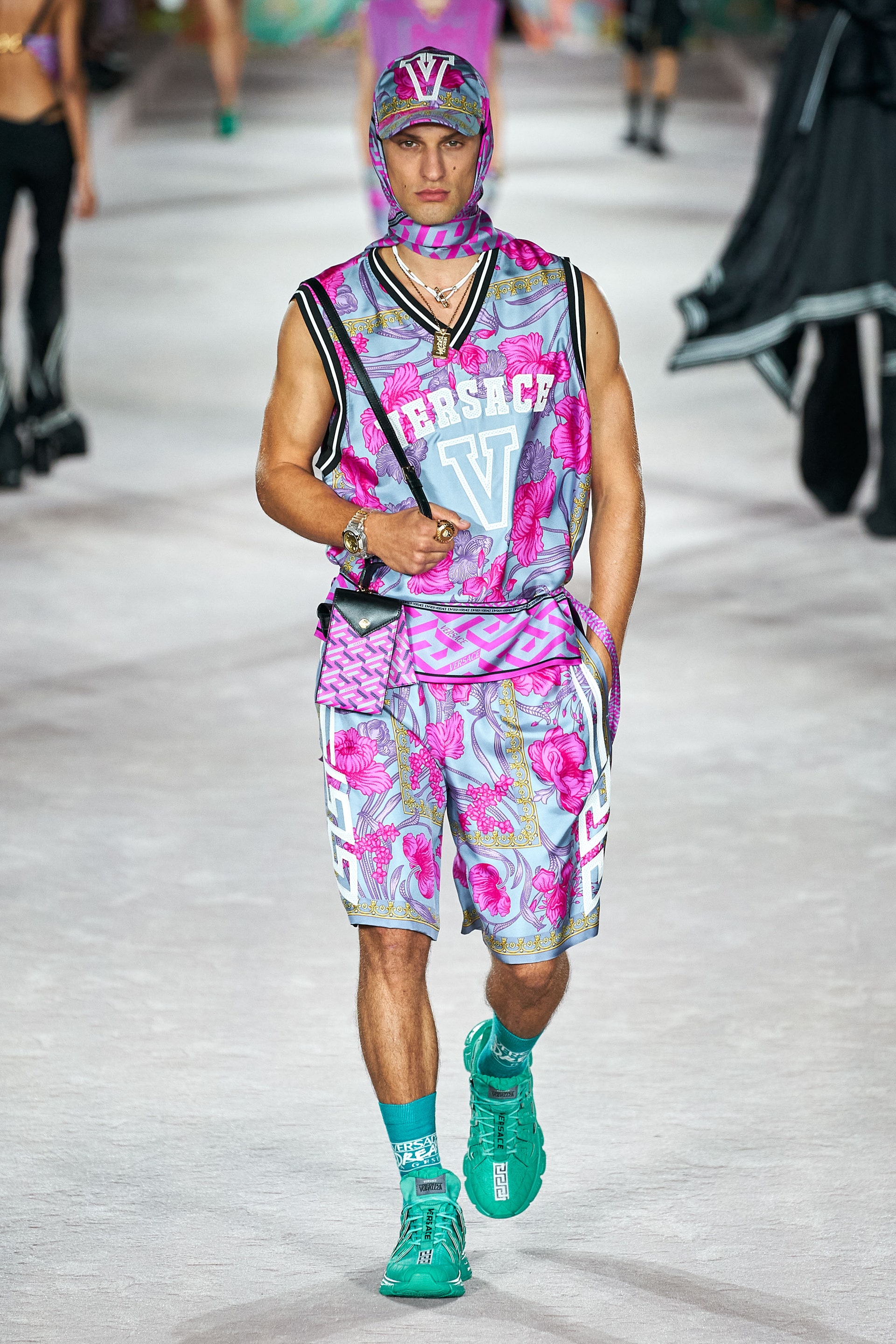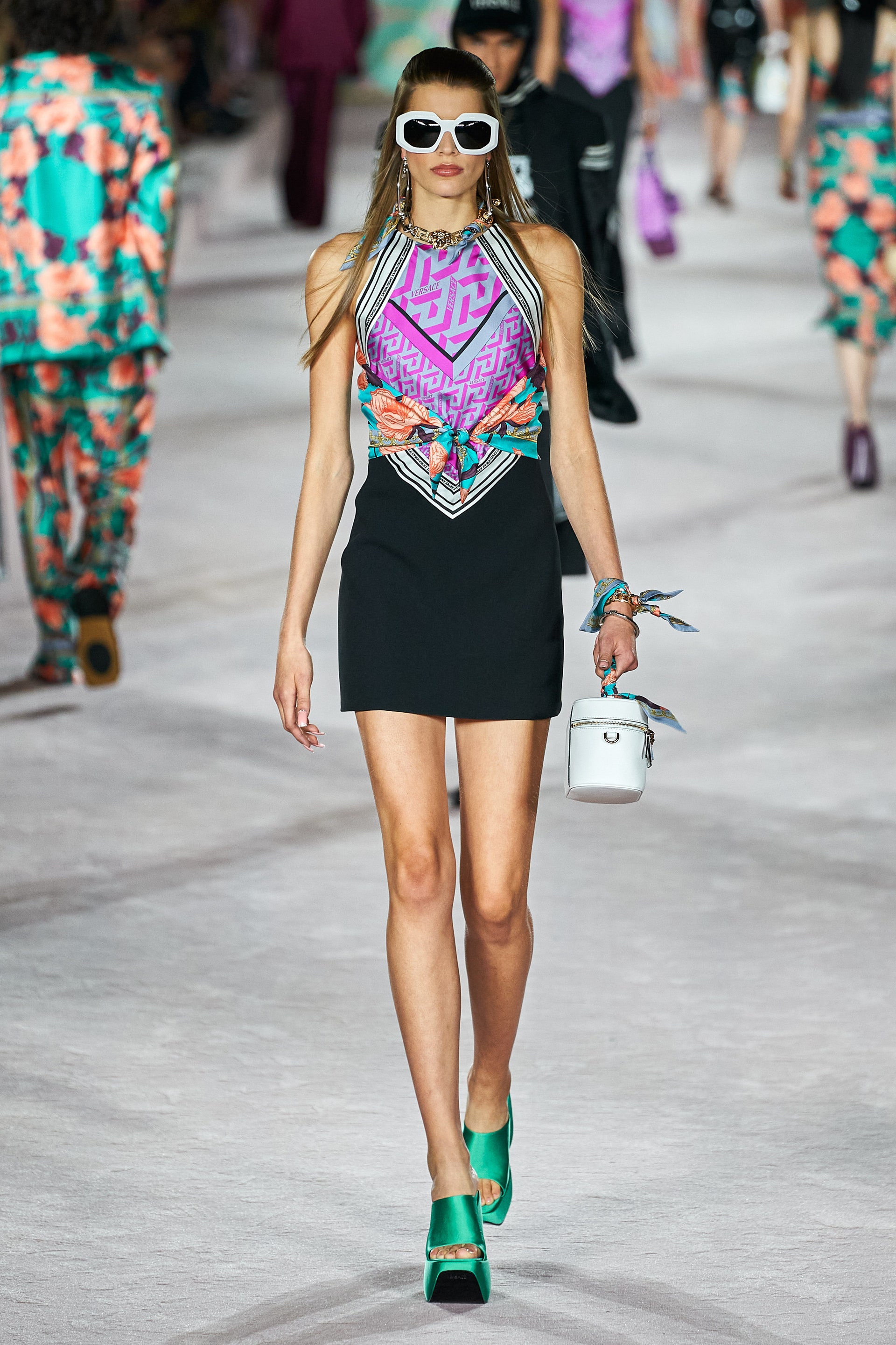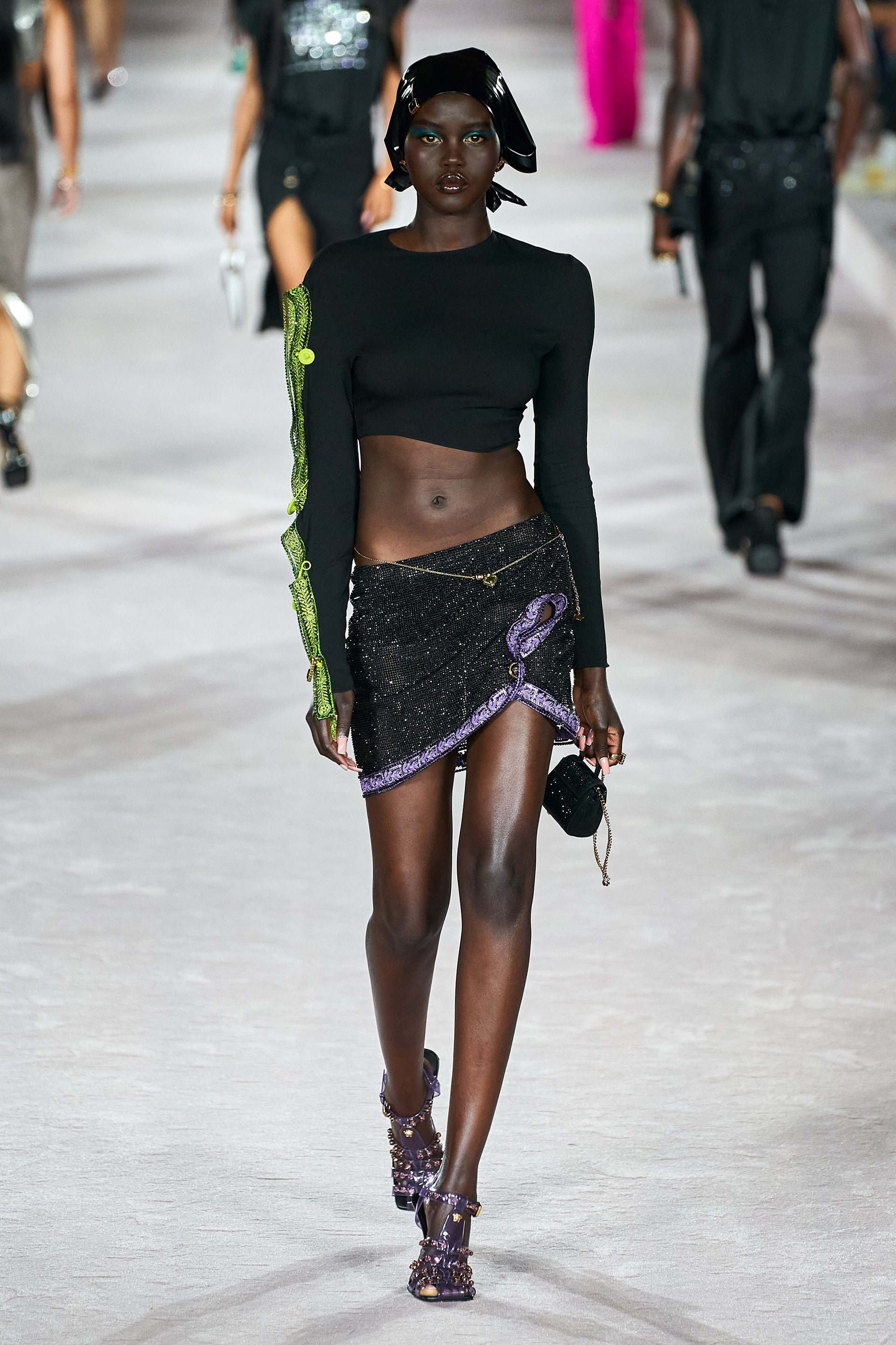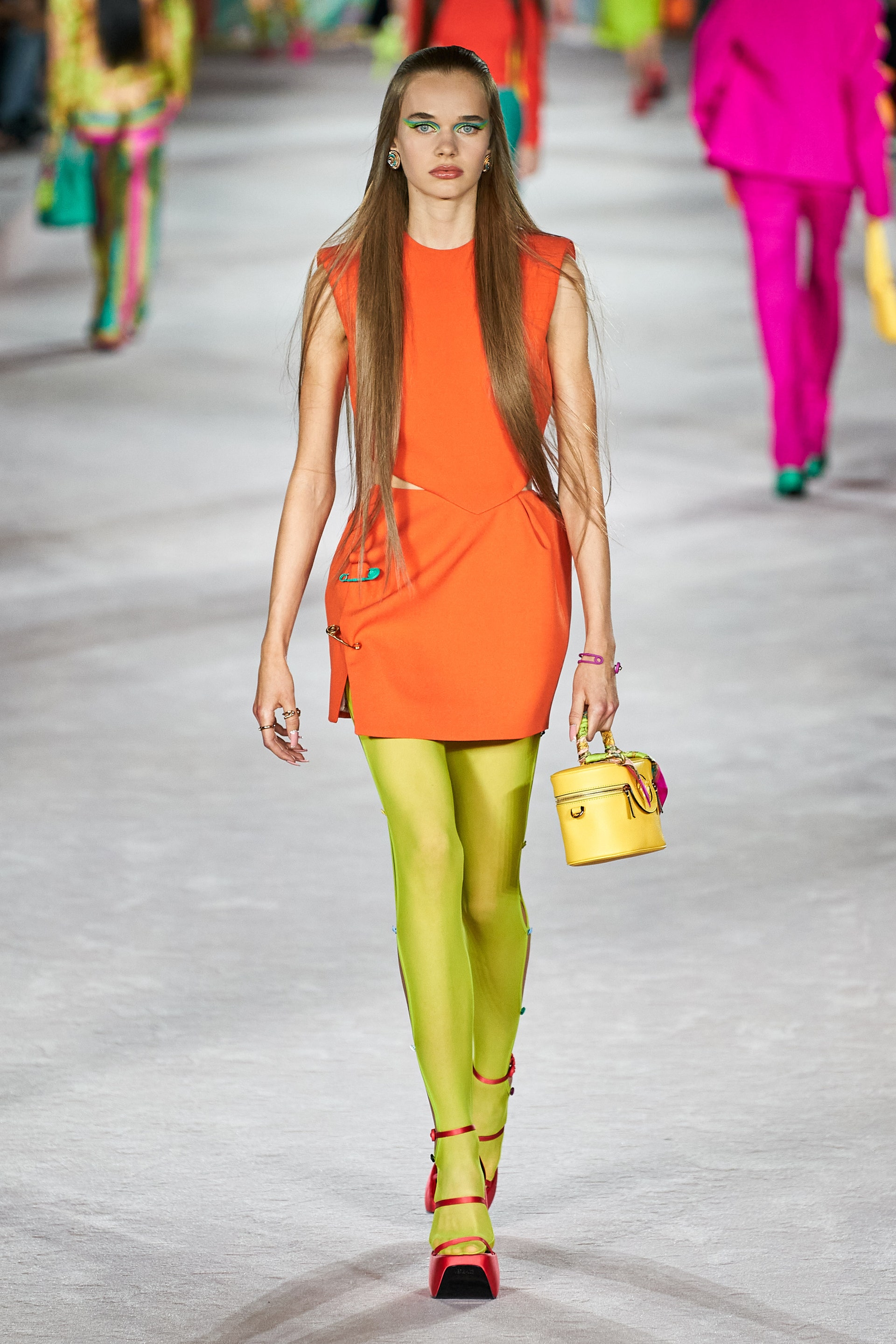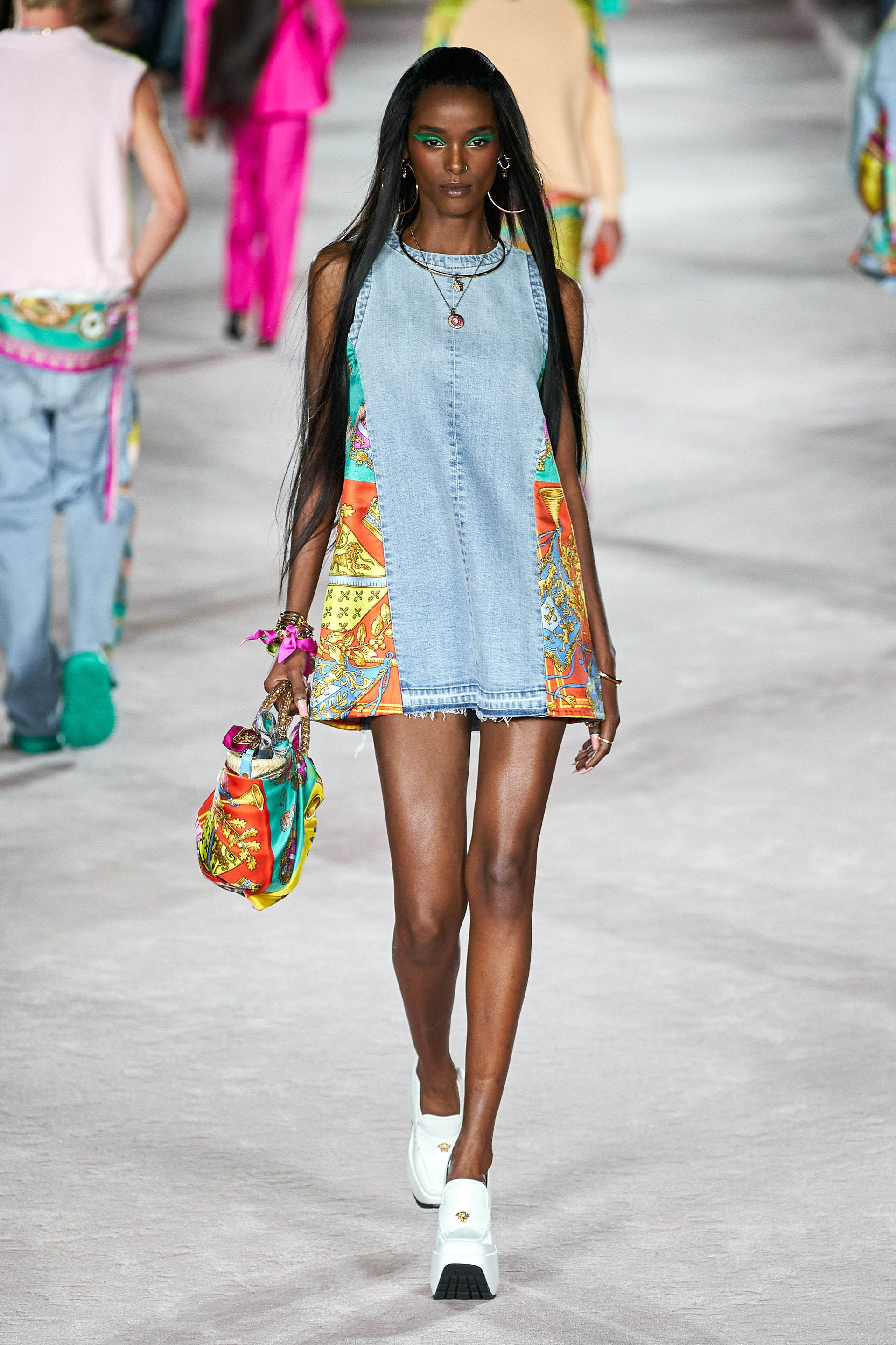 В серебристом платье, цитирующем один из главных хитов Versace из 90-х, также появилась и Лурдес Леон. Узнаваемые булавки украсили почти всю коллекцию. Также на показе были представлены шелковые пижамы, спортивные плащи-кейпы и костюмы с архивным принтом "Медуза" и La Greca. Пестрые шелковые платки превратились в мужские топы и подкладки в классических костюмах и платьях, виднеющиеся сквозь разрезы.