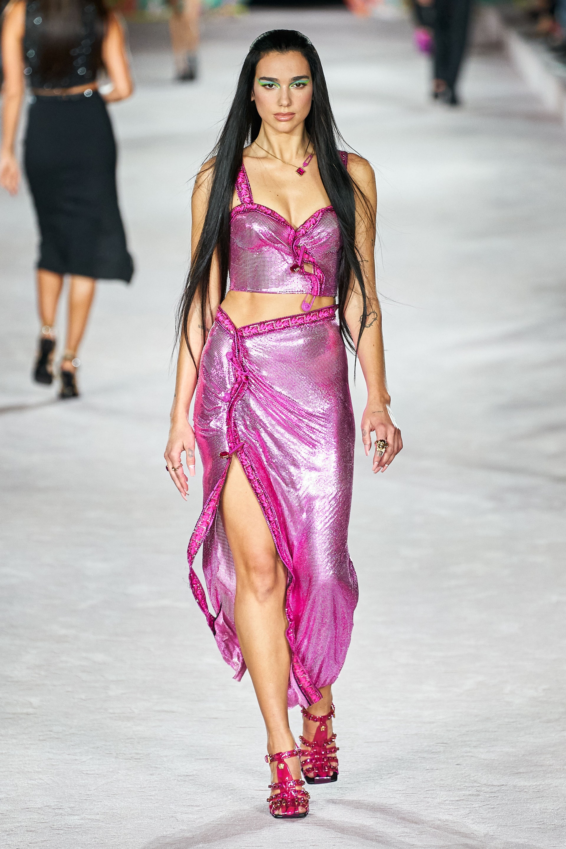 Посмотреть на своих кумиров хотели многие, так что живое шоу сопровождалось необъятной очередью. Под шелковыми сводами шатра Versace, возведенного к шоу, Дуа открыла показ в соблазнительном блейзере и юбке с разрезами, скрепленными цветными английскими булавками, а закрыла в не менее культовом металлизированном платье, выполненном в розовом цвете.