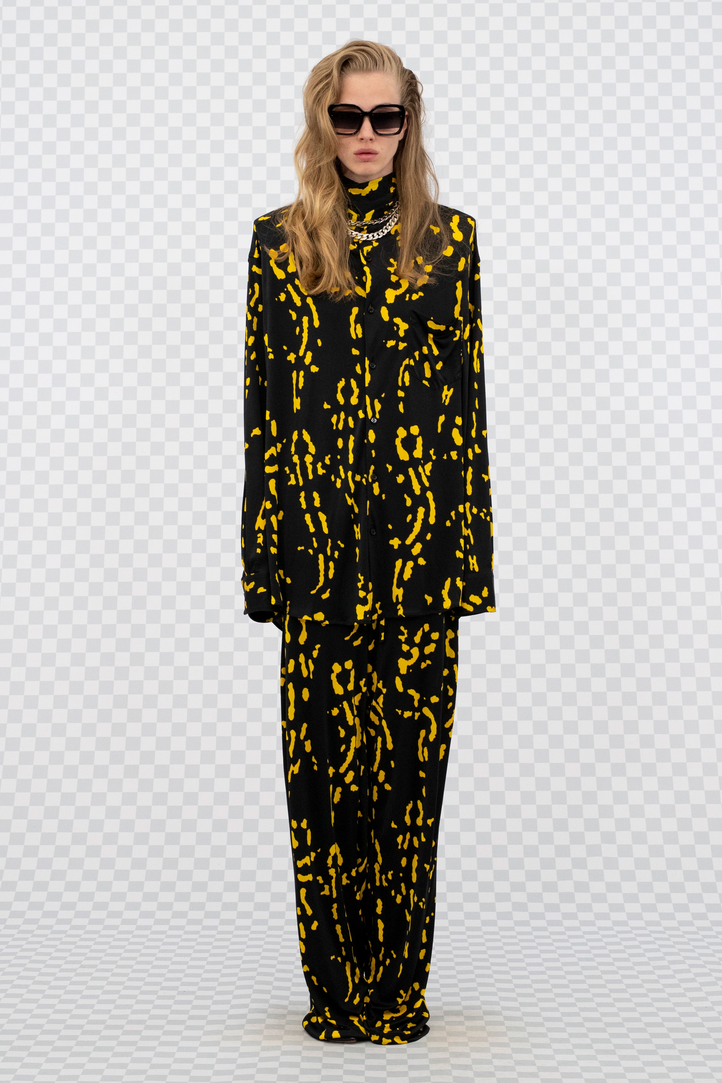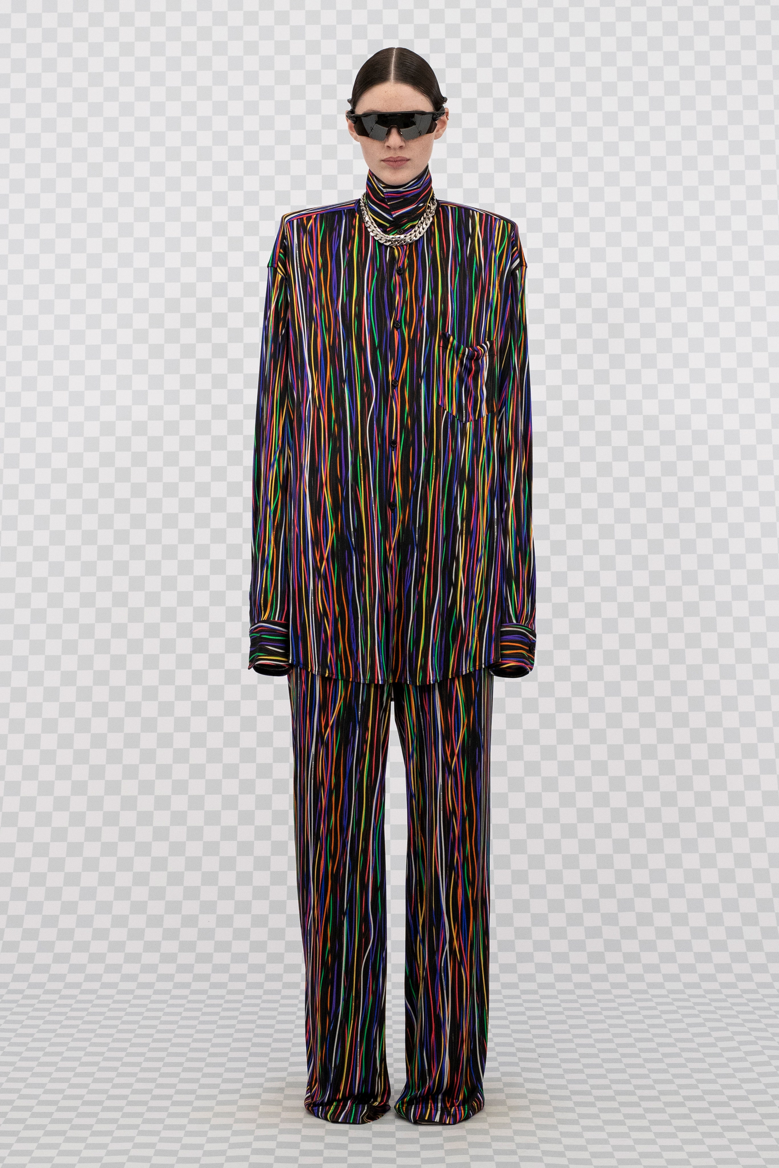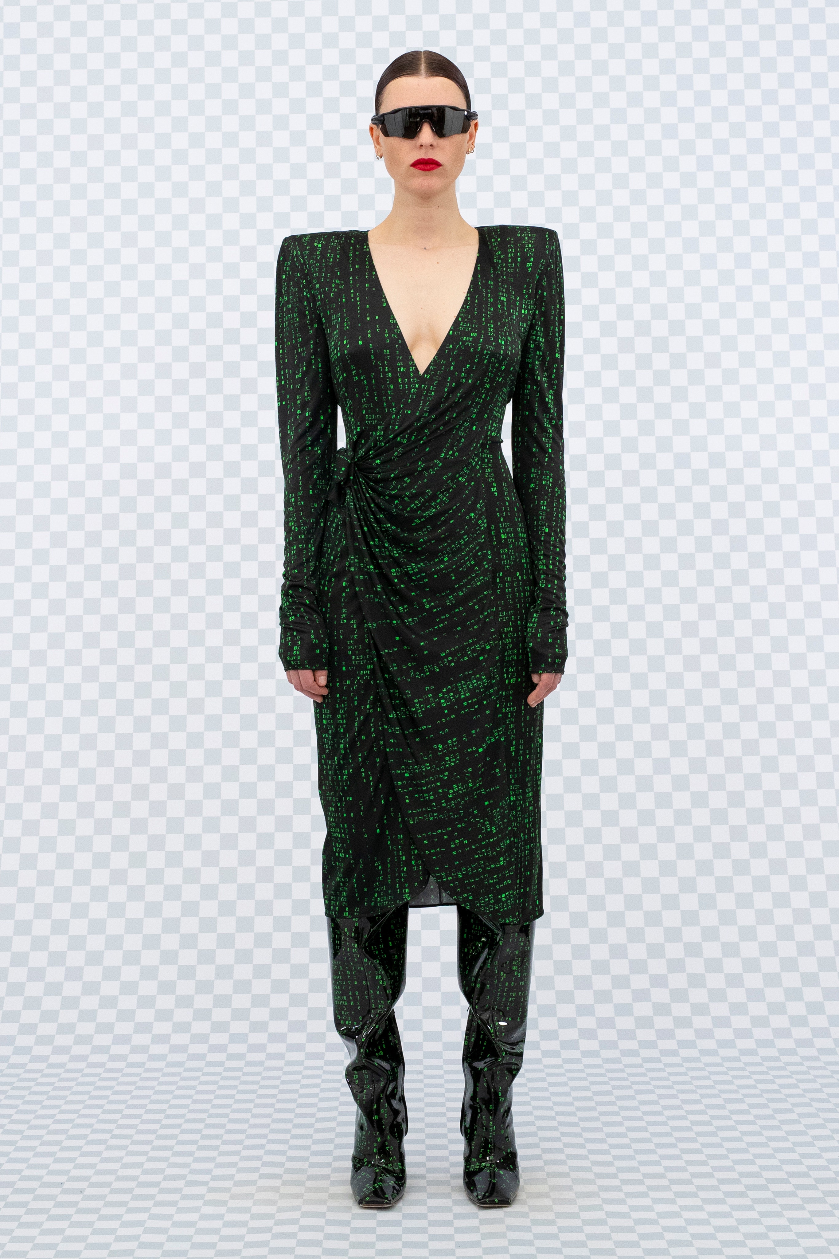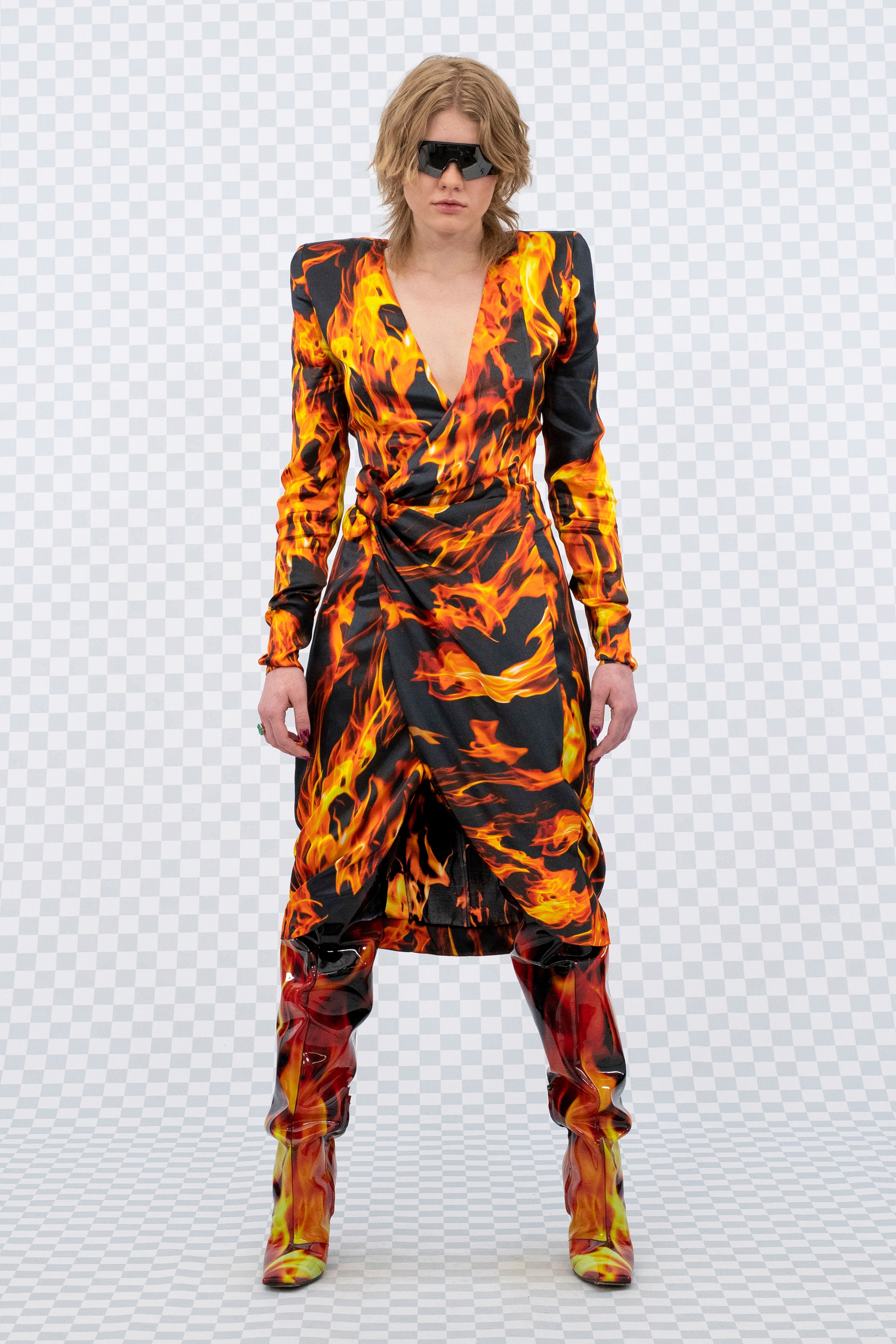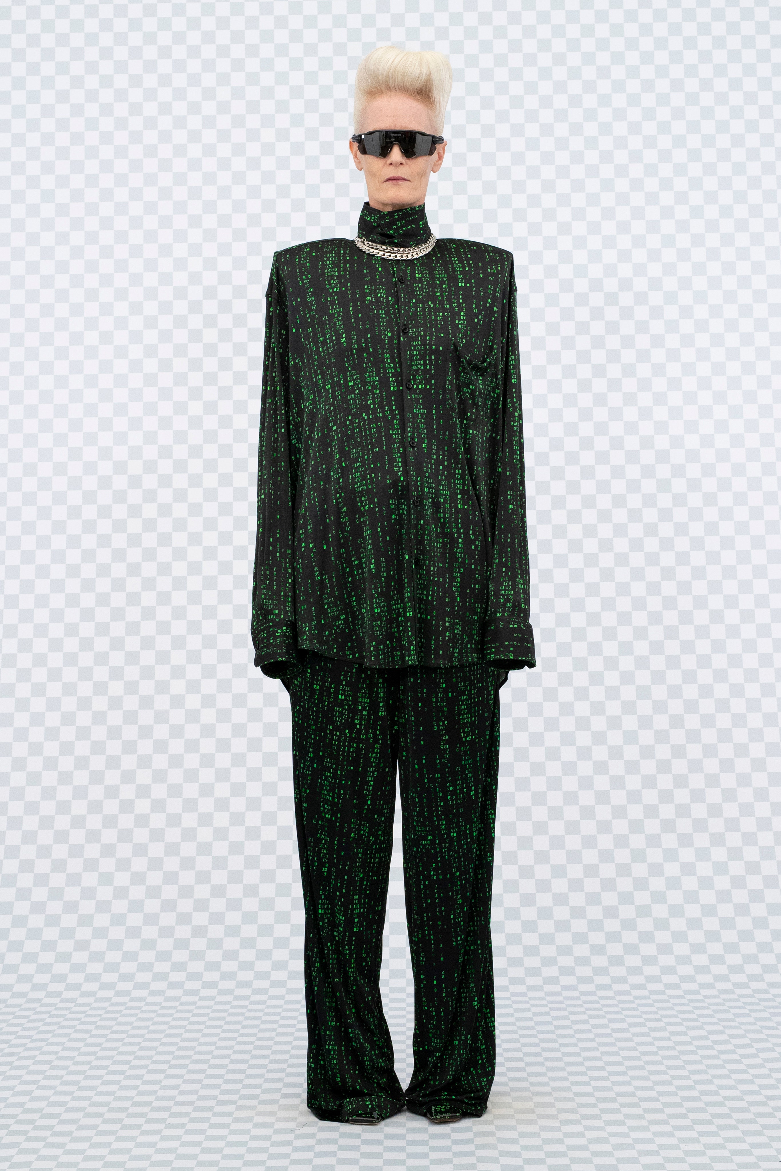 В коллекции будущей весны содержатся узнаваемые коды этой двухмерной реальности, в которую мы так погружены через свои смартфоны и компьютеры. К примеру, лукбук представлен на стандартном для приложения Photoshop сером шахматном фоне (насколько правдивы изображения, которые мы видим в Instagram?), а на моногольфах, рубашках, платьях и топах разместились принты в виде цифрового кода из культового фильма "Матрица", оптических элементов вроде разноцветных полос и графических языков пламени. Эти узоры разбавлены и более природными, например узором спинки саламандры и почти пасторальными, пышными букетами роз — намек на всеобщее стремление заново воссоединиться с природой в рамках невозможности отринуть цифровые реалии.