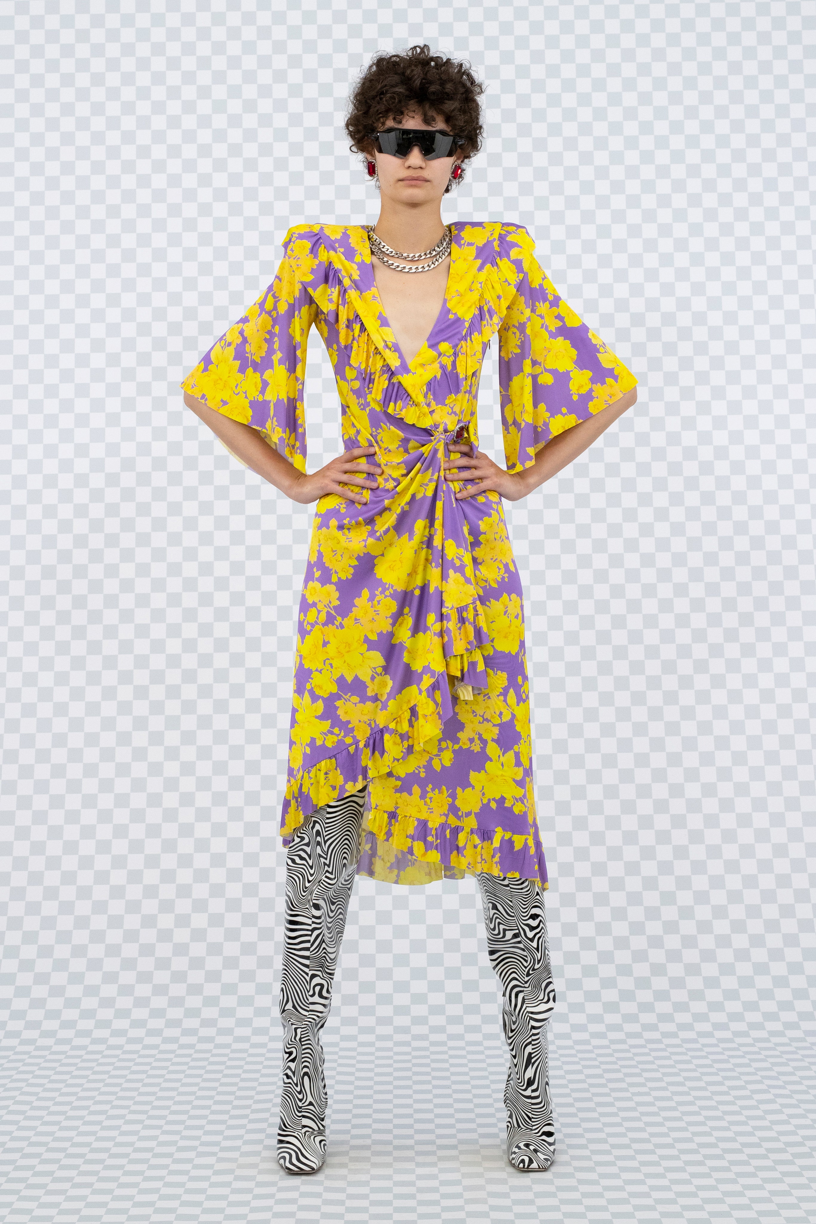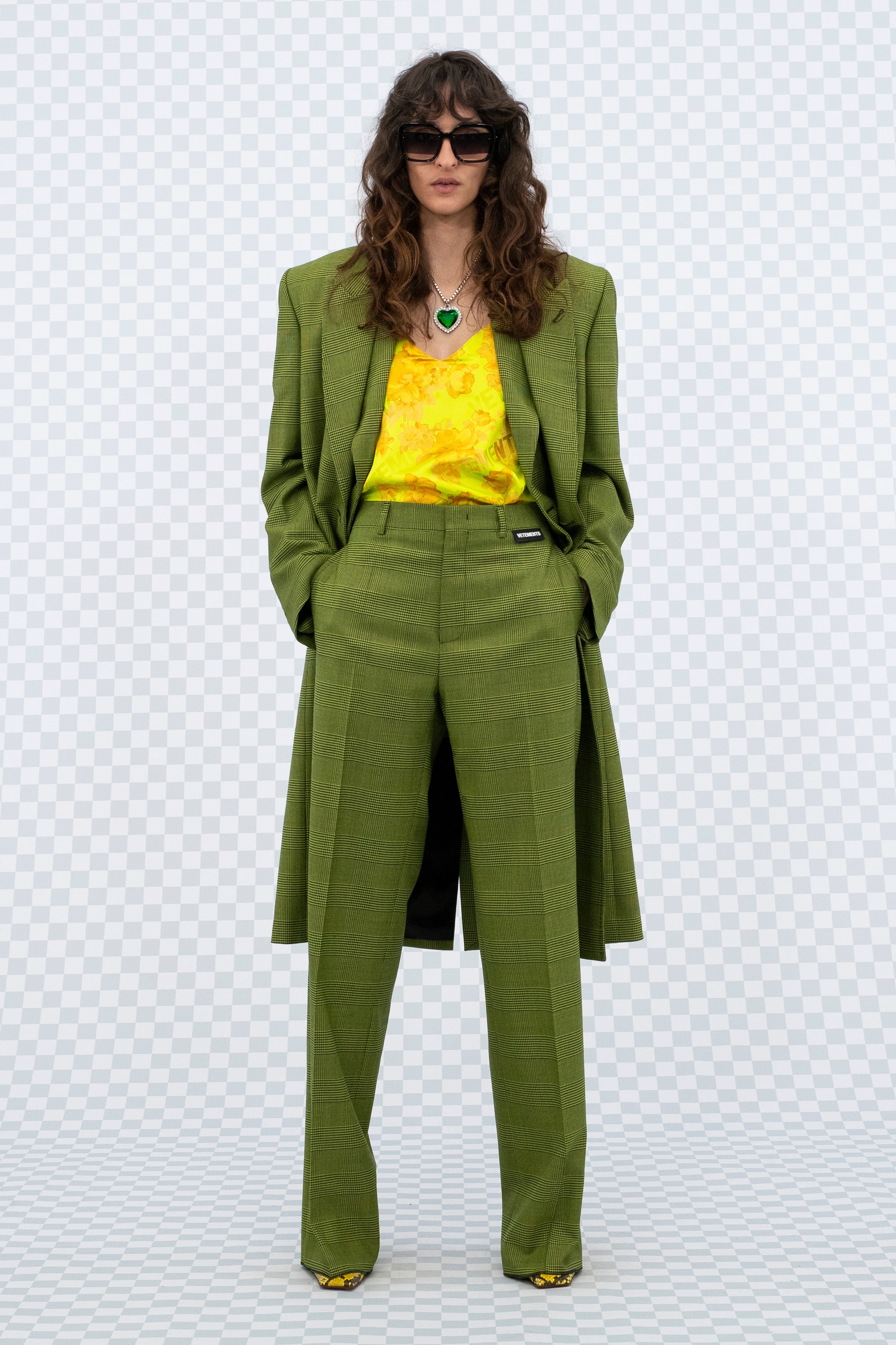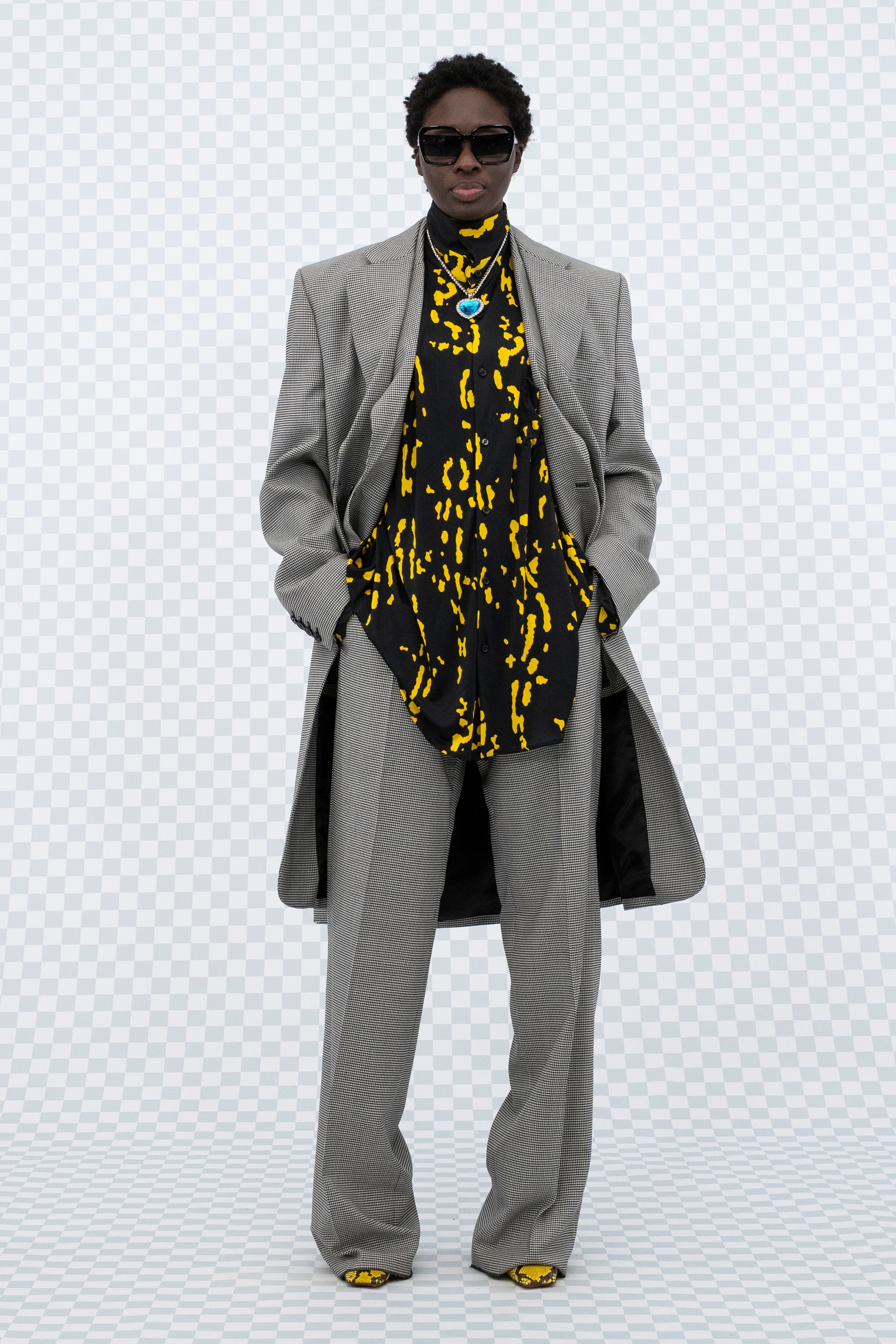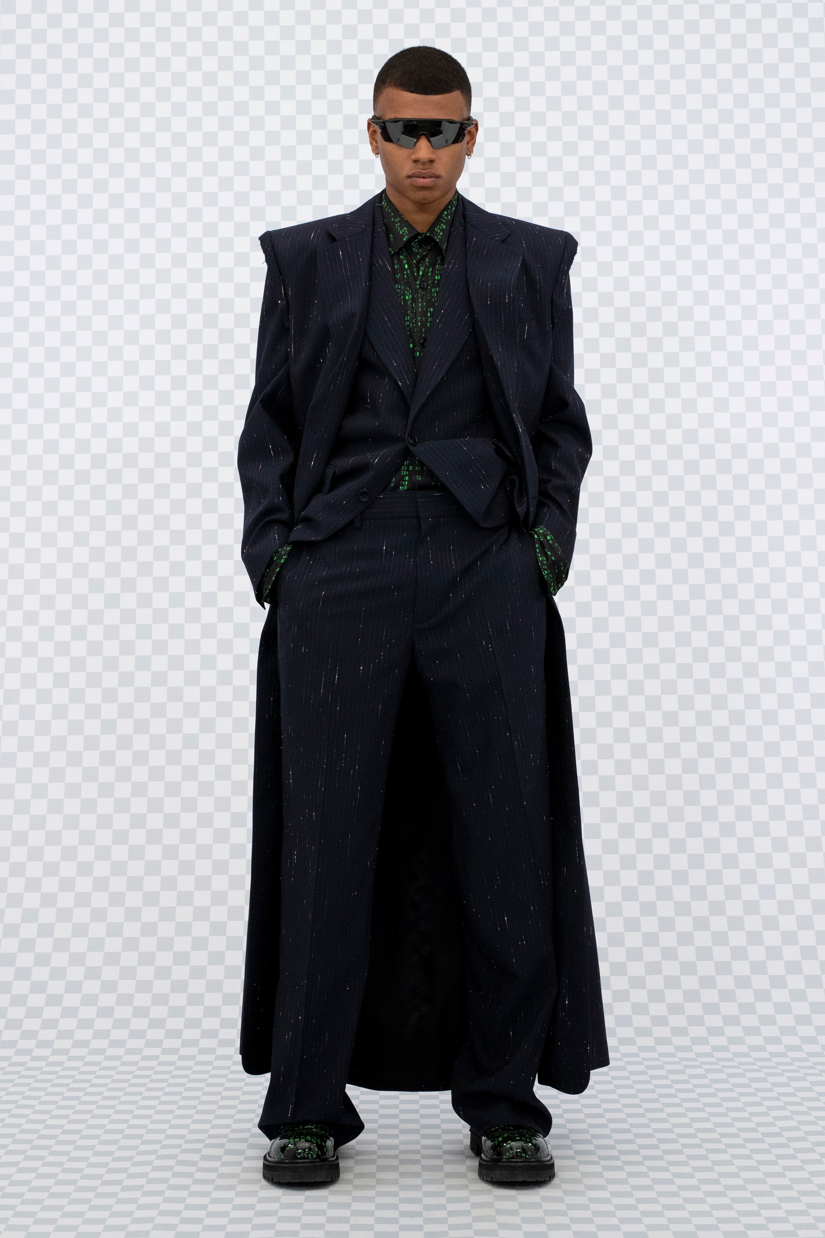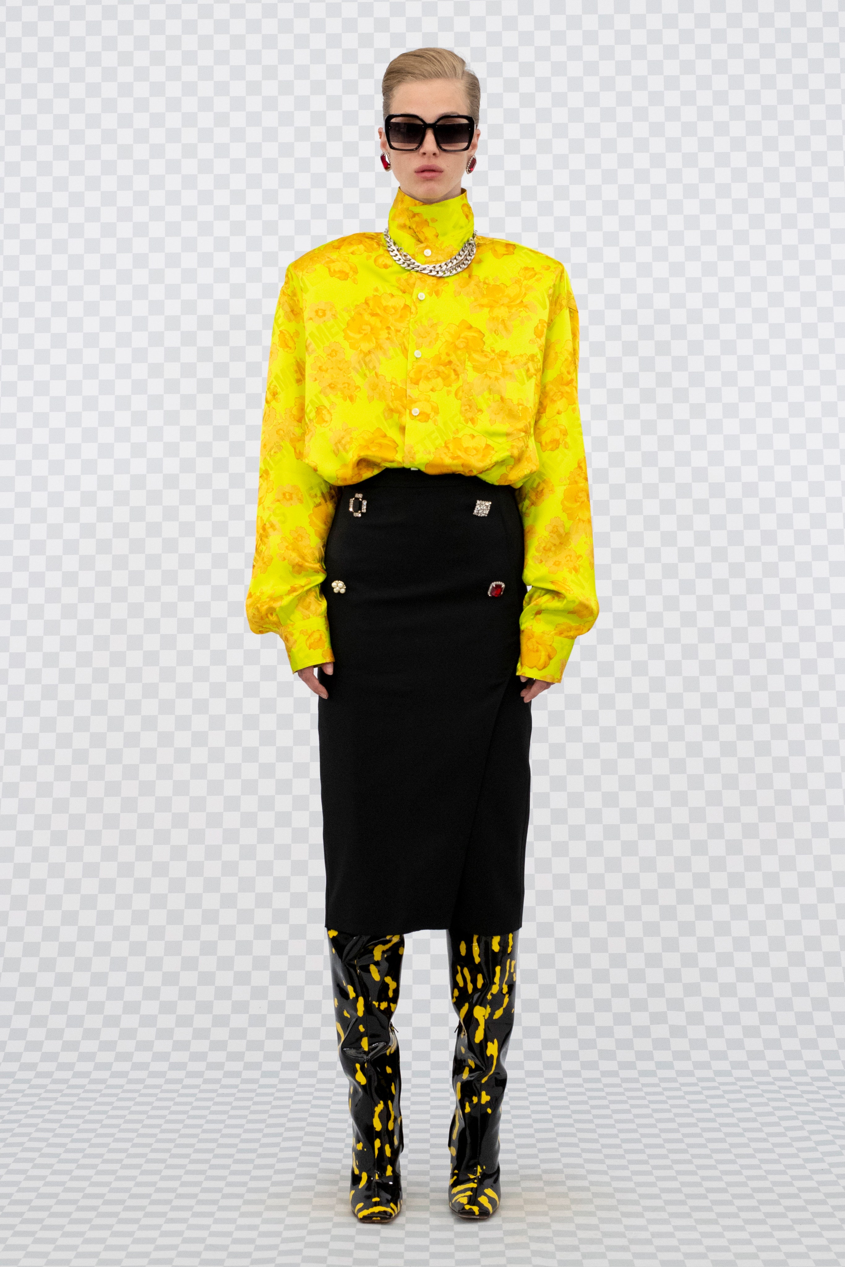 В коллекции будущей весны содержатся узнаваемые коды этой двухмерной реальности, в которую мы так погружены через свои смартфоны и компьютеры. К примеру, лукбук представлен на стандартном для приложения Photoshop сером шахматном фоне (насколько правдивы изображения, которые мы видим в Instagram?), а на моногольфах, рубашках, платьях и топах разместились принты в виде цифрового кода из культового фильма "Матрица", оптических элементов вроде разноцветных полос и графических языков пламени. Эти узоры разбавлены и более природными, например узором спинки саламандры и почти пасторальными, пышными букетами роз — намек на всеобщее стремление заново воссоединиться с природой в рамках невозможности отринуть цифровые реалии.