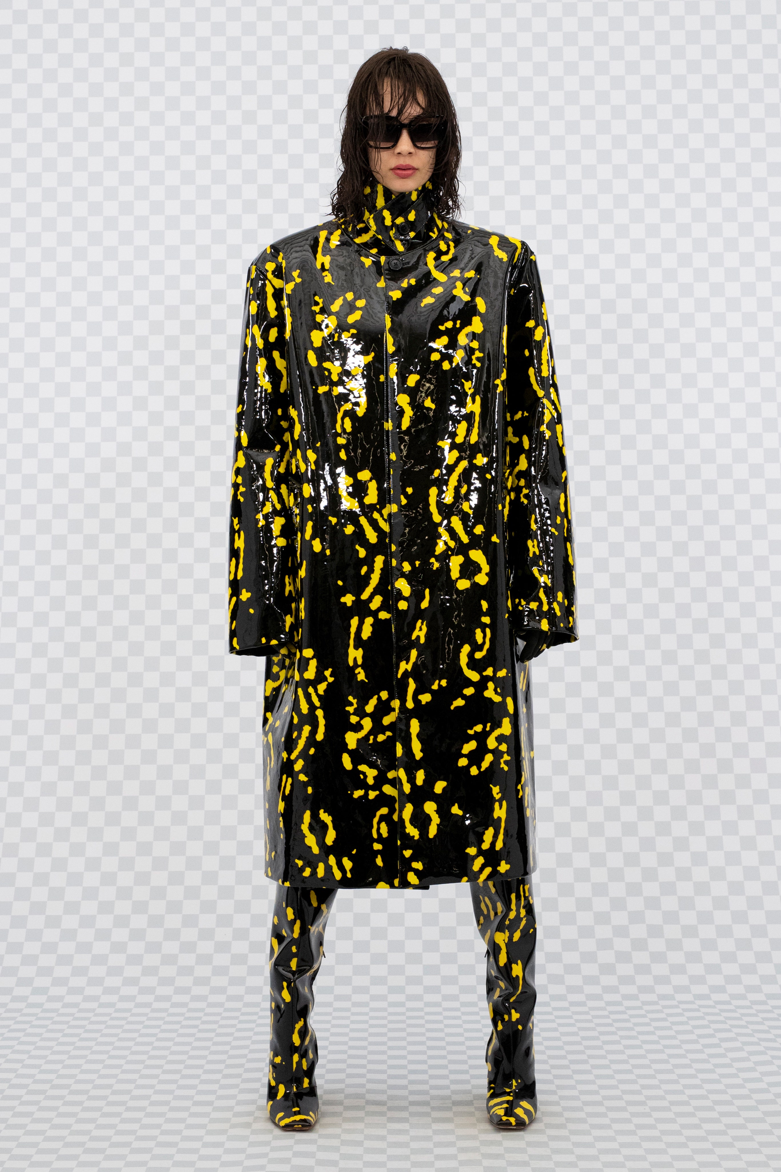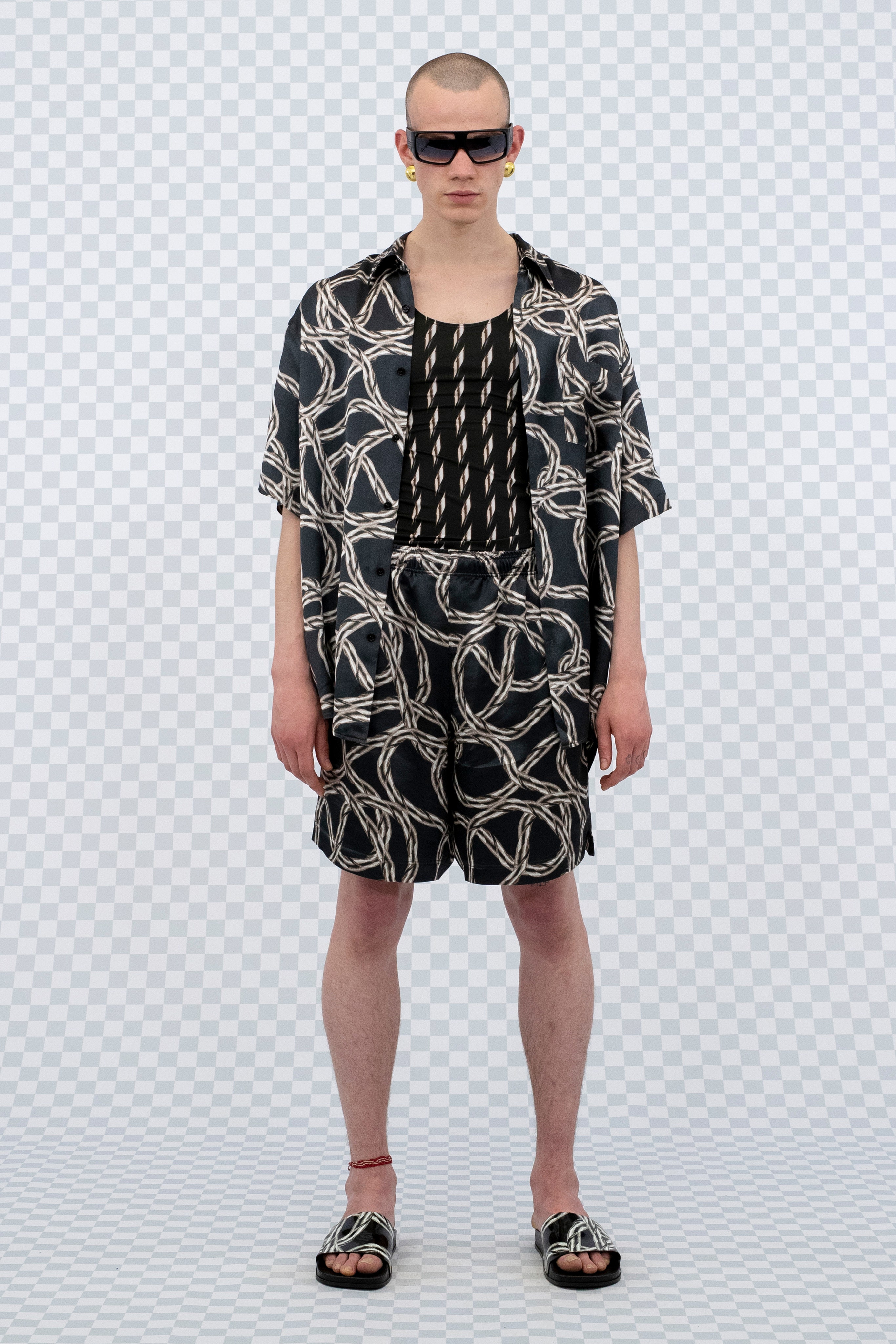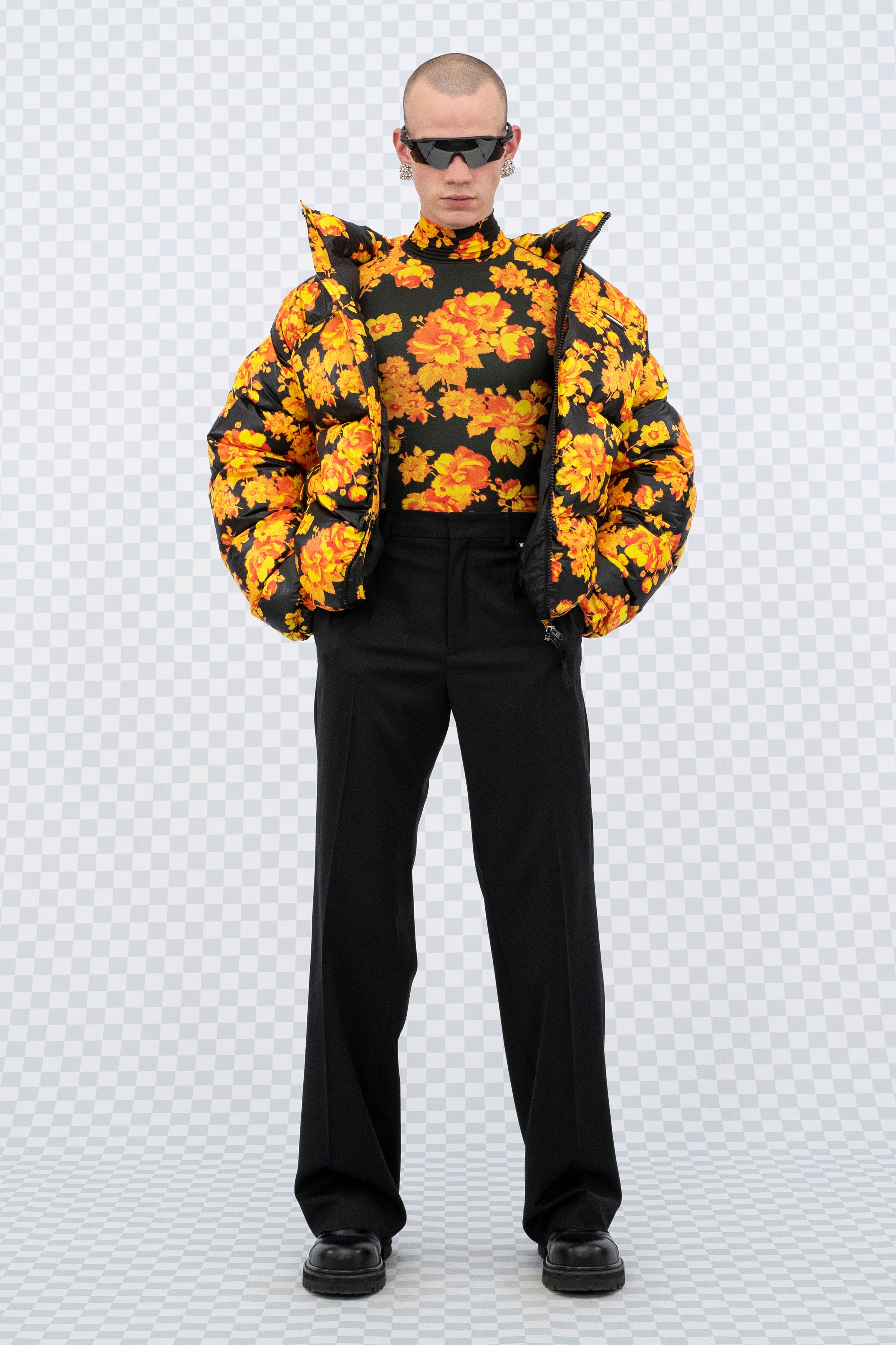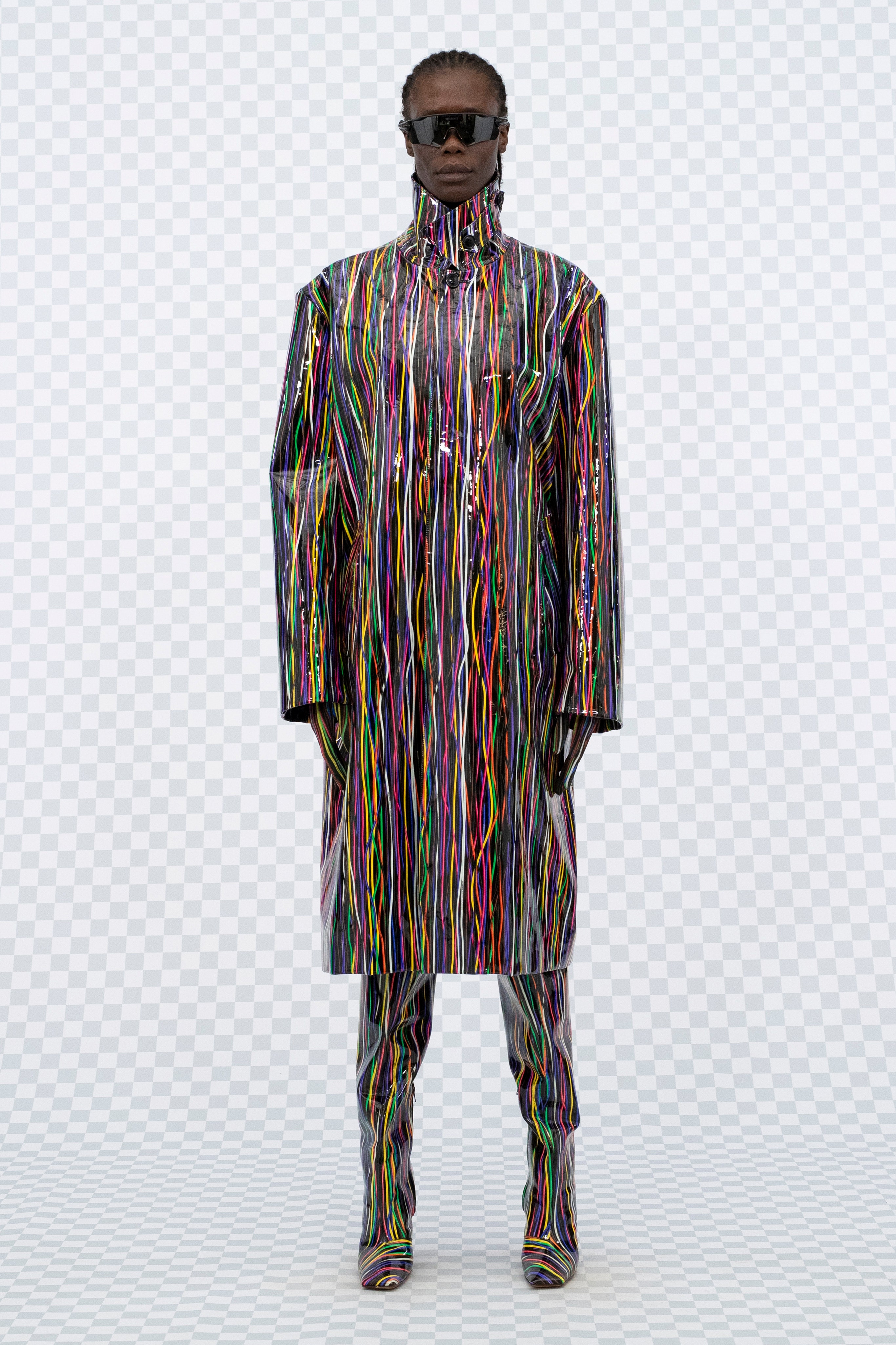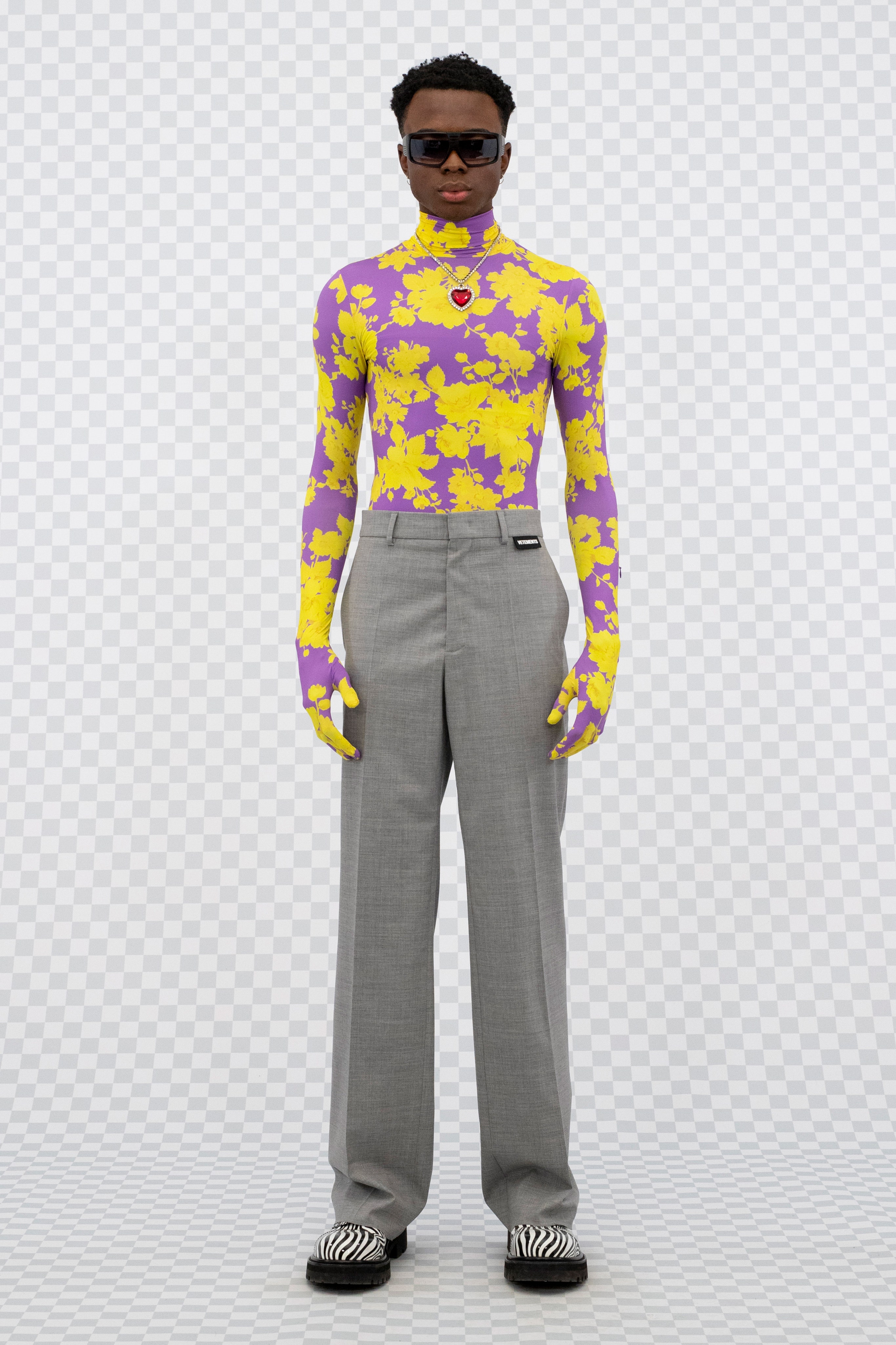 В коллекции будущей весны содержатся узнаваемые коды этой двухмерной реальности, в которую мы так погружены через свои смартфоны и компьютеры. К примеру, лукбук представлен на стандартном для приложения Photoshop сером шахматном фоне (насколько правдивы изображения, которые мы видим в Instagram?), а на моногольфах, рубашках, платьях и топах разместились принты в виде цифрового кода из культового фильма "Матрица", оптических элементов вроде разноцветных полос и графических языков пламени. Эти узоры разбавлены и более природными, например узором спинки саламандры и почти пасторальными, пышными букетами роз — намек на всеобщее стремление заново воссоединиться с природой в рамках невозможности отринуть цифровые реалии.