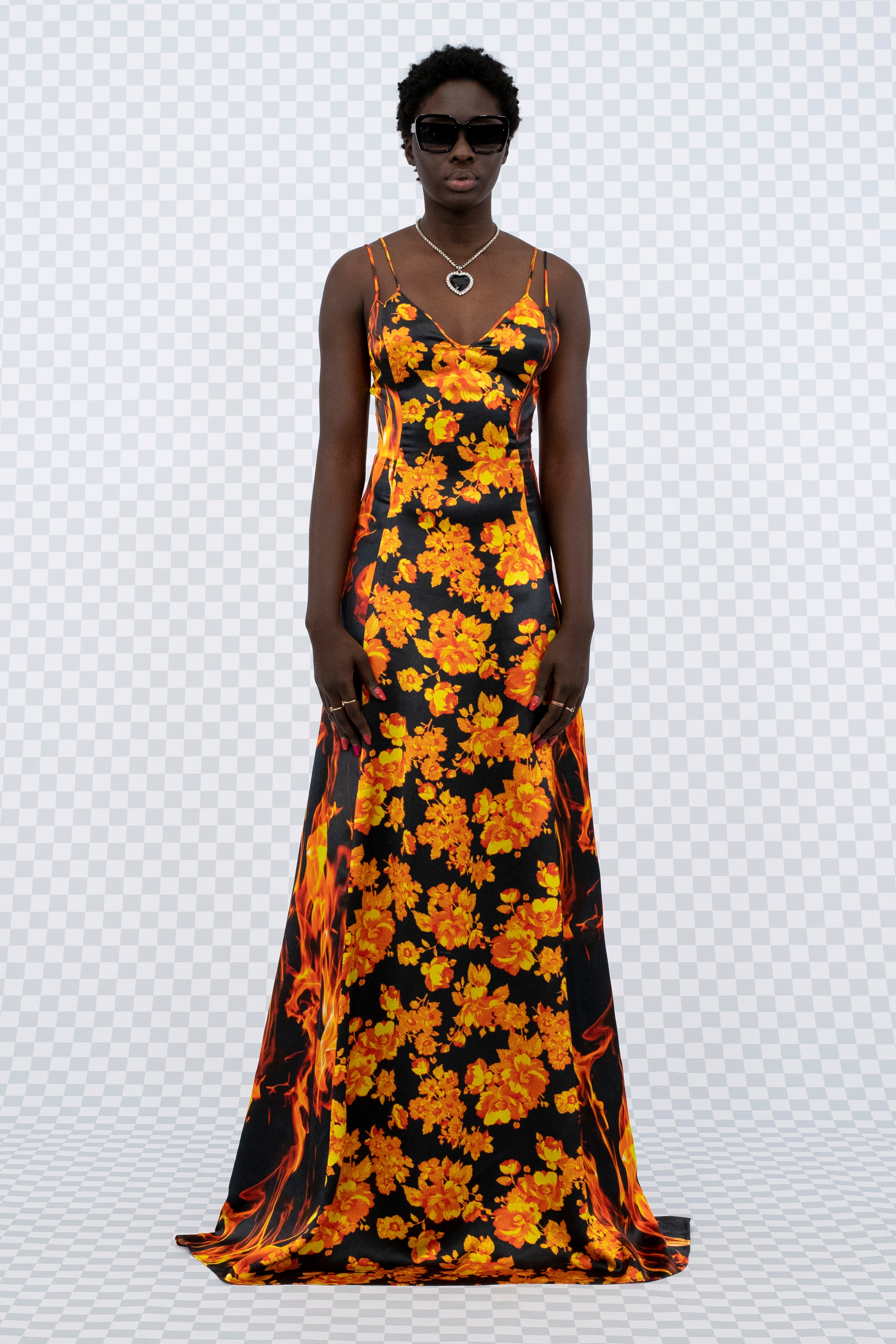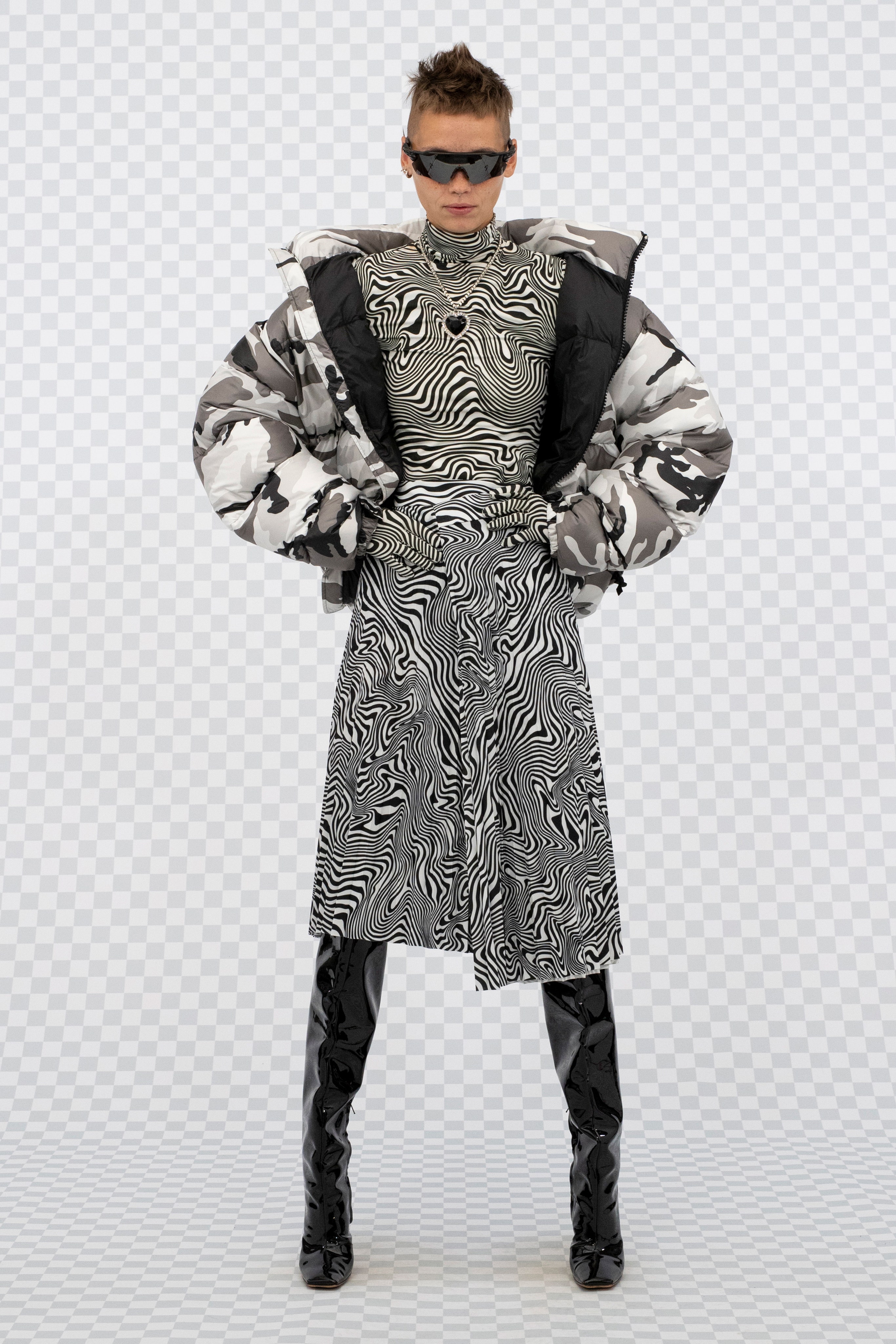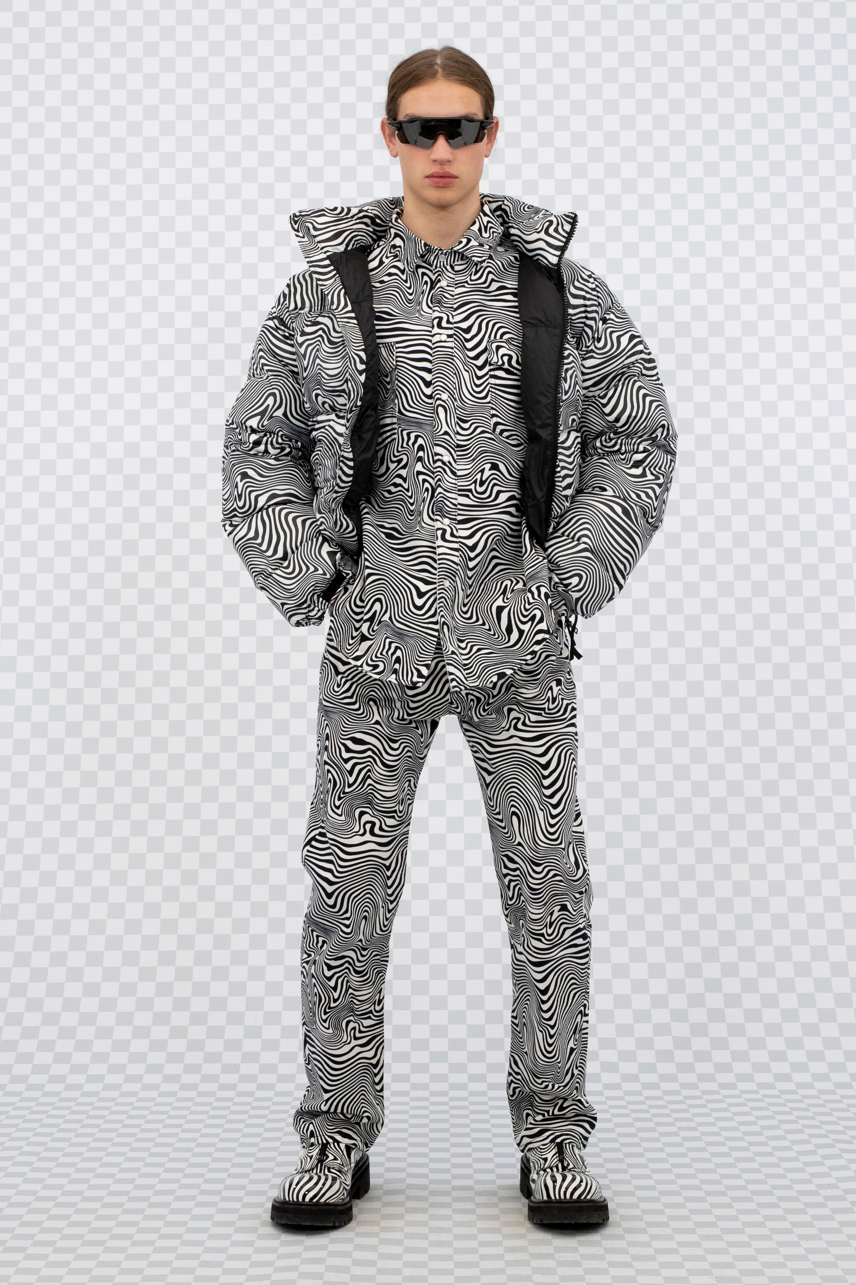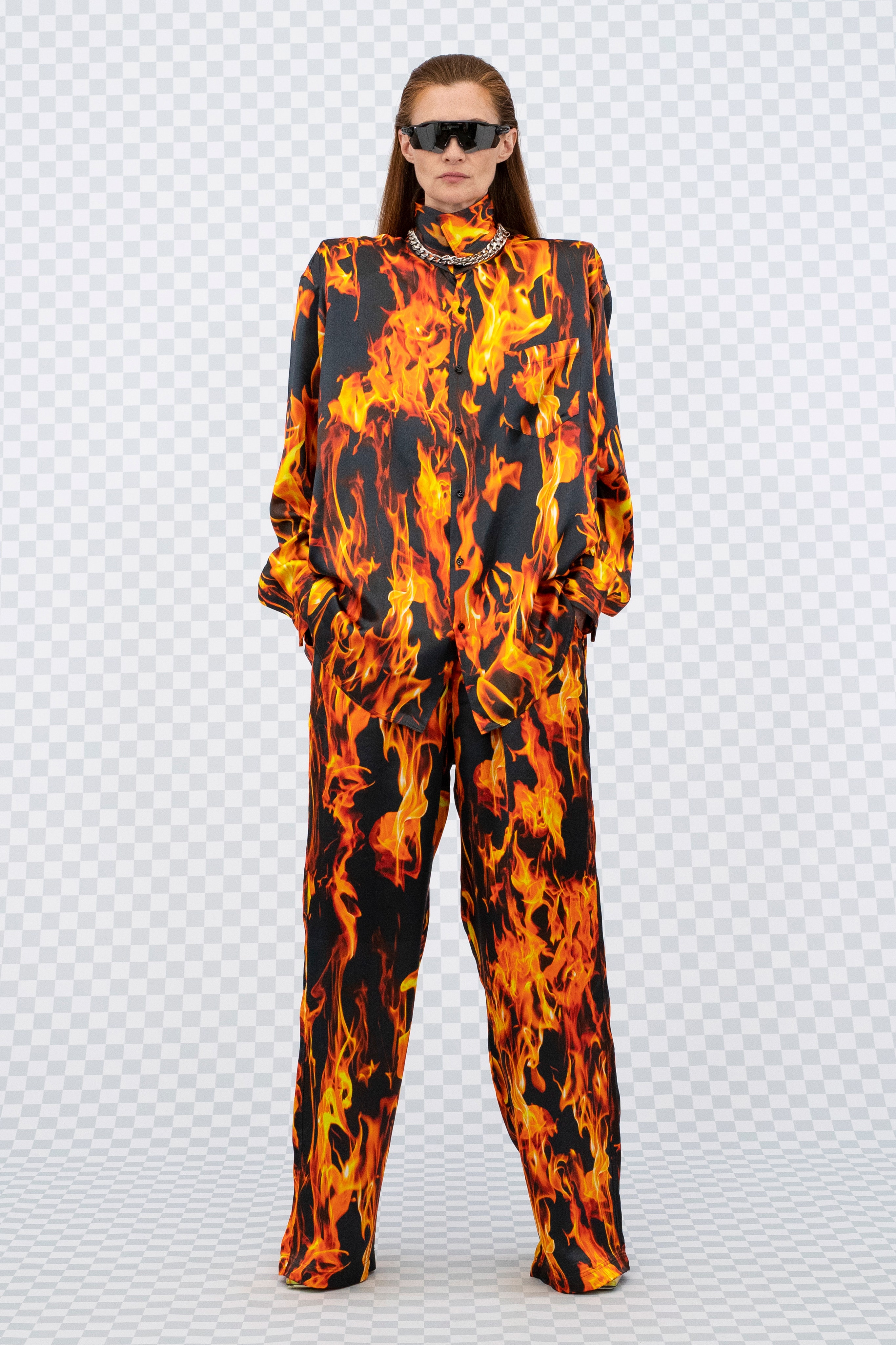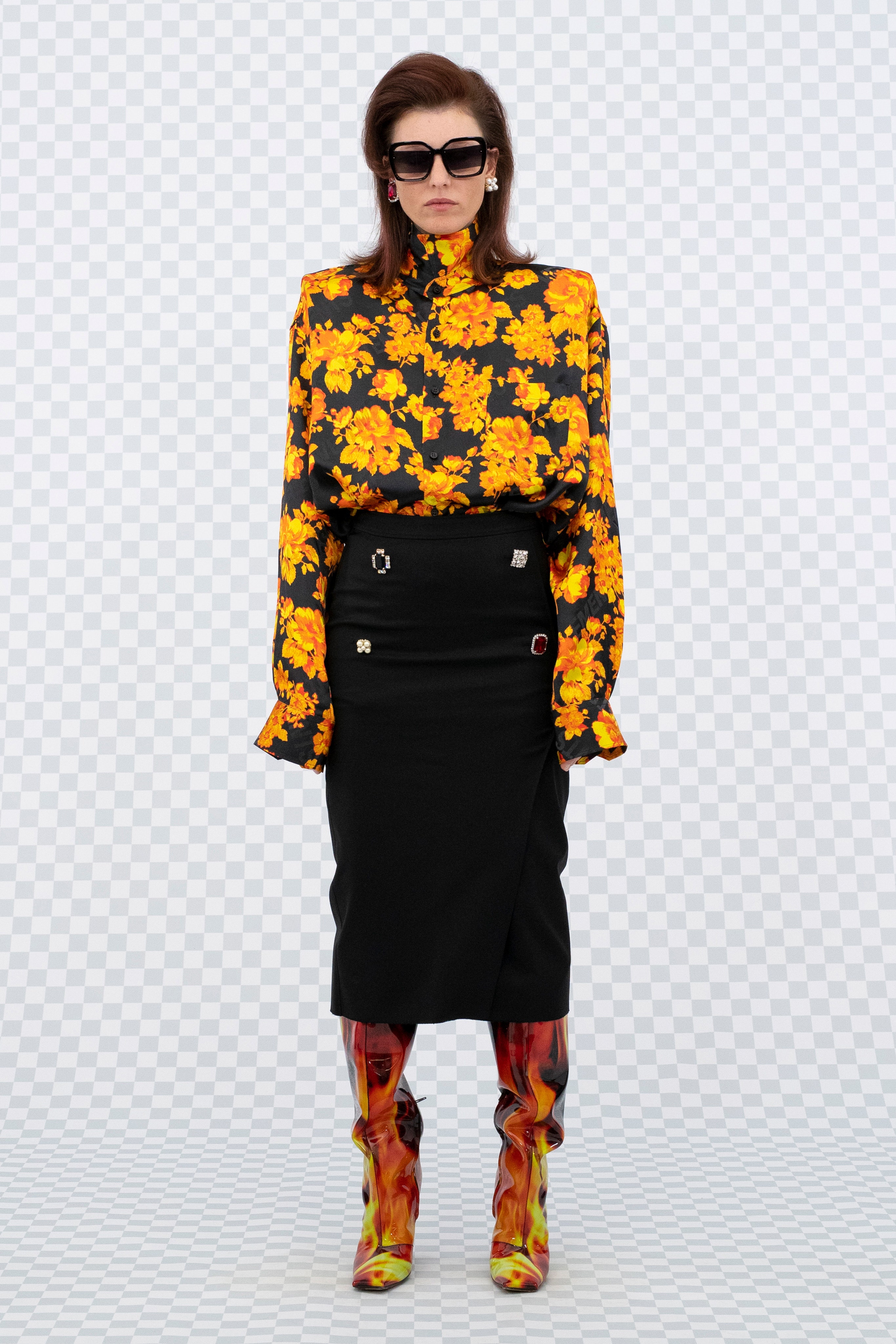 В коллекции будущей весны содержатся узнаваемые коды этой двухмерной реальности, в которую мы так погружены через свои смартфоны и компьютеры. К примеру, лукбук представлен на стандартном для приложения Photoshop сером шахматном фоне (насколько правдивы изображения, которые мы видим в Instagram?), а на моногольфах, рубашках, платьях и топах разместились принты в виде цифрового кода из культового фильма "Матрица", оптических элементов вроде разноцветных полос и графических языков пламени. Эти узоры разбавлены и более природными, например узором спинки саламандры и почти пасторальными, пышными букетами роз — намек на всеобщее стремление заново воссоединиться с природой в рамках невозможности отринуть цифровые реалии.