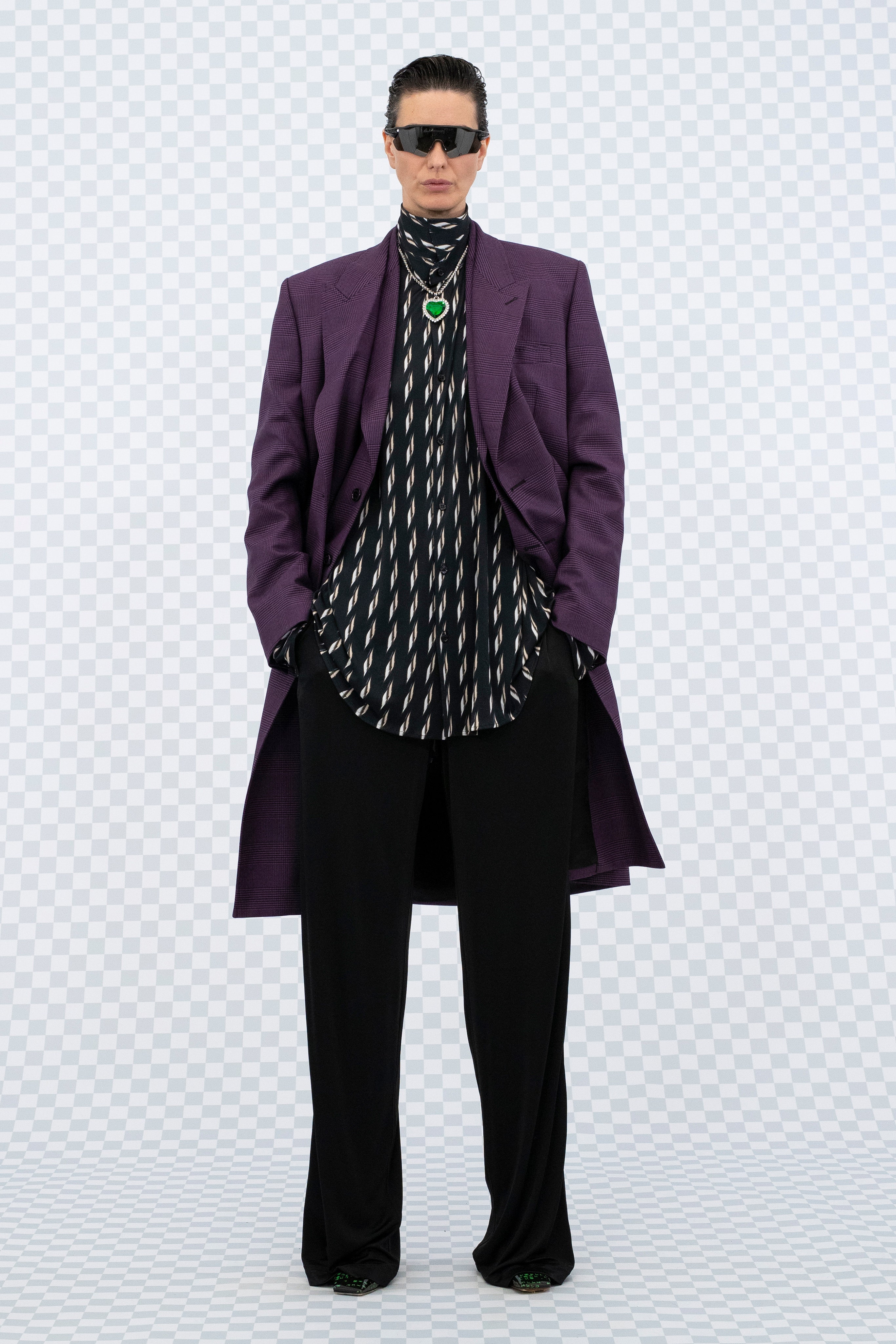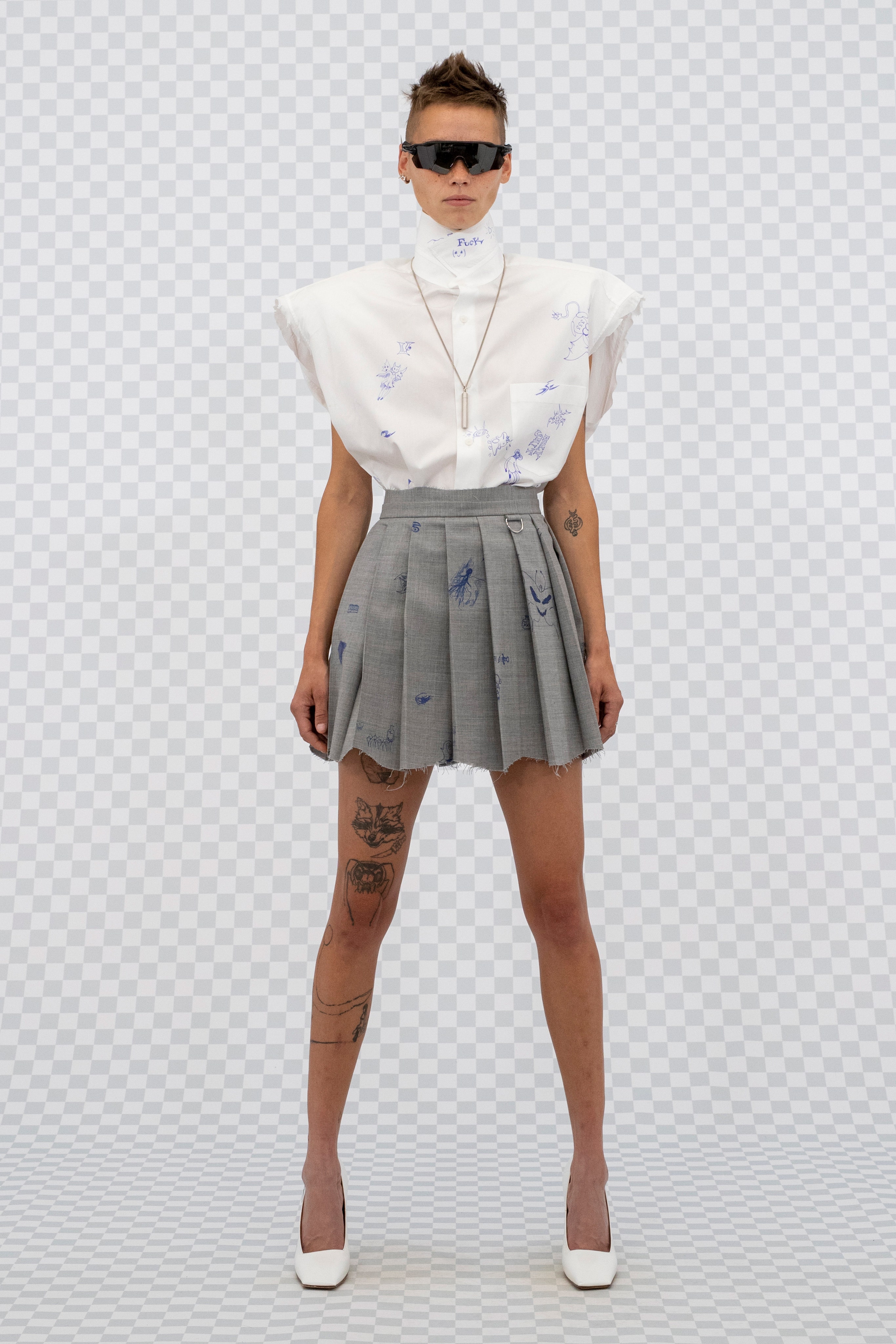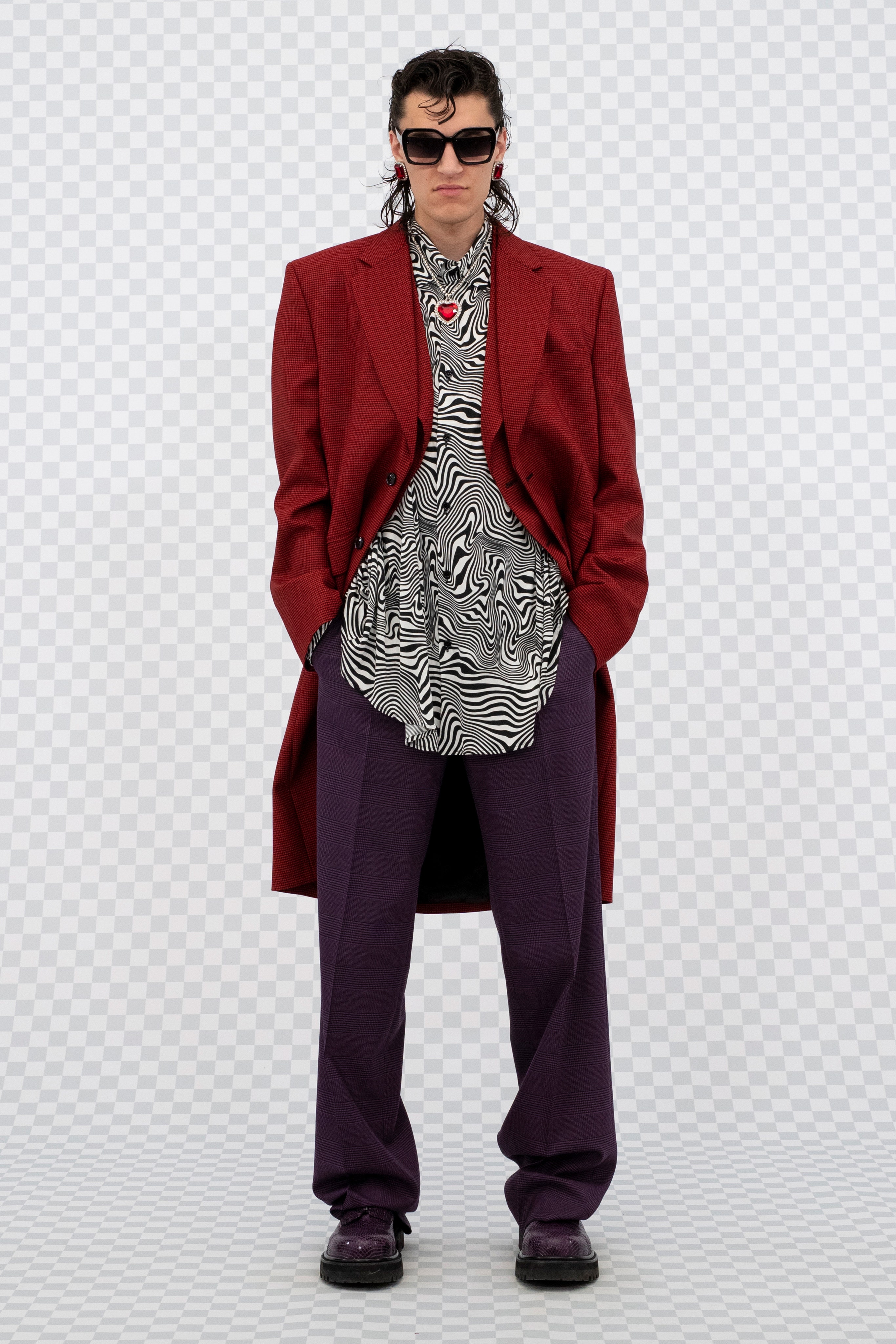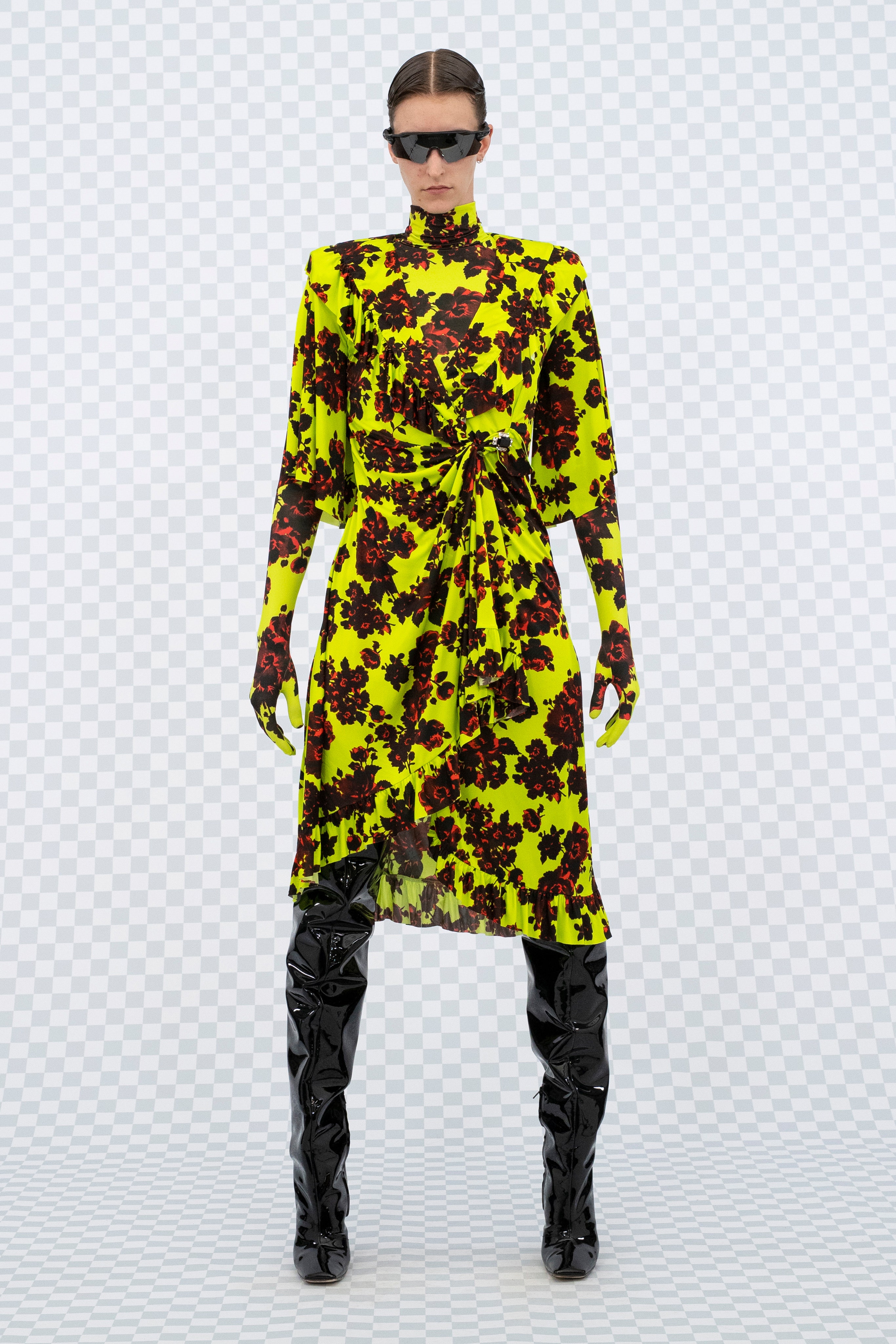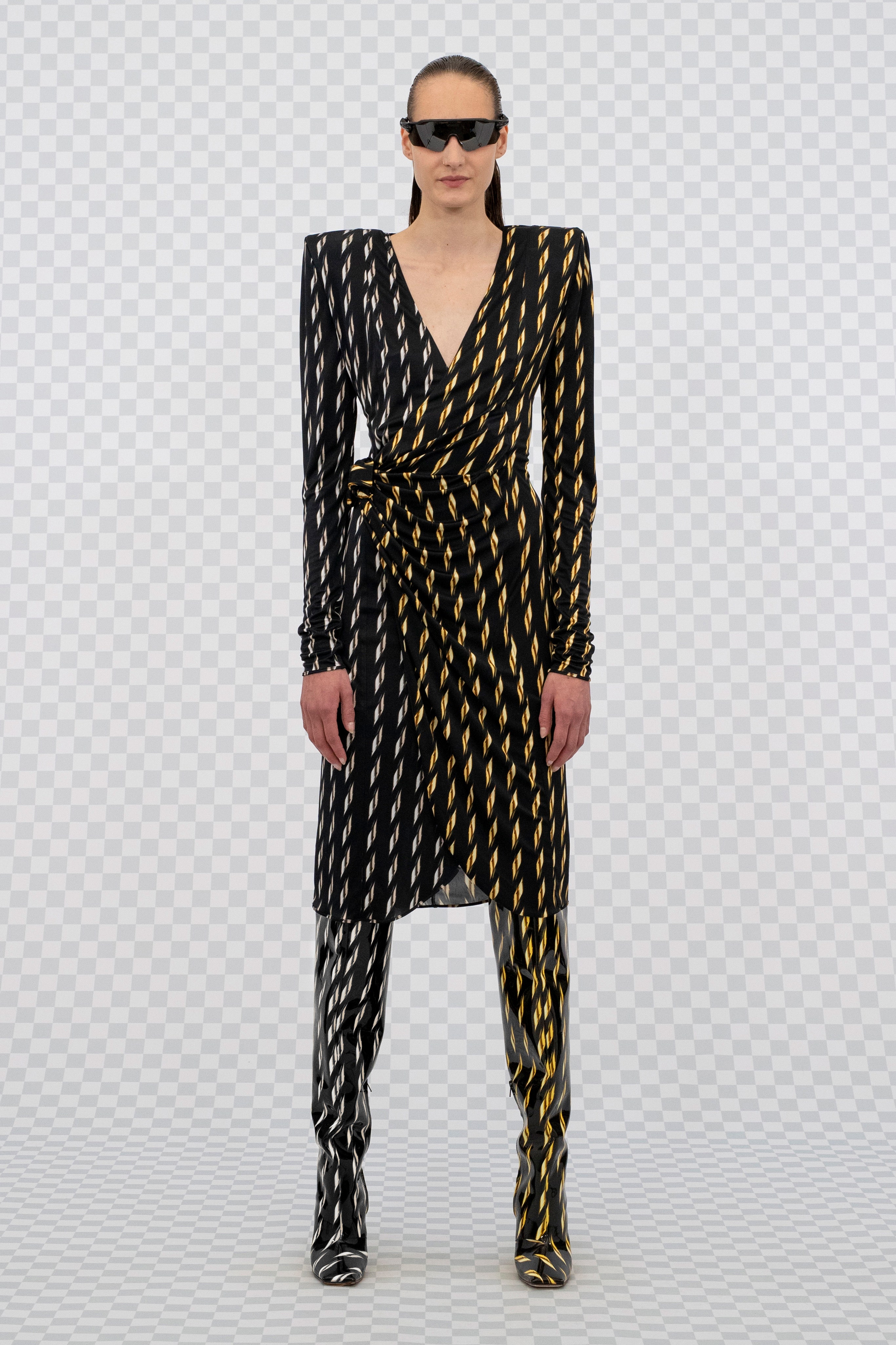 В коллекции будущей весны содержатся узнаваемые коды этой двухмерной реальности, в которую мы так погружены через свои смартфоны и компьютеры. К примеру, лукбук представлен на стандартном для приложения Photoshop сером шахматном фоне (насколько правдивы изображения, которые мы видим в Instagram?), а на моногольфах, рубашках, платьях и топах разместились принты в виде цифрового кода из культового фильма "Матрица", оптических элементов вроде разноцветных полос и графических языков пламени. Эти узоры разбавлены и более природными, например узором спинки саламандры и почти пасторальными, пышными букетами роз — намек на всеобщее стремление заново воссоединиться с природой в рамках невозможности отринуть цифровые реалии.