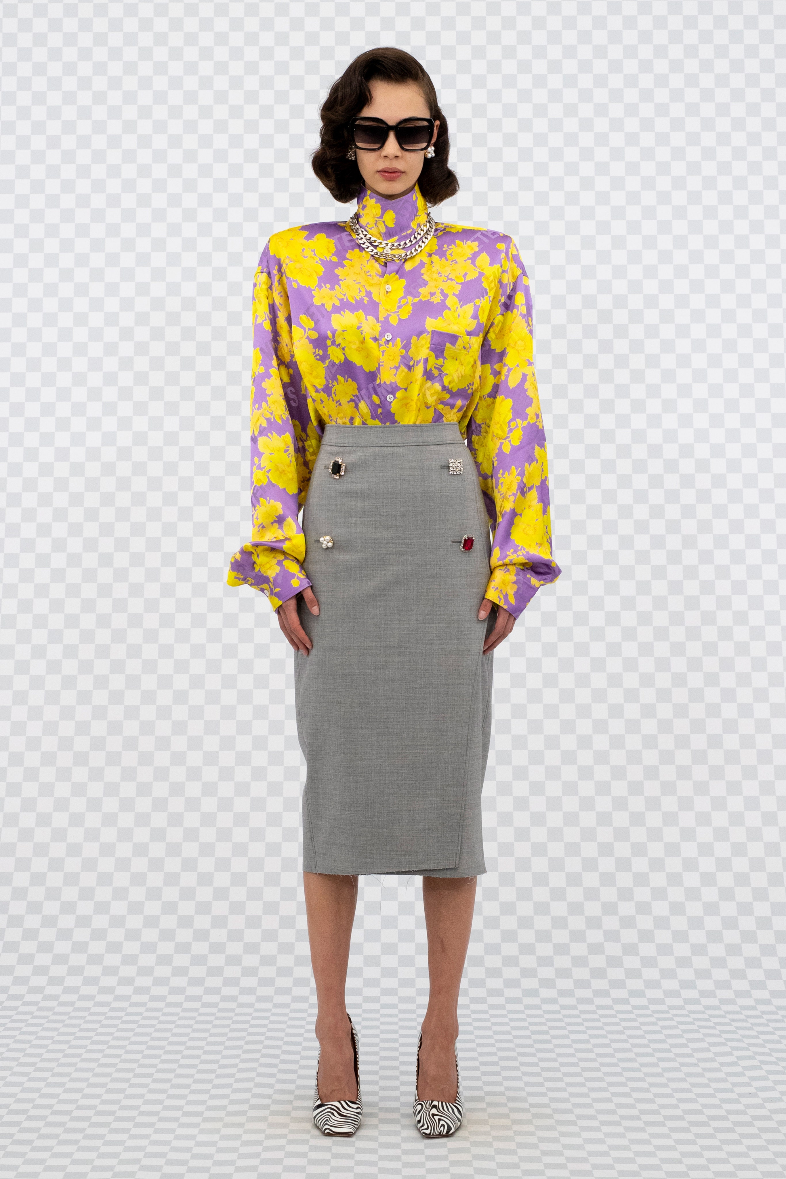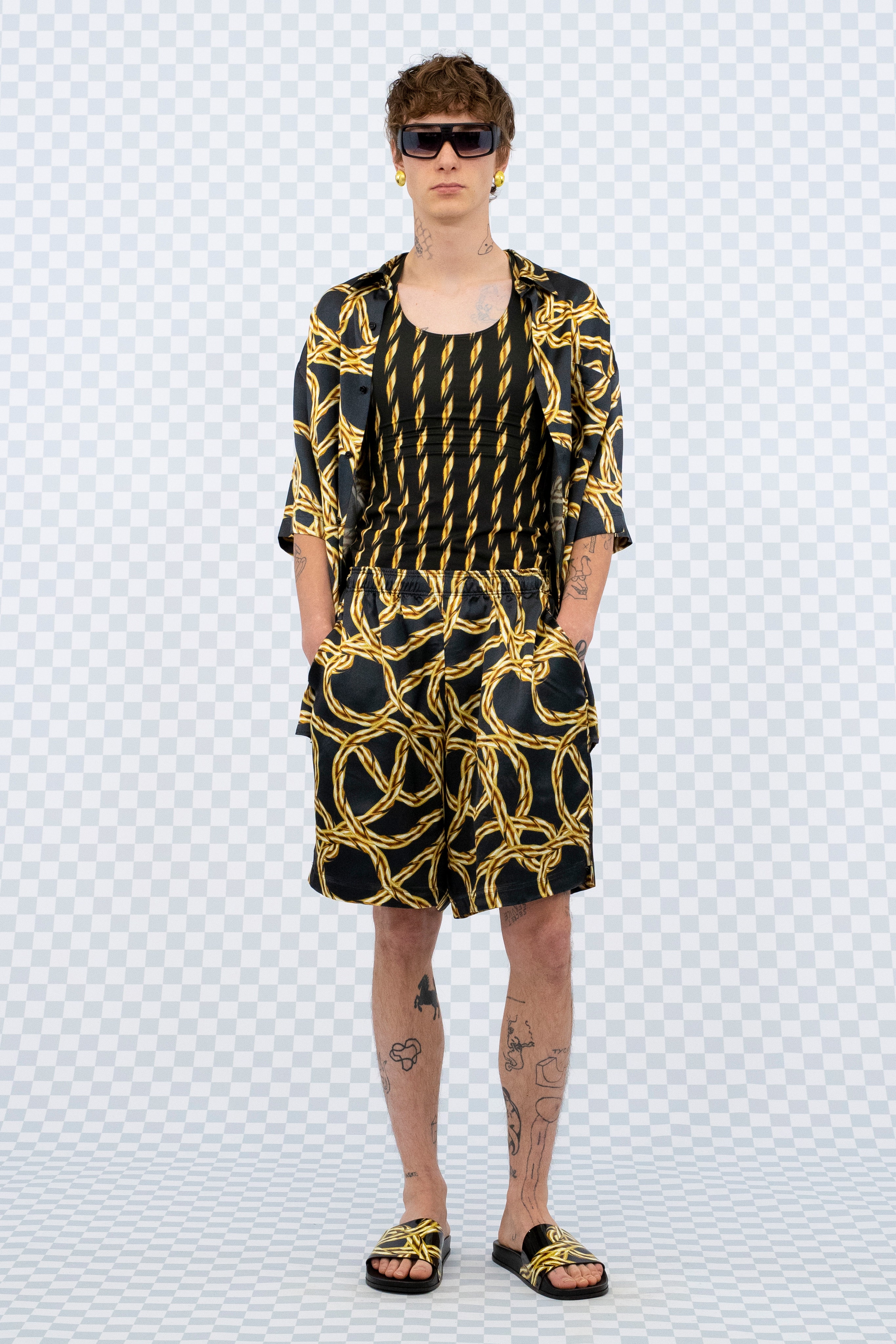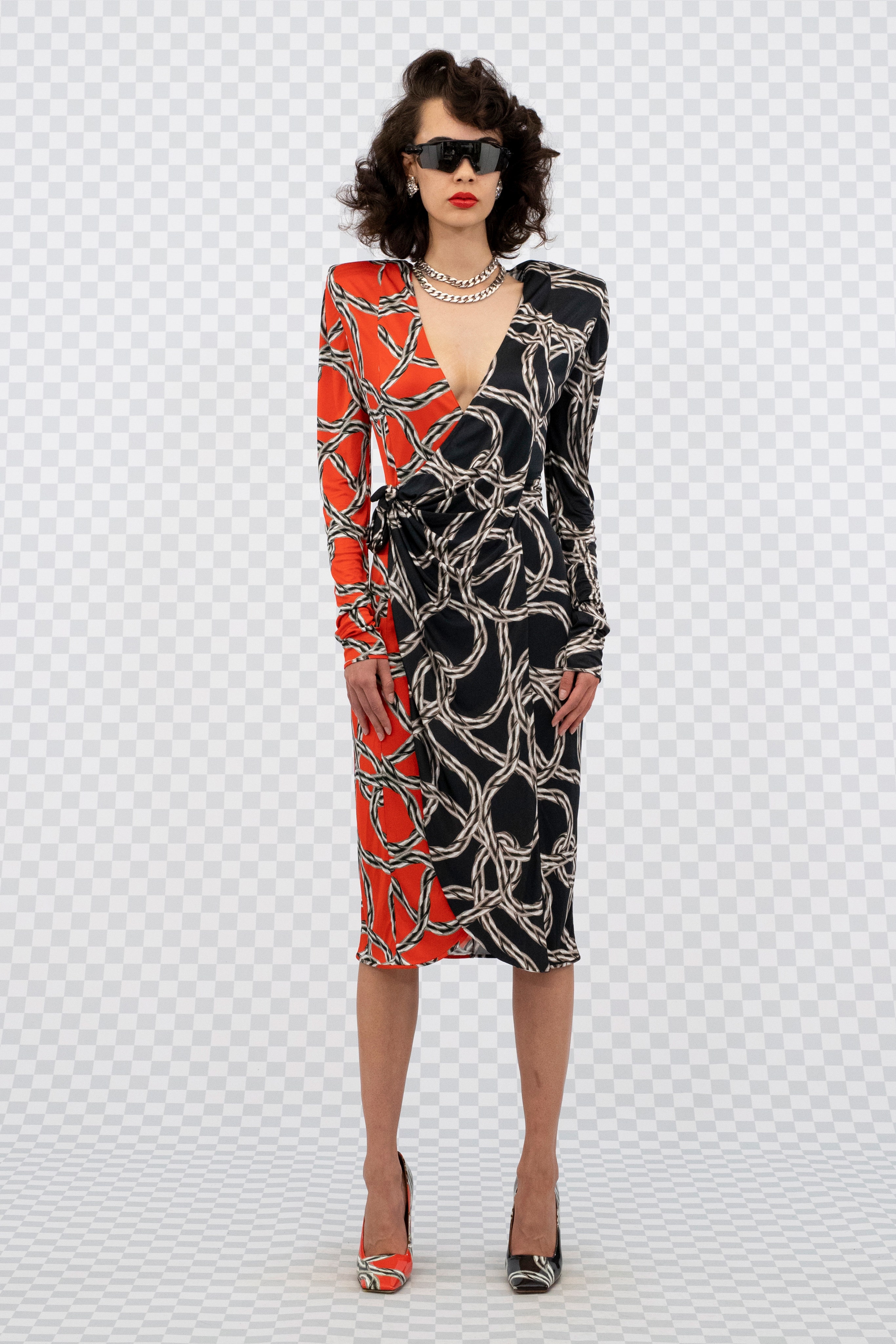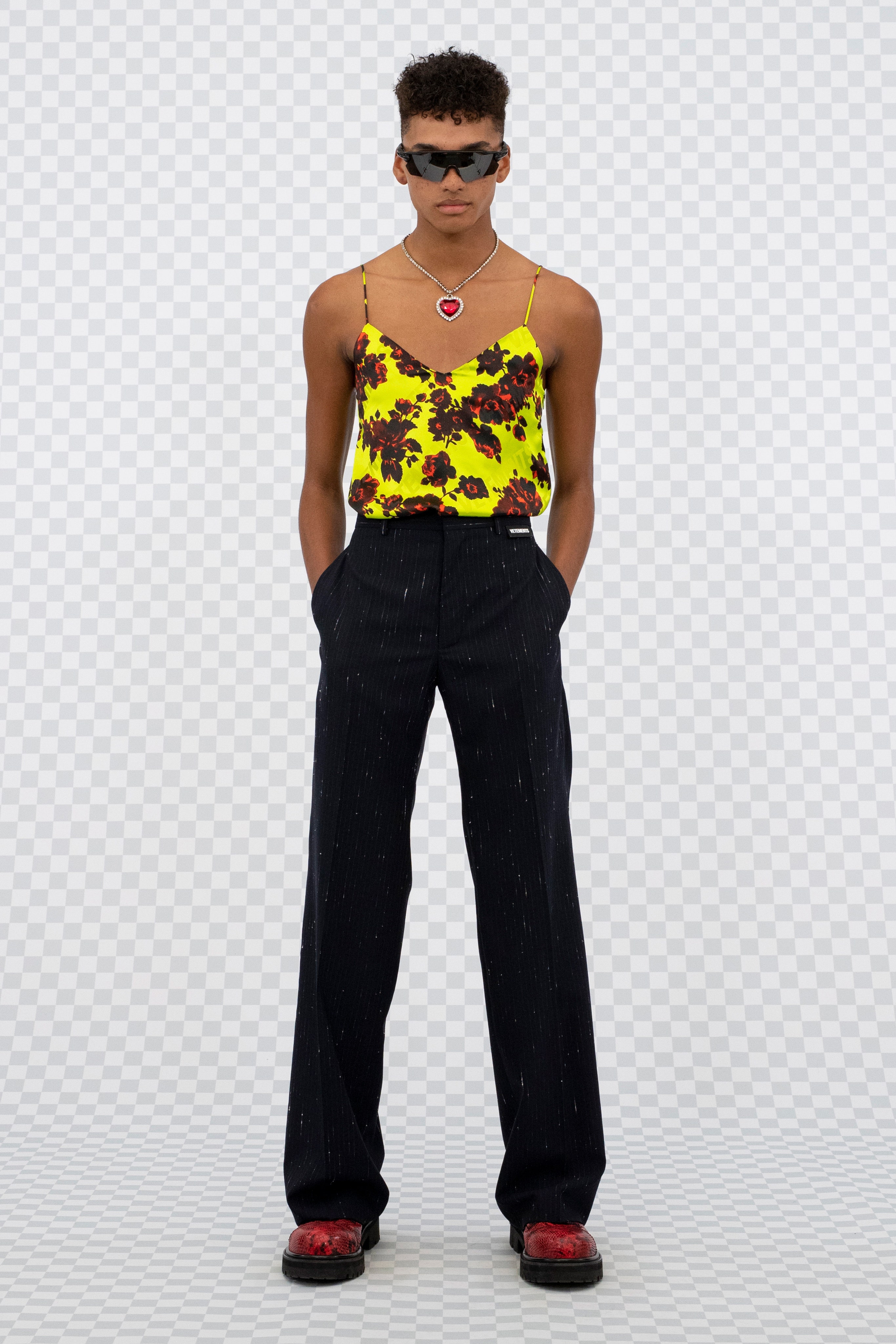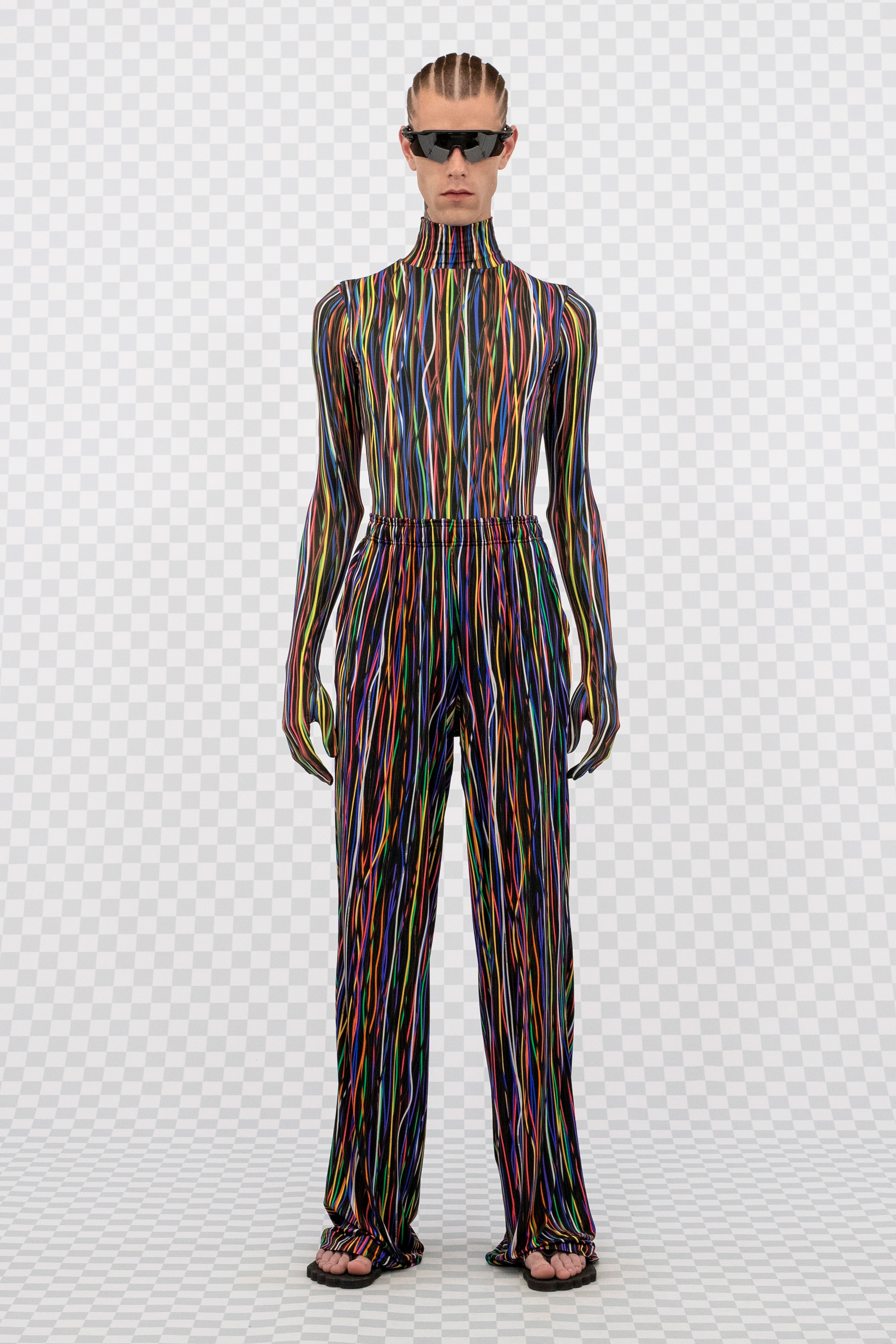 В коллекции будущей весны содержатся узнаваемые коды этой двухмерной реальности, в которую мы так погружены через свои смартфоны и компьютеры. К примеру, лукбук представлен на стандартном для приложения Photoshop сером шахматном фоне (насколько правдивы изображения, которые мы видим в Instagram?), а на моногольфах, рубашках, платьях и топах разместились принты в виде цифрового кода из культового фильма "Матрица", оптических элементов вроде разноцветных полос и графических языков пламени. Эти узоры разбавлены и более природными, например узором спинки саламандры и почти пасторальными, пышными букетами роз — намек на всеобщее стремление заново воссоединиться с природой в рамках невозможности отринуть цифровые реалии.